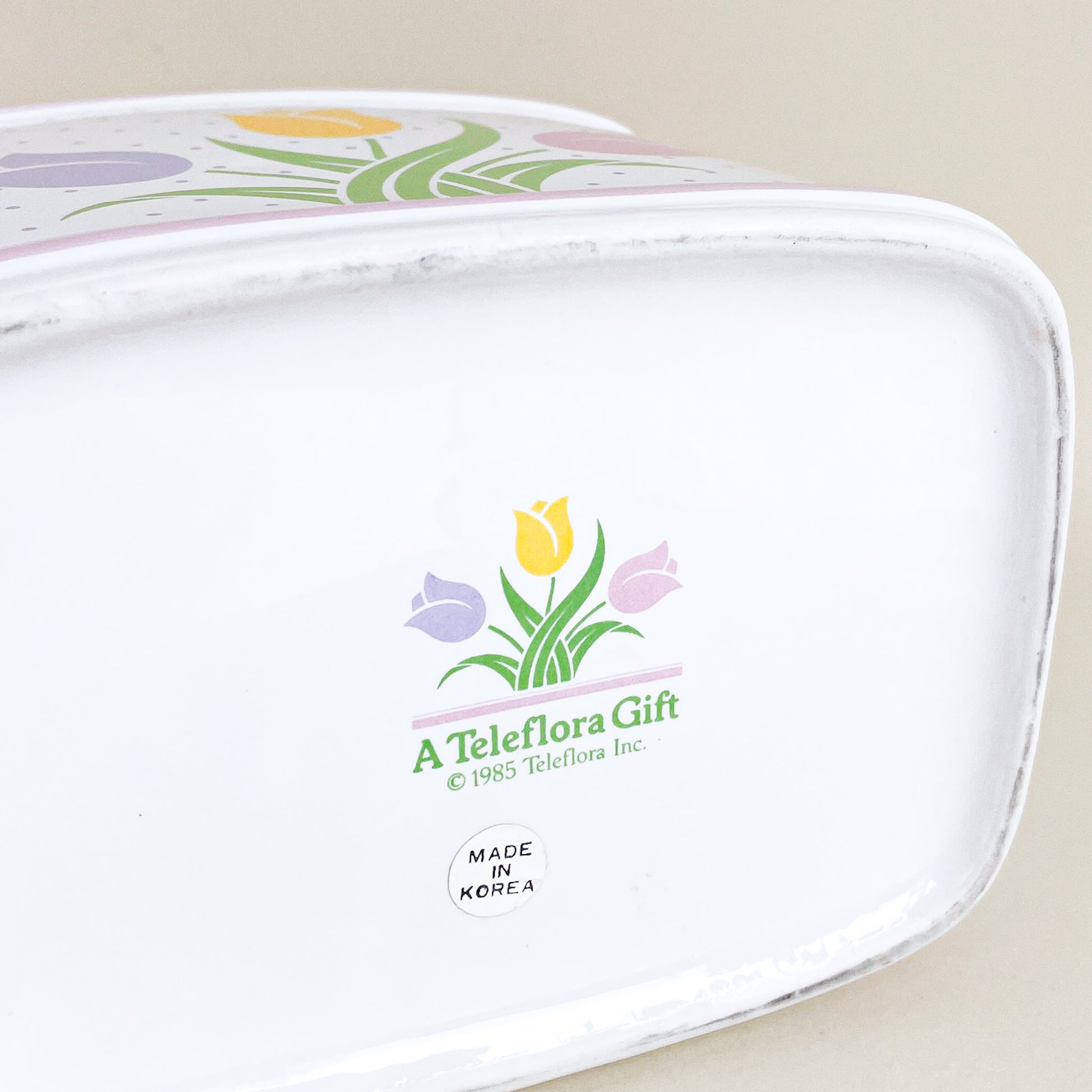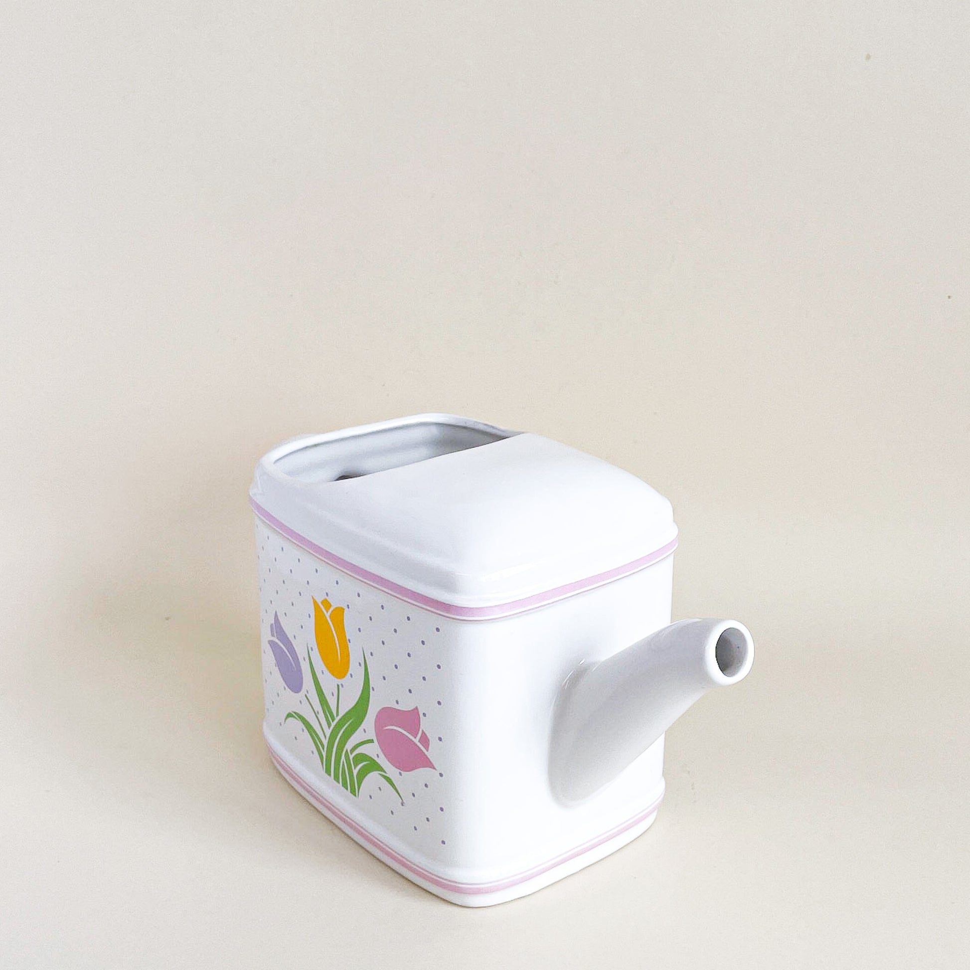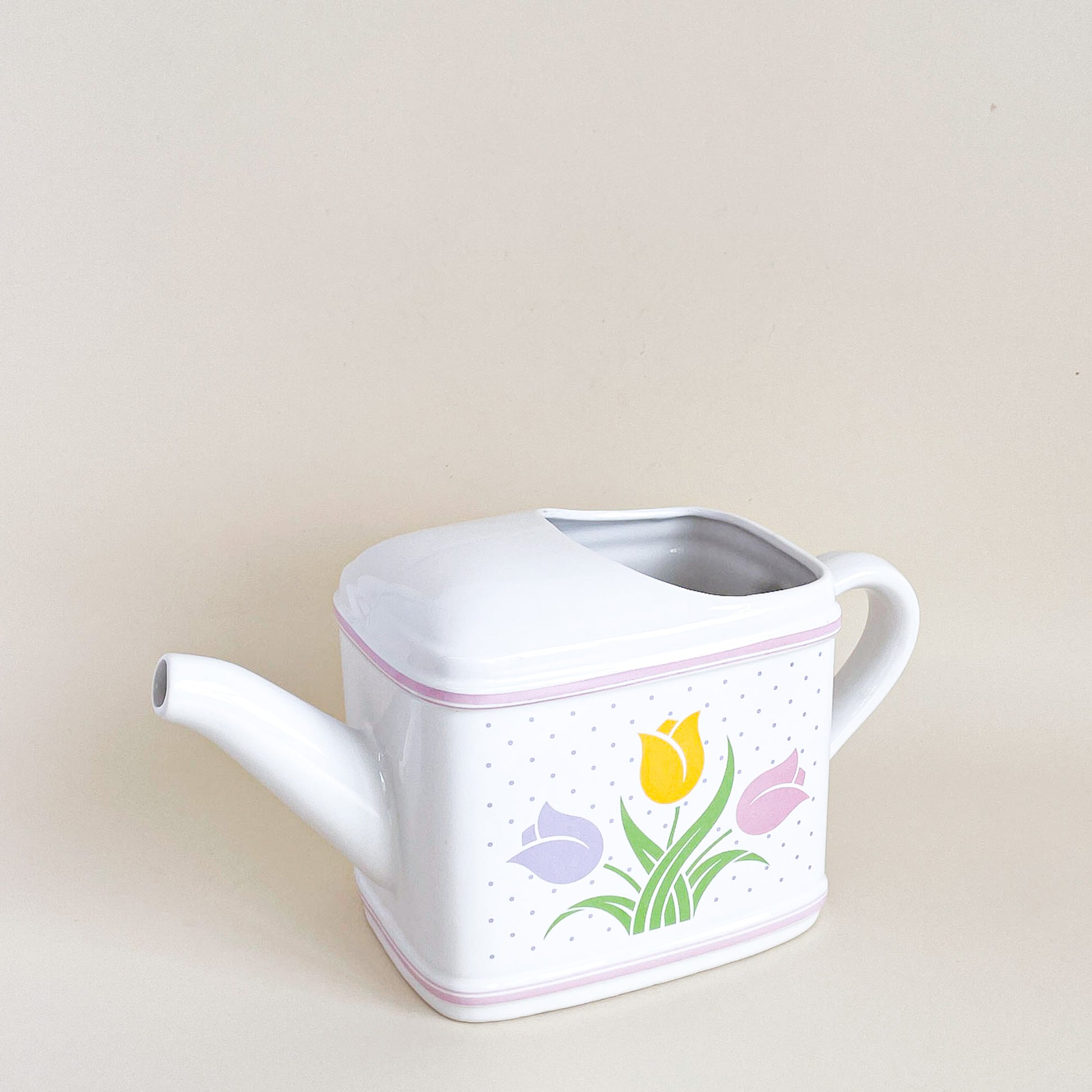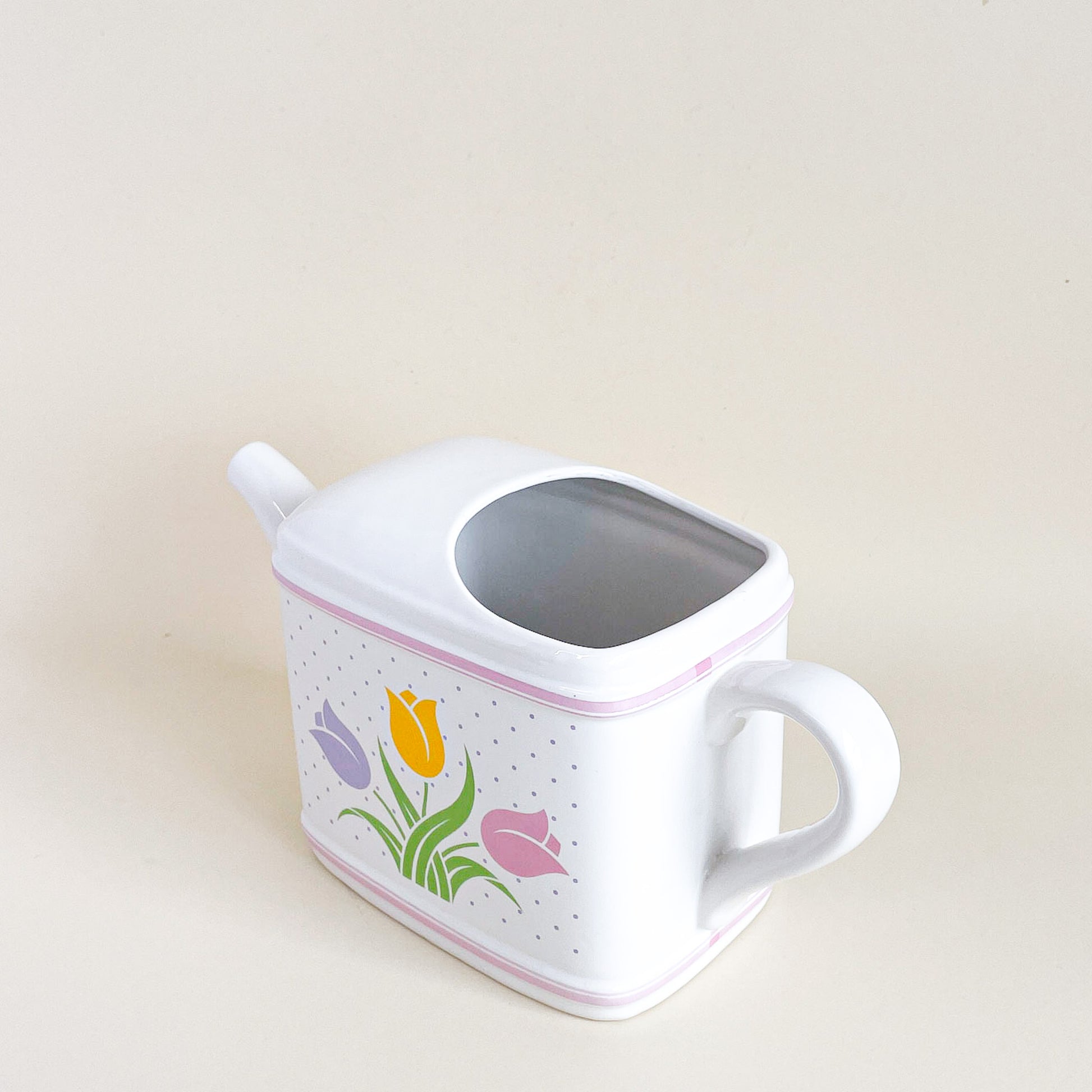 Beautiful ceramic watering can with tulip design, made in Korea in 1985 by Teleflora. It could also serve as a pretty vase! :)