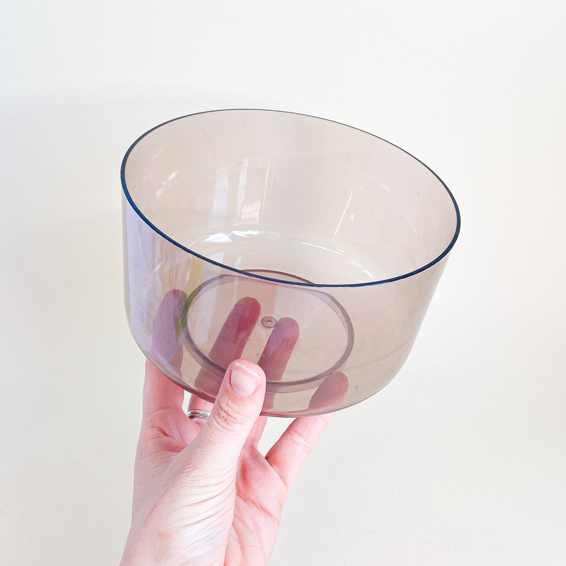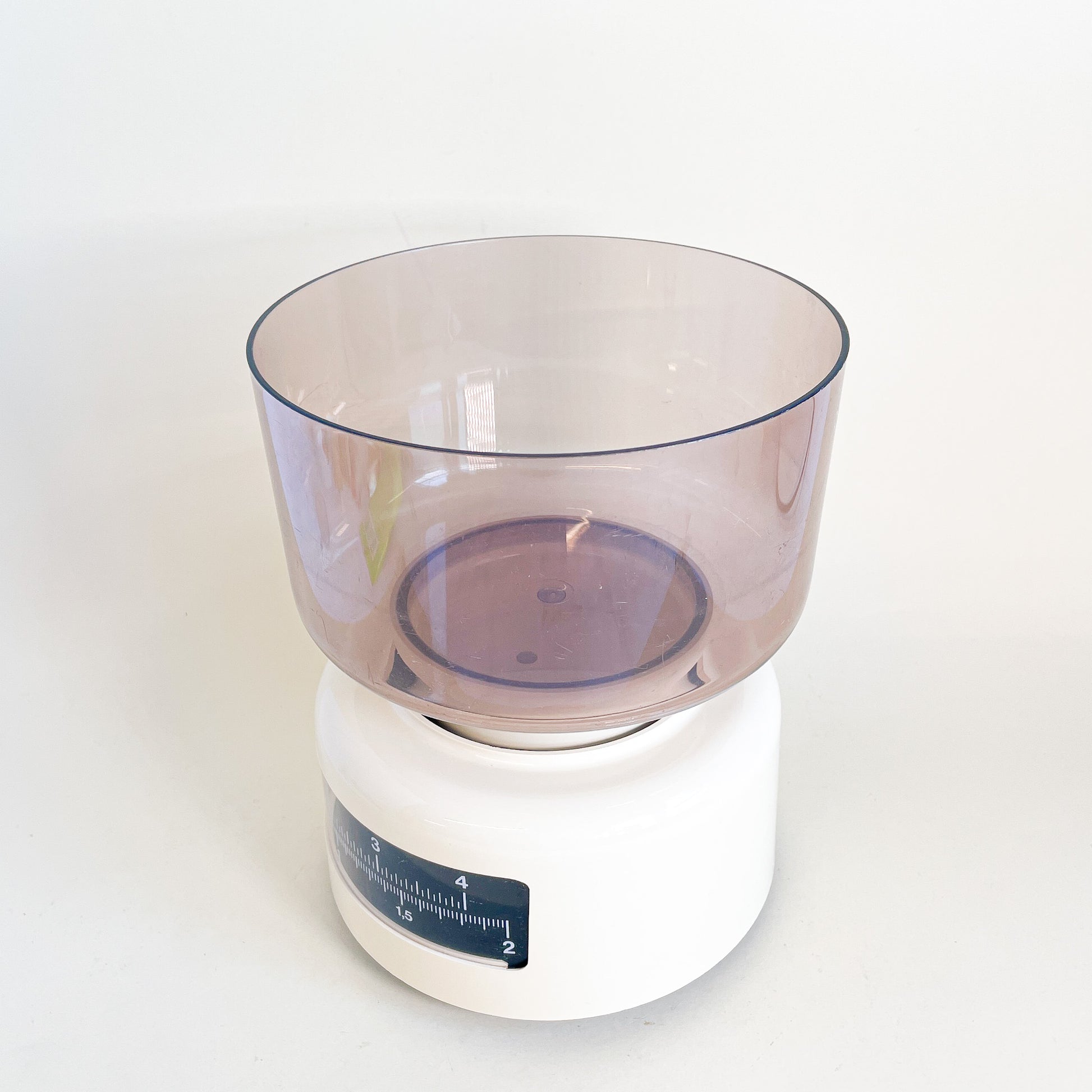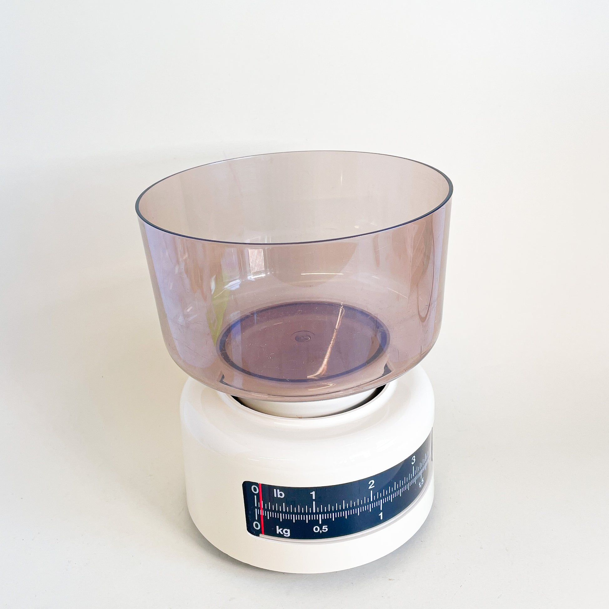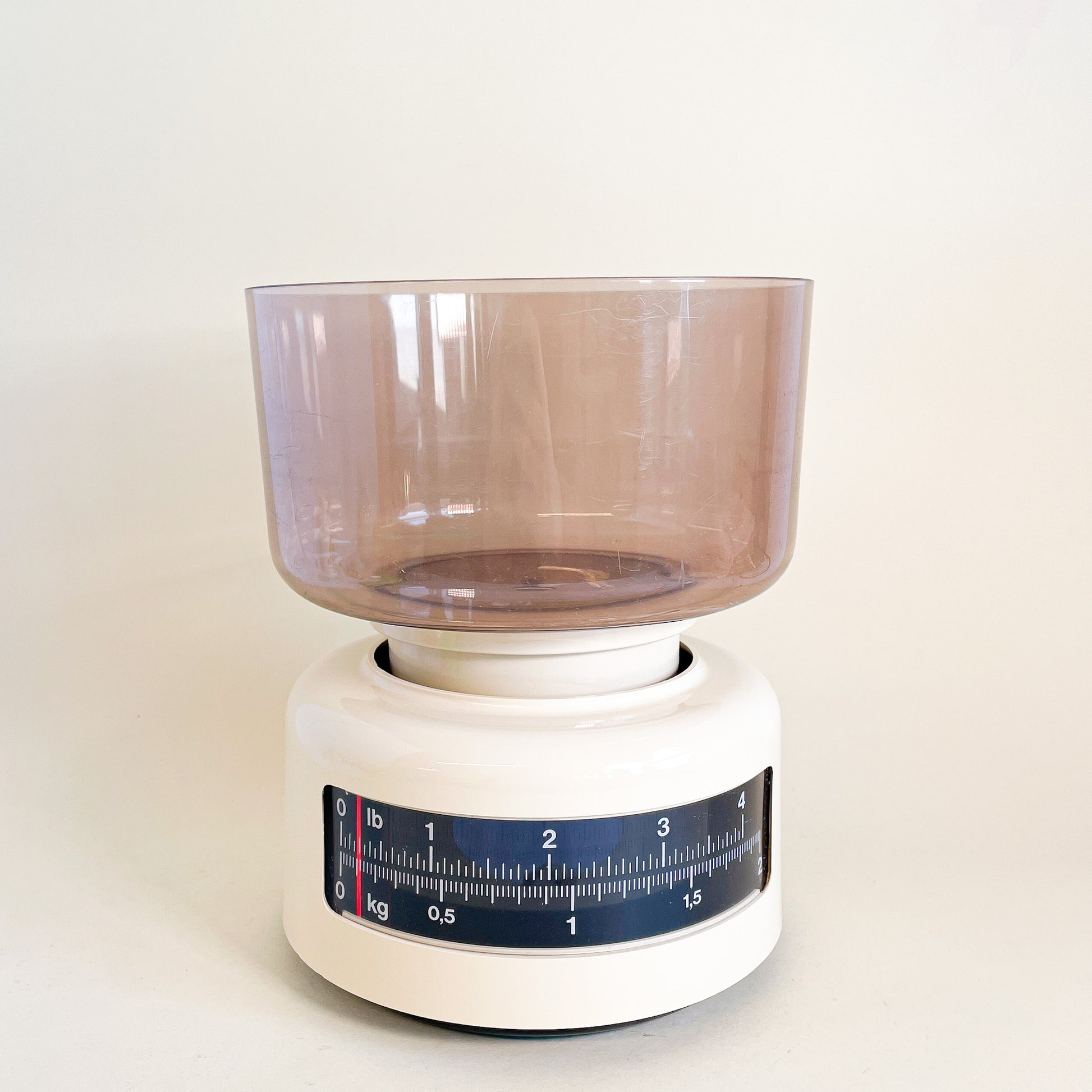 Manual kitchen scale in beige plastic and smoked plastic weighing bowl.