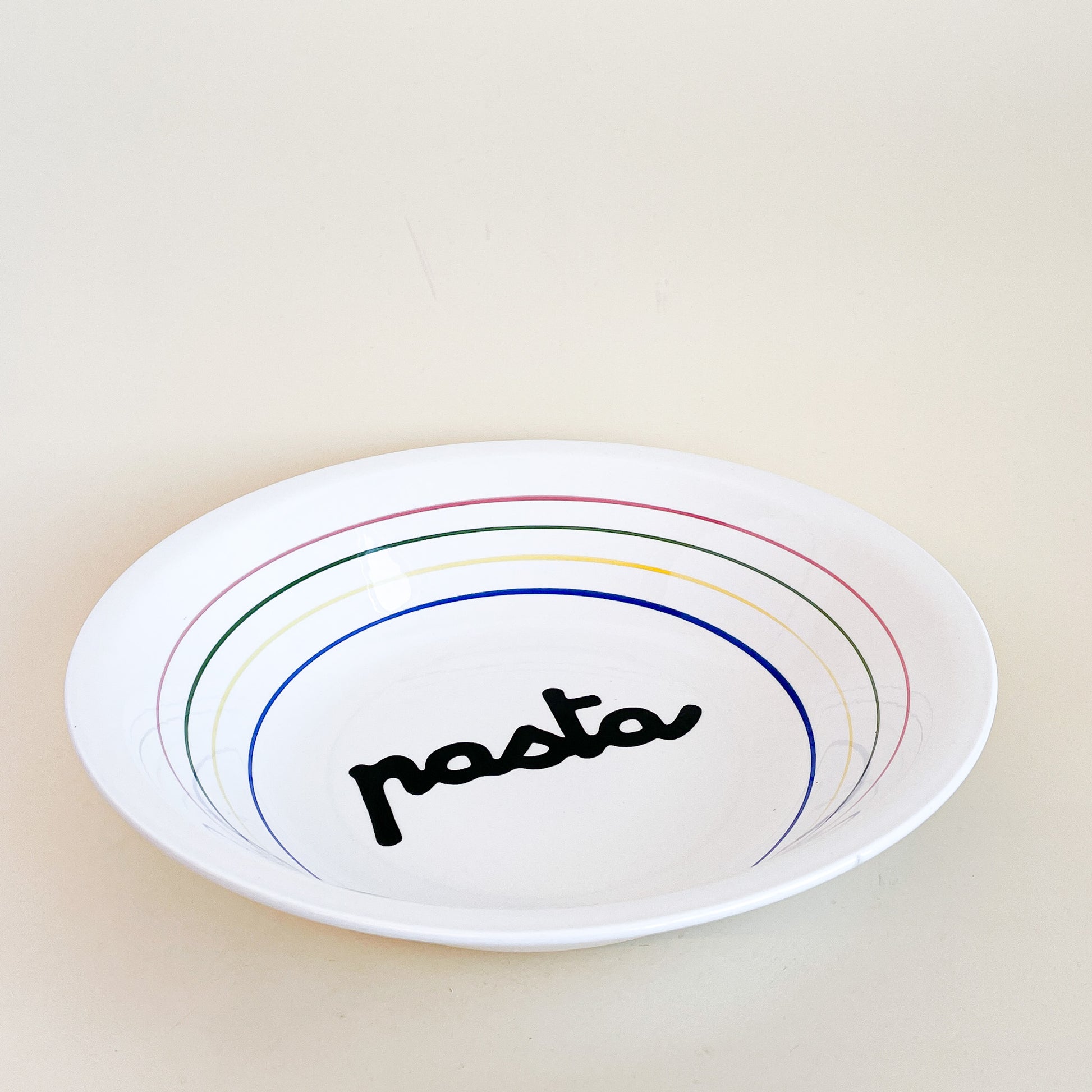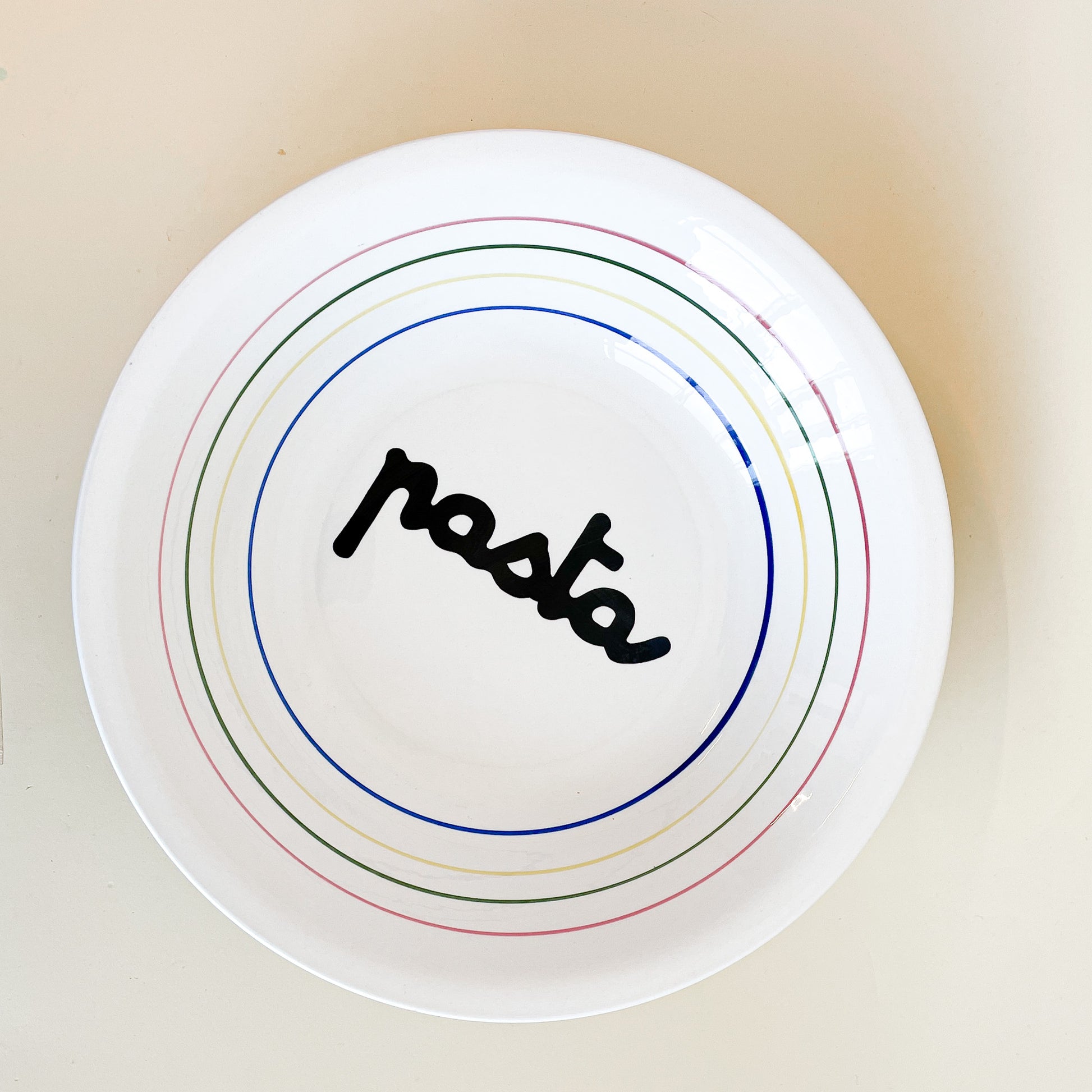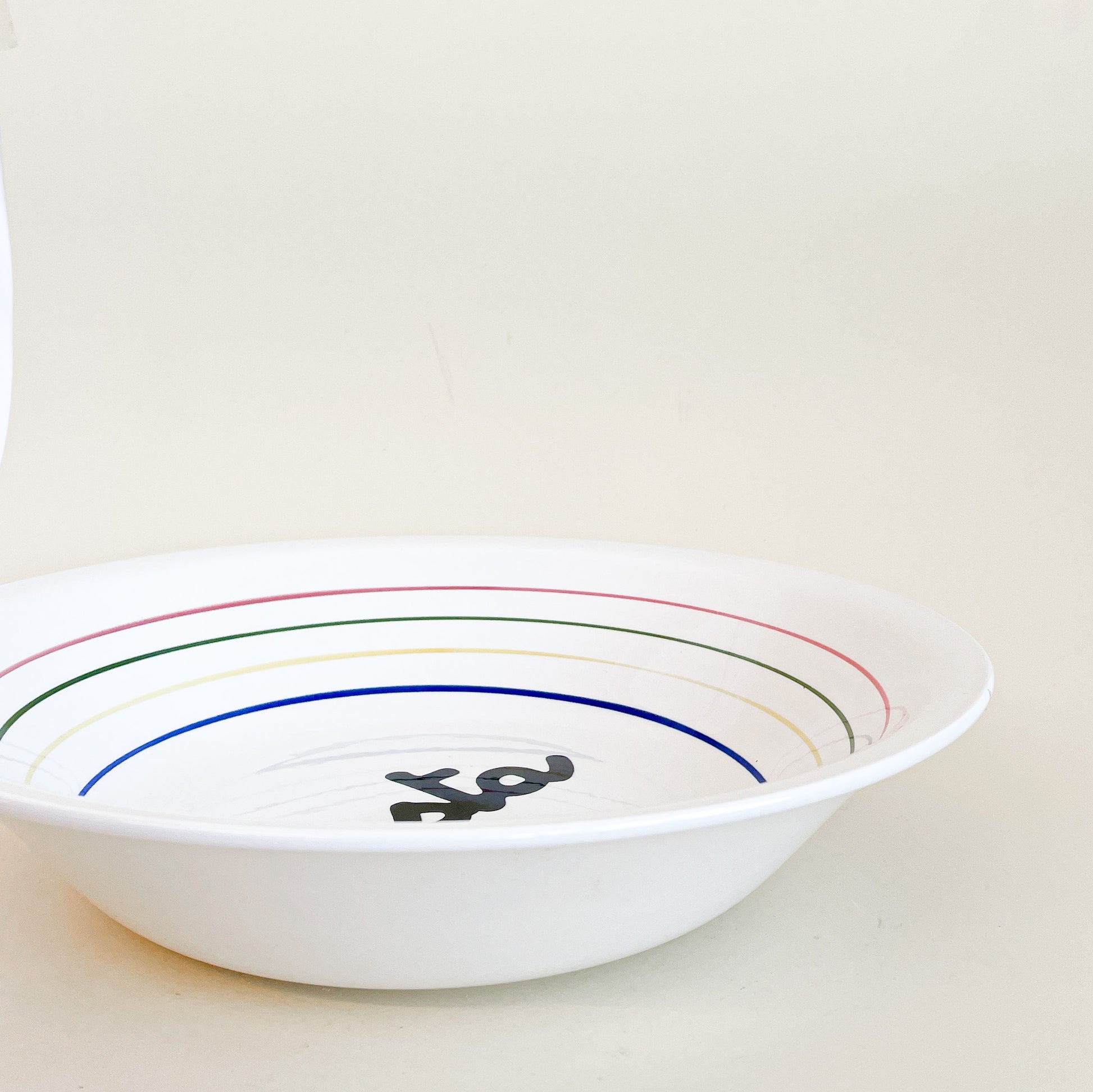 White ceramic pasta bowl with colorful stripes, made in Korea.