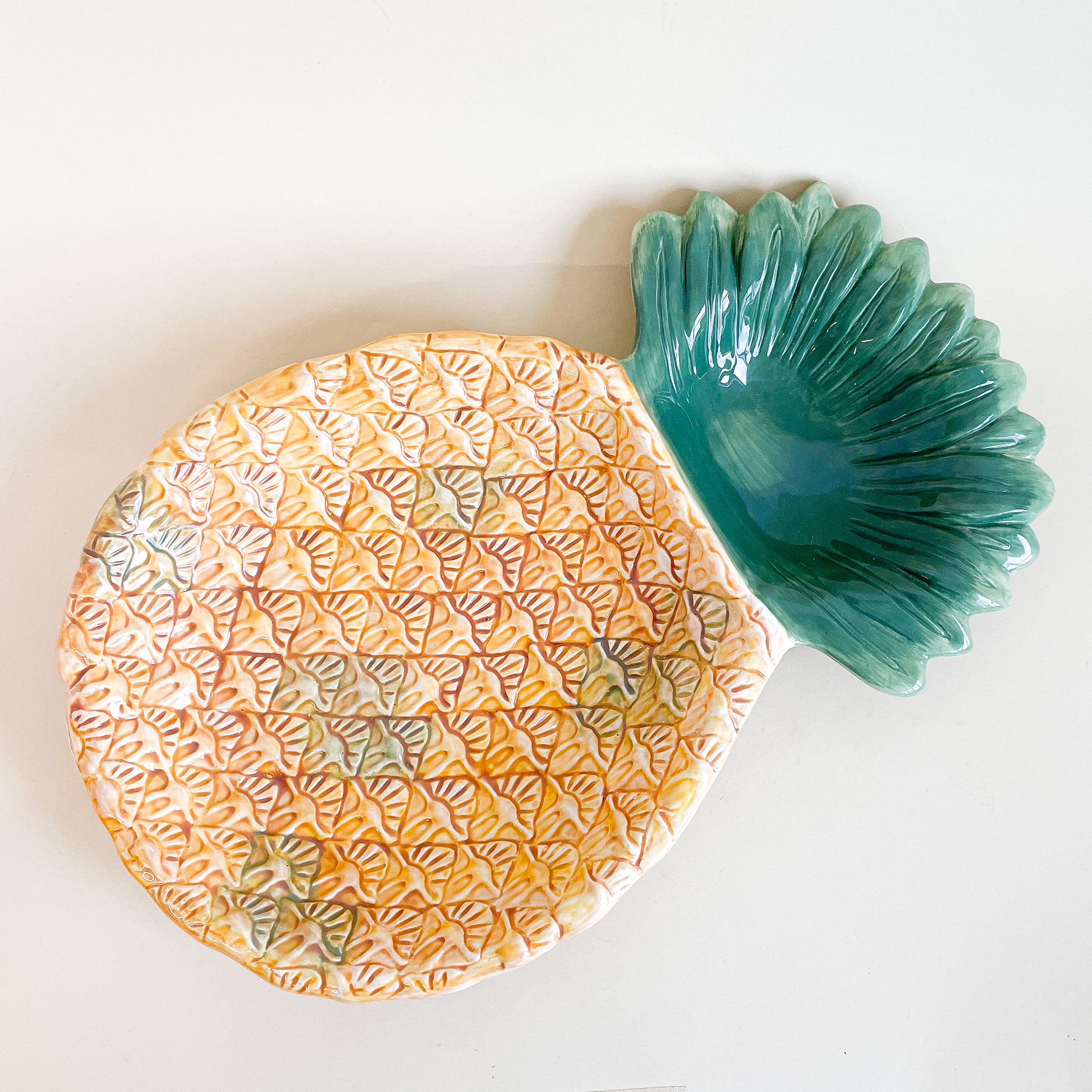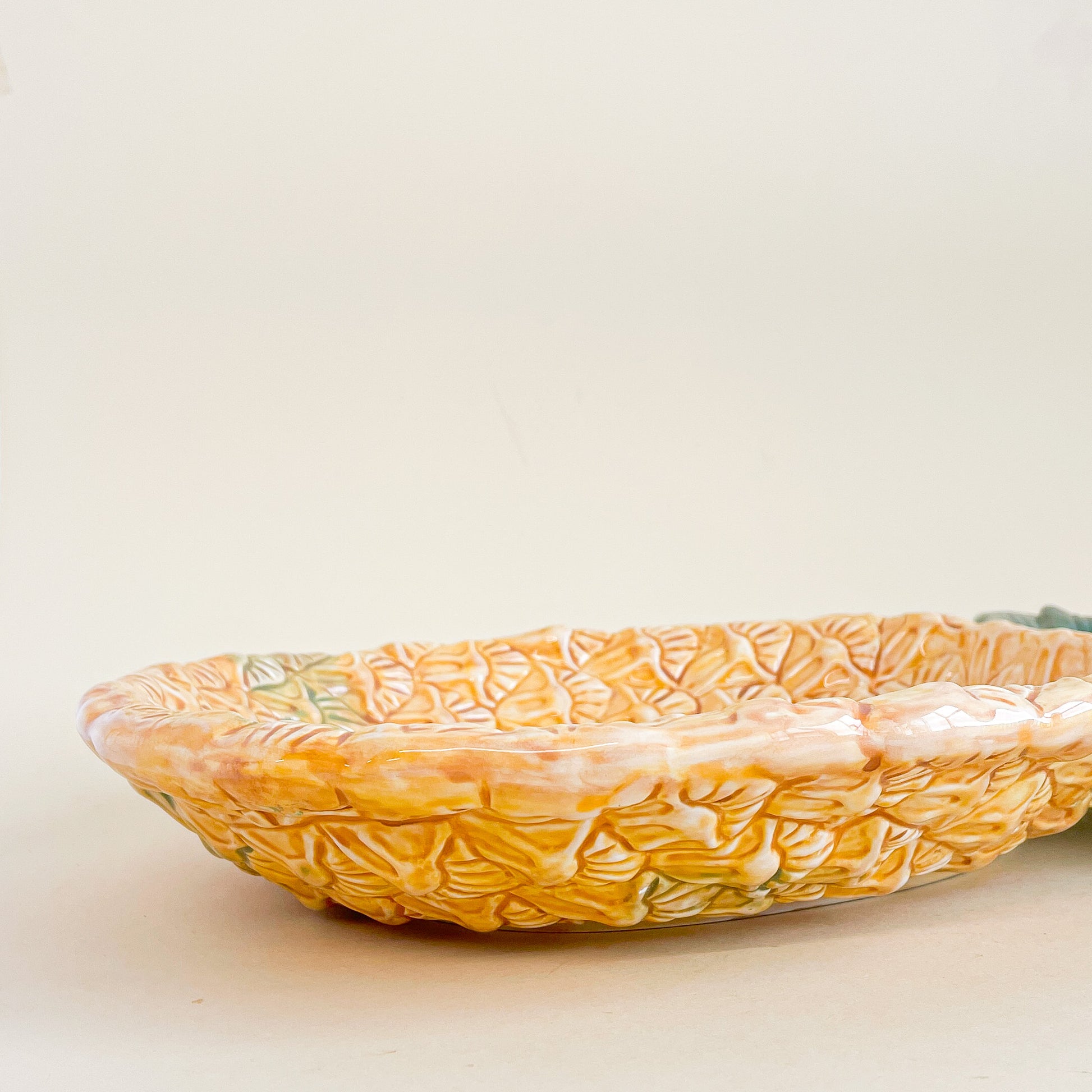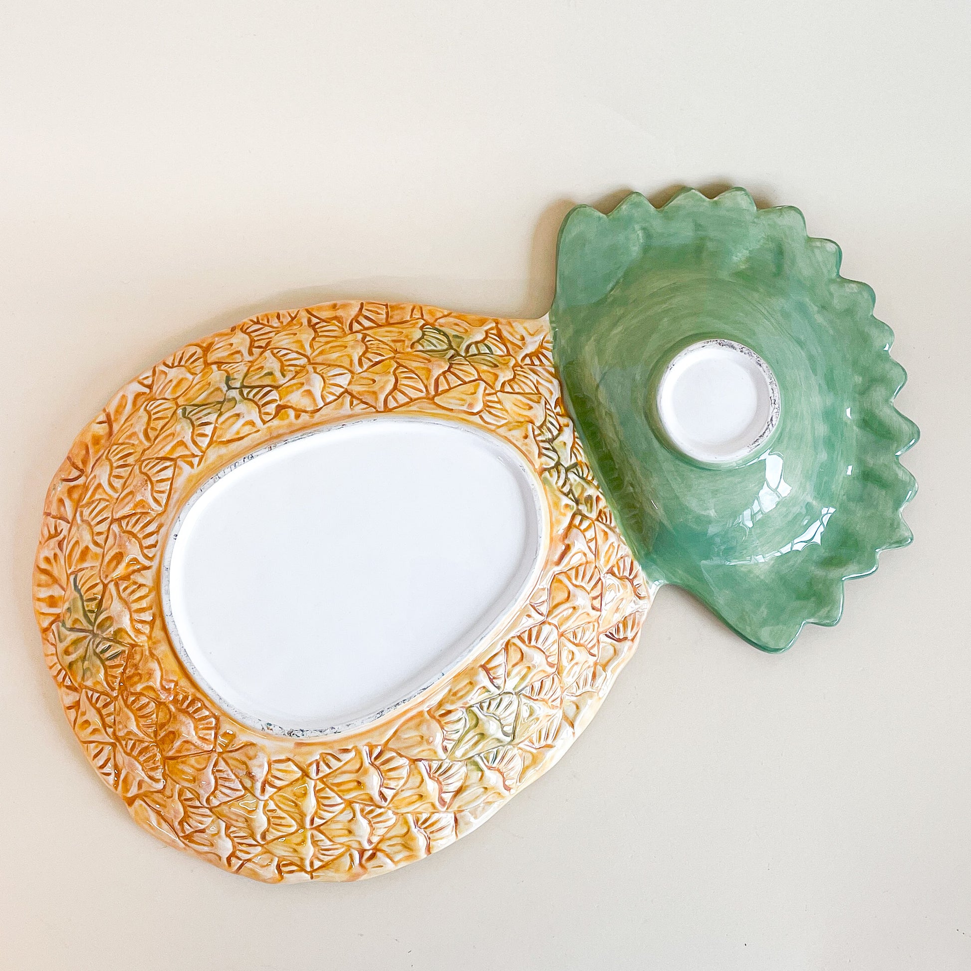 Pineapple-shaped double-compartment ceramic serving bowl.