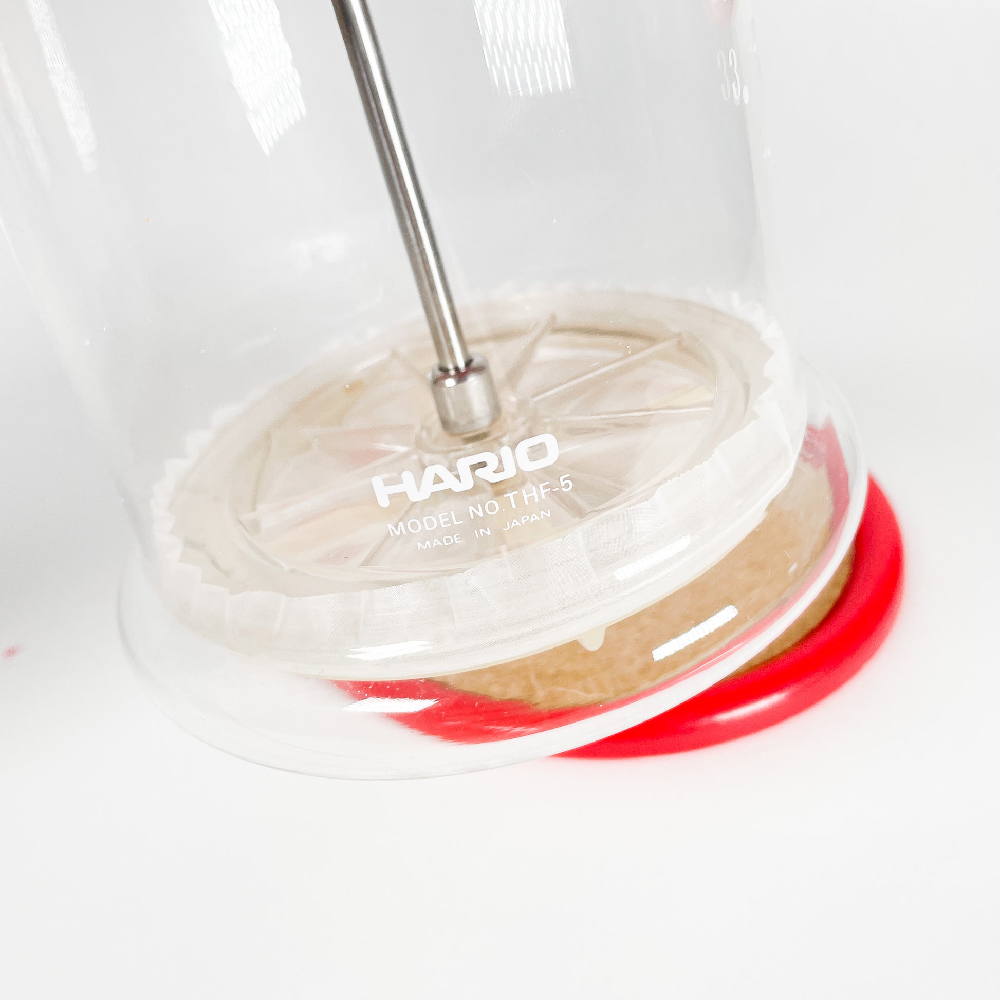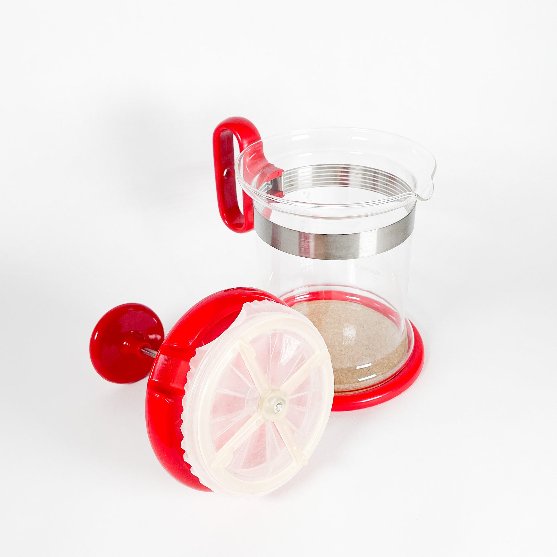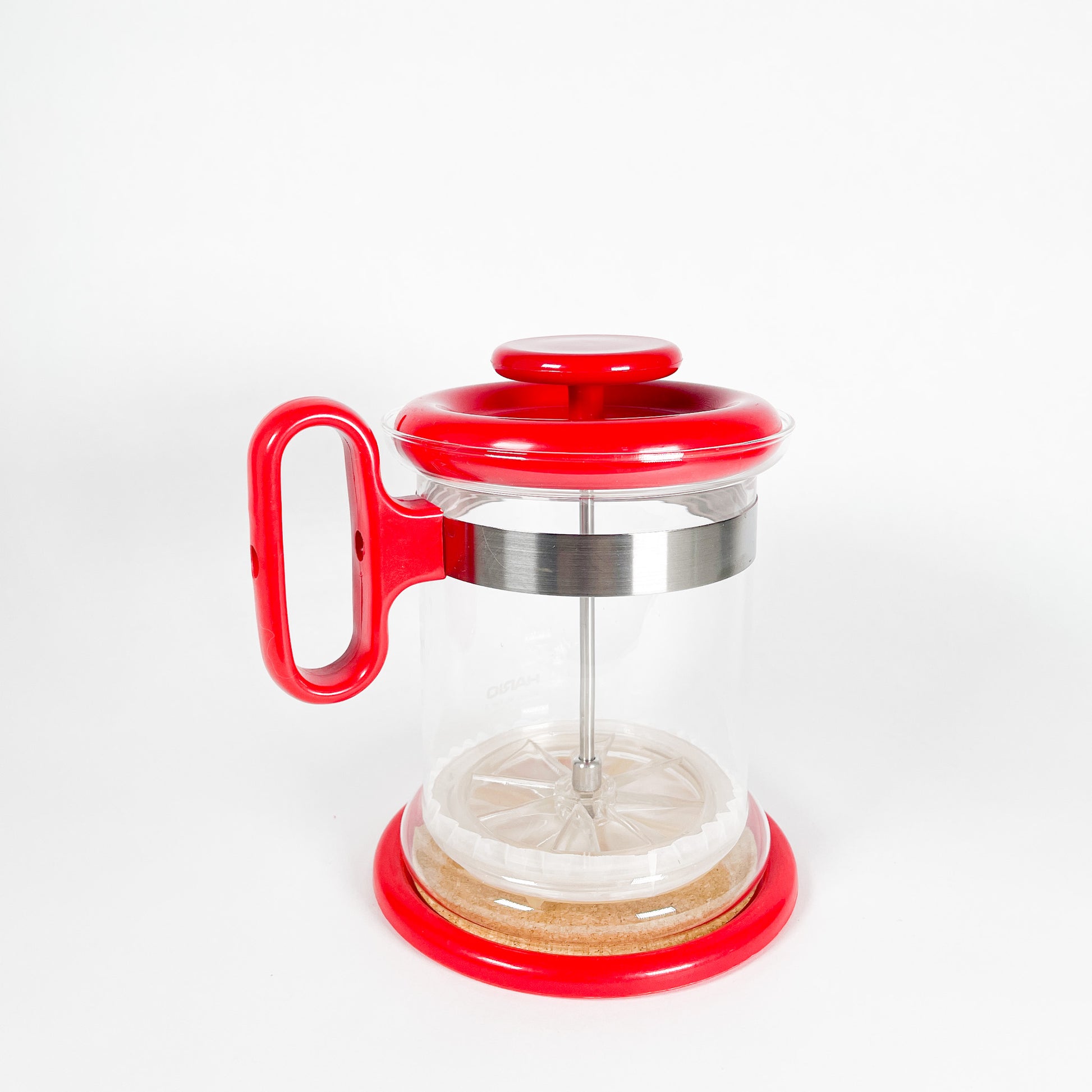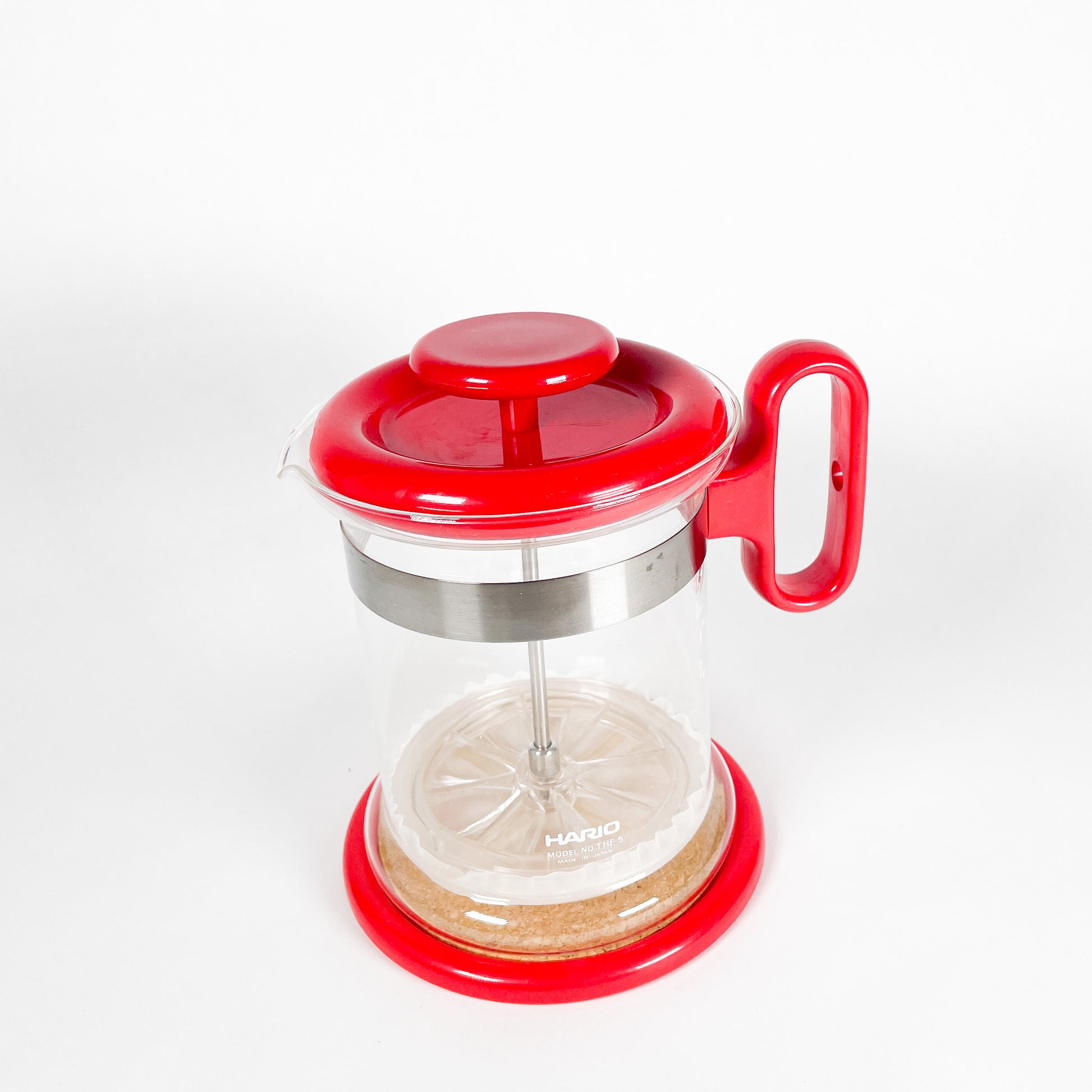 Glass and red plastic French press coffee-tea maker, made in Japan by Hario.