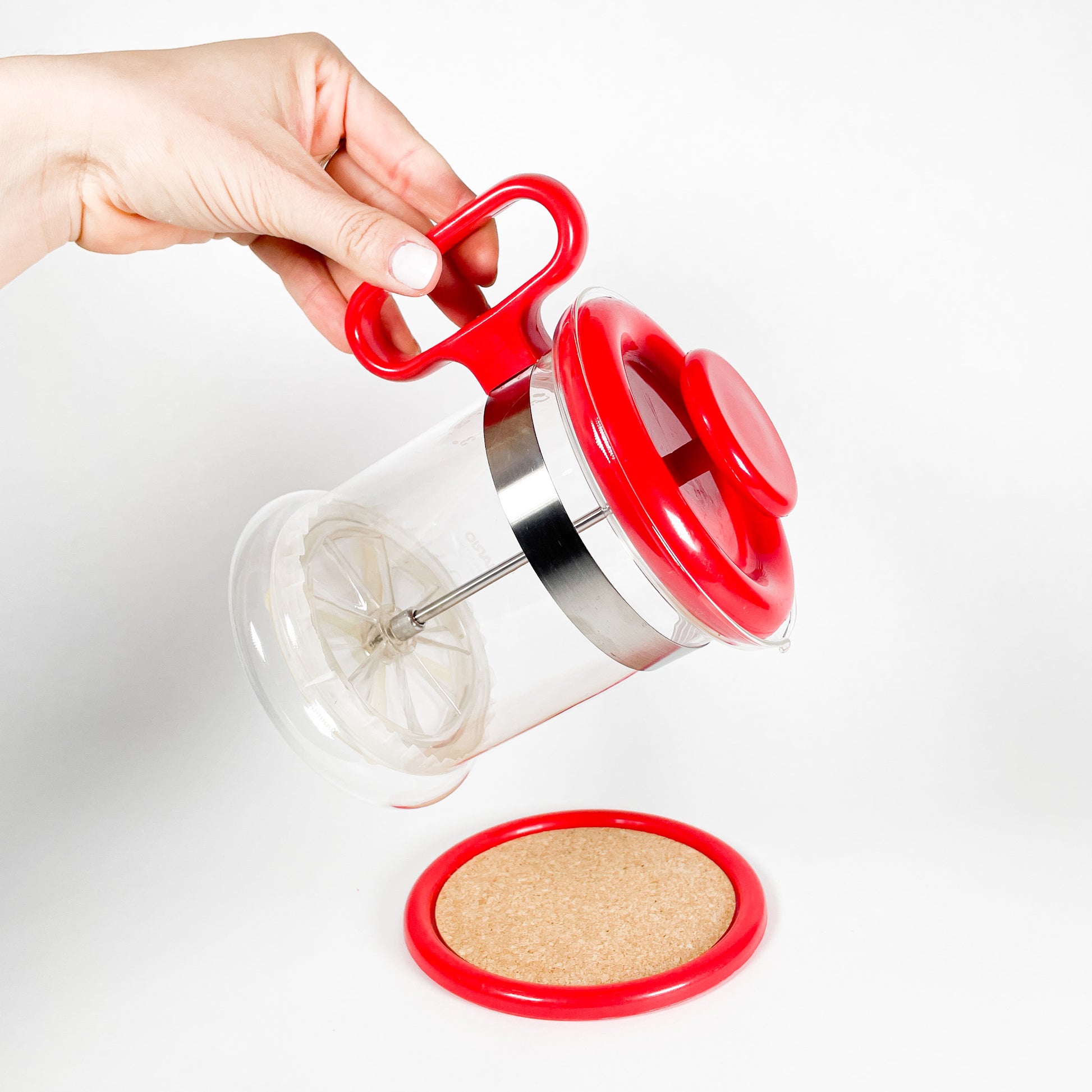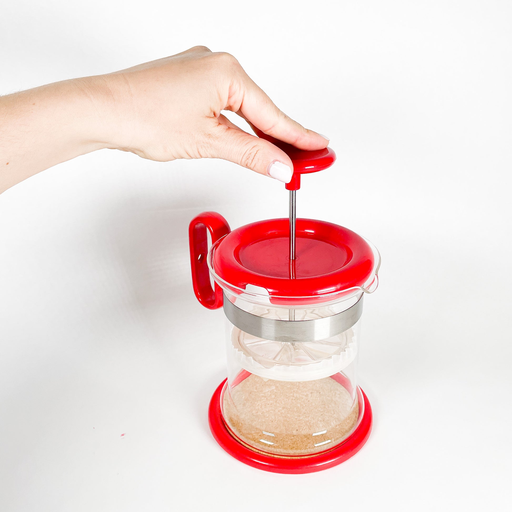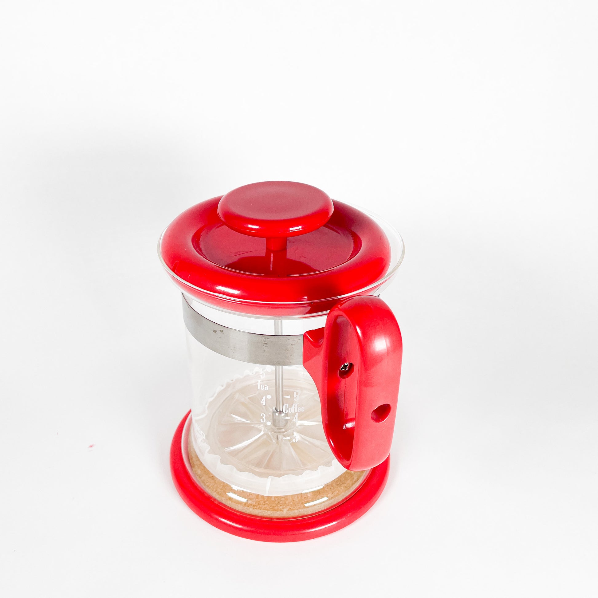 Glass and red plastic French press coffee-tea maker, made in Japan by Hario.