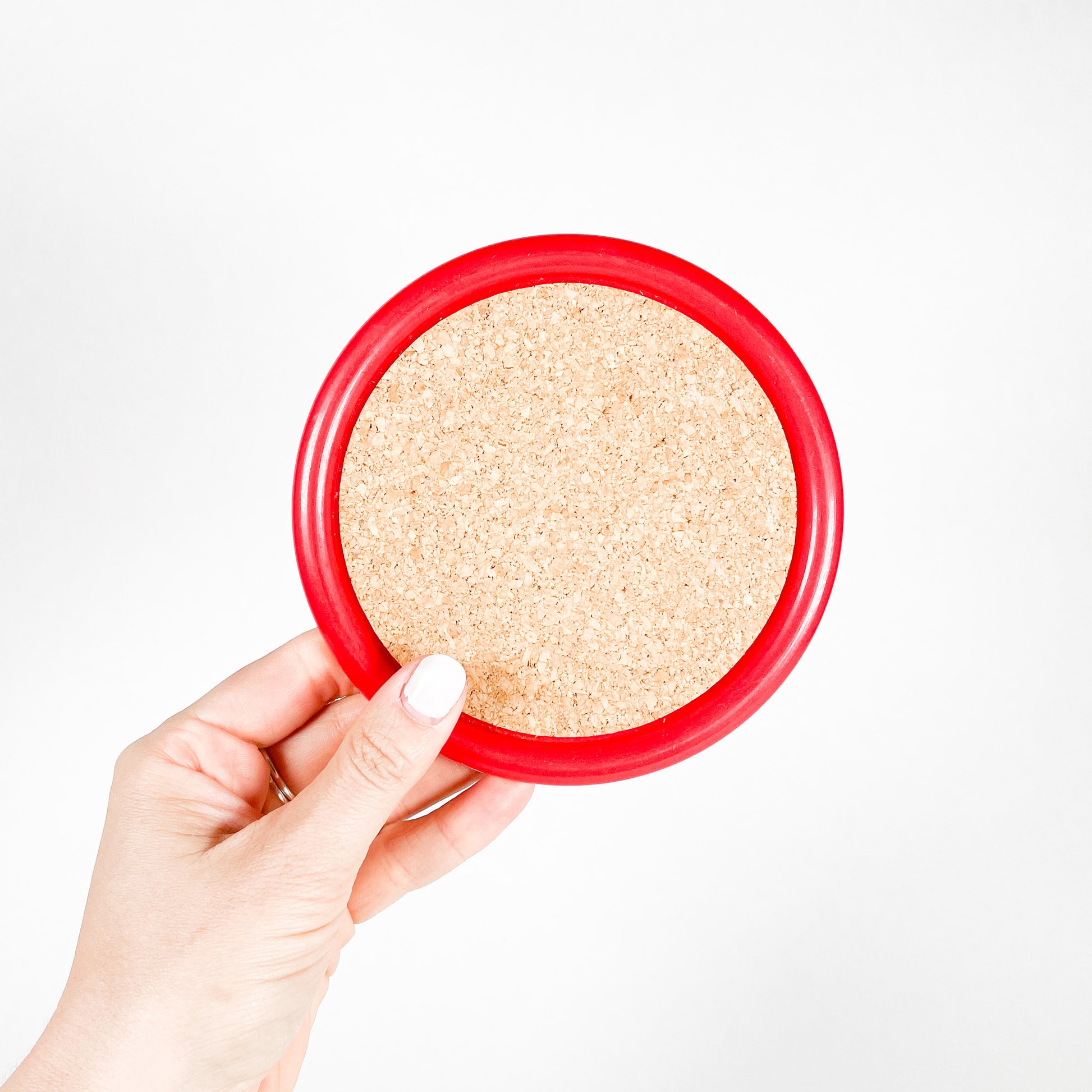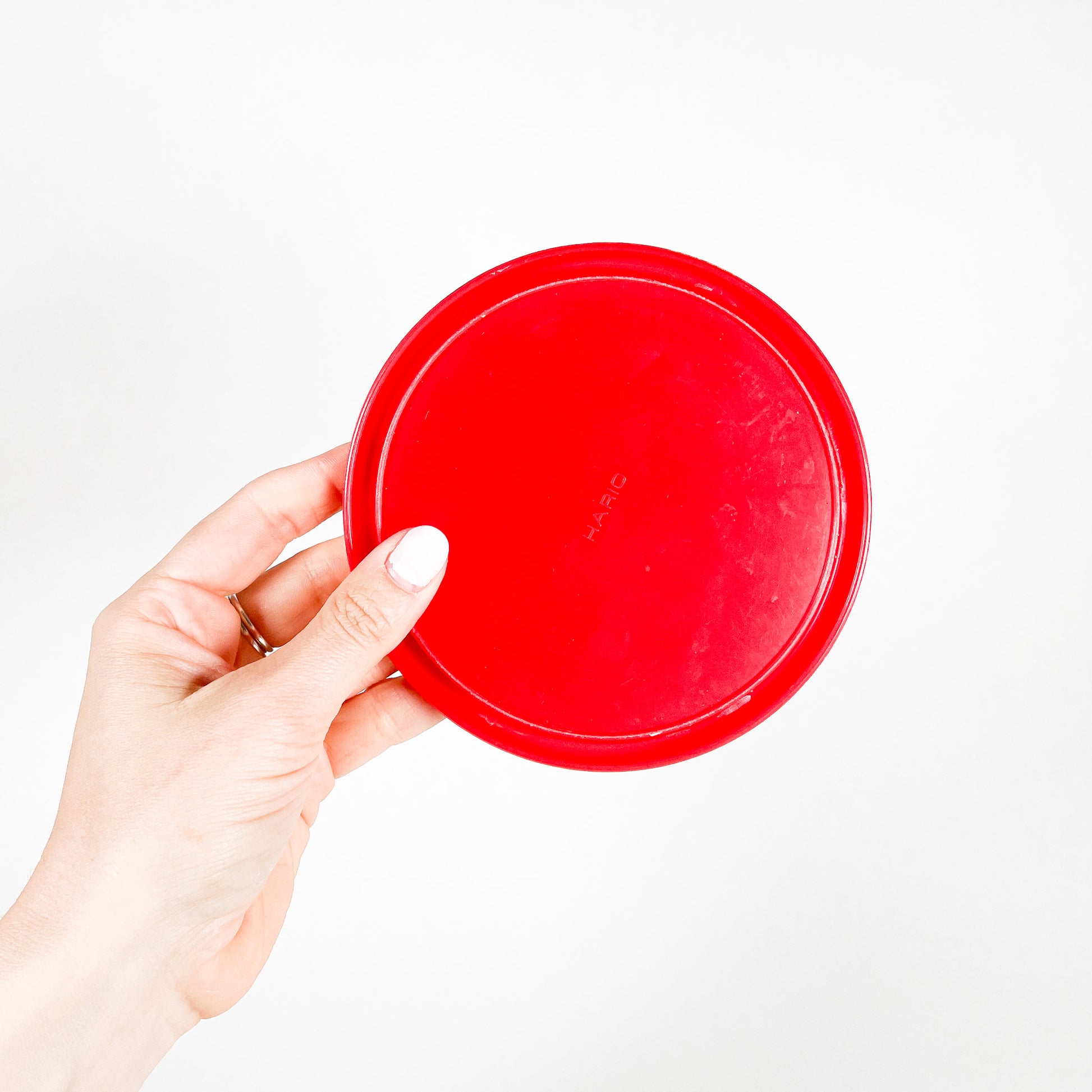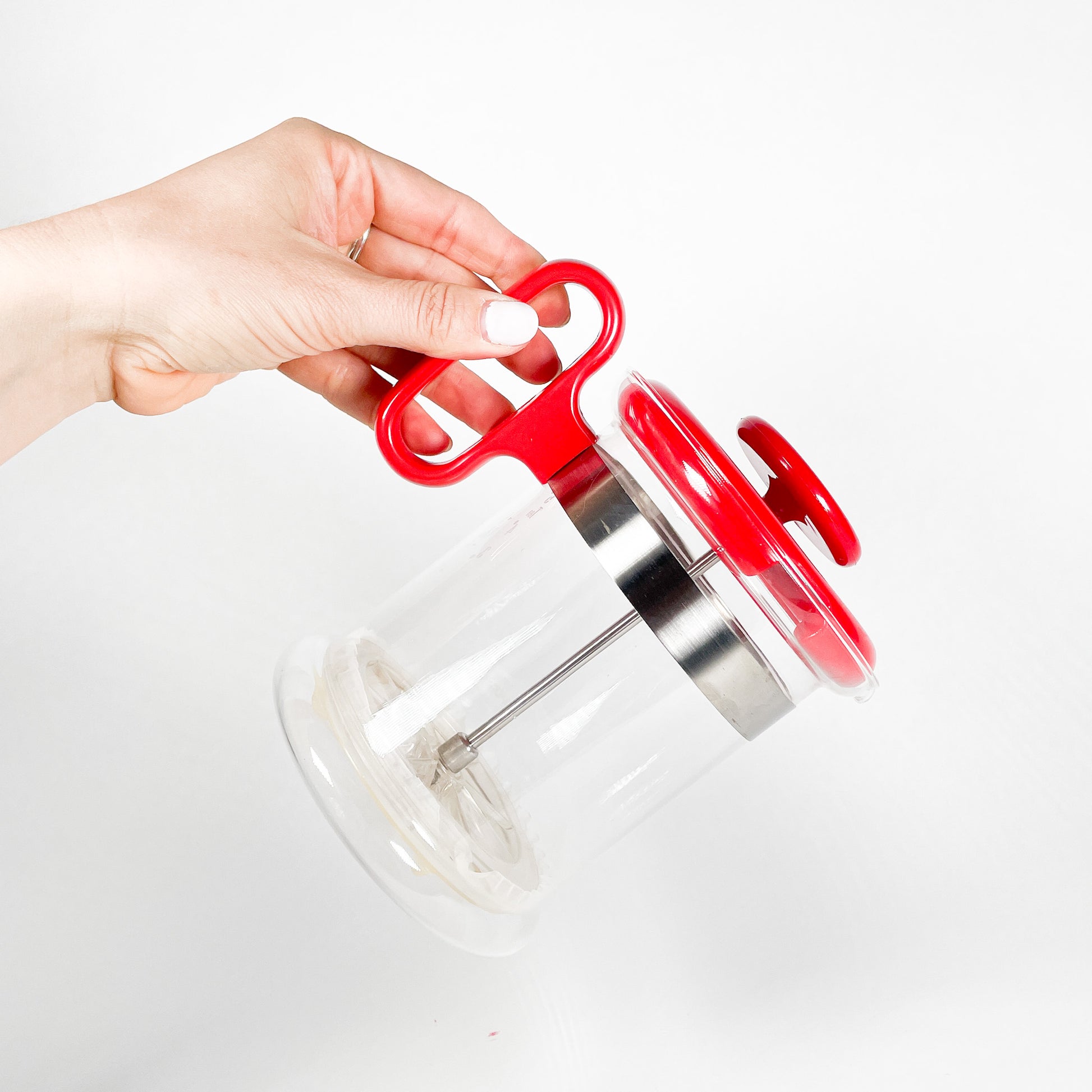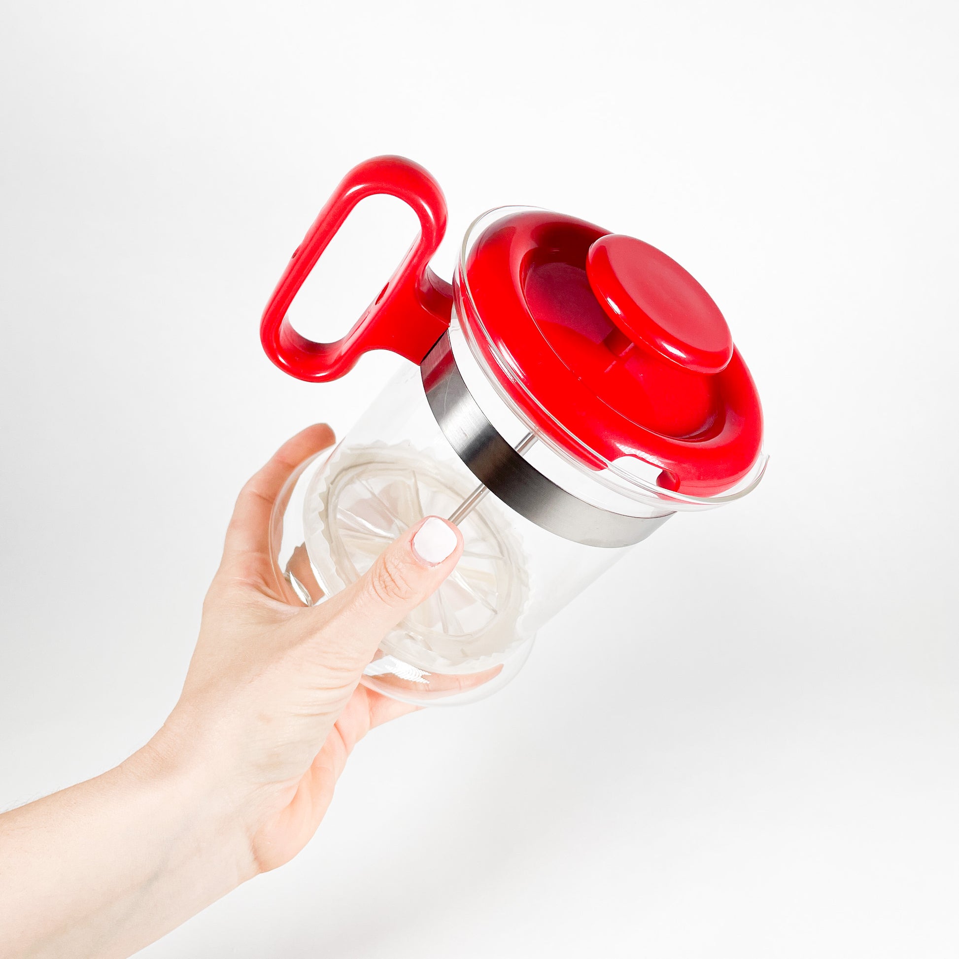 Glass and red plastic French press coffee-tea maker, made in Japan by Hario.
