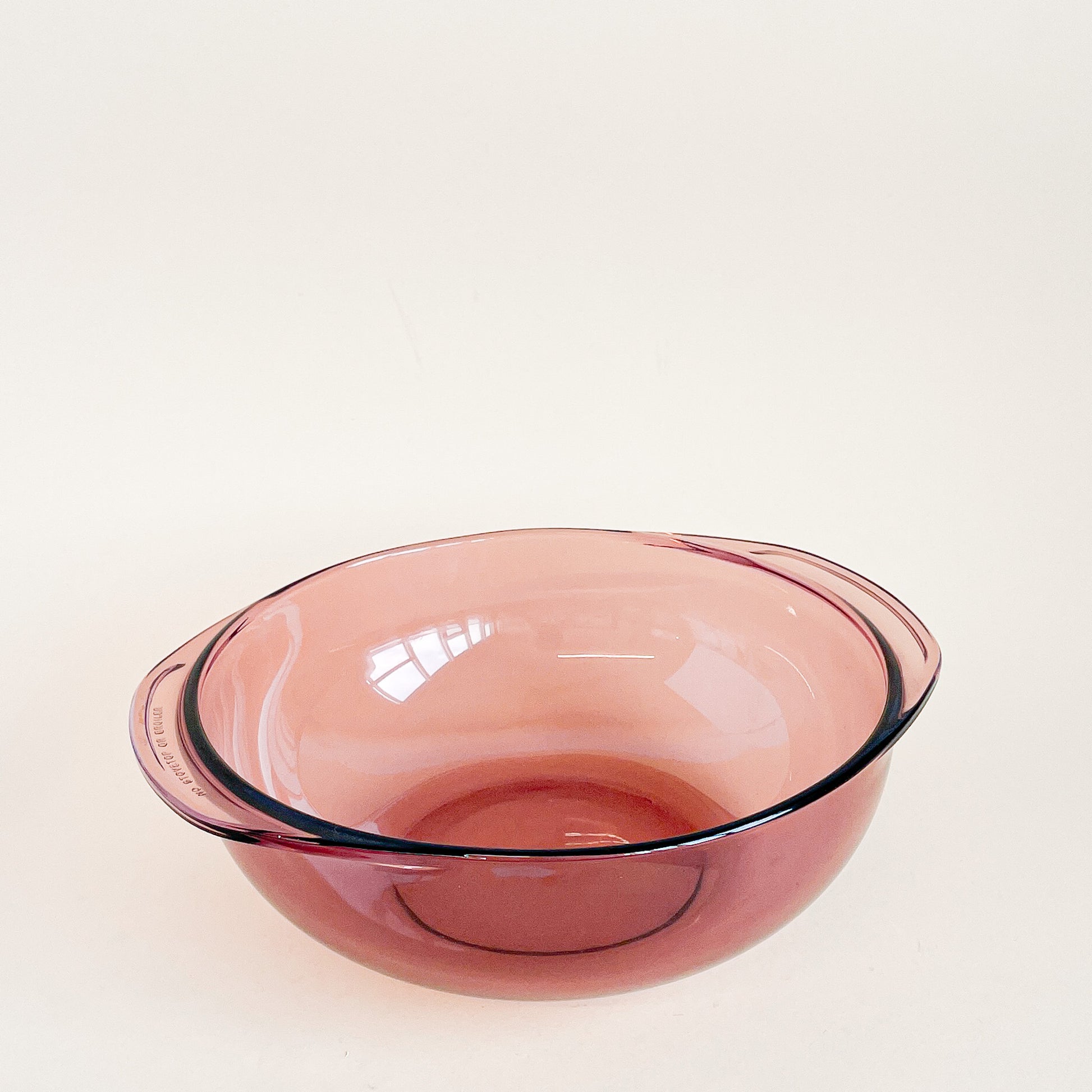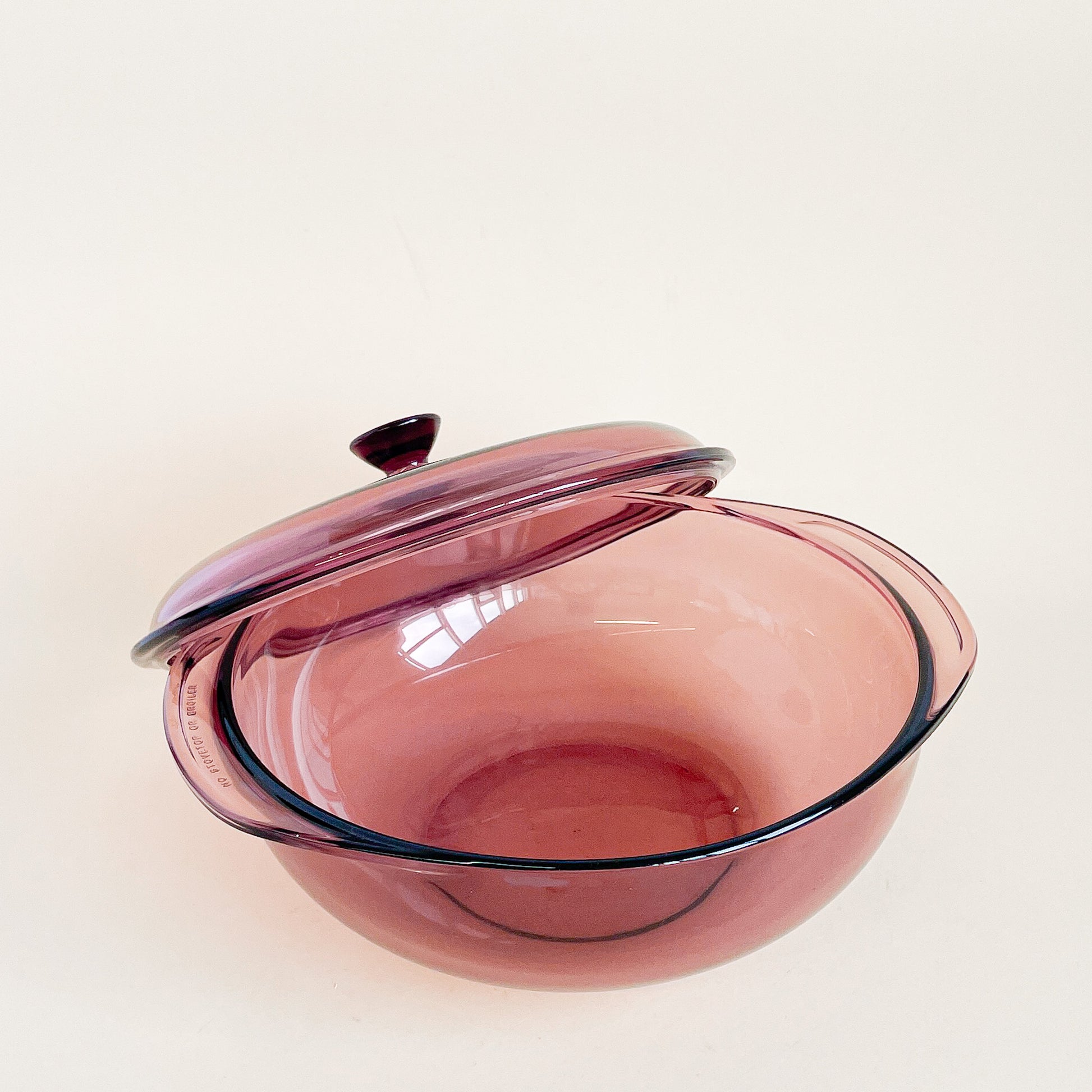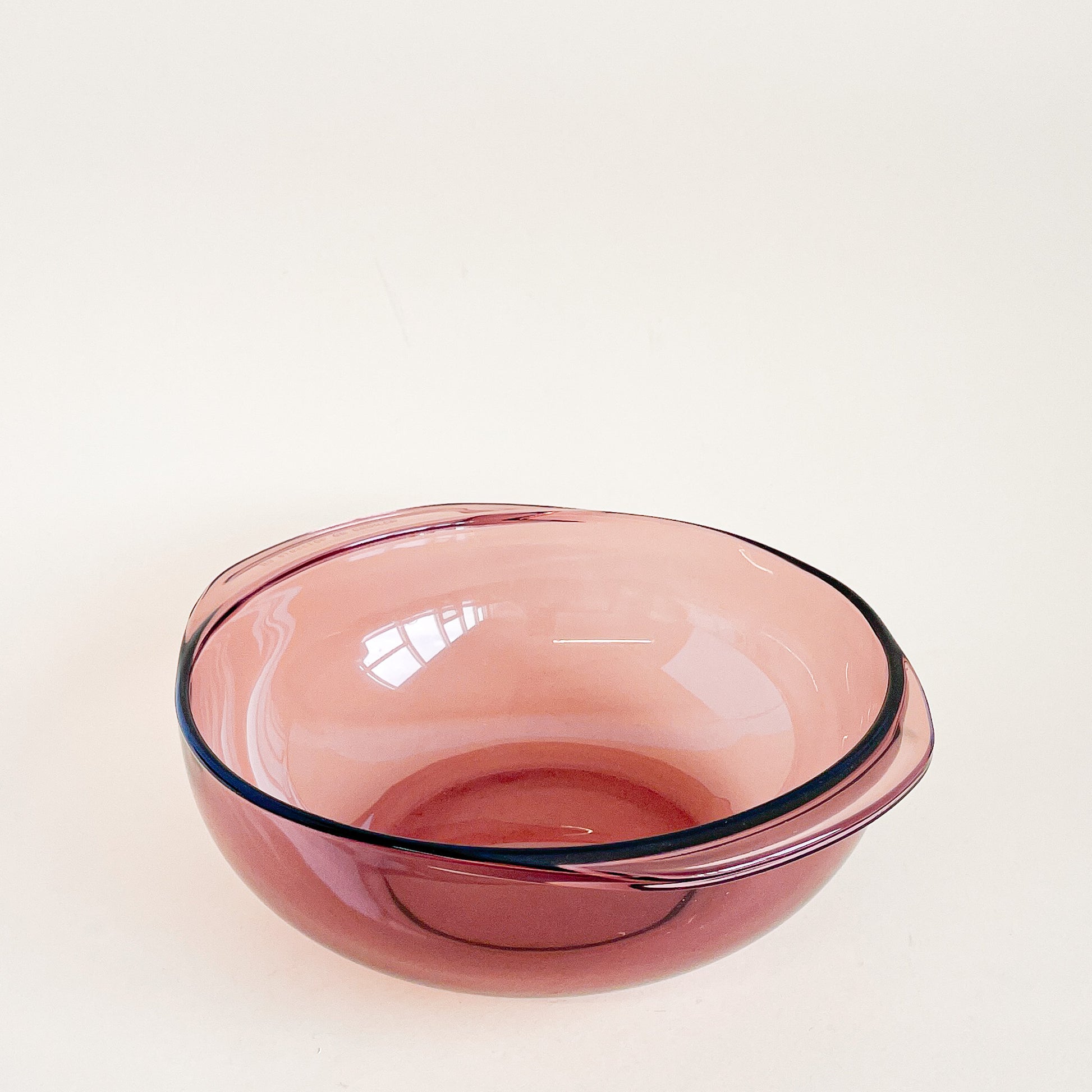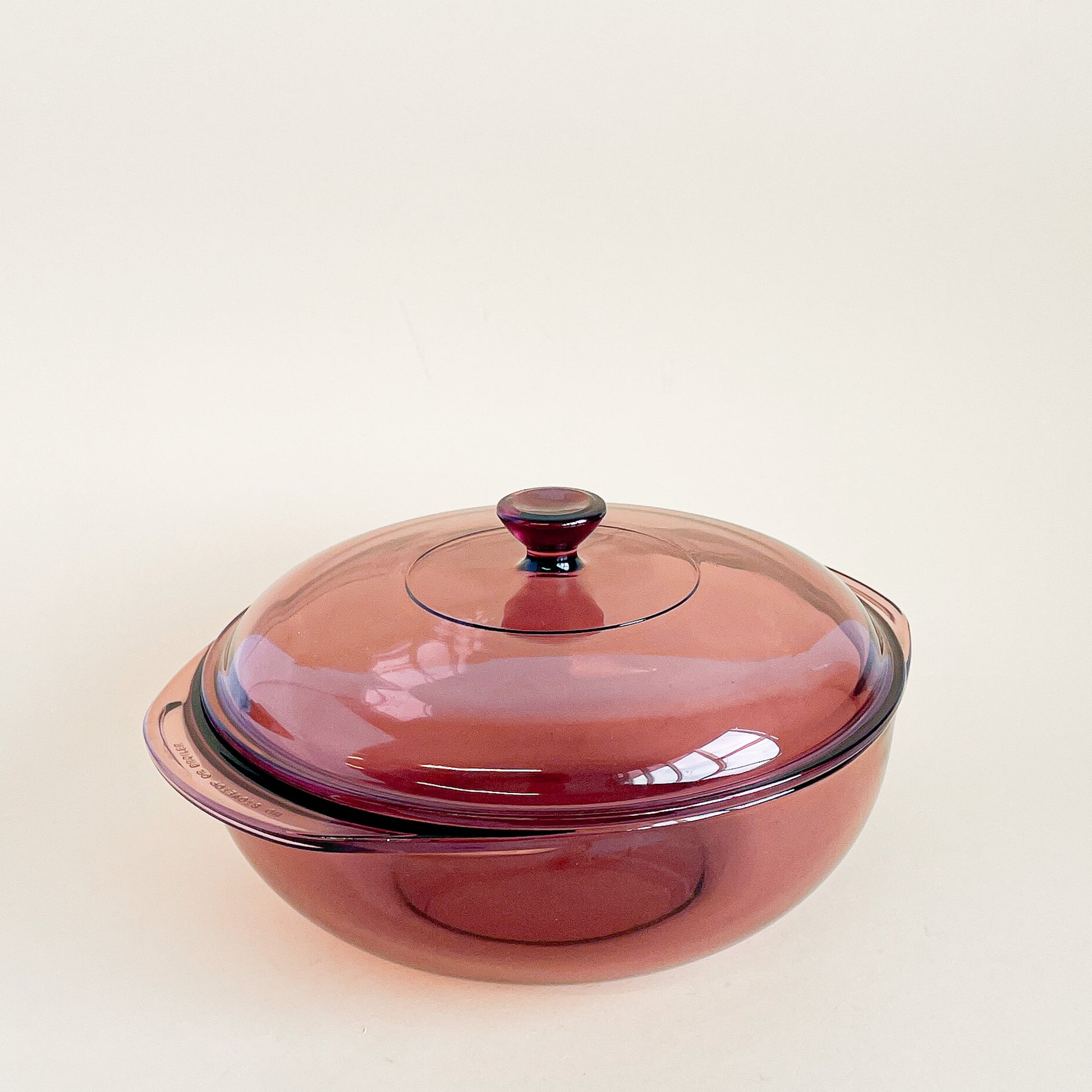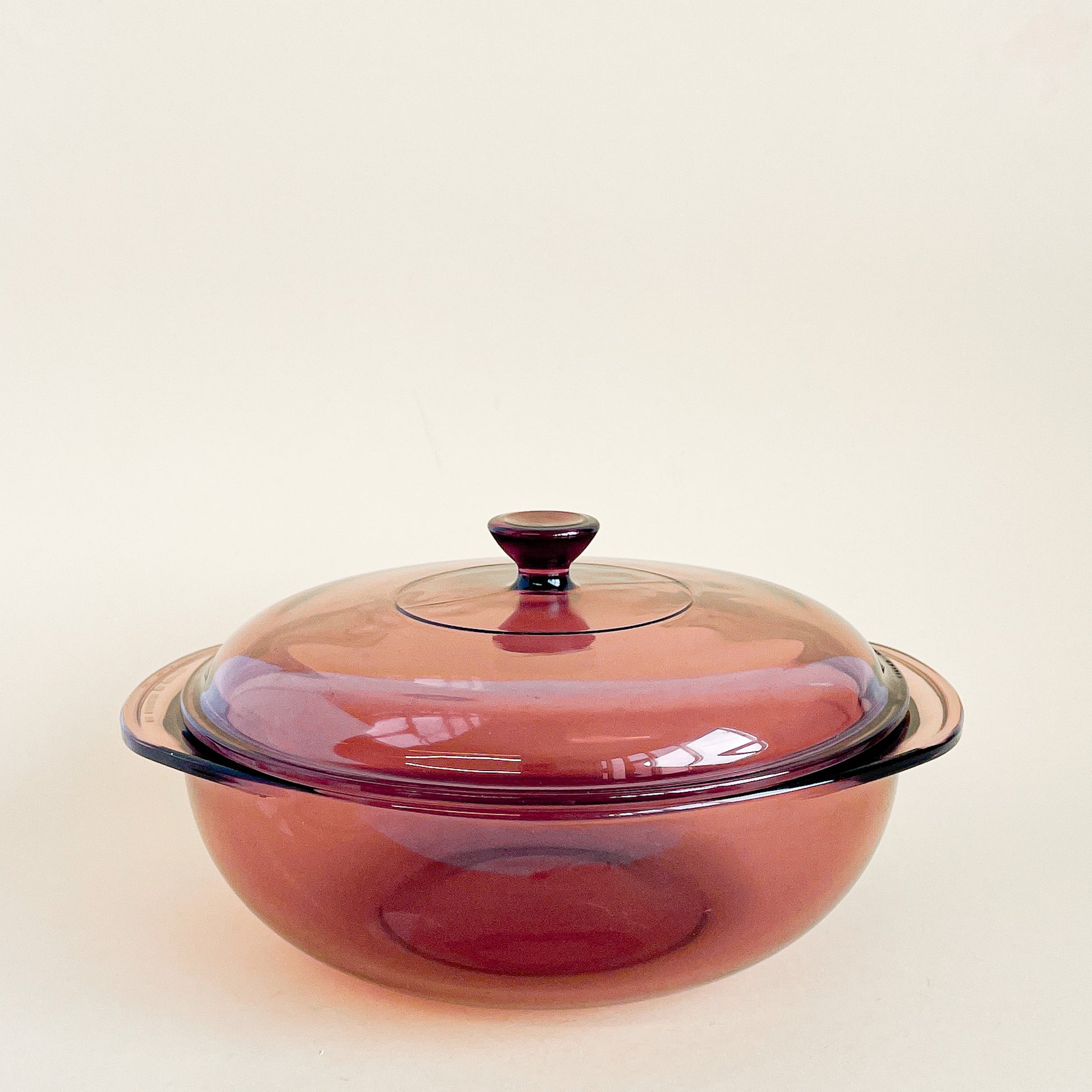 Cranberry Glass Casserole Made in the USA by Pyrex. It is oven and microwave safe. 2 liter capacity.