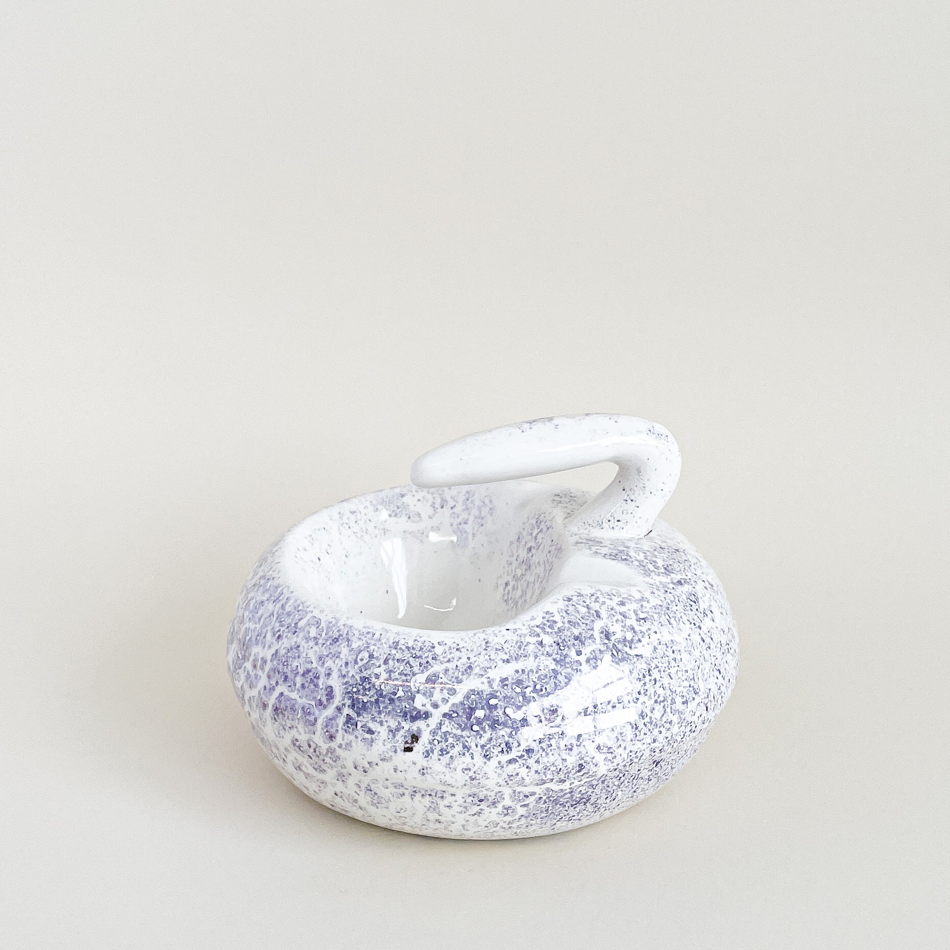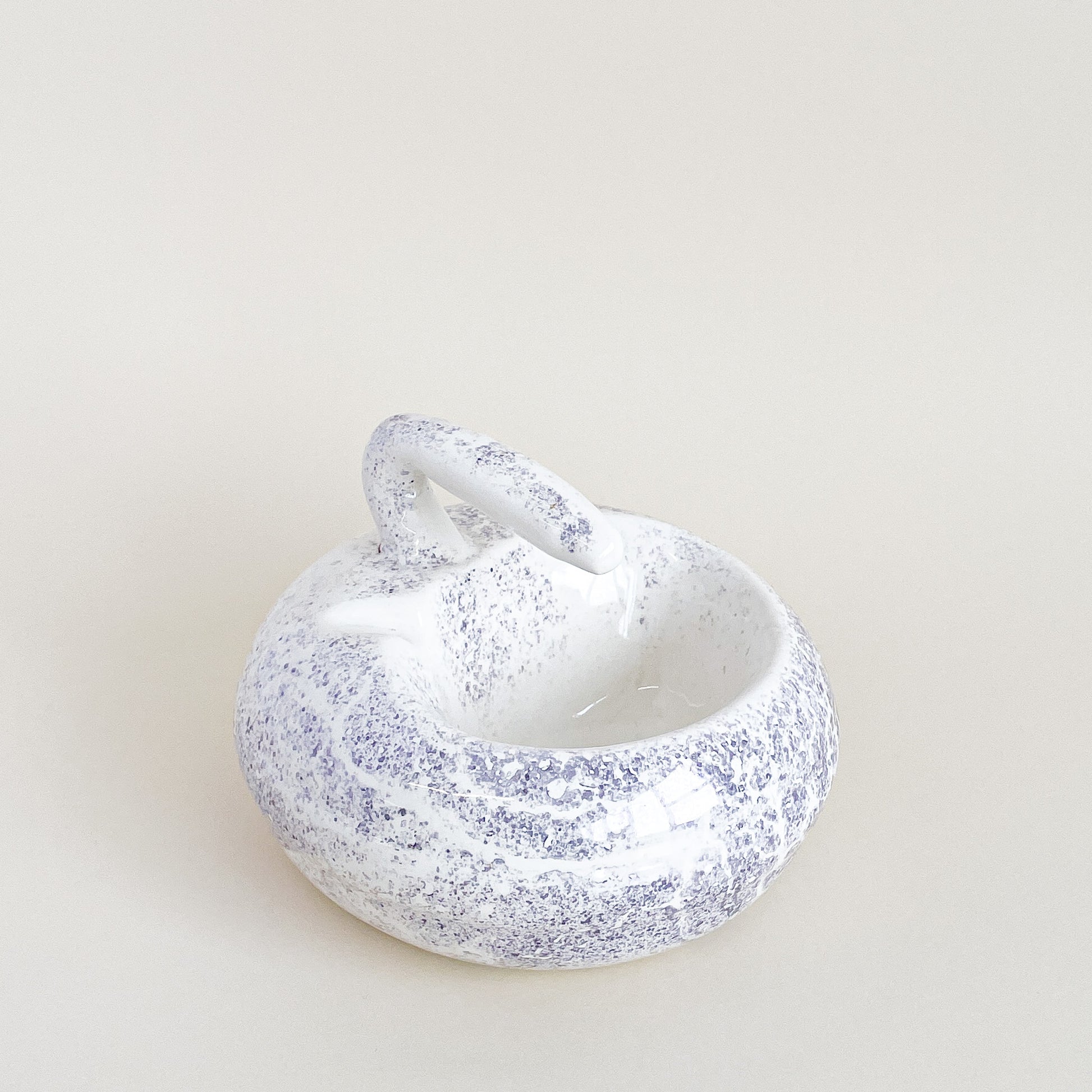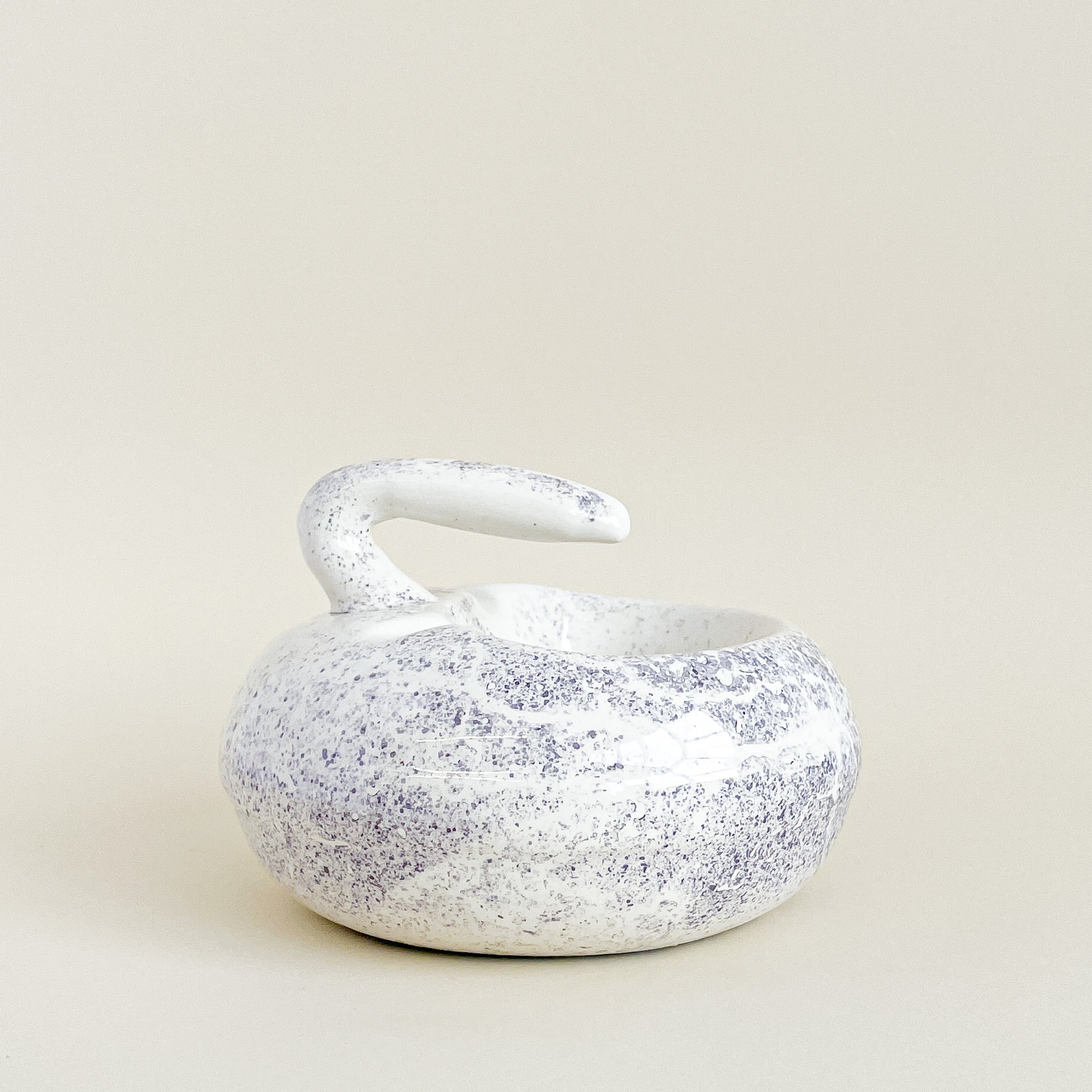 Very cool off-white ceramic catch-all with dark mauve speckles, in the shape of a curling stone. 🥌