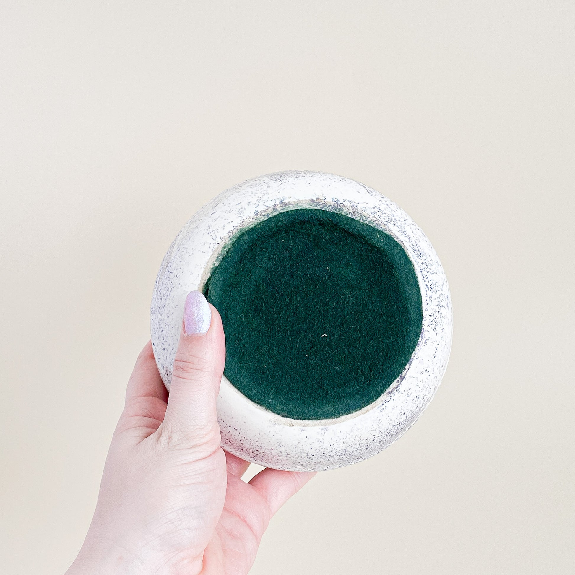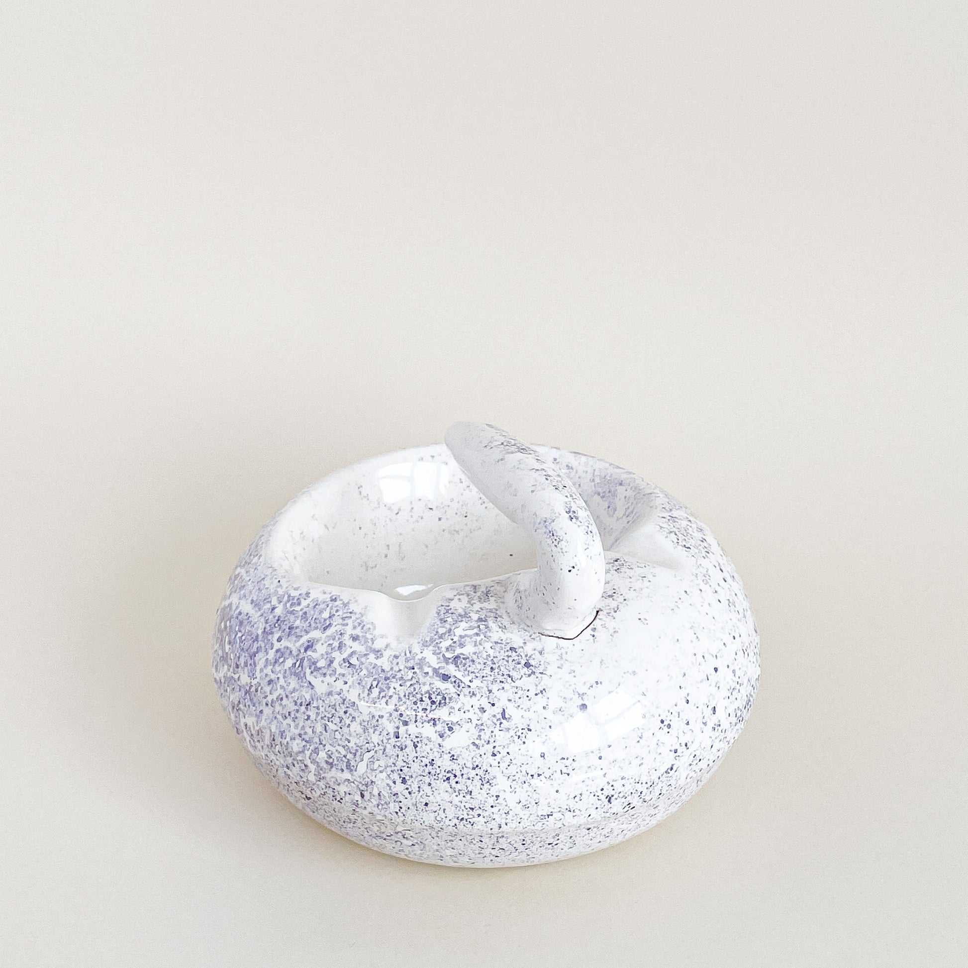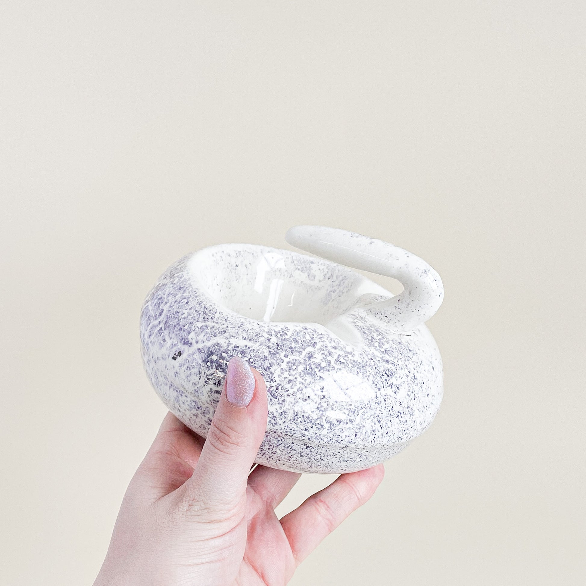 Very cool off-white ceramic catch-all with dark mauve speckles, in the shape of a curling stone. 🥌
