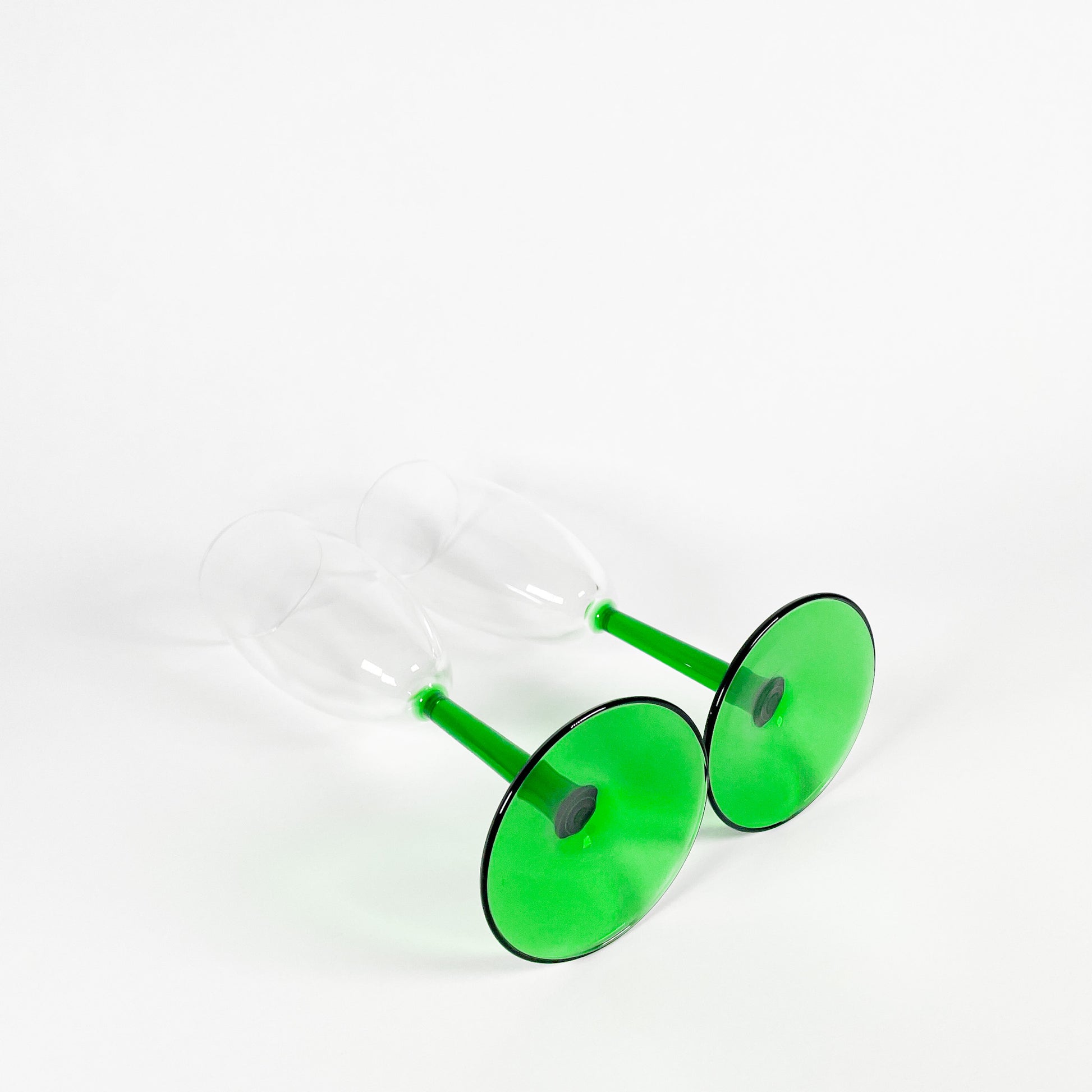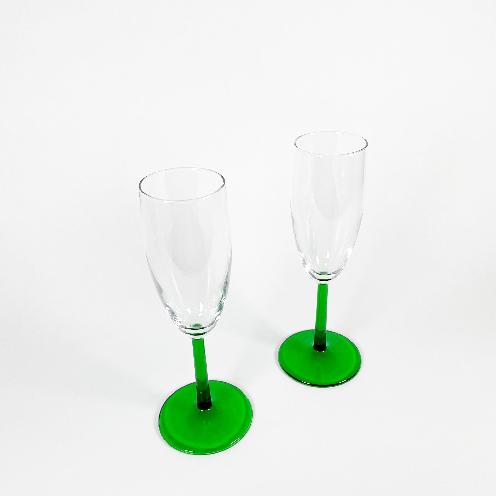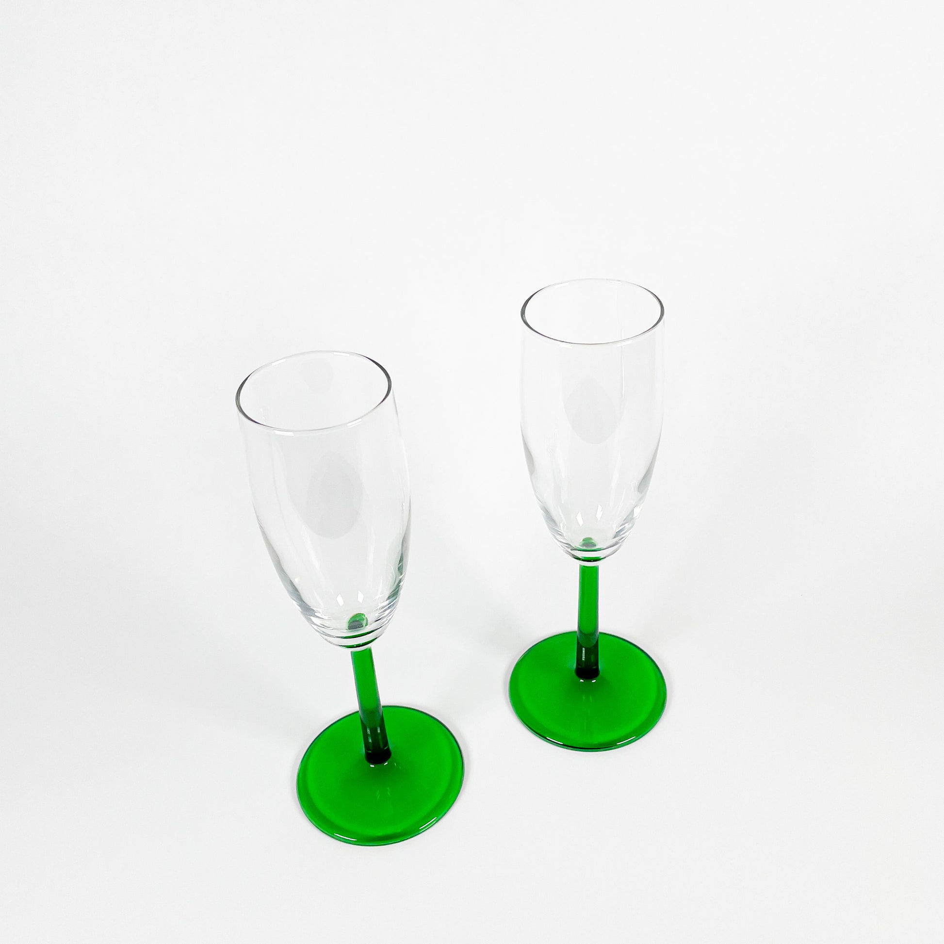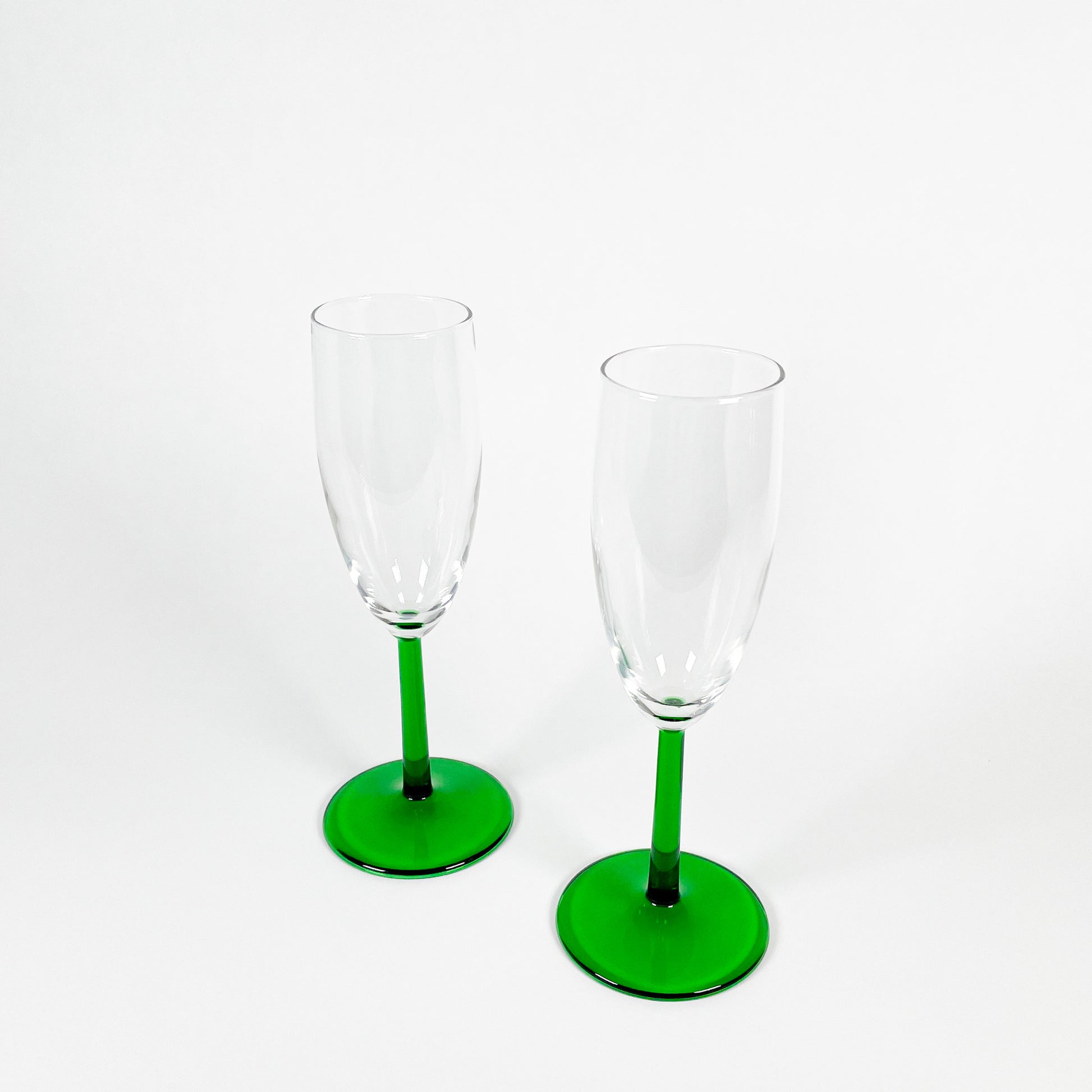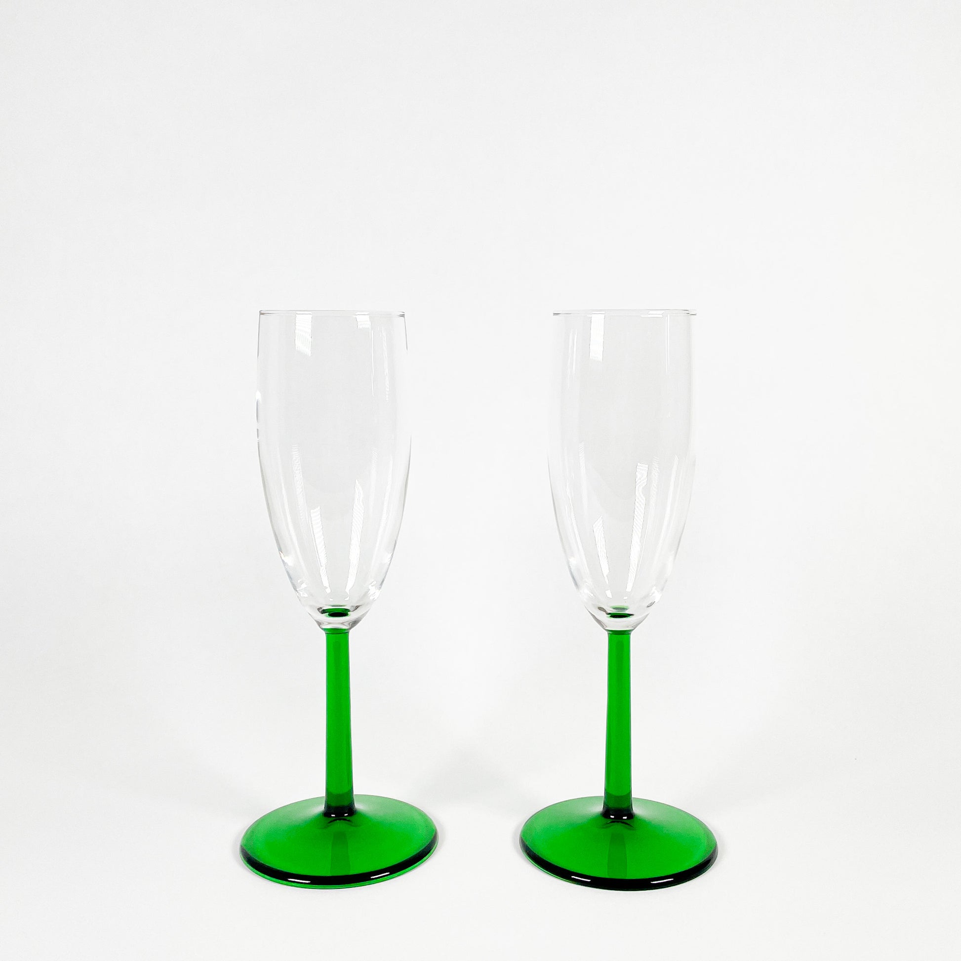 Set of 2 dark green stemmed champagne flutes.