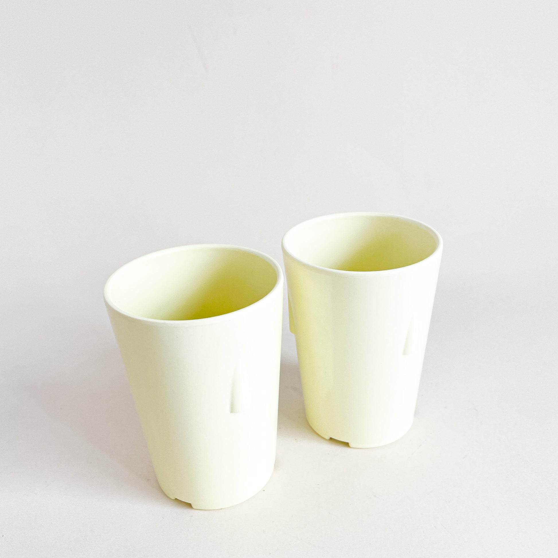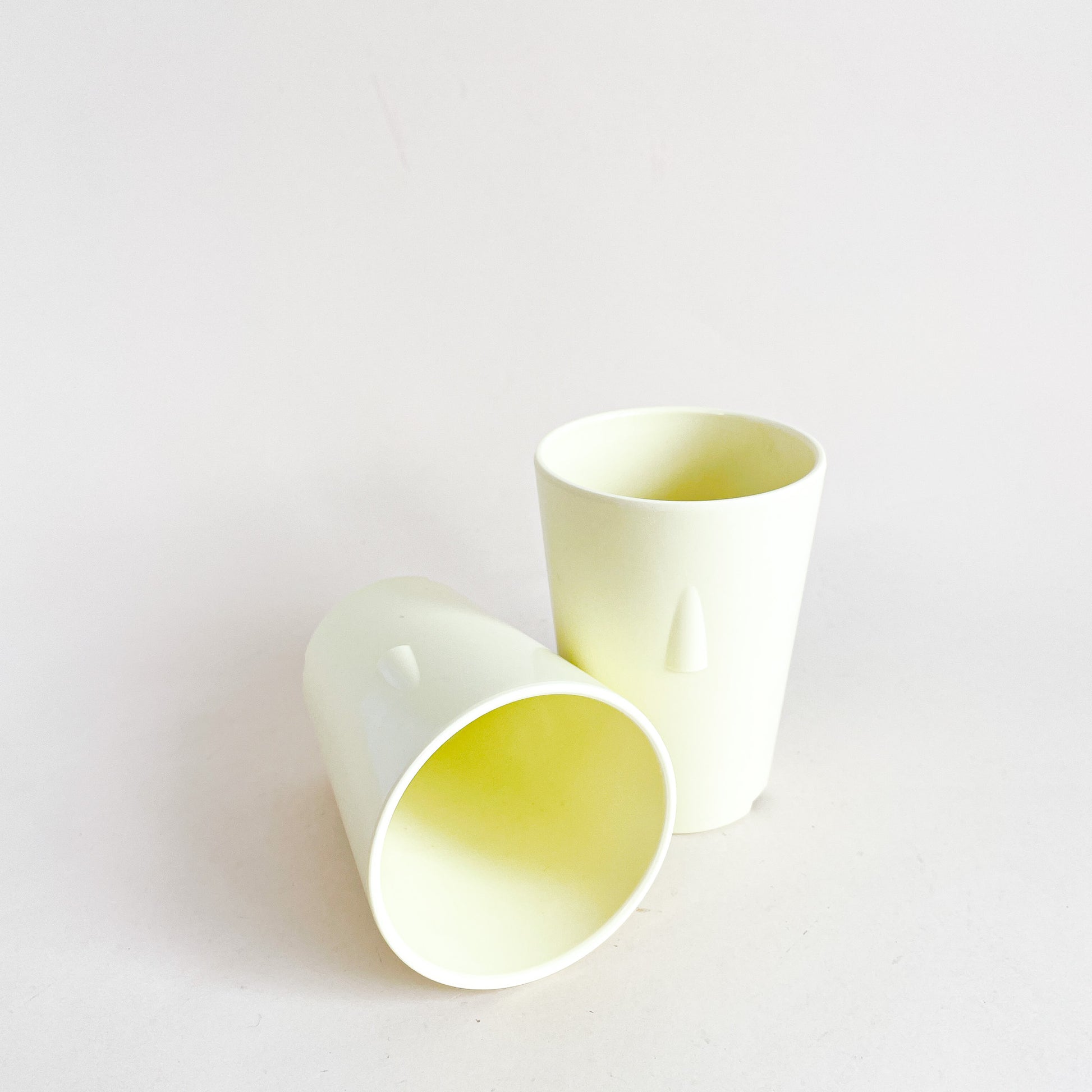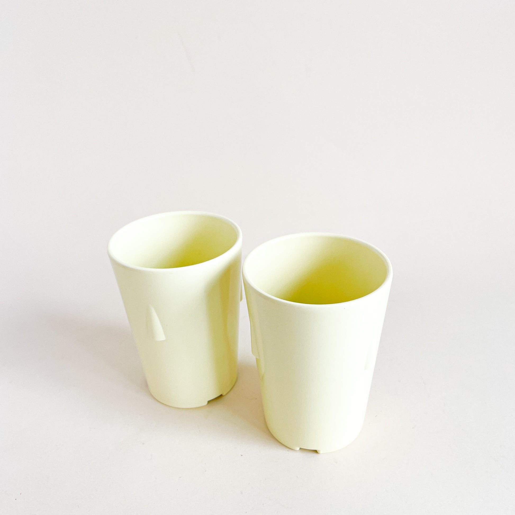 Set of 2 pastel yellow melamine cups, made in Canada by Mistral.