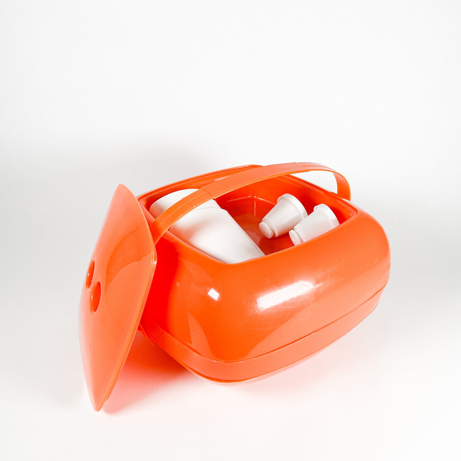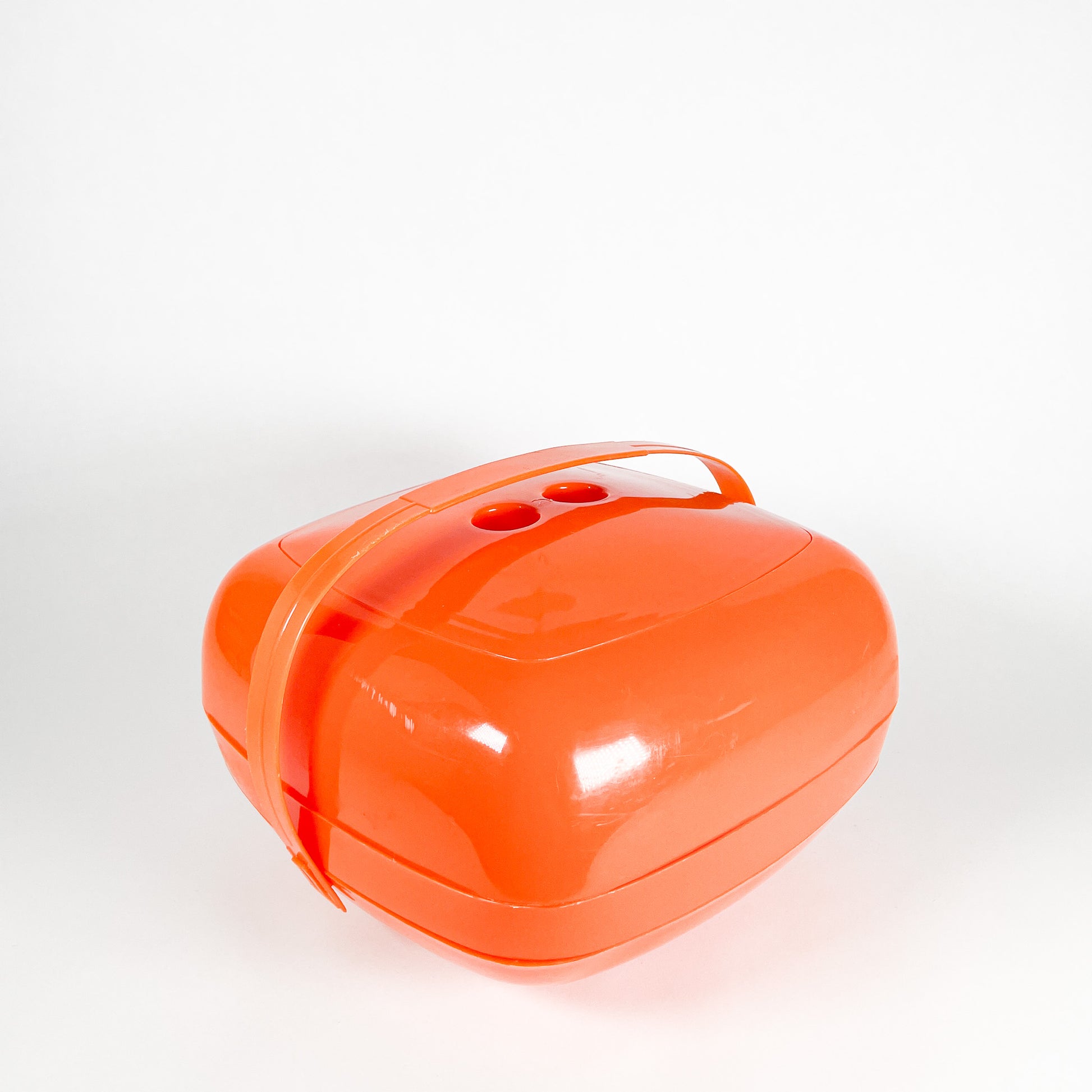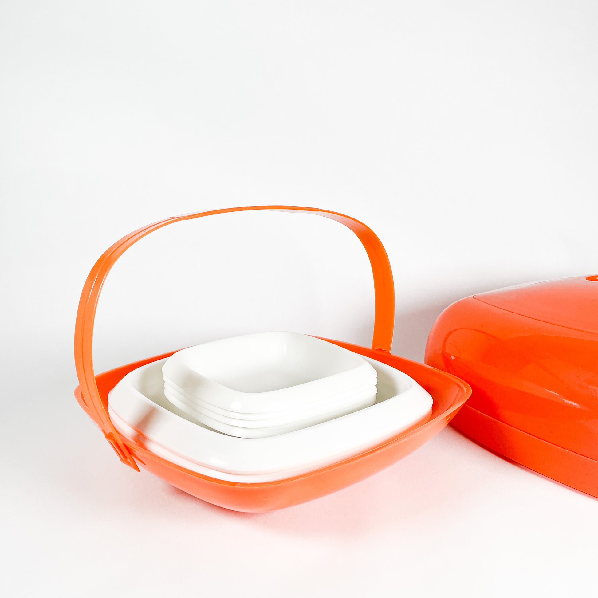 Really cool bright orange plastic space age style picnic set made in Mexico. You're going to be so stylish with this at the park this summer!!!