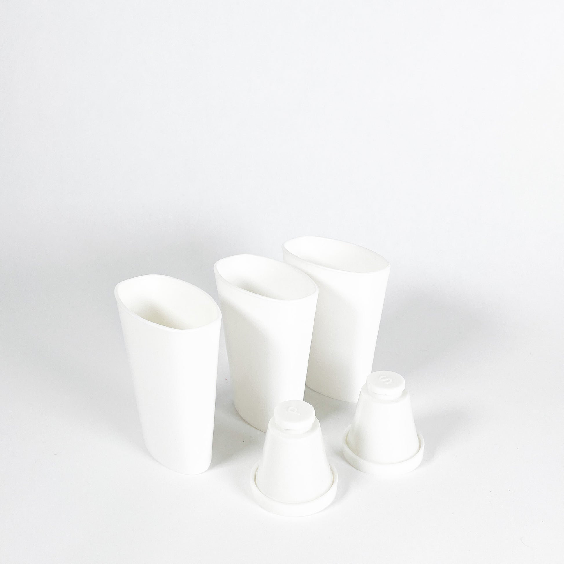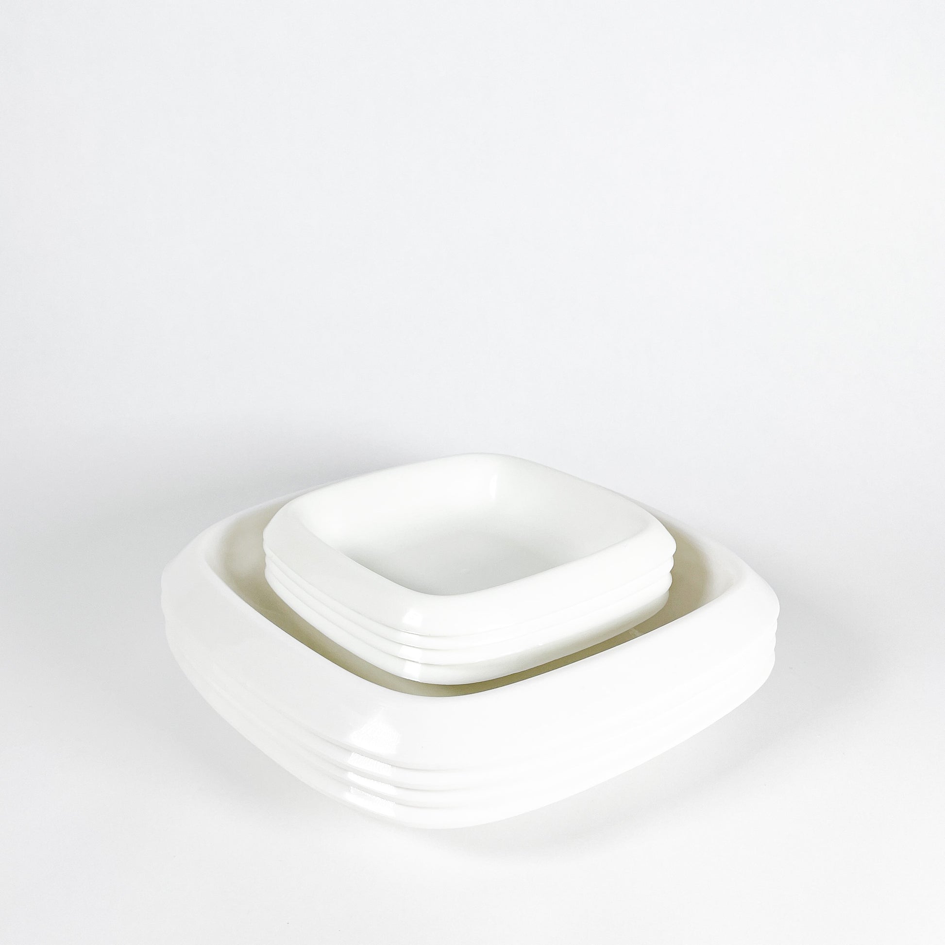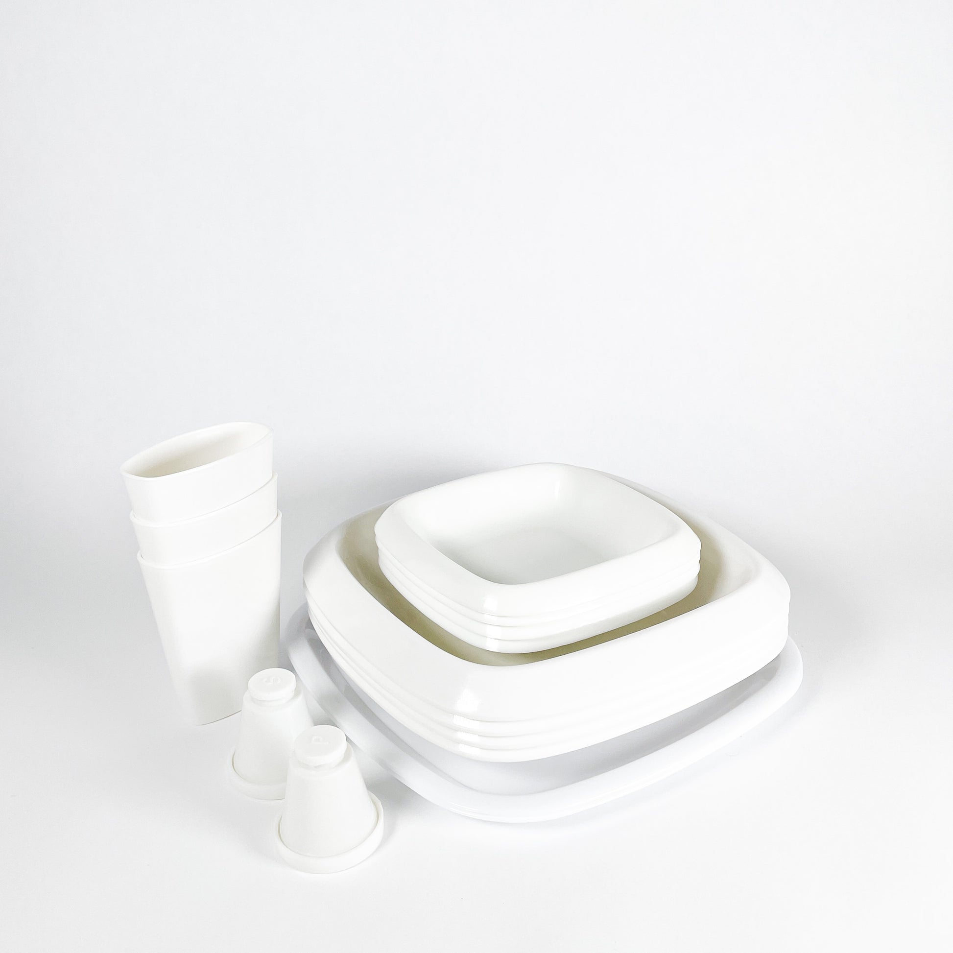 The set is unfortunately incomplete, it includes: 3 small cups, salt and pepper shakers, 4 large bowls, 4 small bowls and 2 large plates. The good news is that it's easy to add utensils inside!