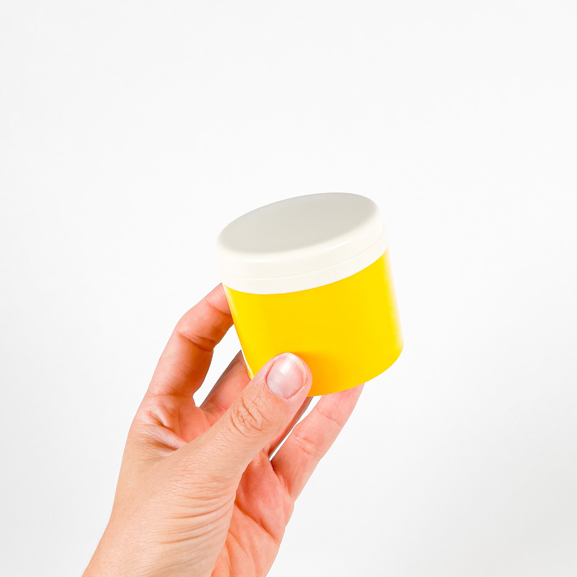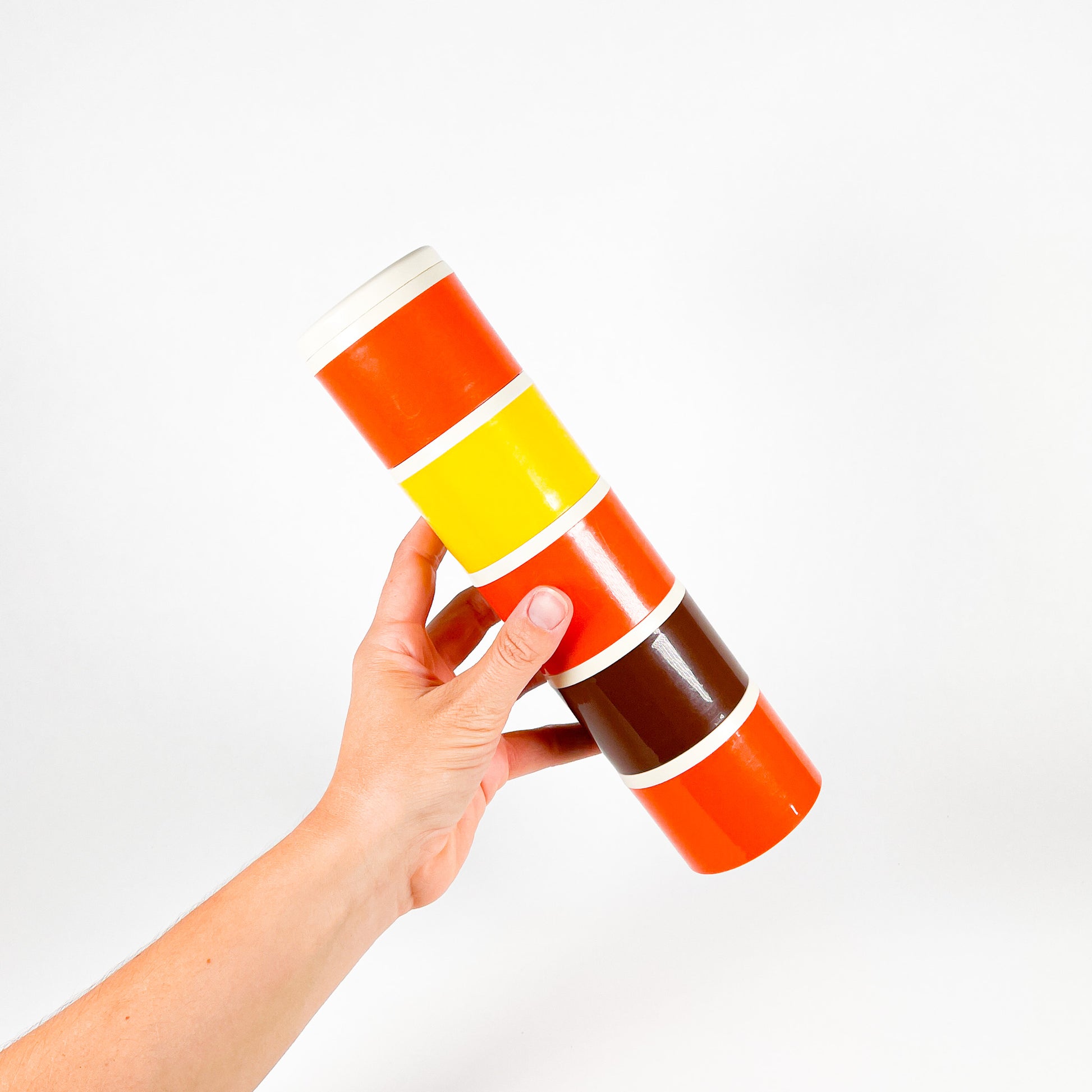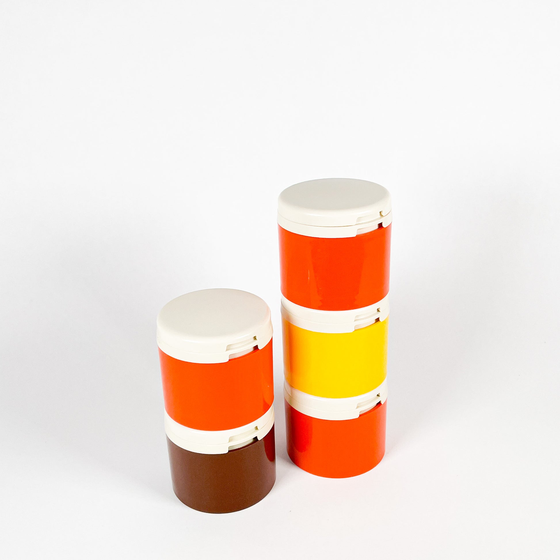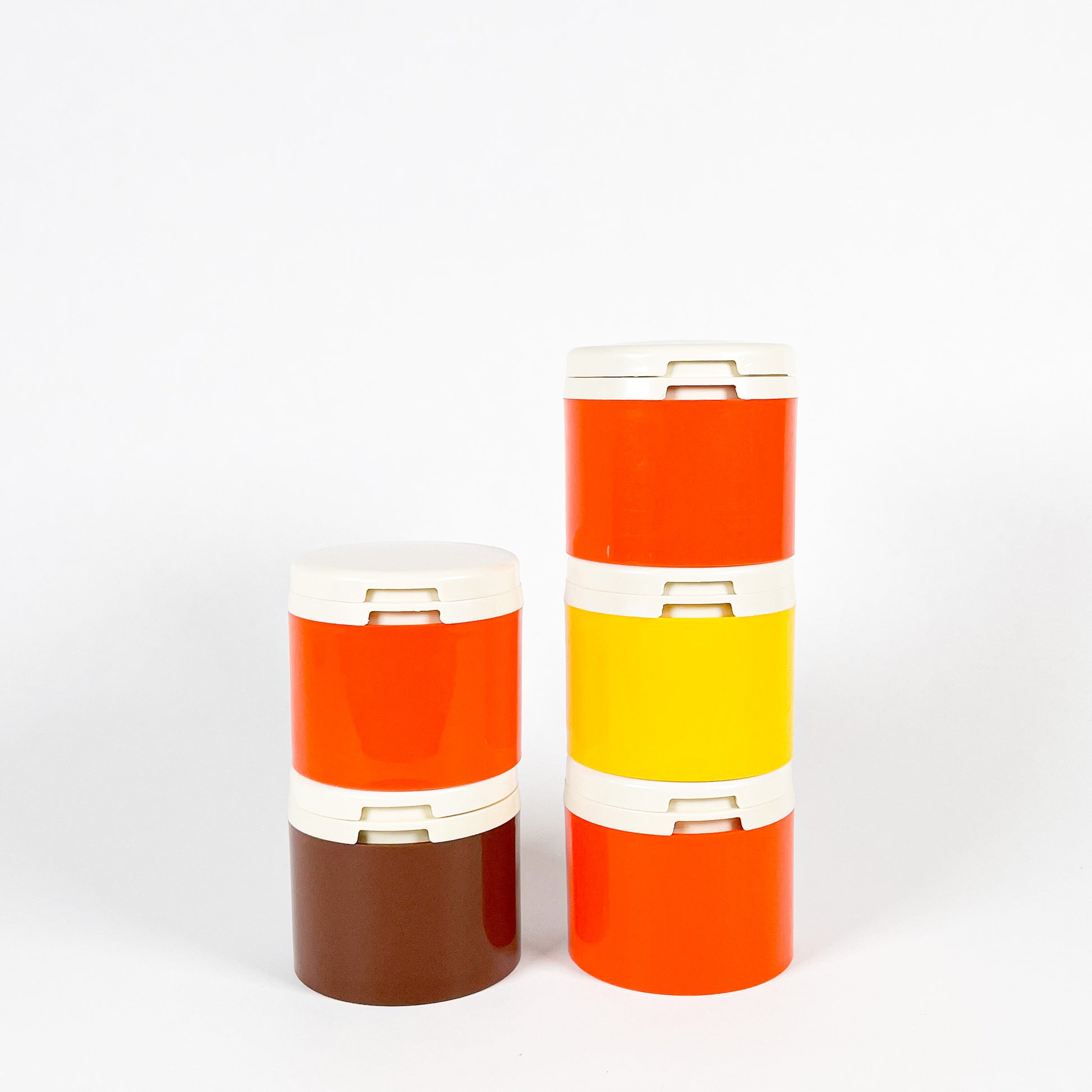 Very good vintage condition. 1 tear on the beige lid of an orange jar (see last photo).