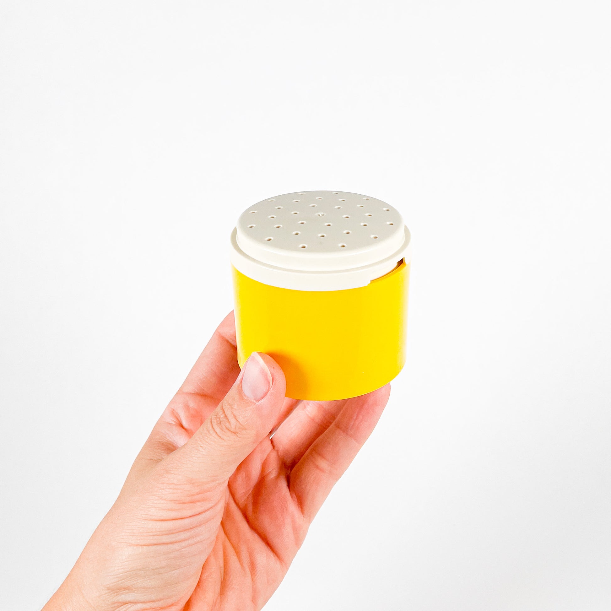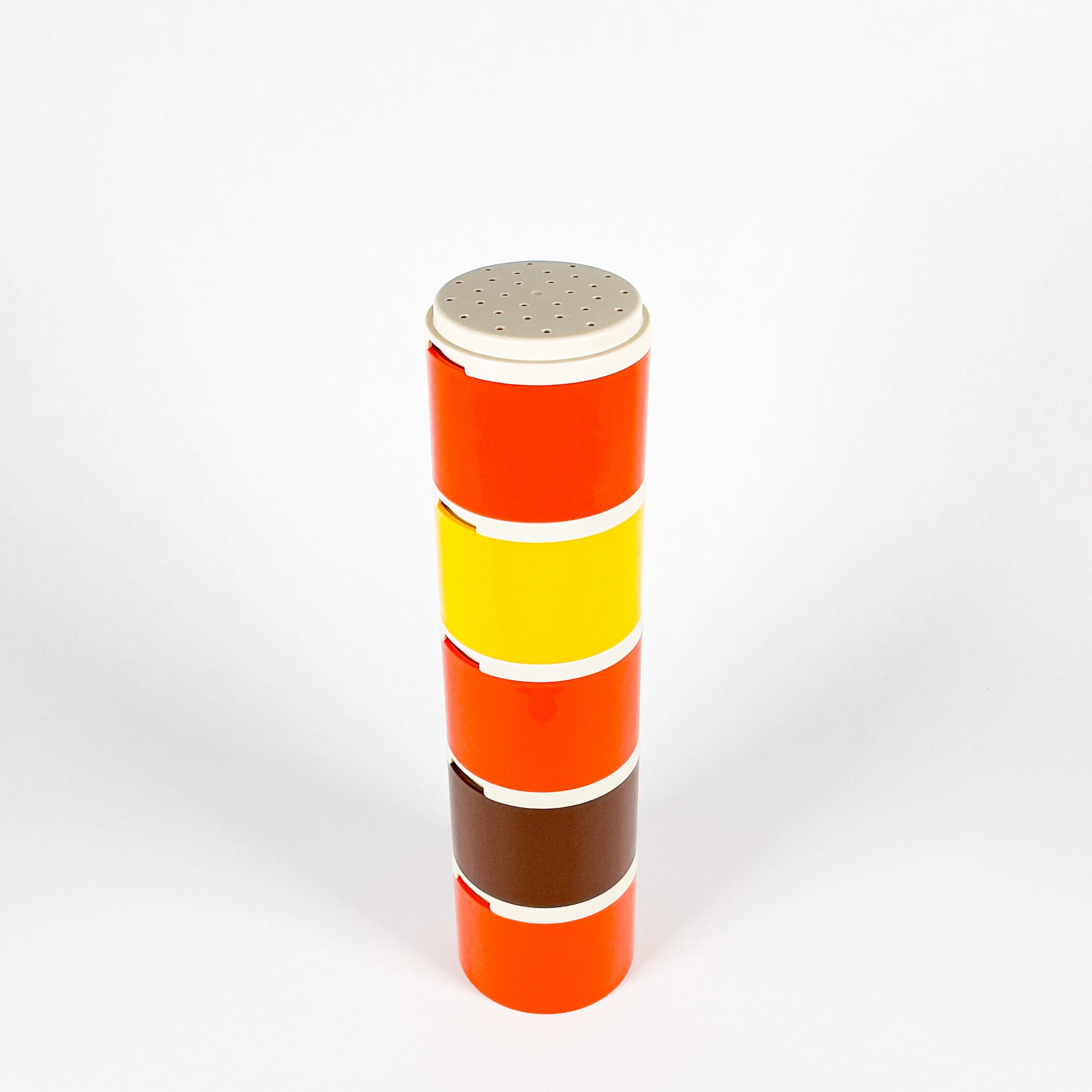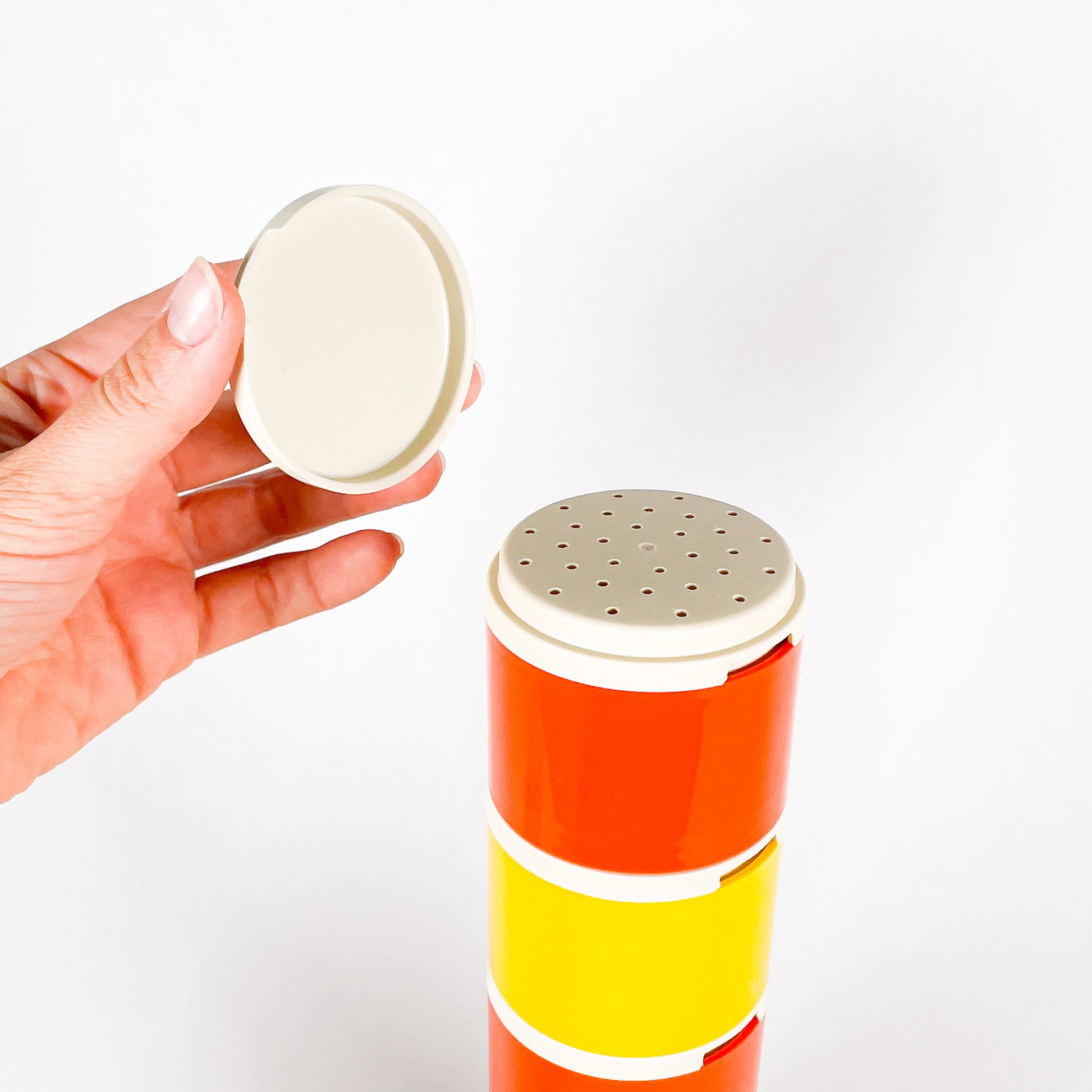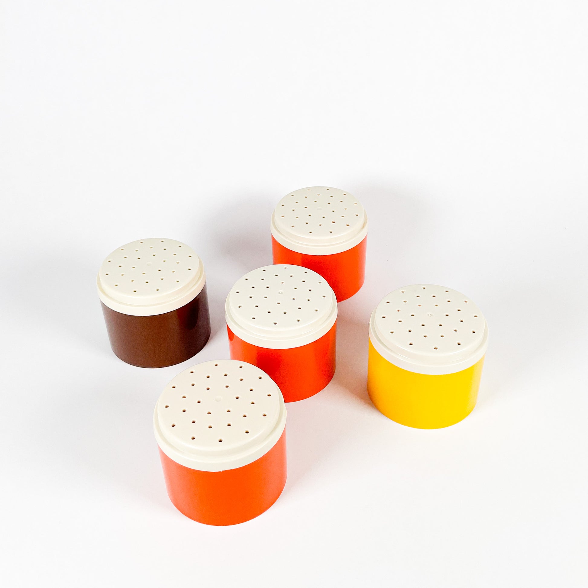 Set of 5 Tupperware spice jars and 5 plastic lids, made in Canada.