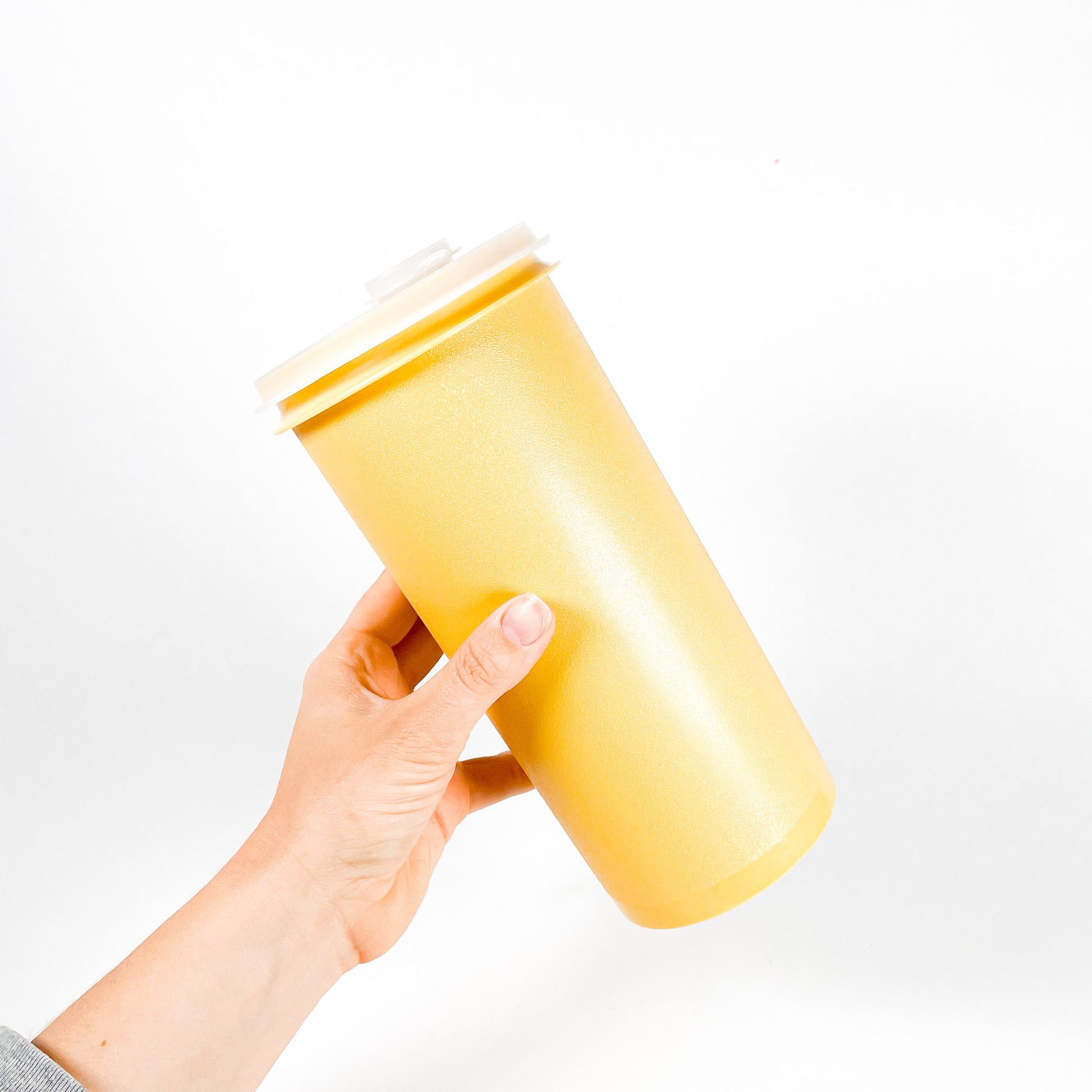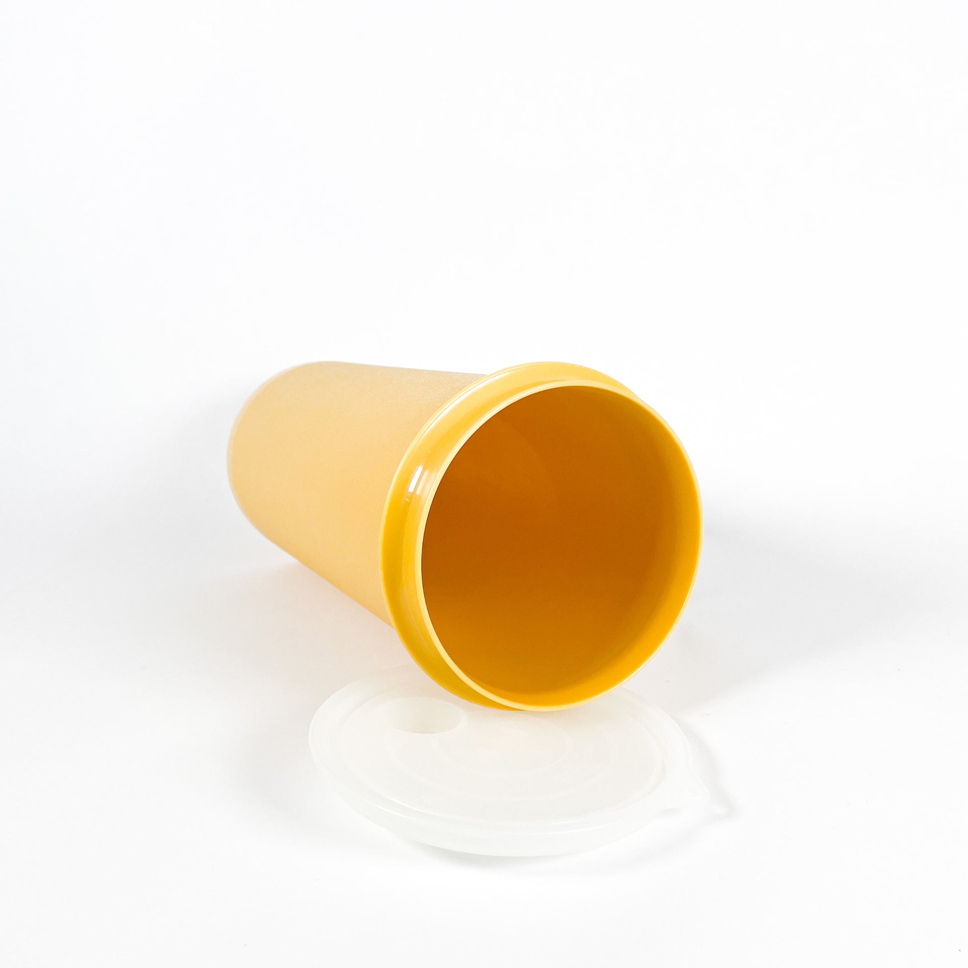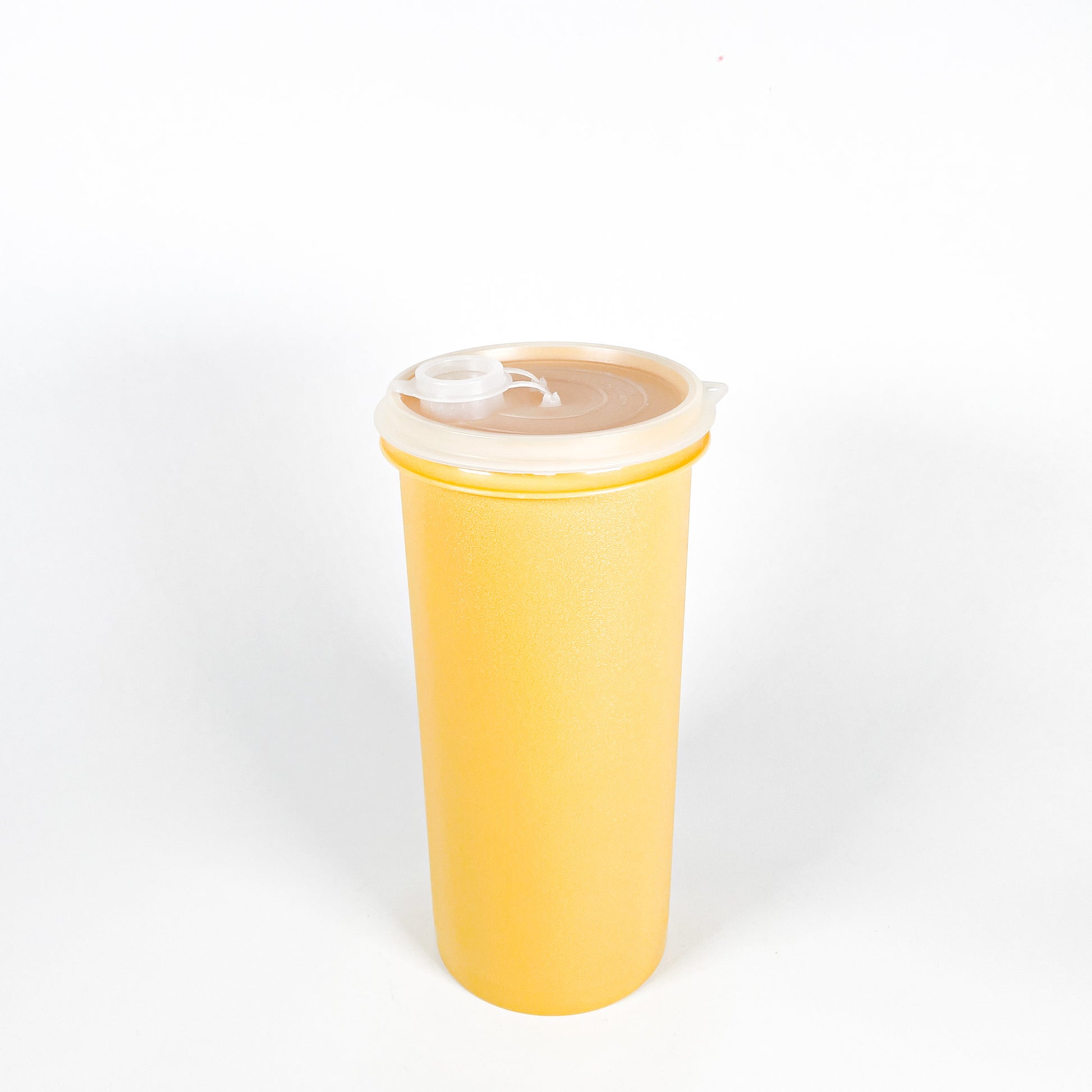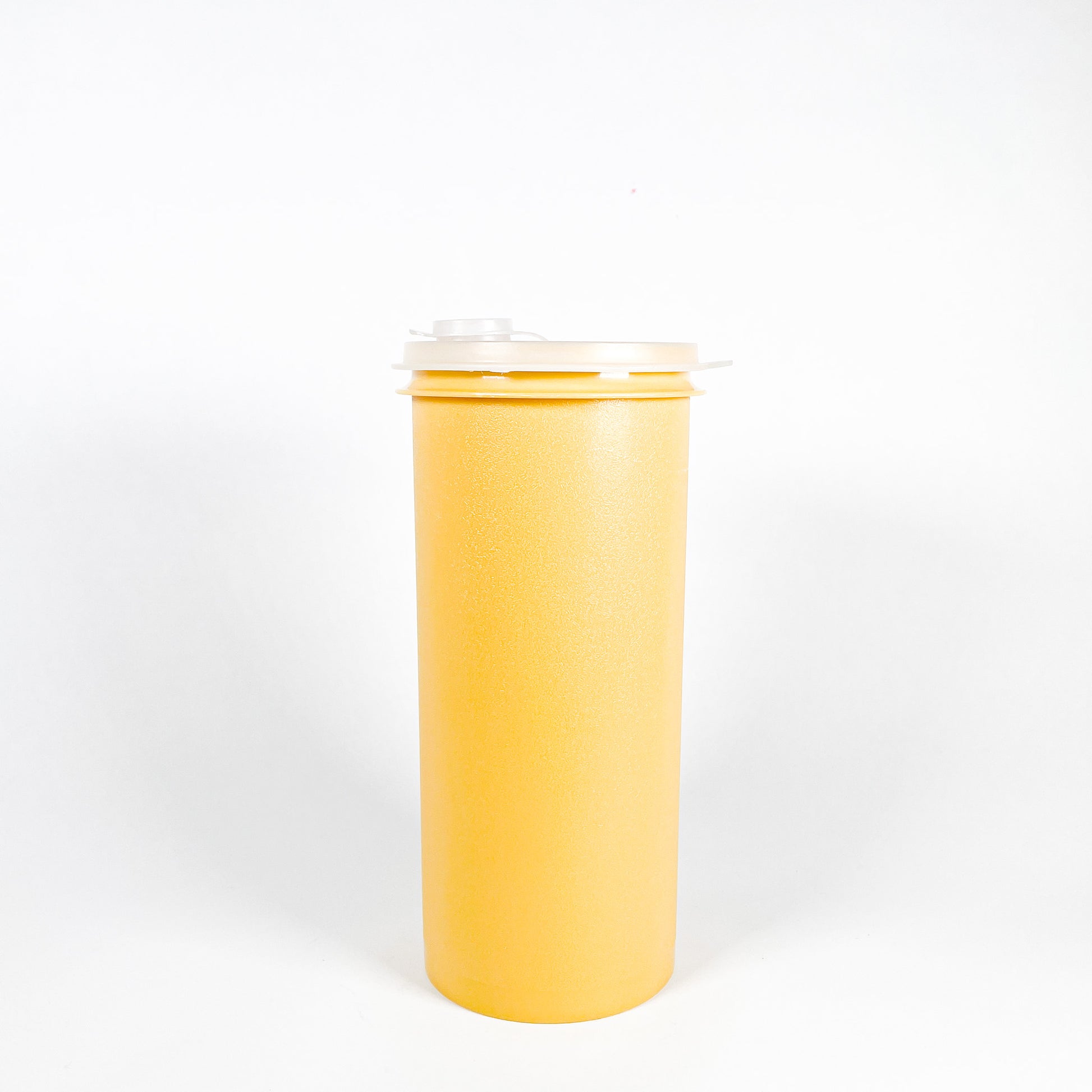 Large vinaigrette, maple syrup, or other jar, in mustard yellow plastic, manufactured by Crownware.