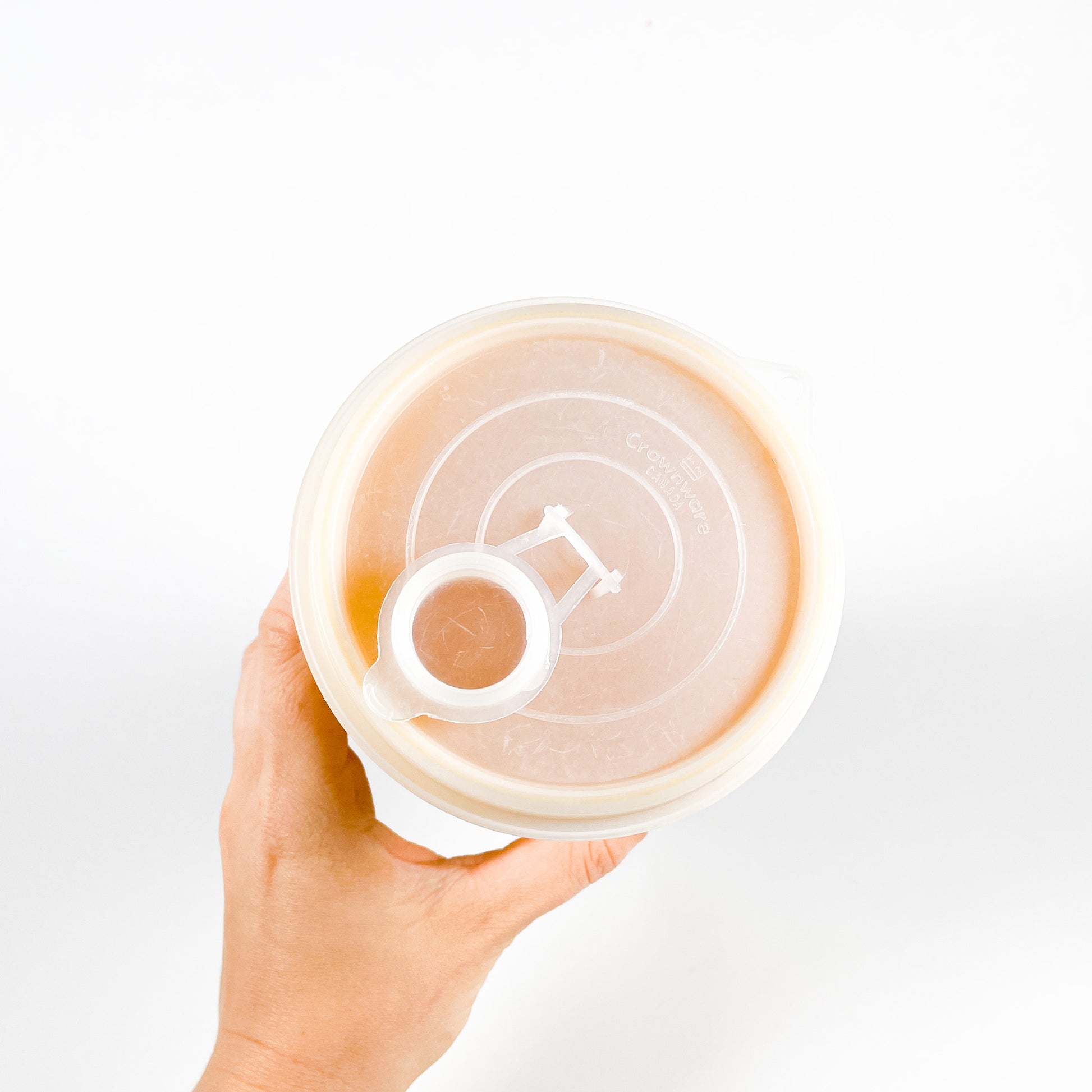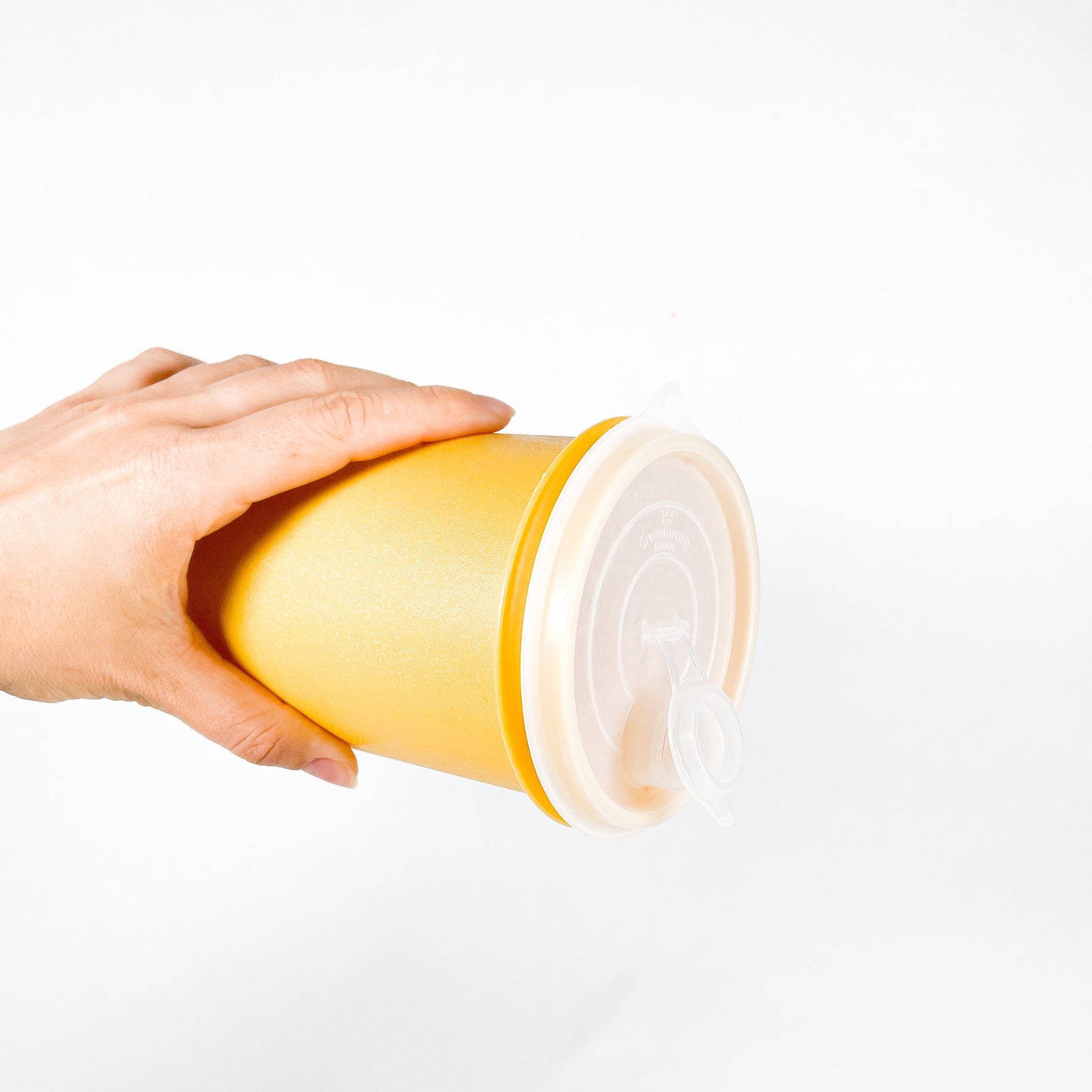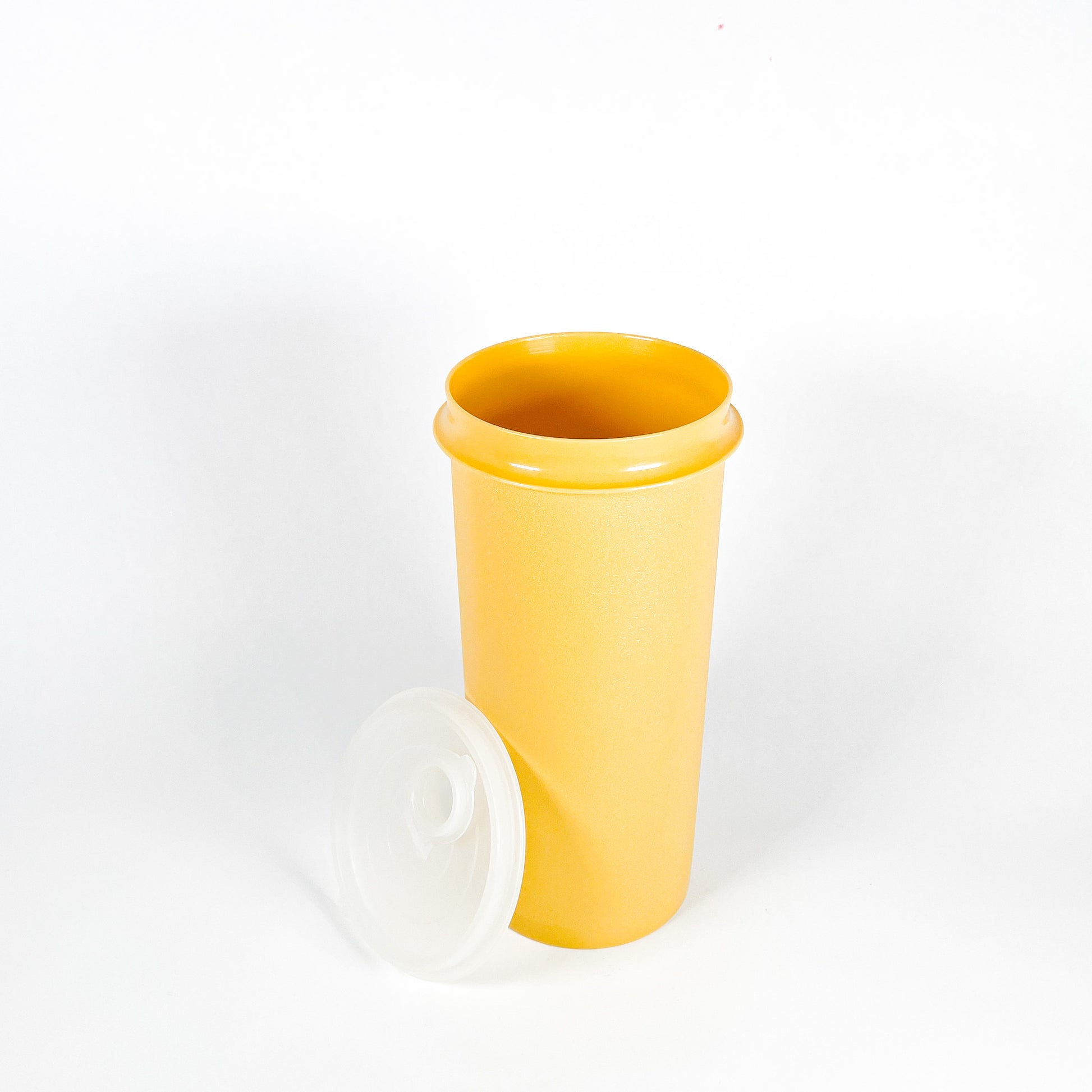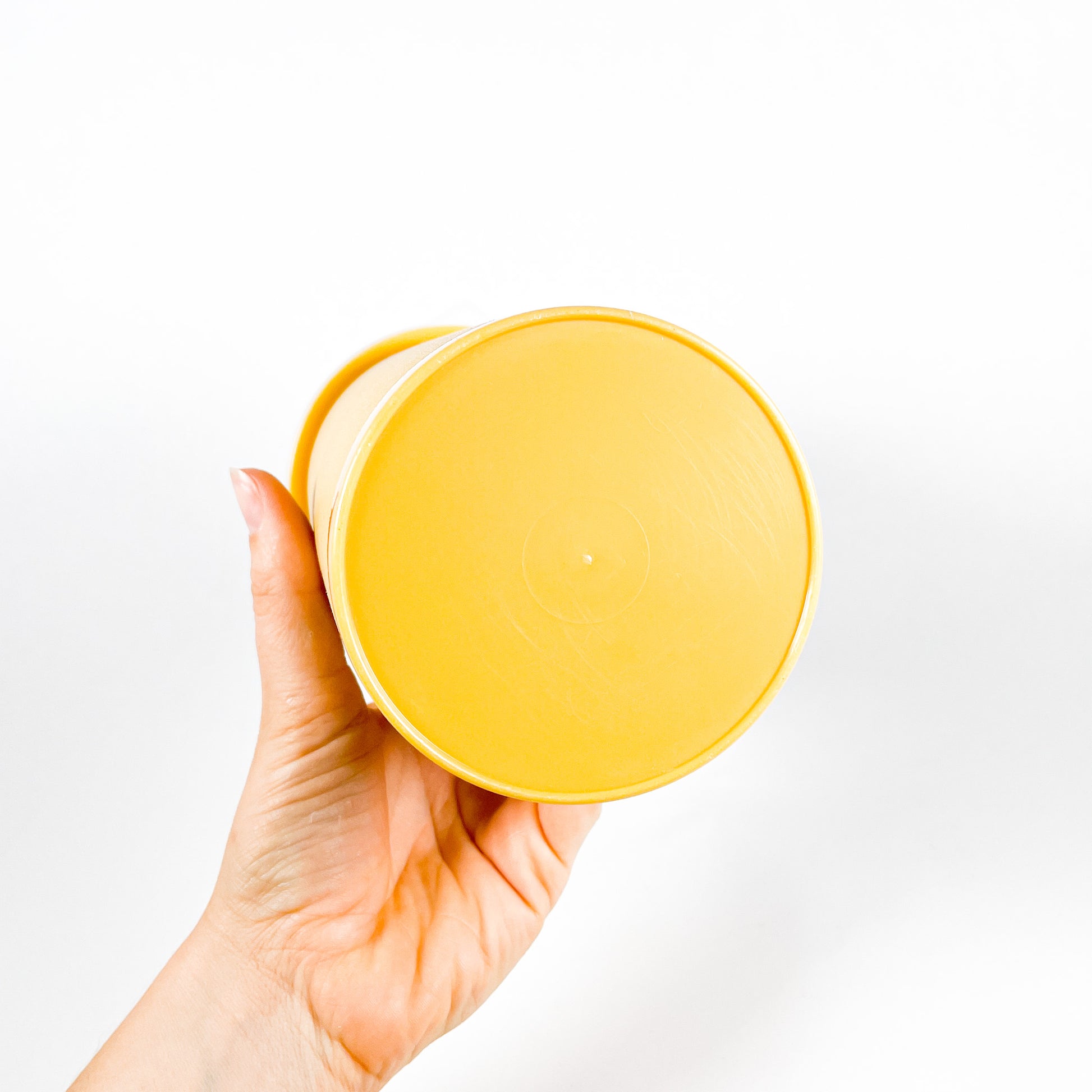Large vinaigrette, maple syrup, or other jar, in mustard yellow plastic, manufactured by Crownware.