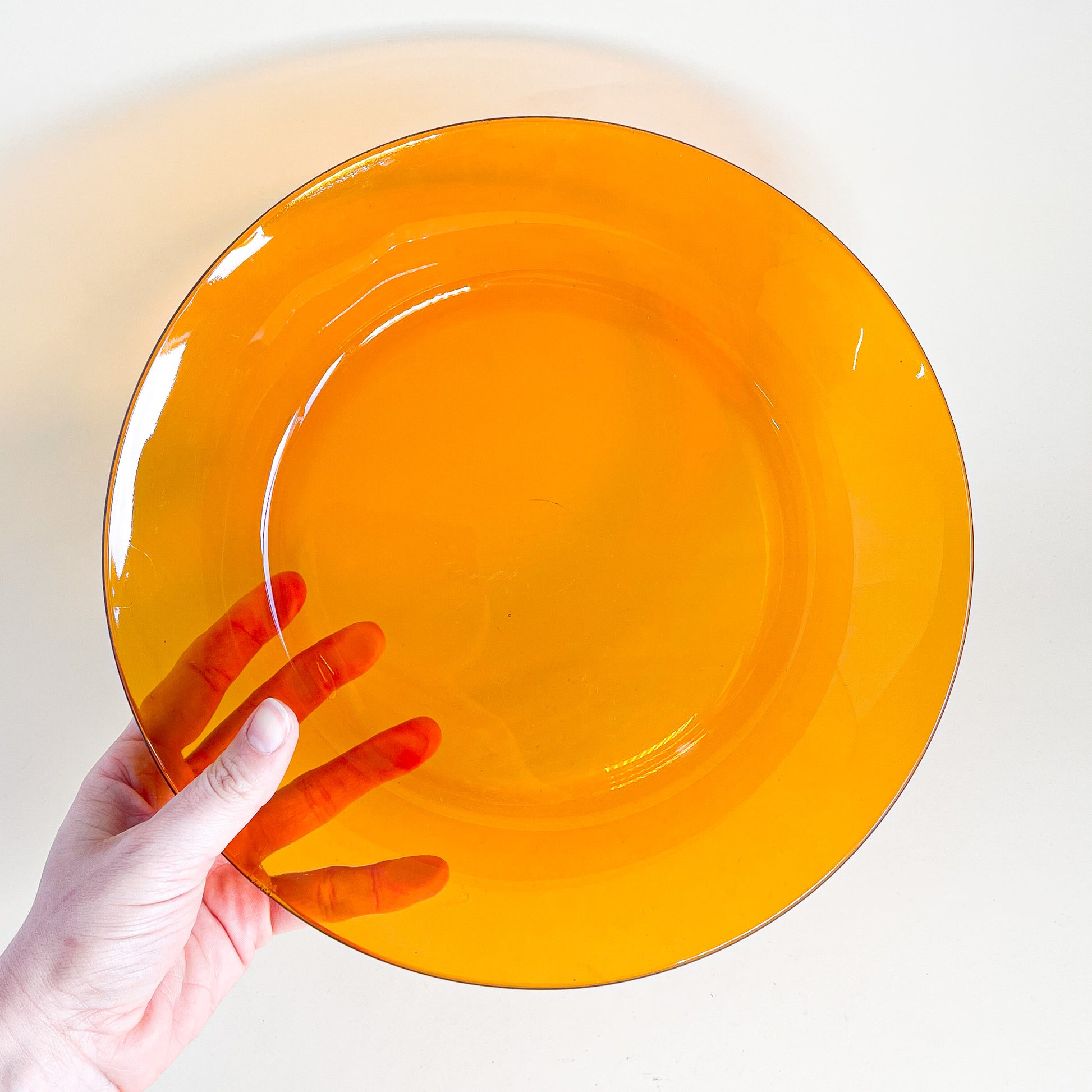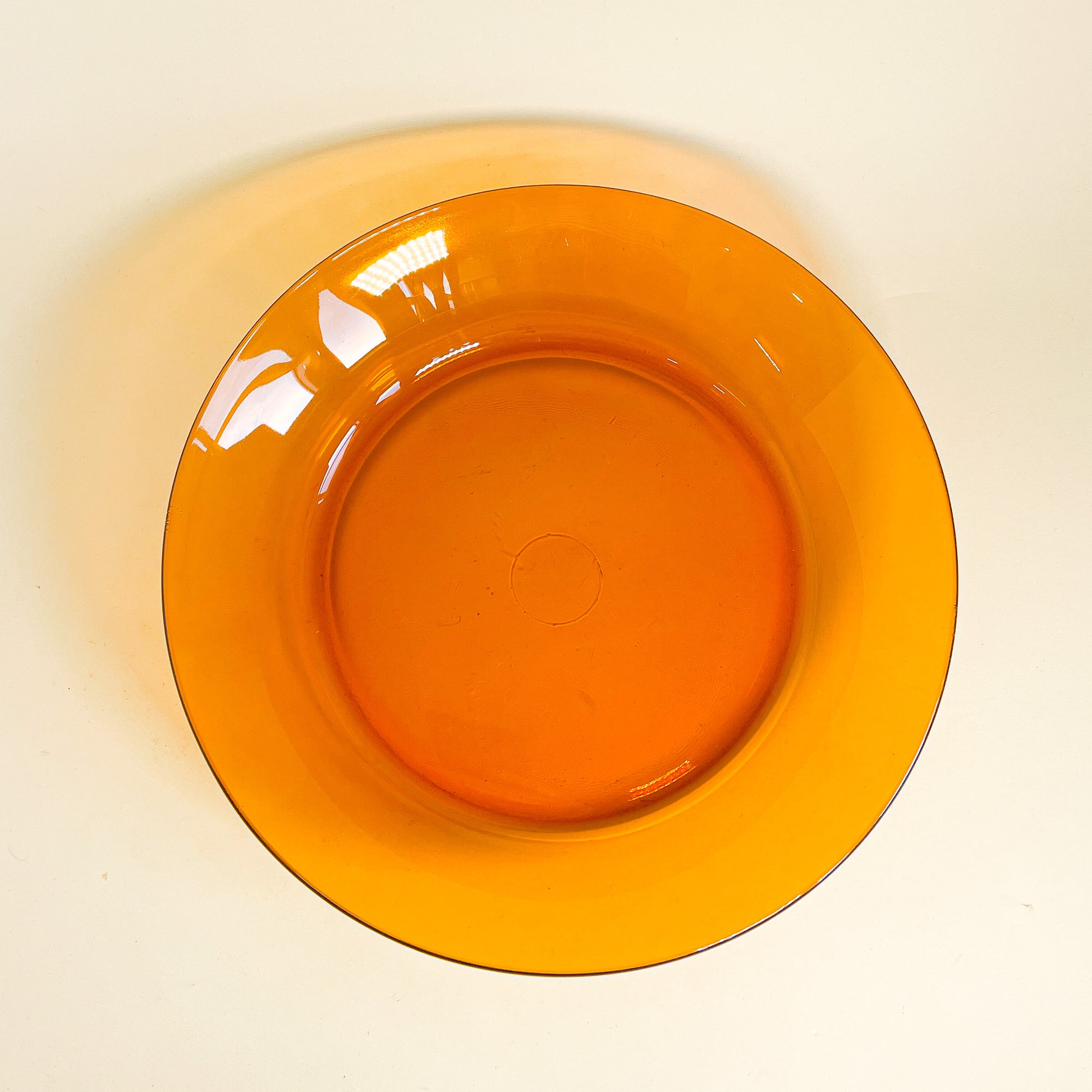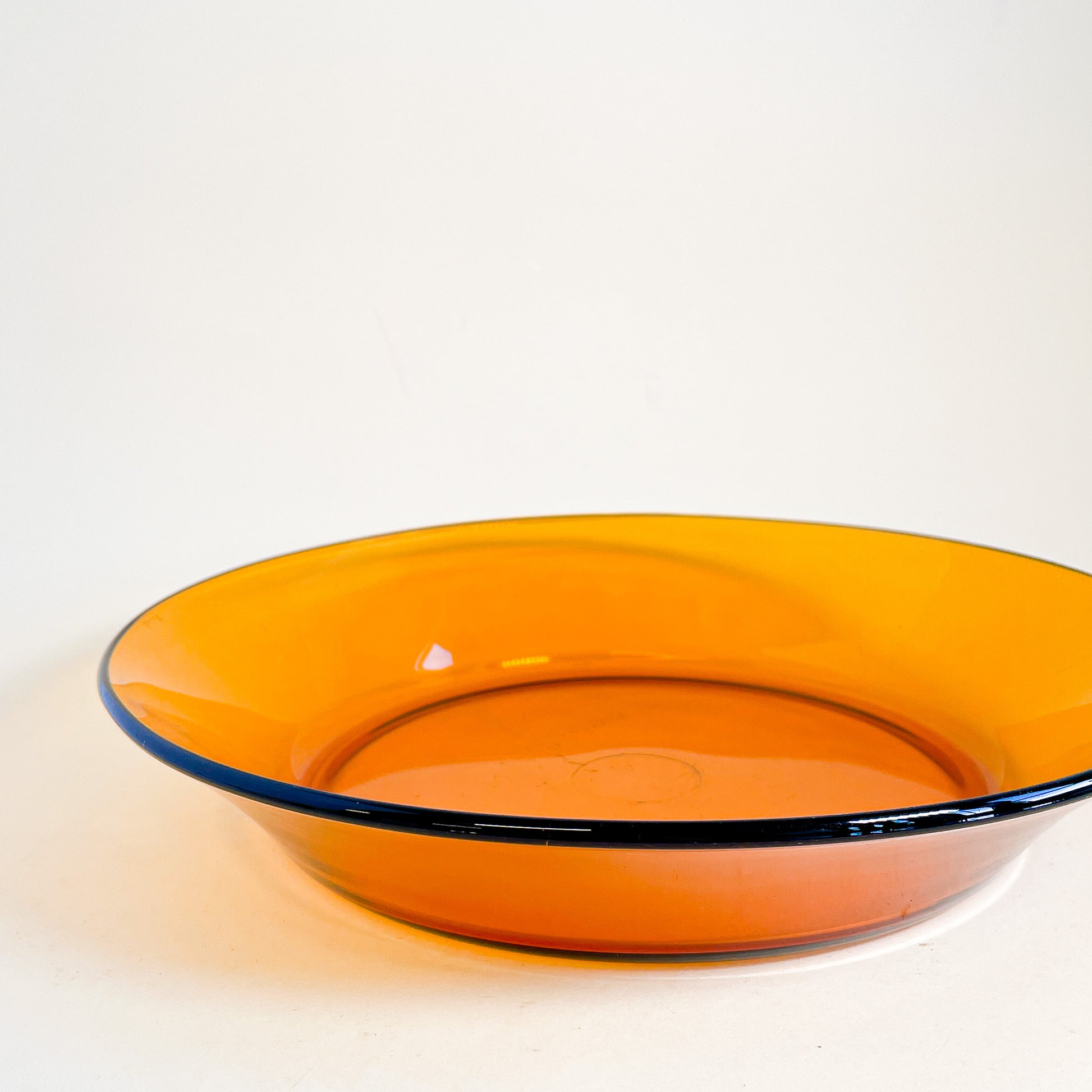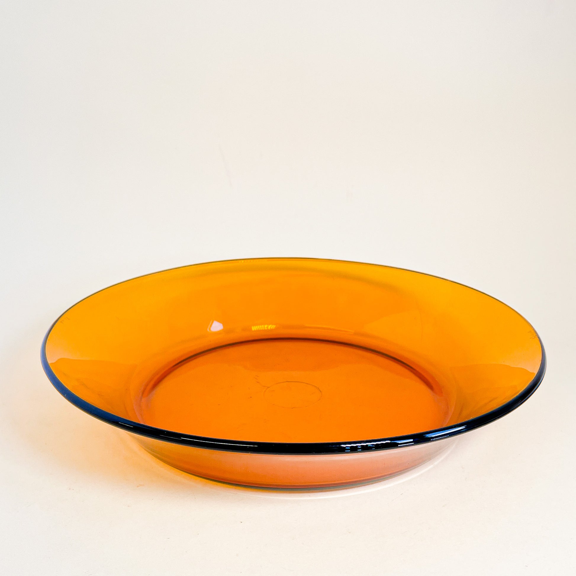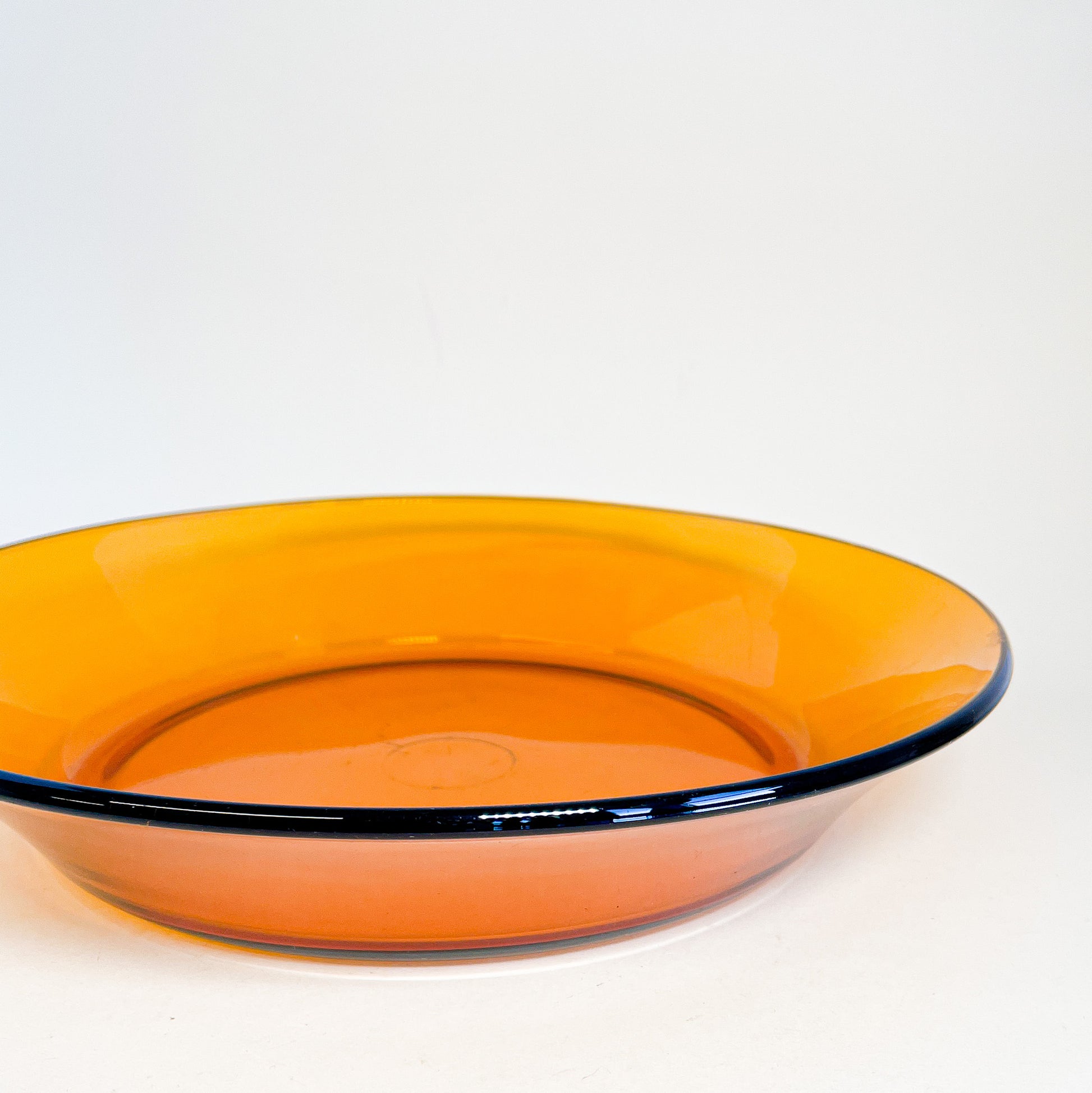 Beautiful large deep serving plate in amber glass, made in France by Duralex.