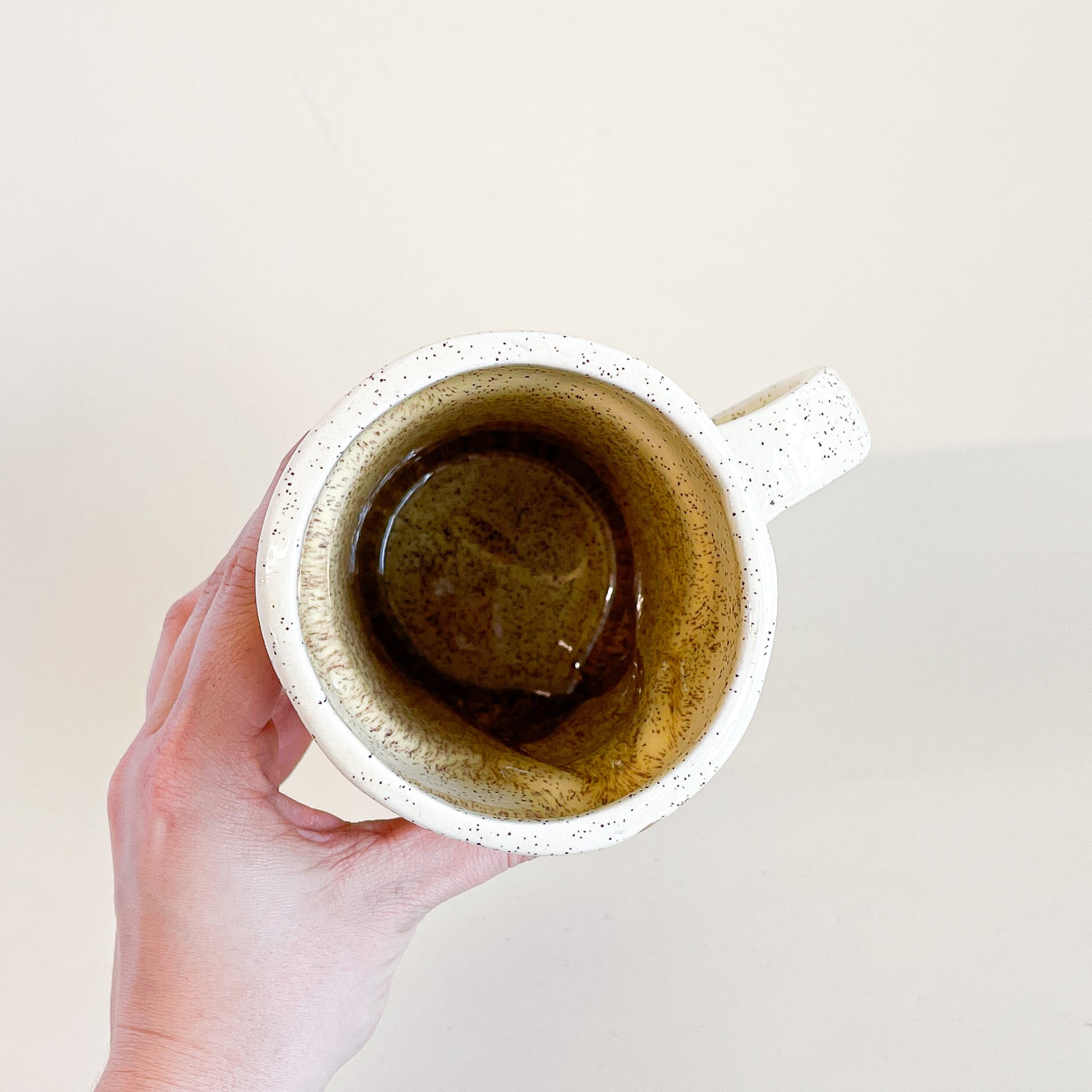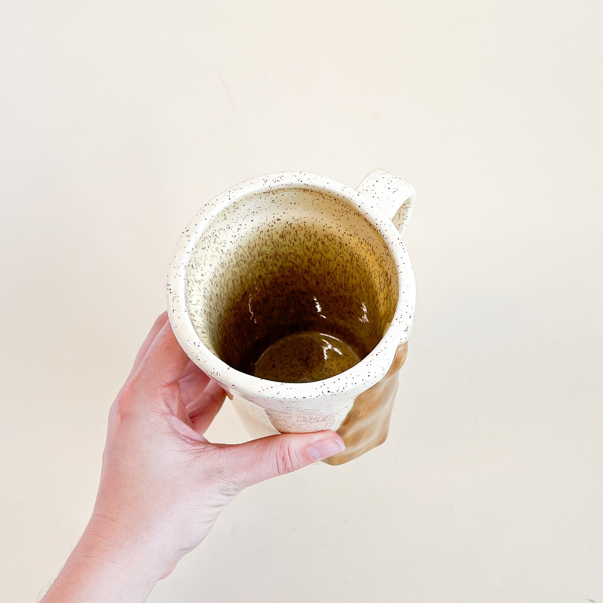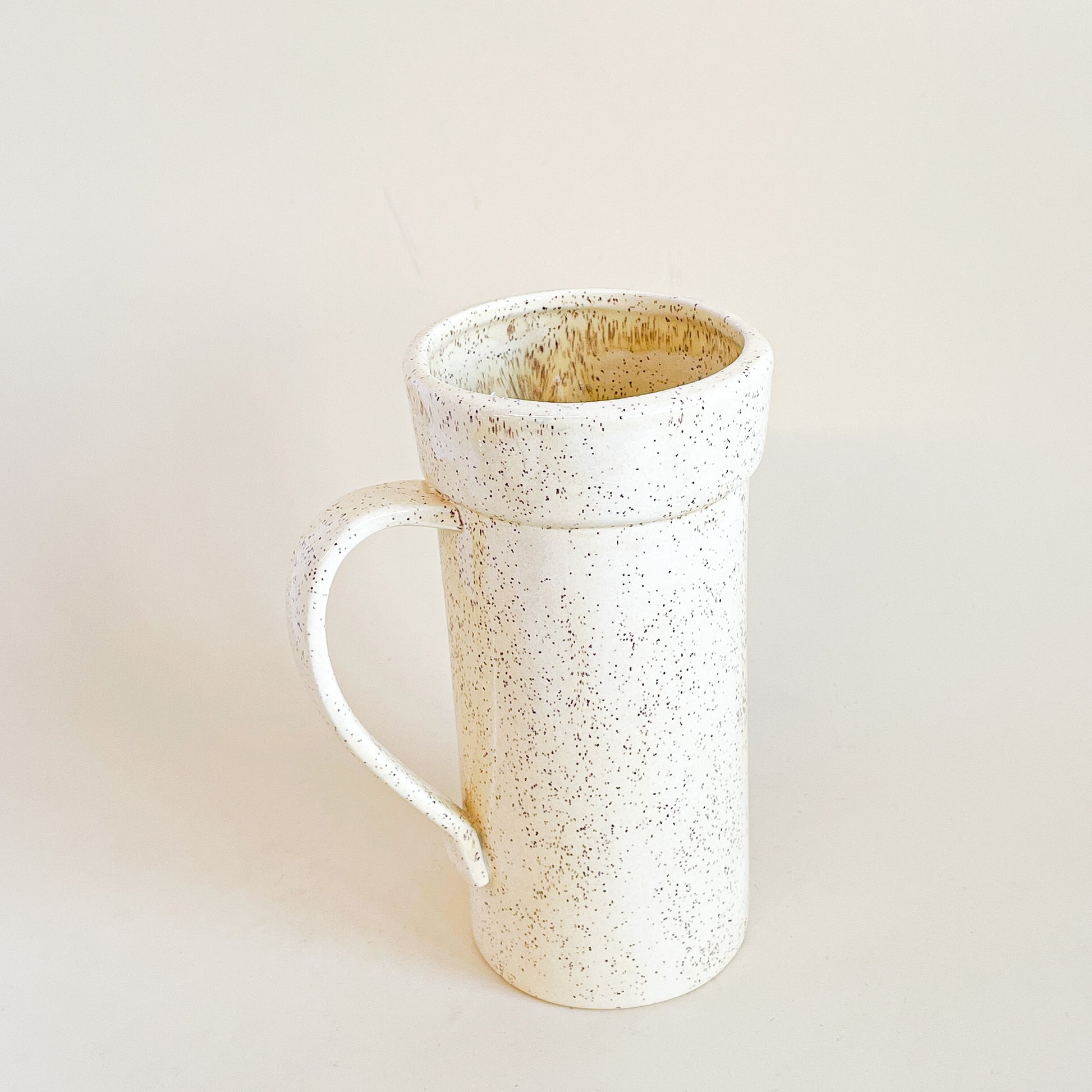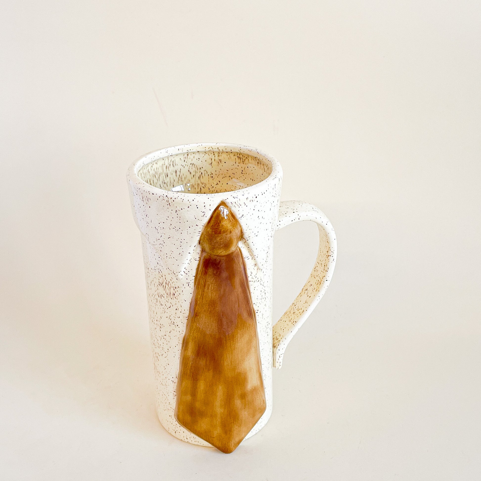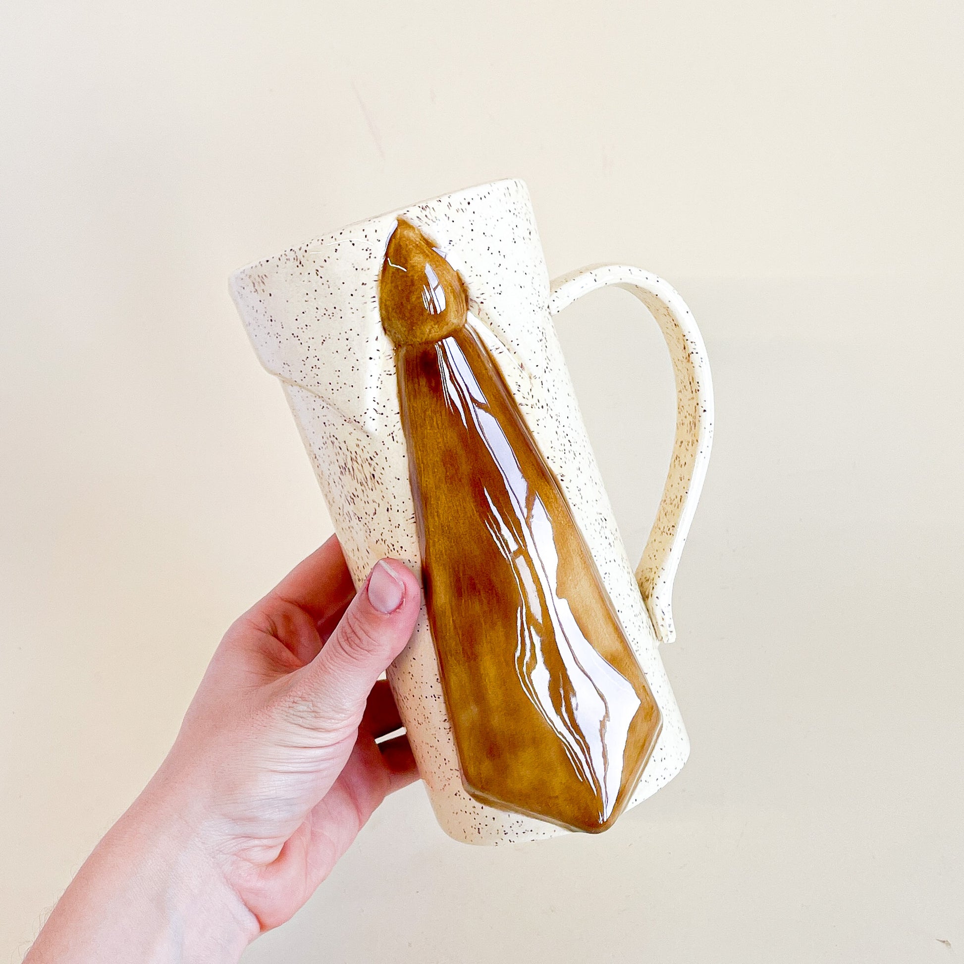 Super large speckled ceramic mug in the shape of a jacket and tie, signed Jacques 1981.