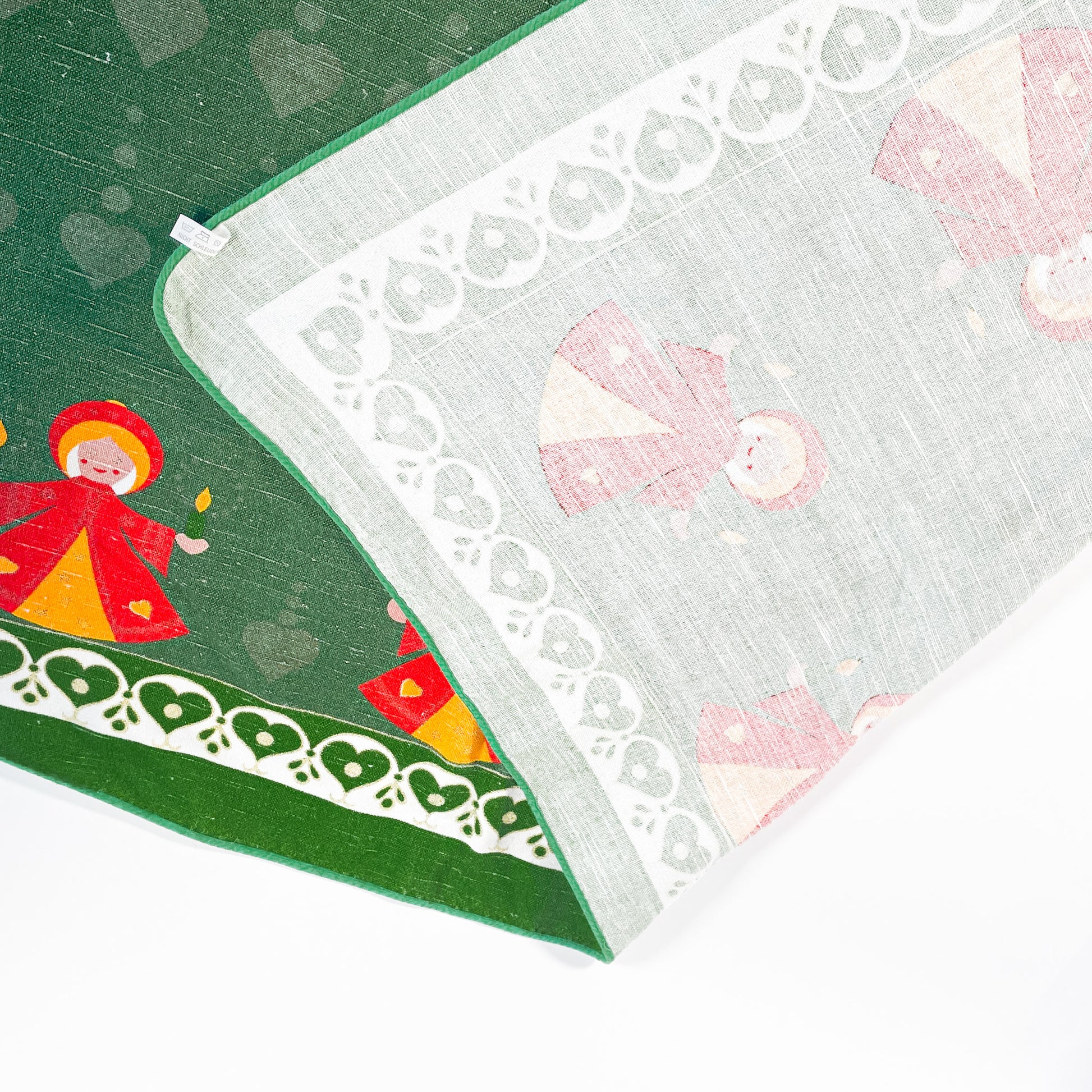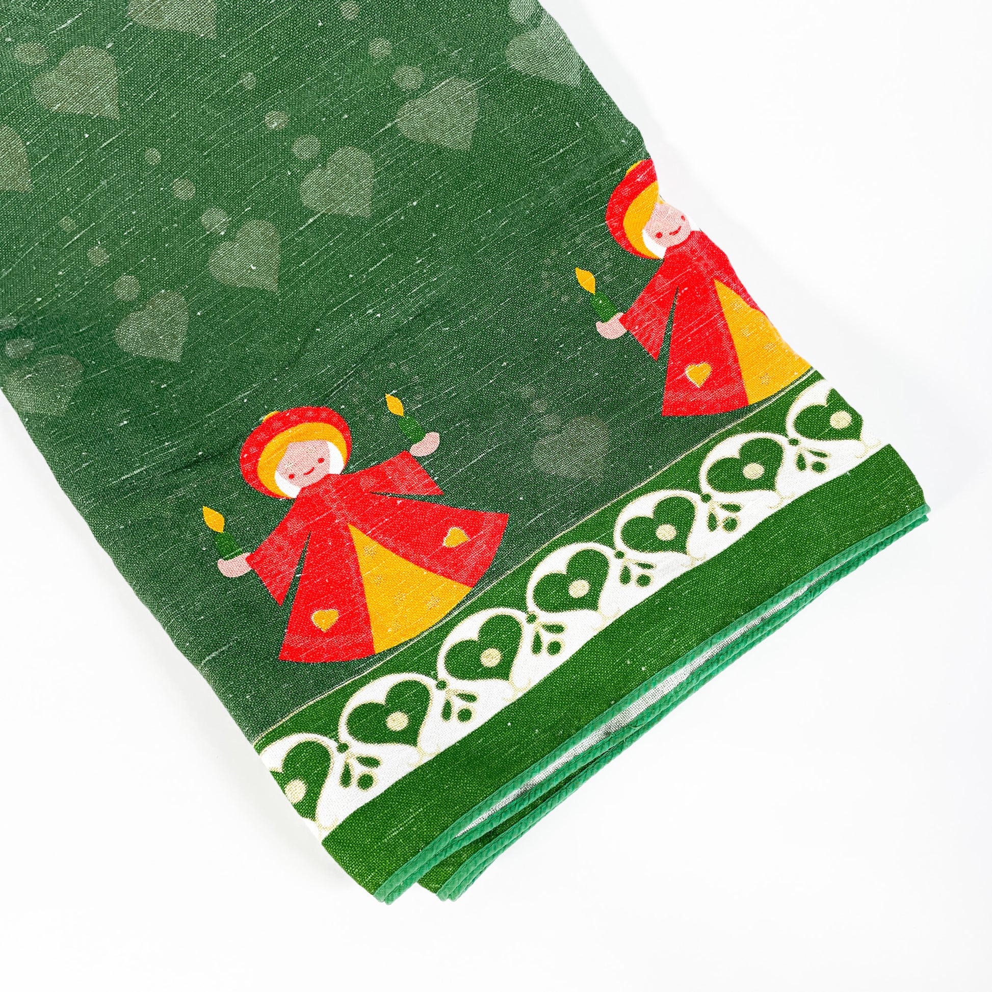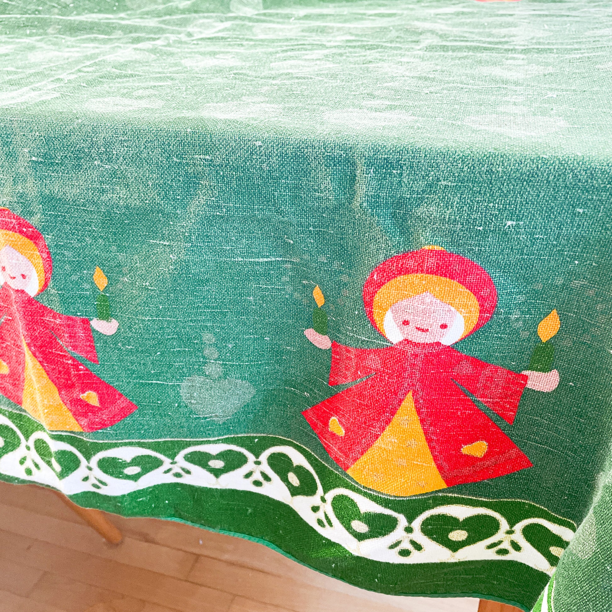 Green linen Christmas tablecloth with orange angels