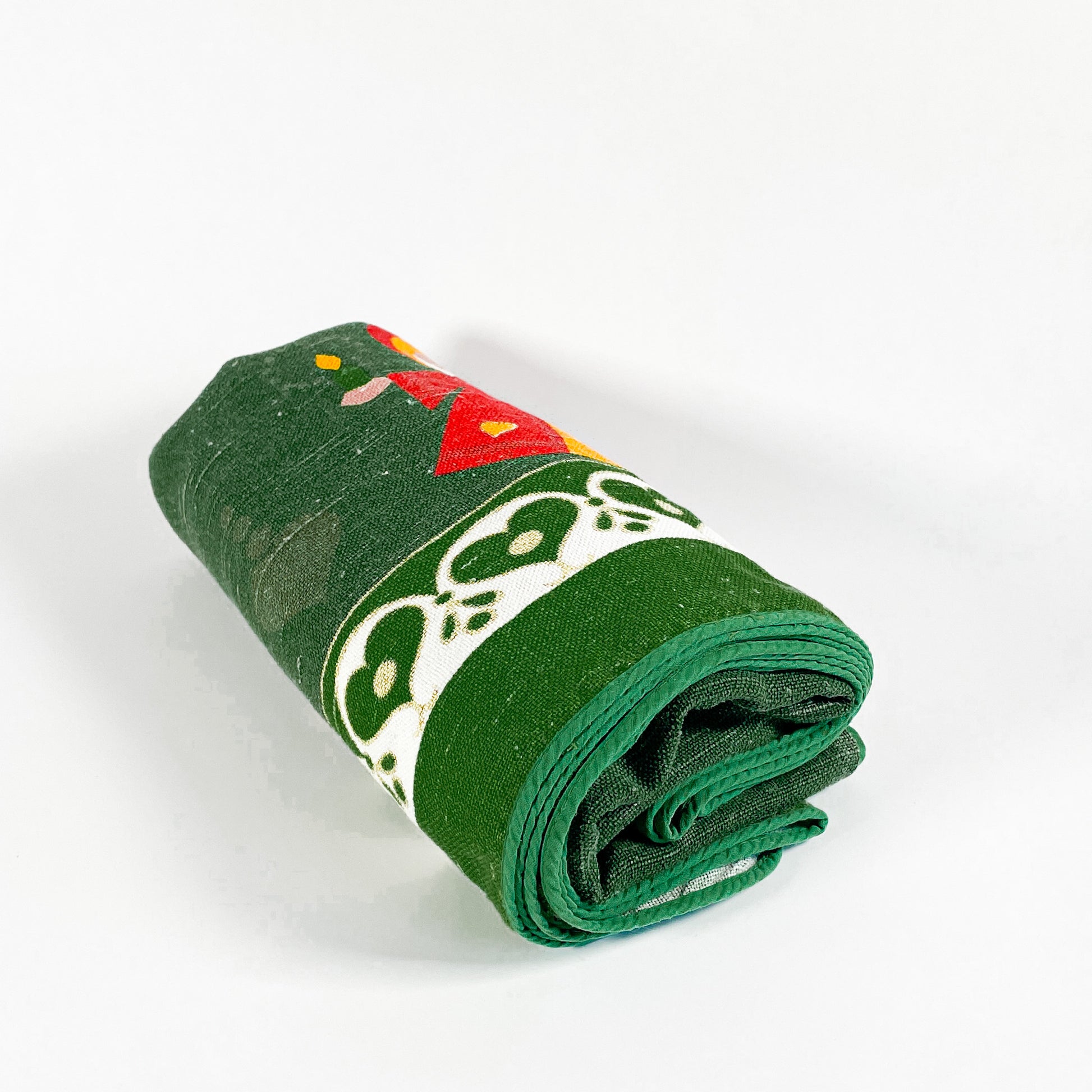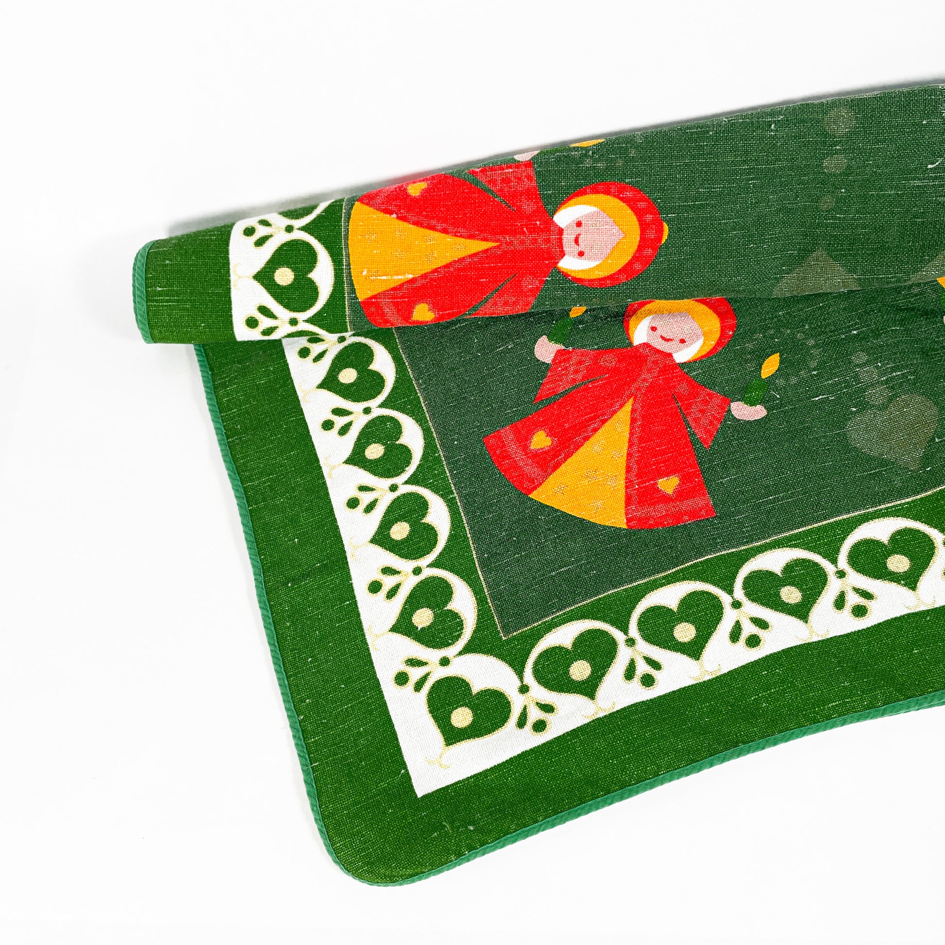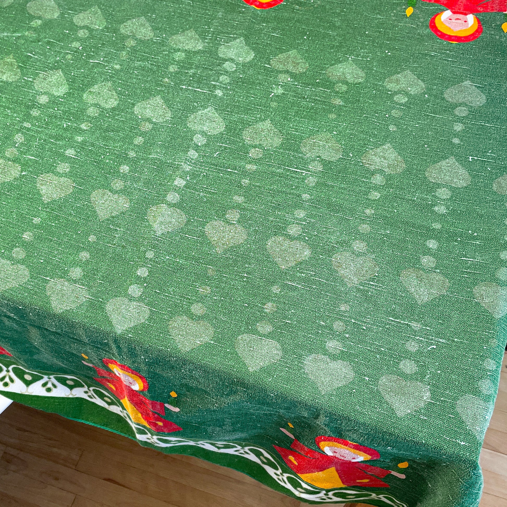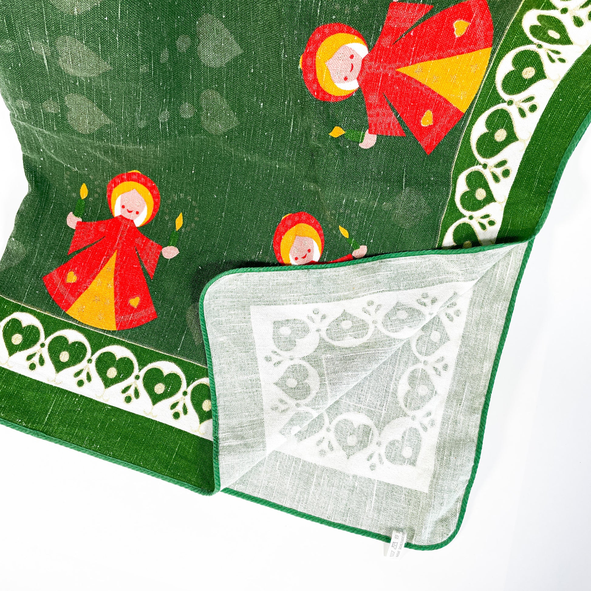Green linen Christmas tablecloth with orange angels