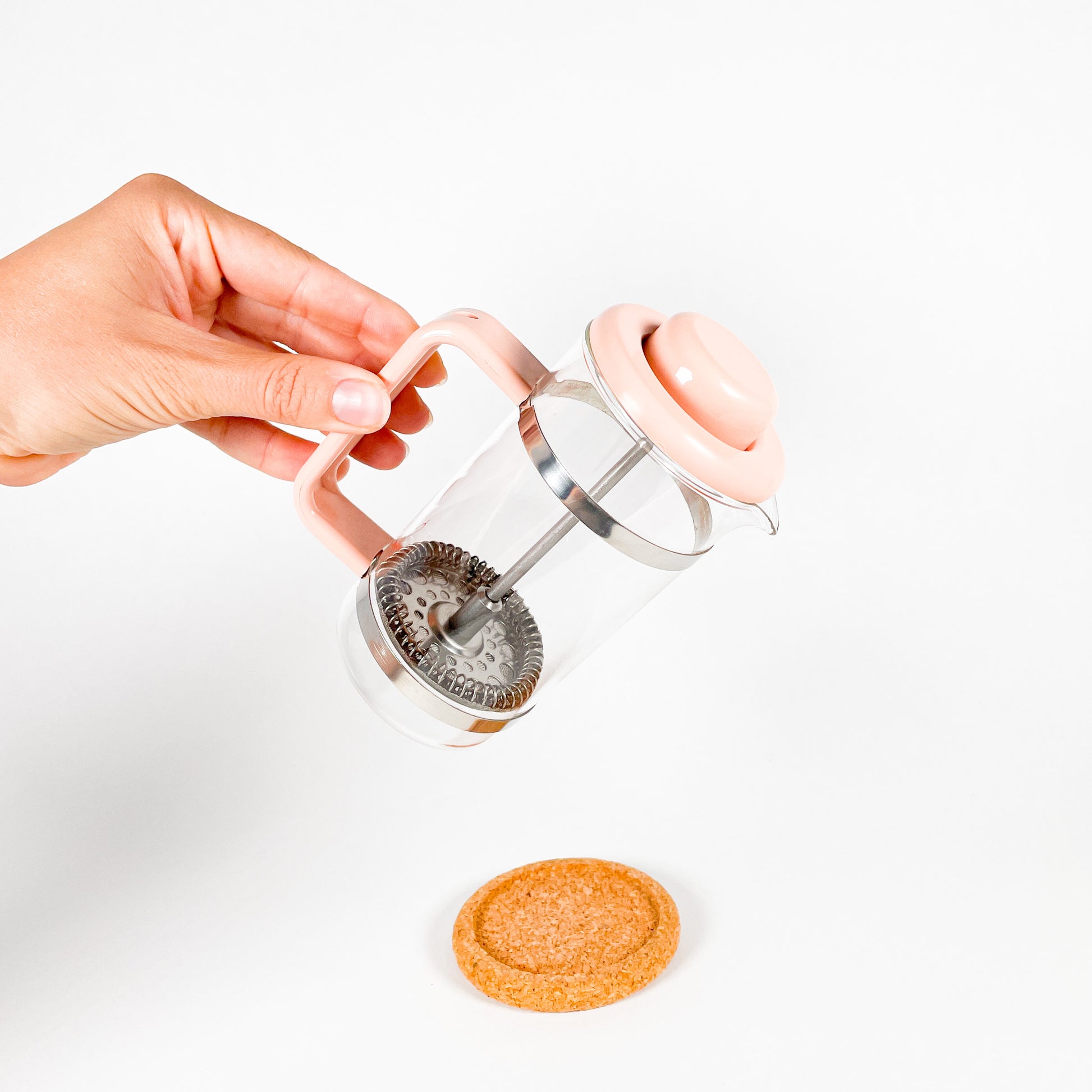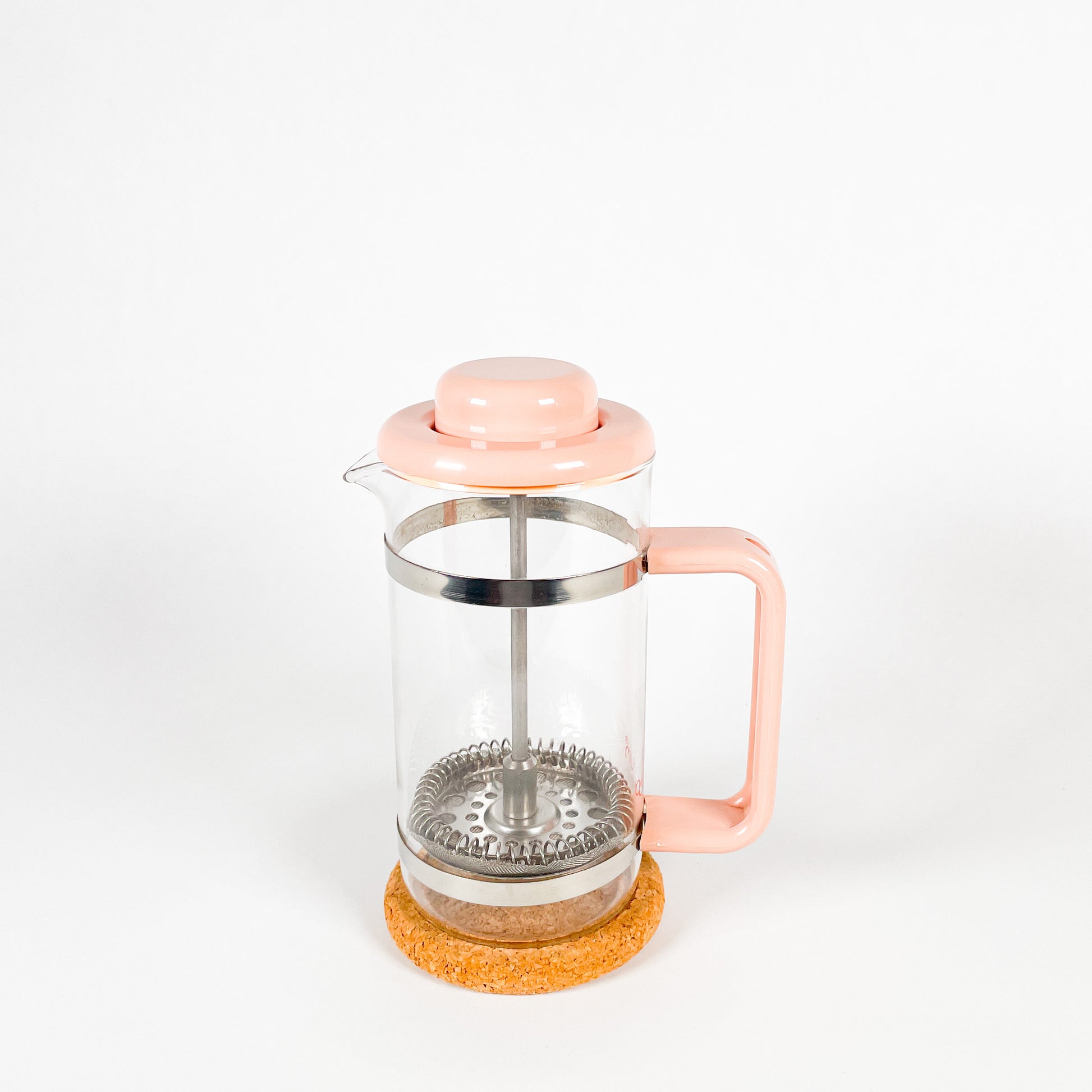 Small Bodum pink glass and plastic coffee maker with cork coaster.