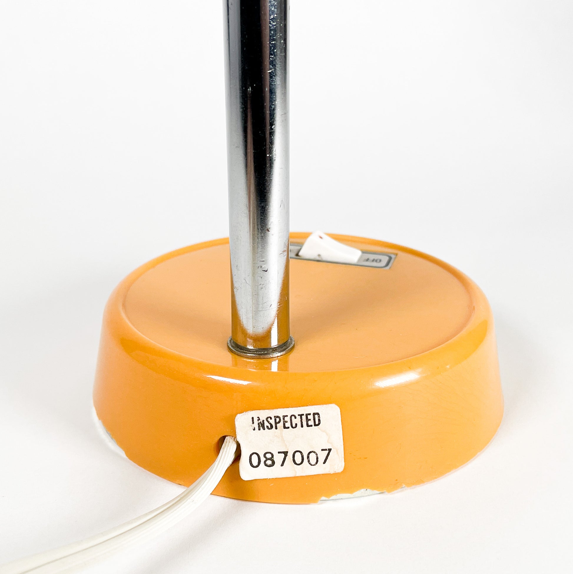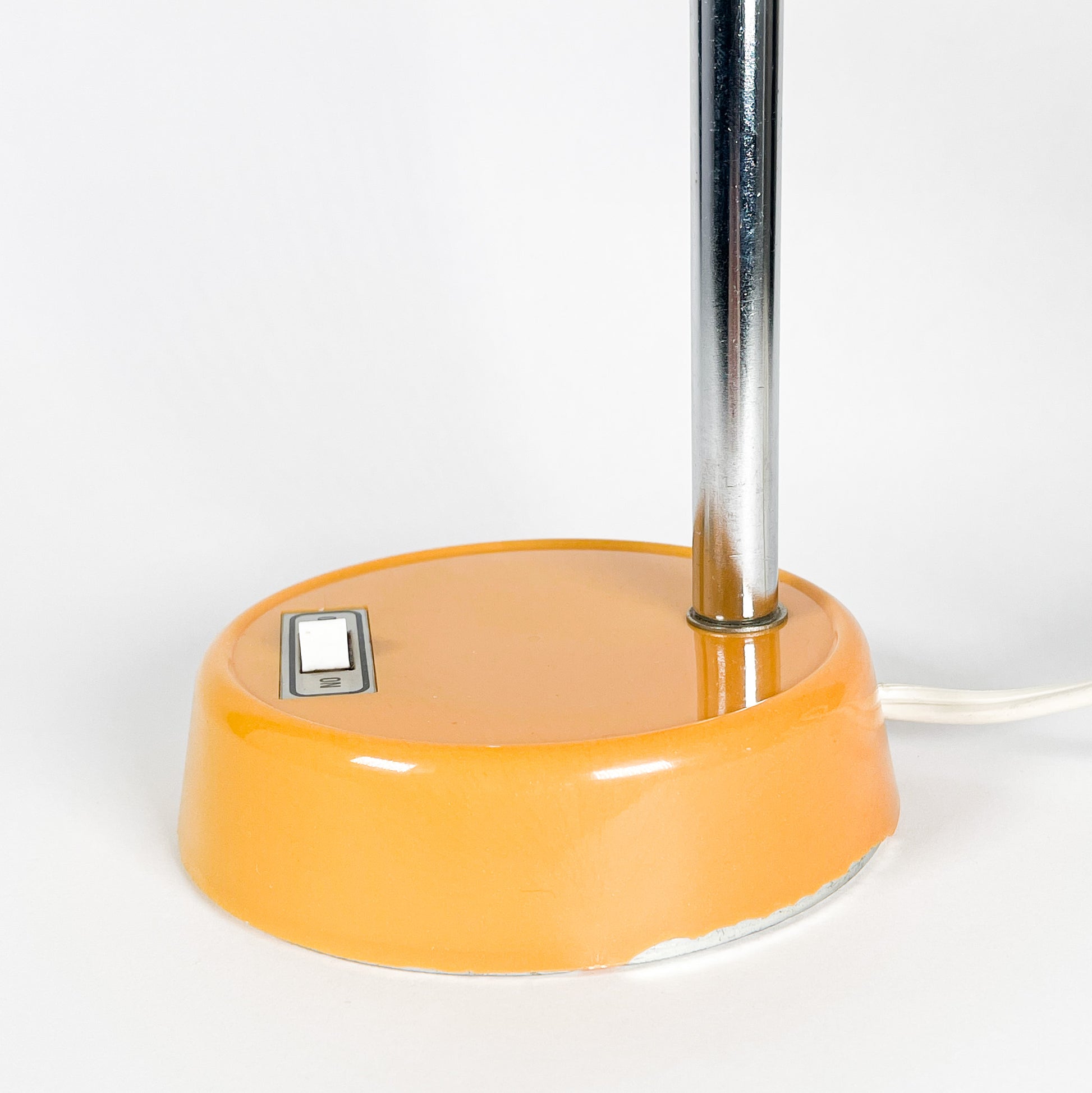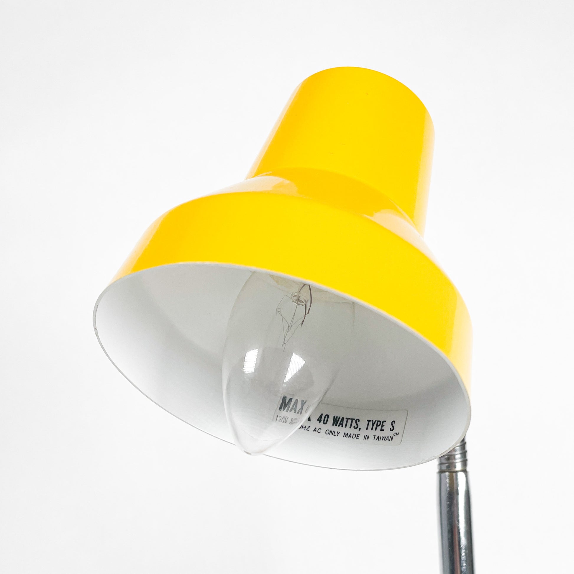 Small 1970s desk lamp made in Taiwan. The base is plastic and the lampshade is metal. Sold without bulb. Suitable for type S bulbs of max 40 watts.