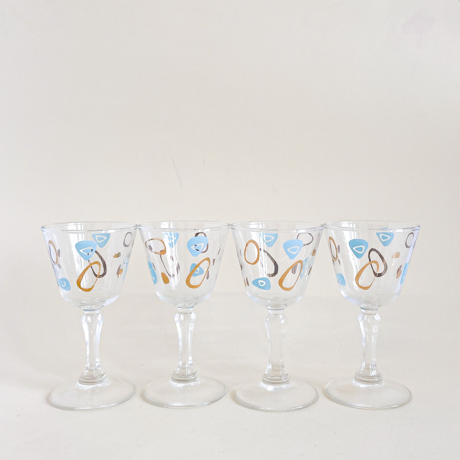Set of 4 small footed glasses, Amoeba collection by Federal Glass, icon of the atomic style of the 1950s.