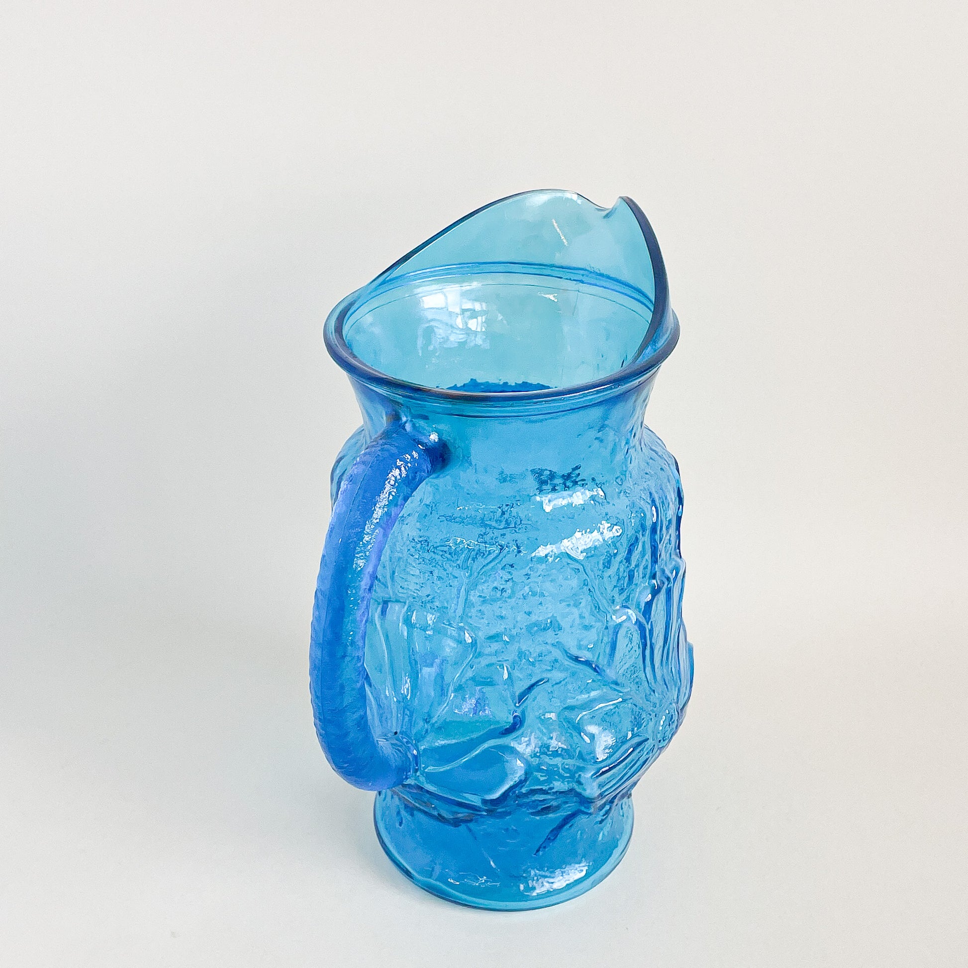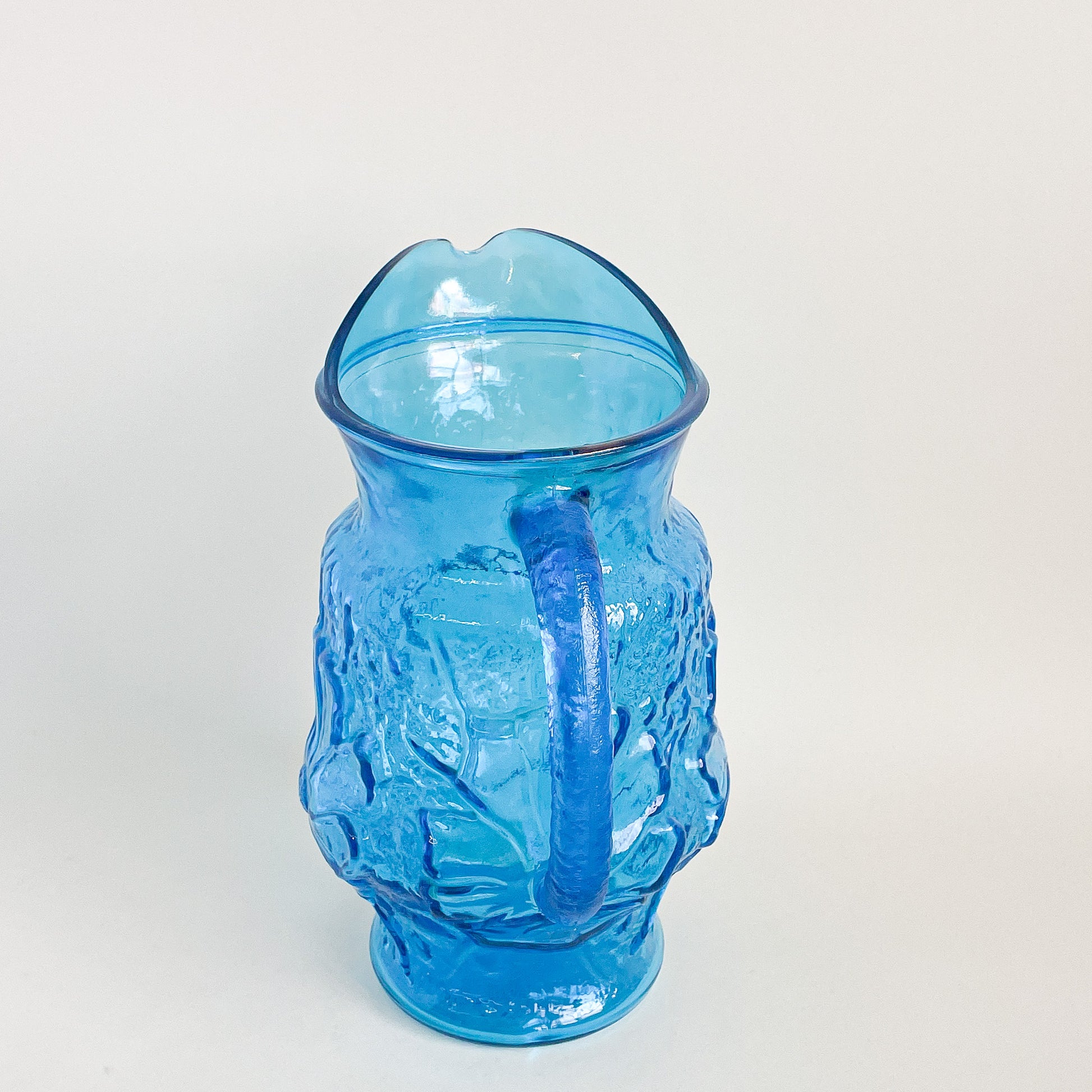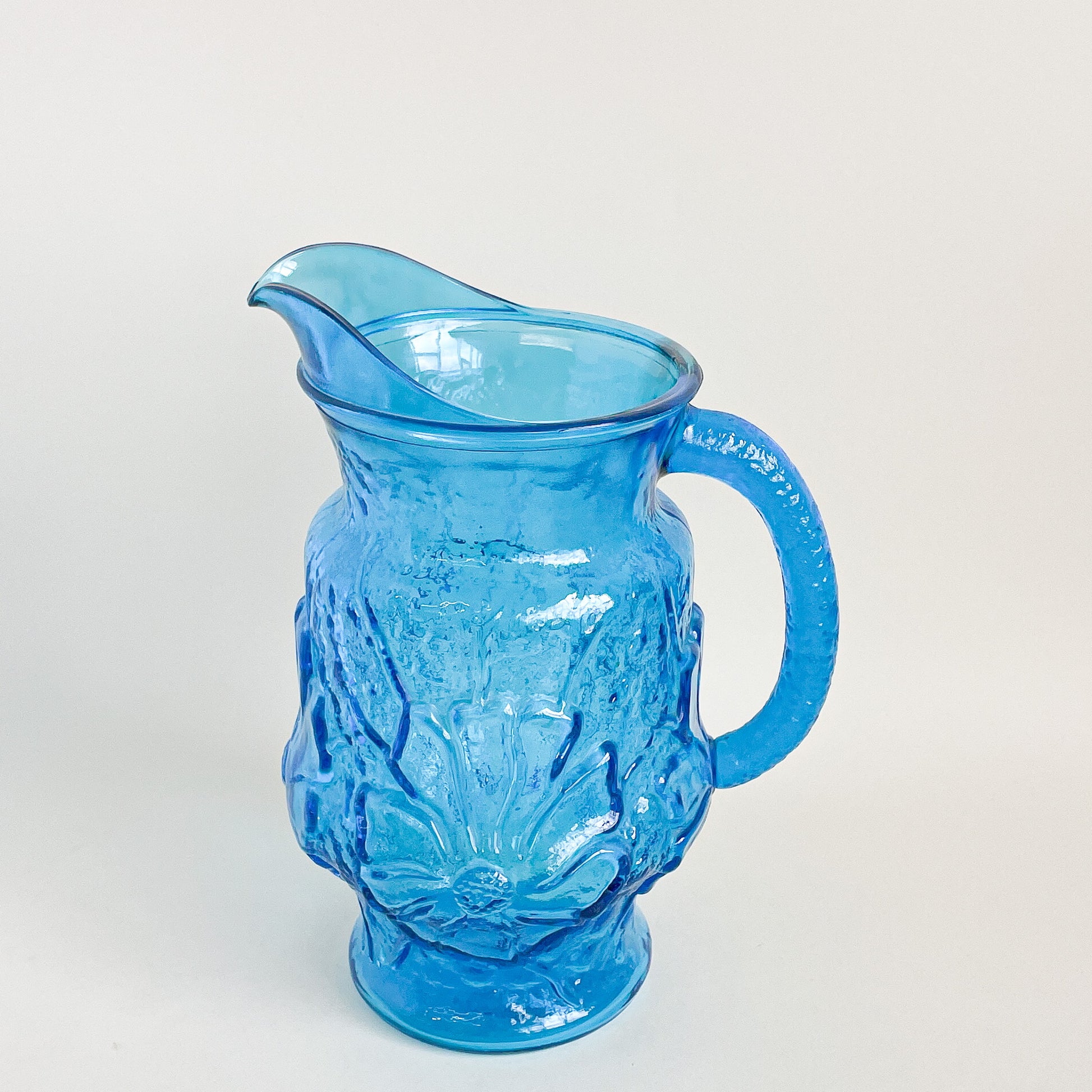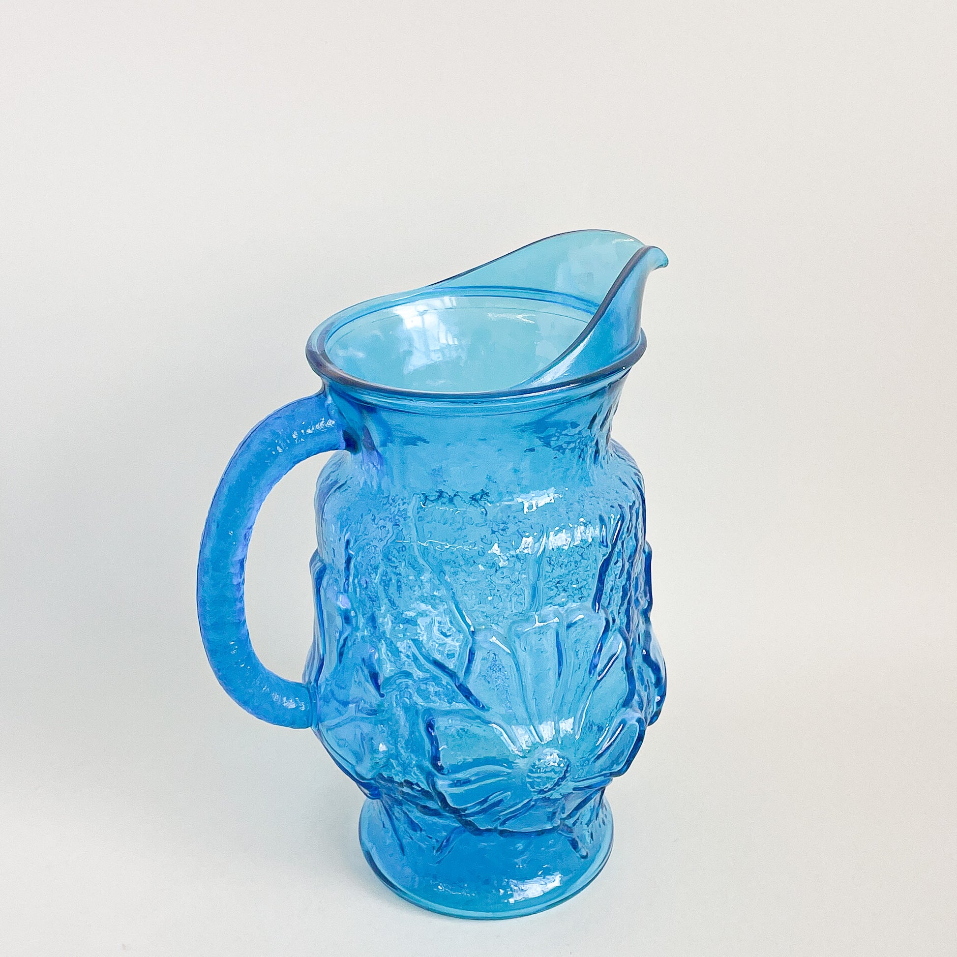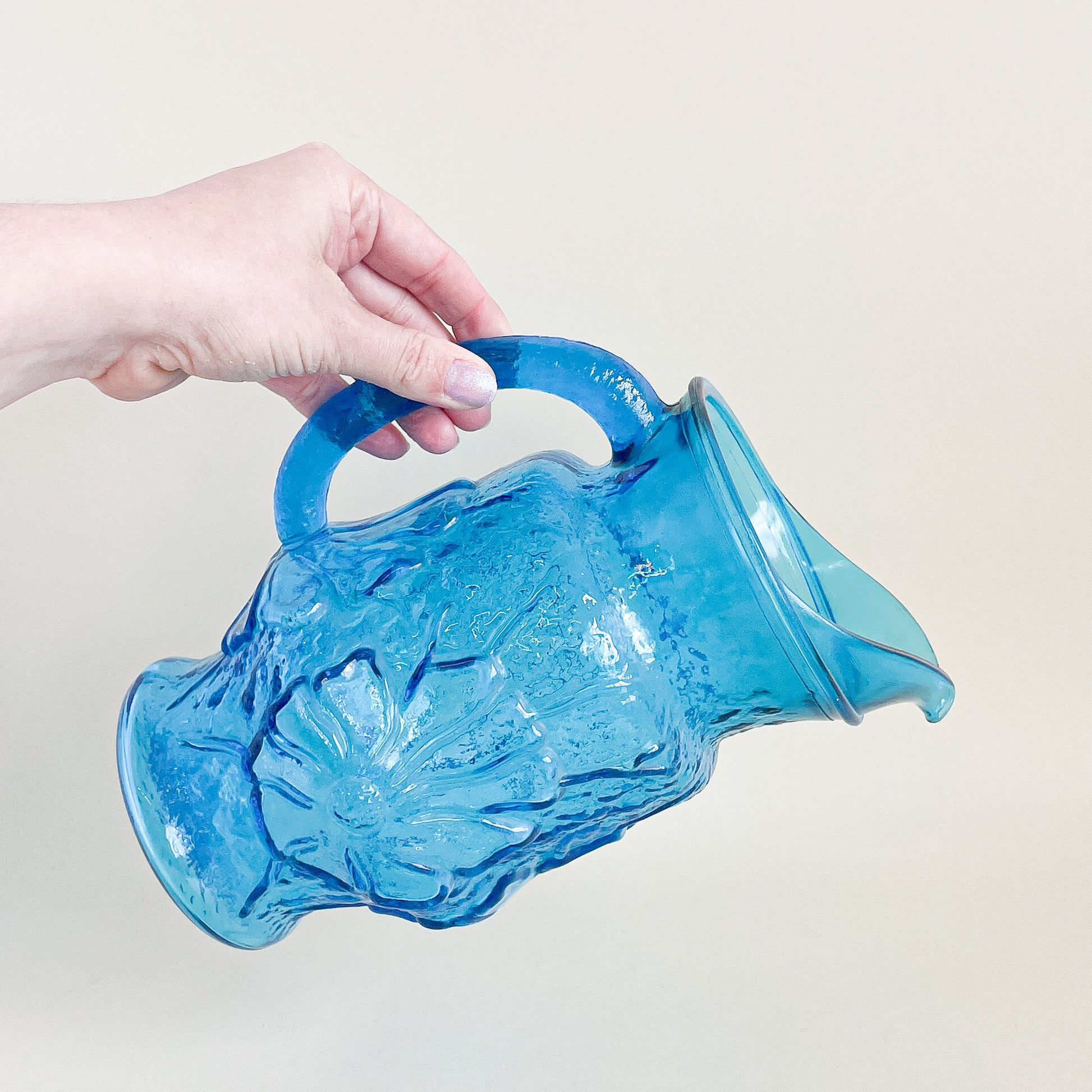 Large Turquoise Anchor Hocking Glass Pitcher, Rainflower Pattern, Made in USA.