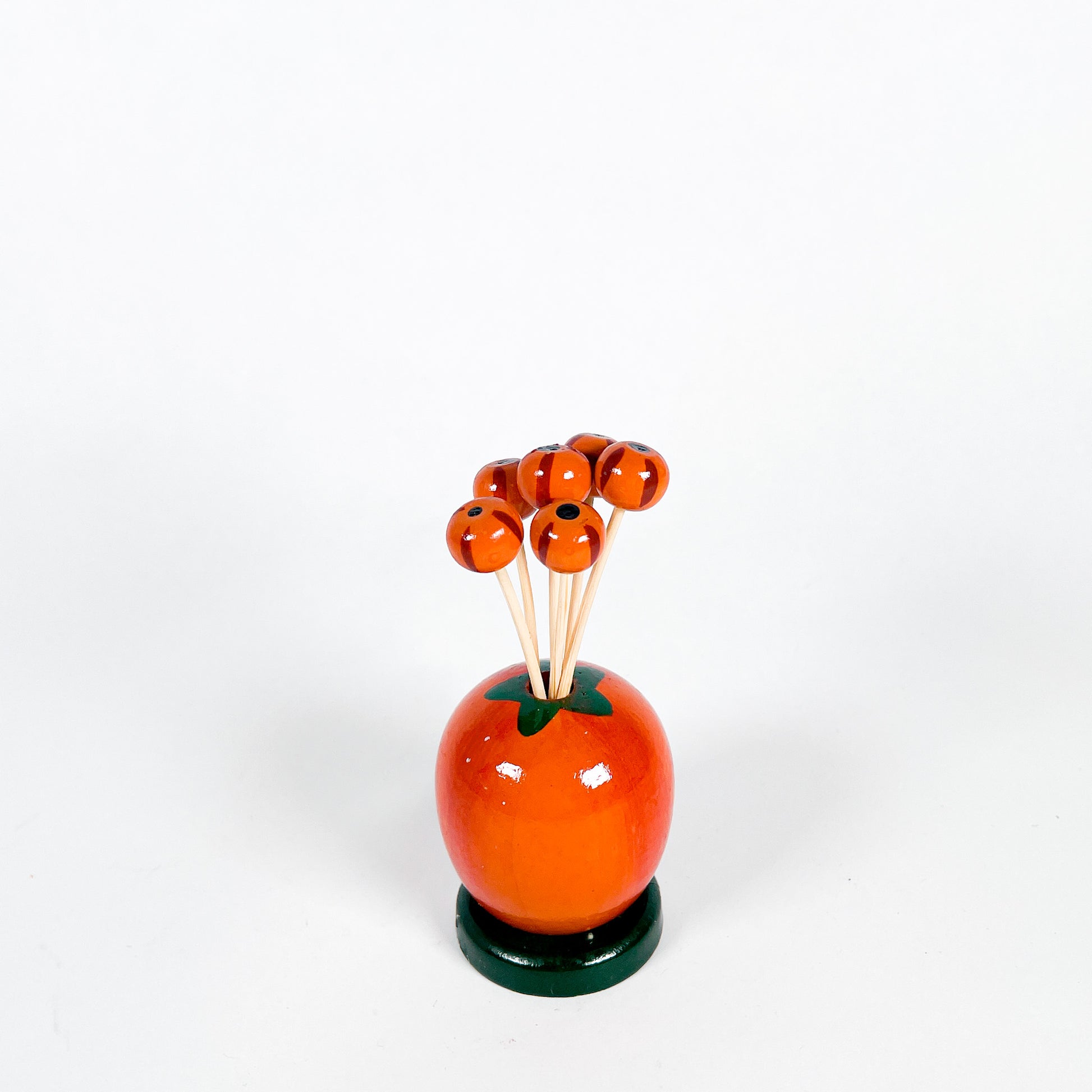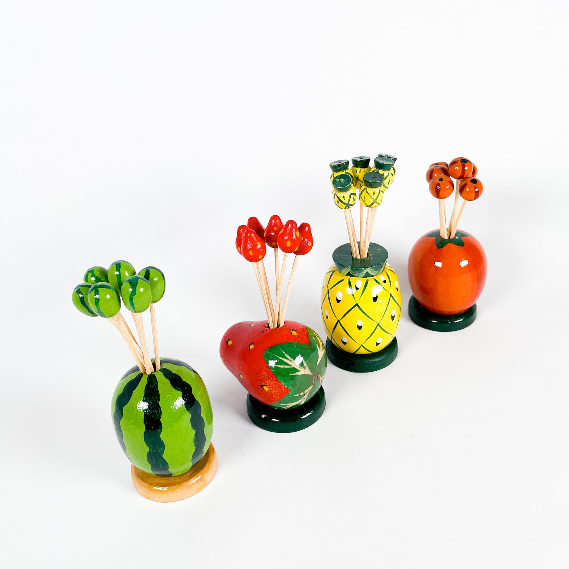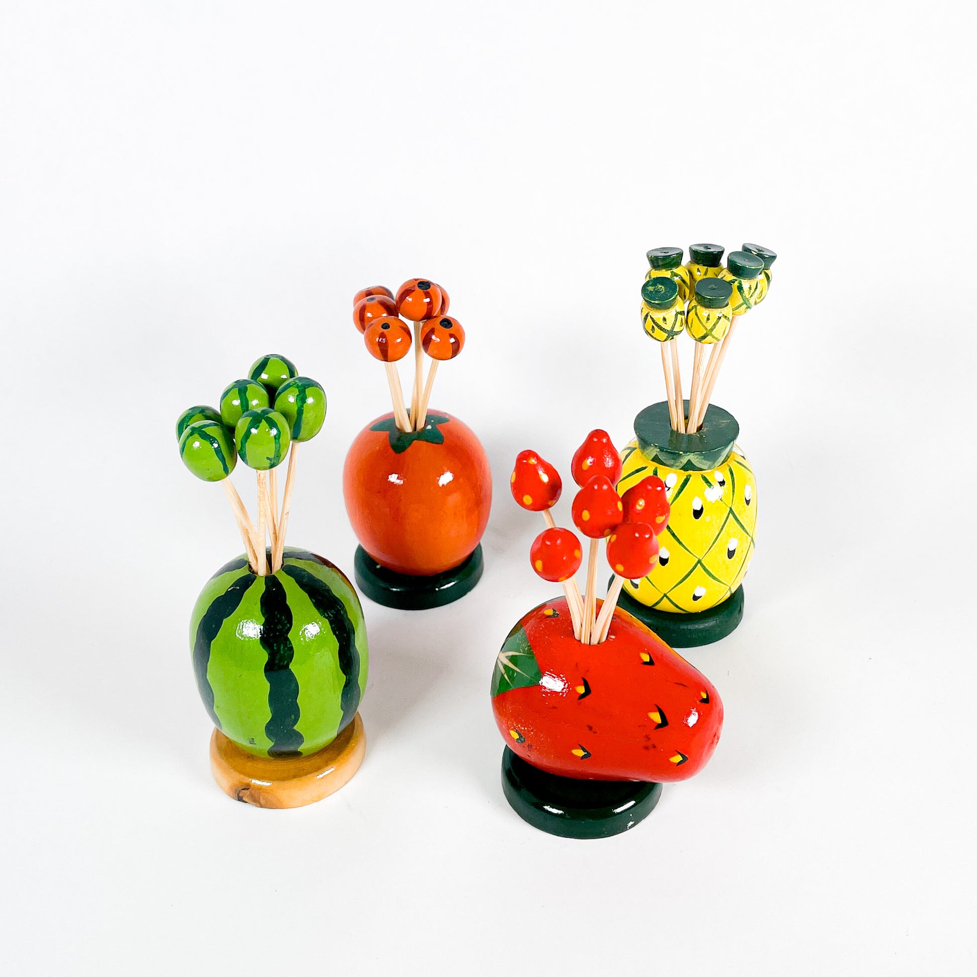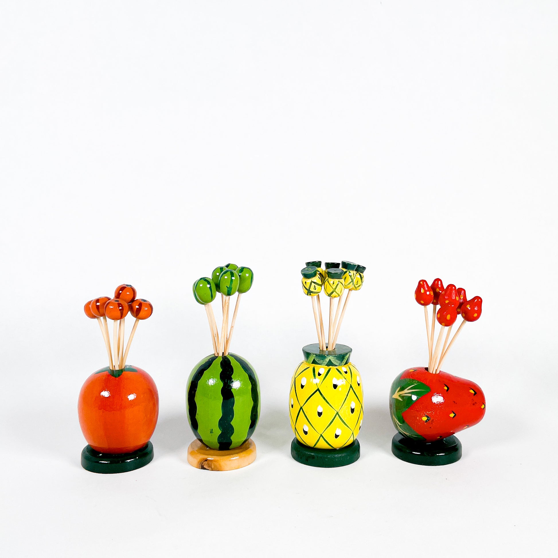 Wooden hors d'oeuvres picks with fruit-shaped support. Sold separately.