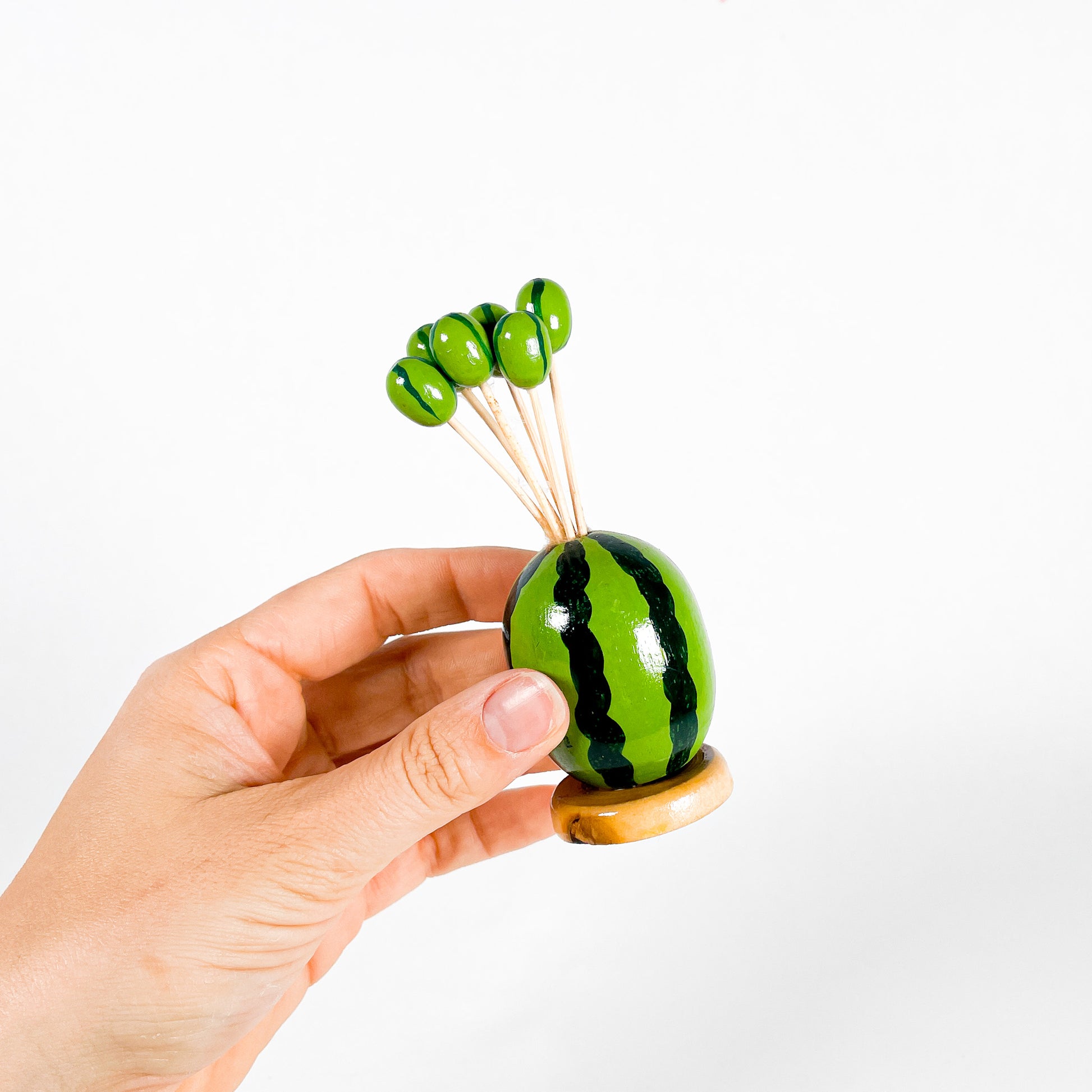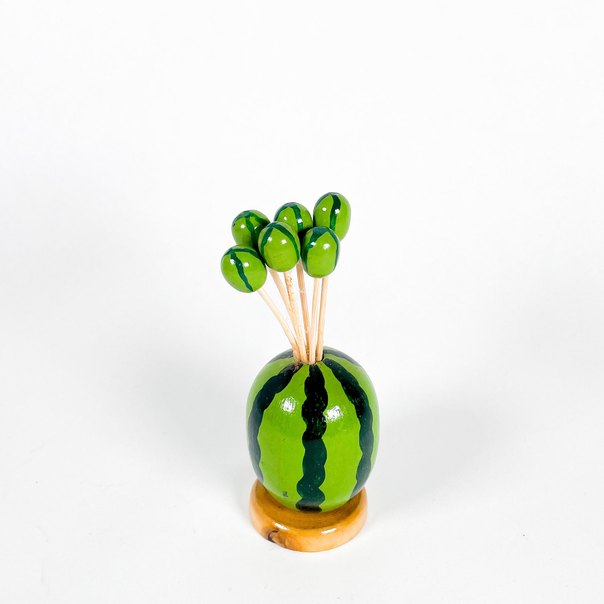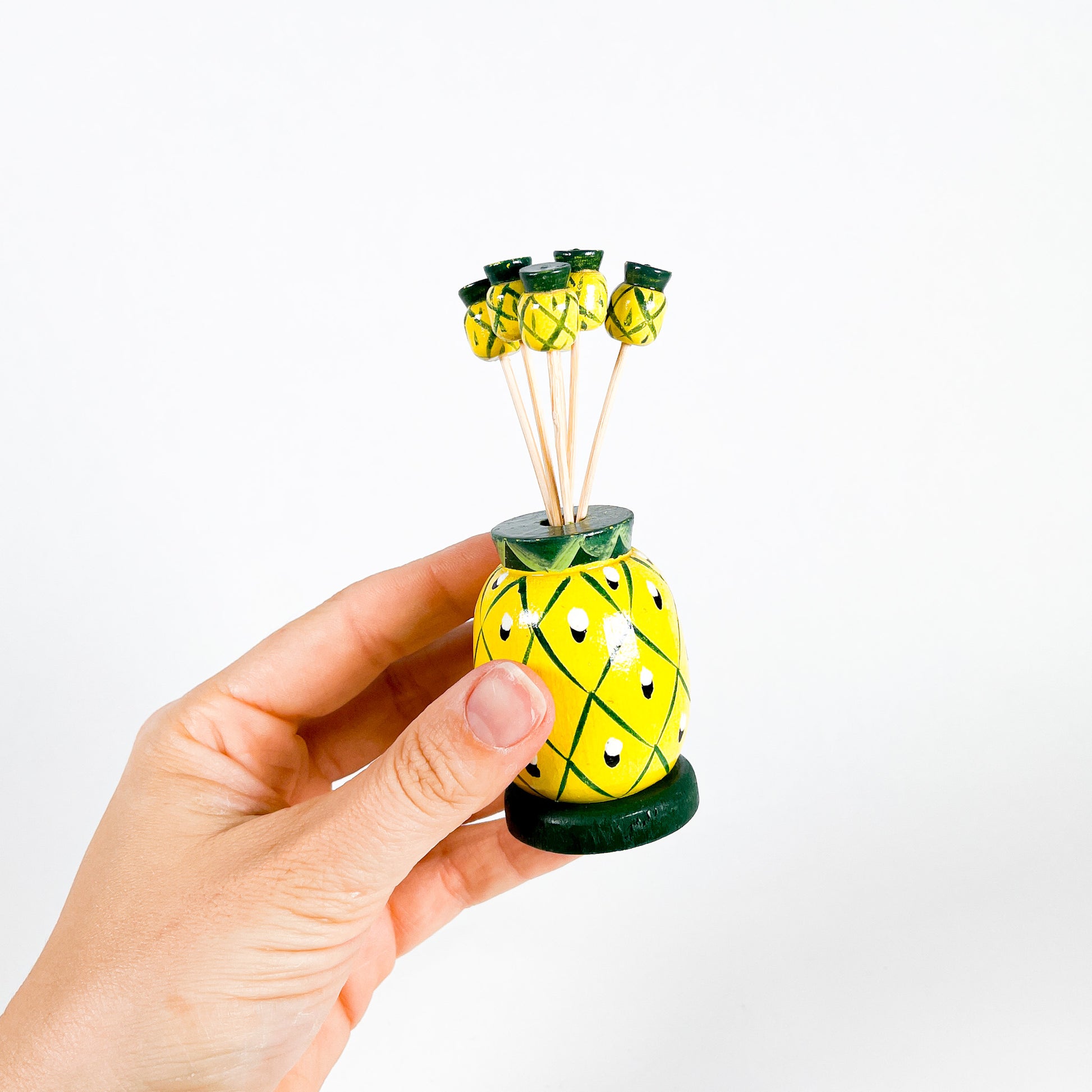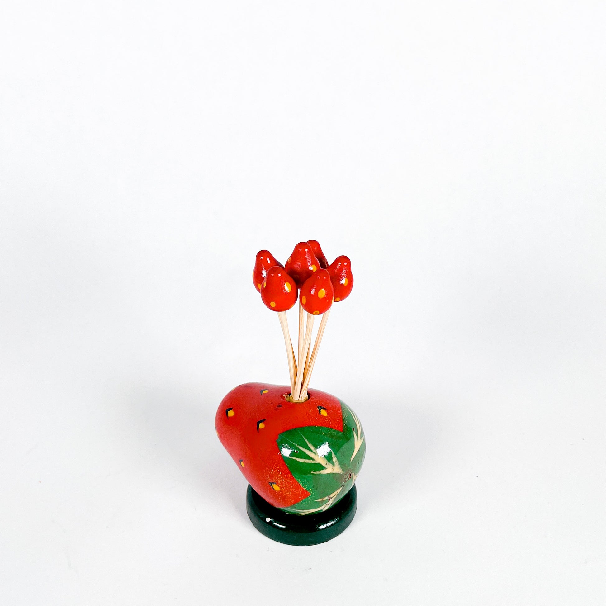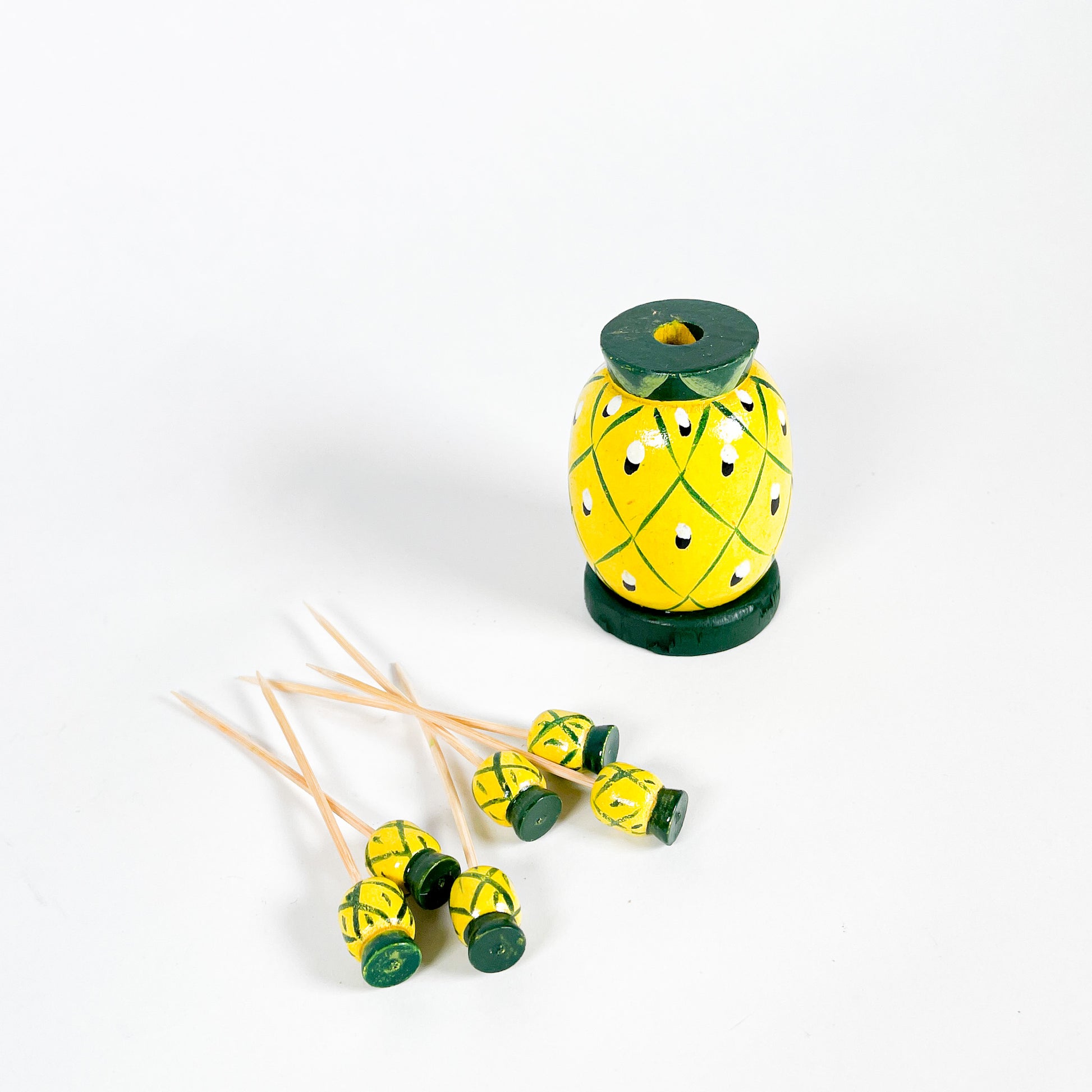 Wooden hors d'oeuvres picks with fruit-shaped support. Sold separately.