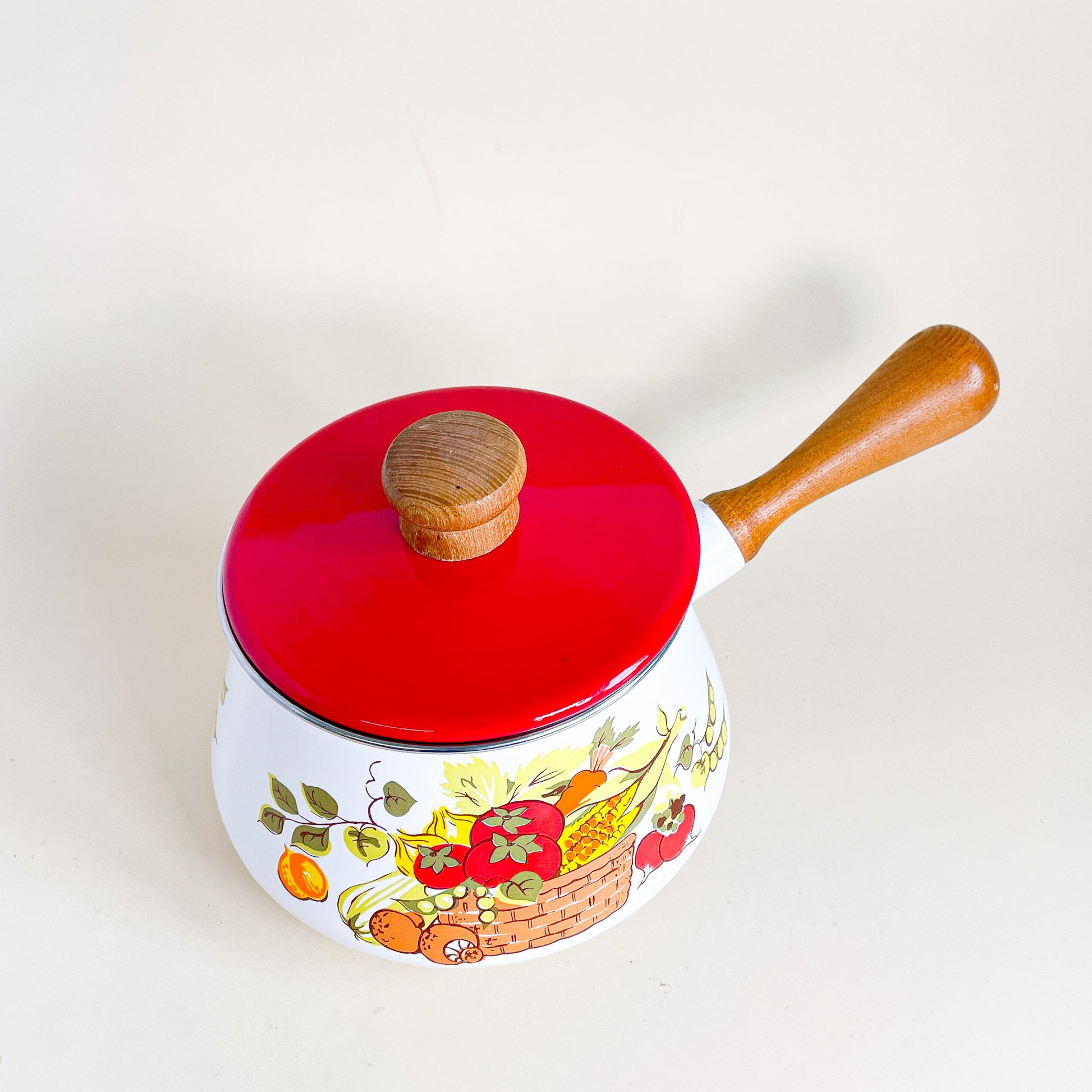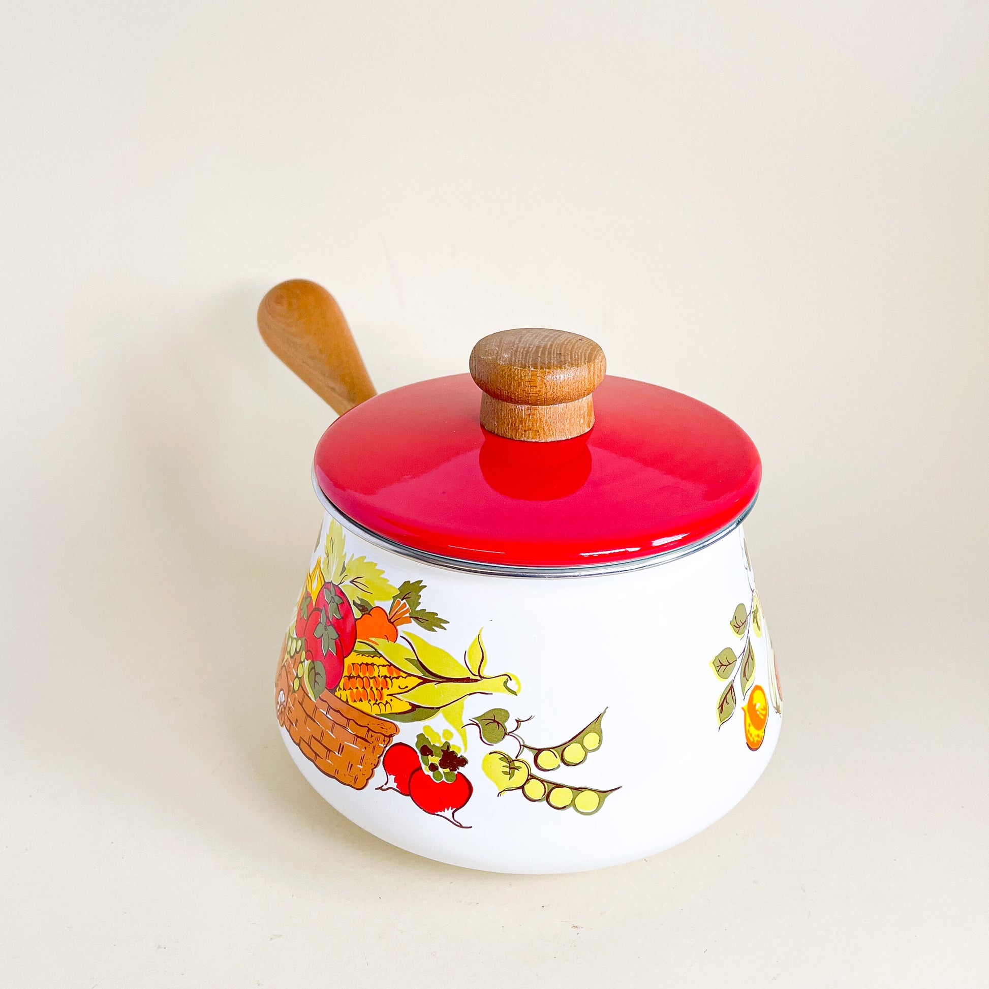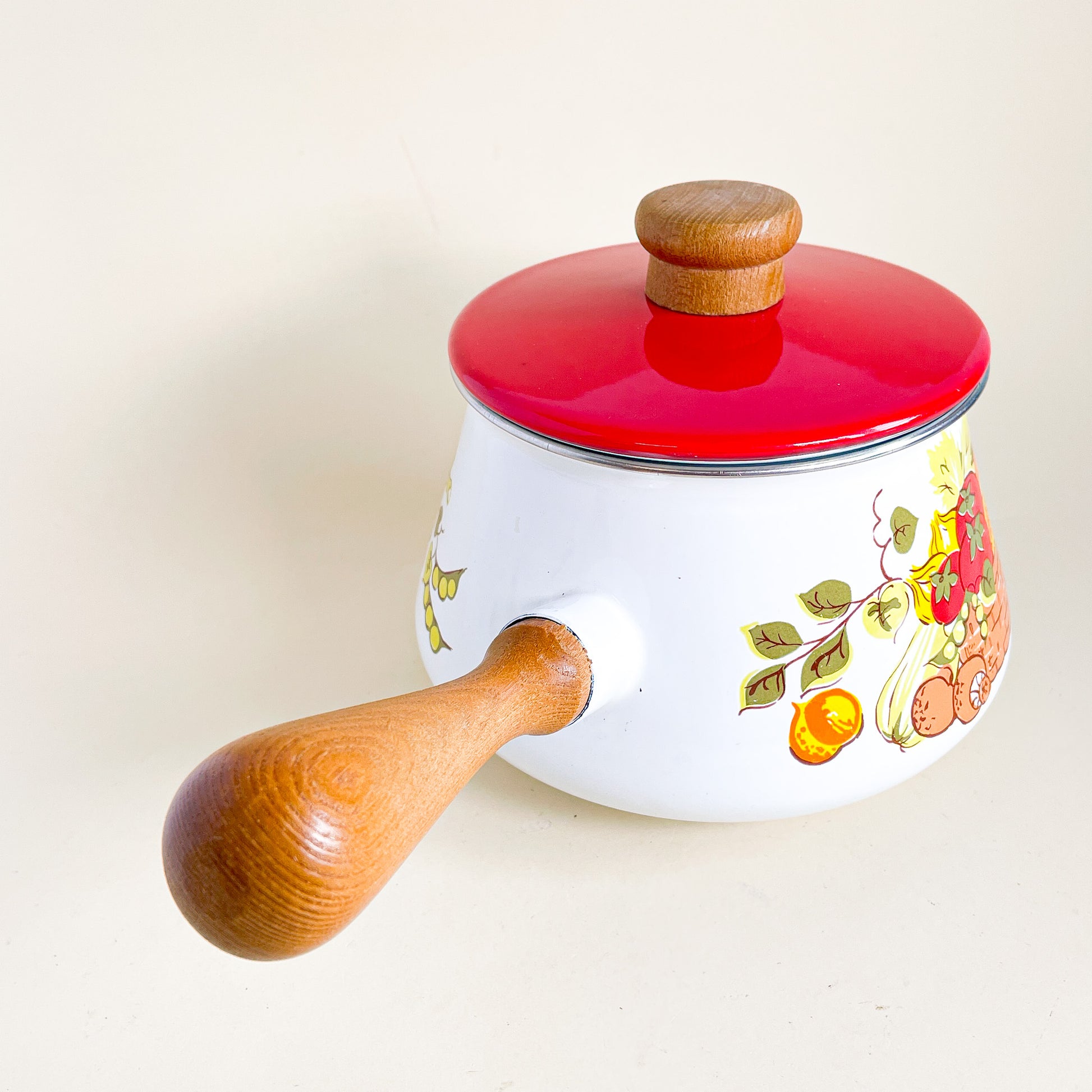 Metal and wood fondue dish with vegetable pattern. Very 1970's like vibe!