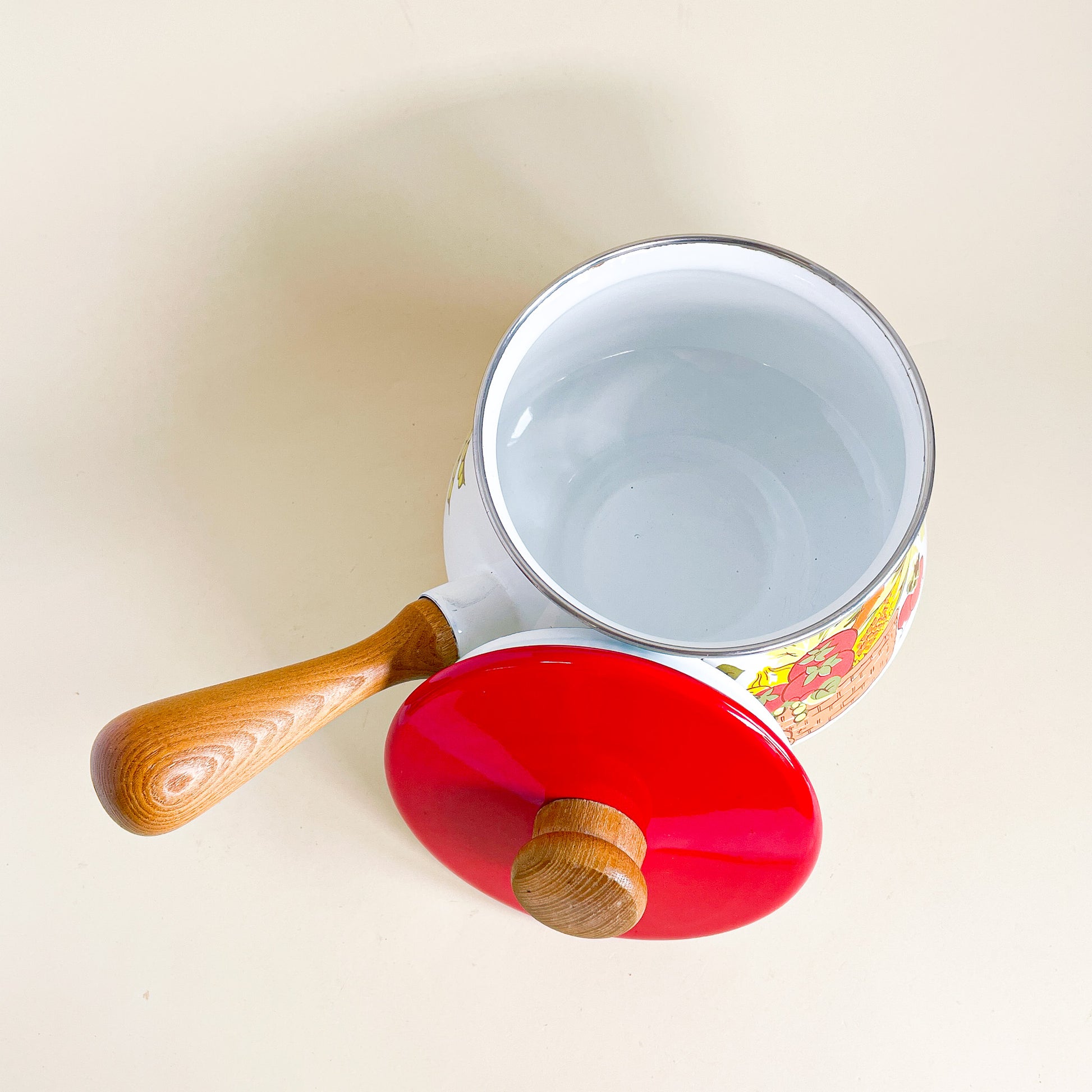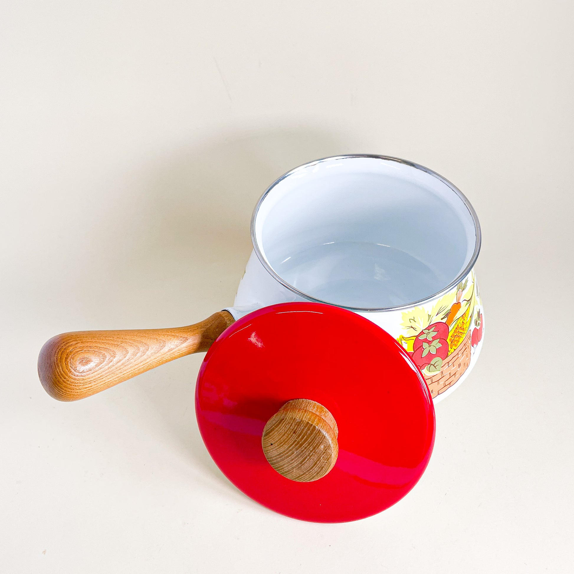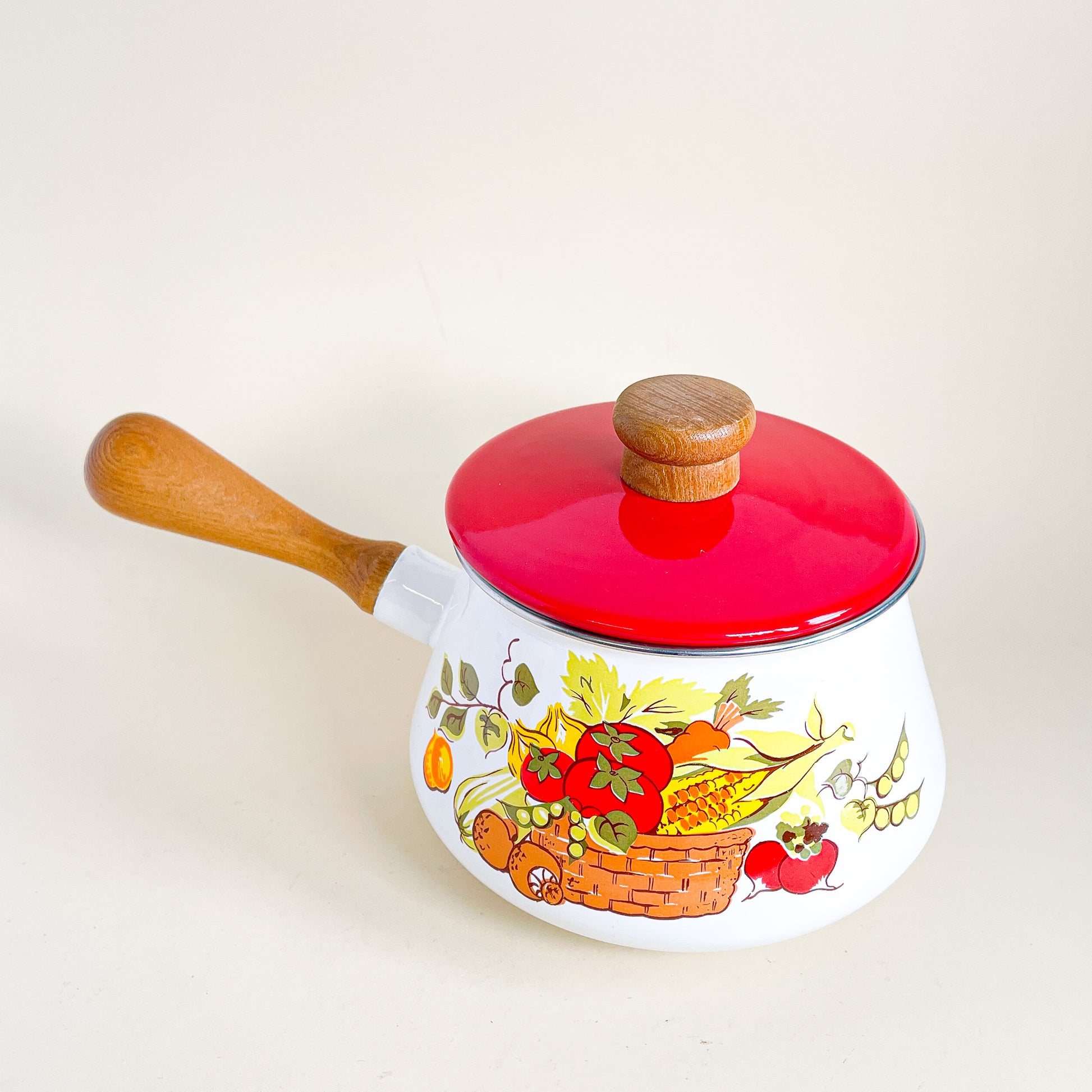 Metal and wood fondue dish with vegetable pattern. Very 1970's like vibe!