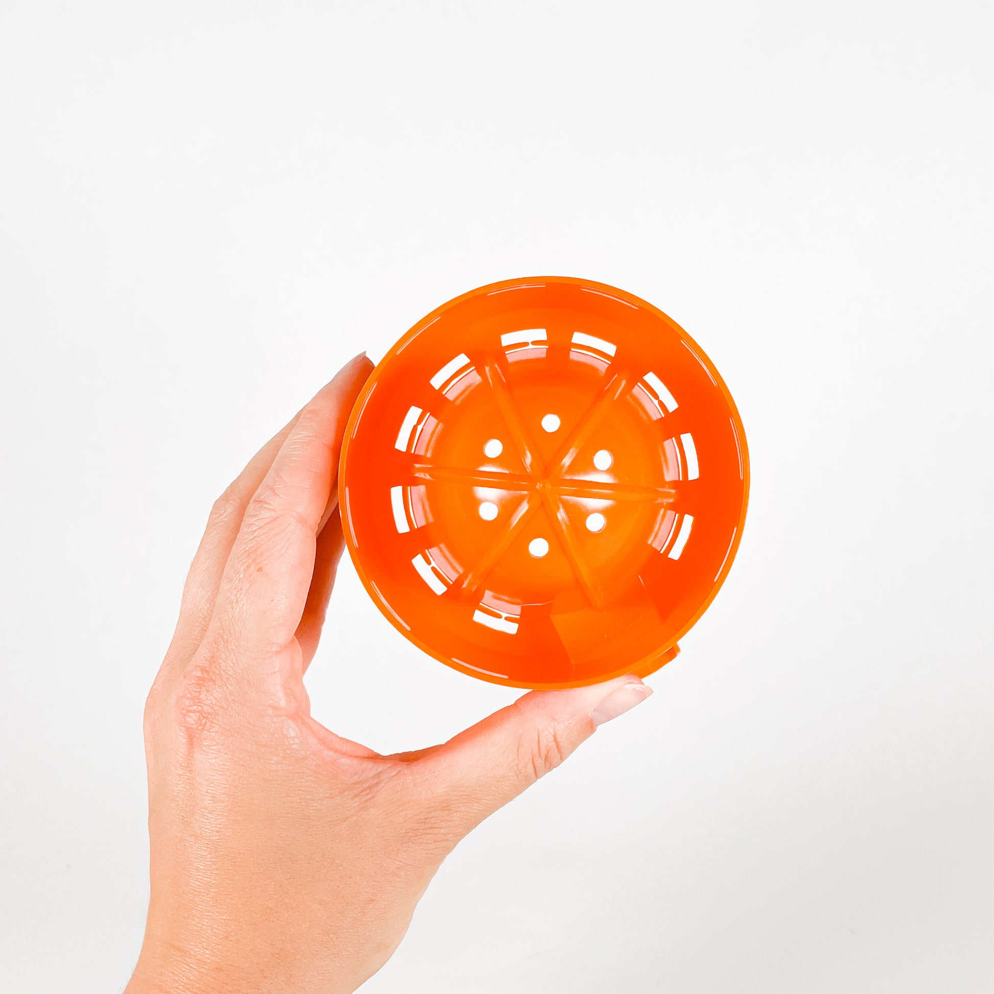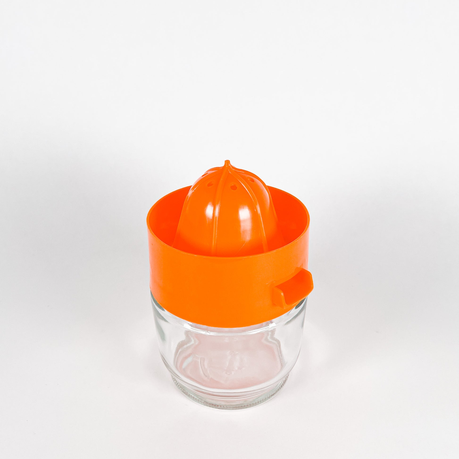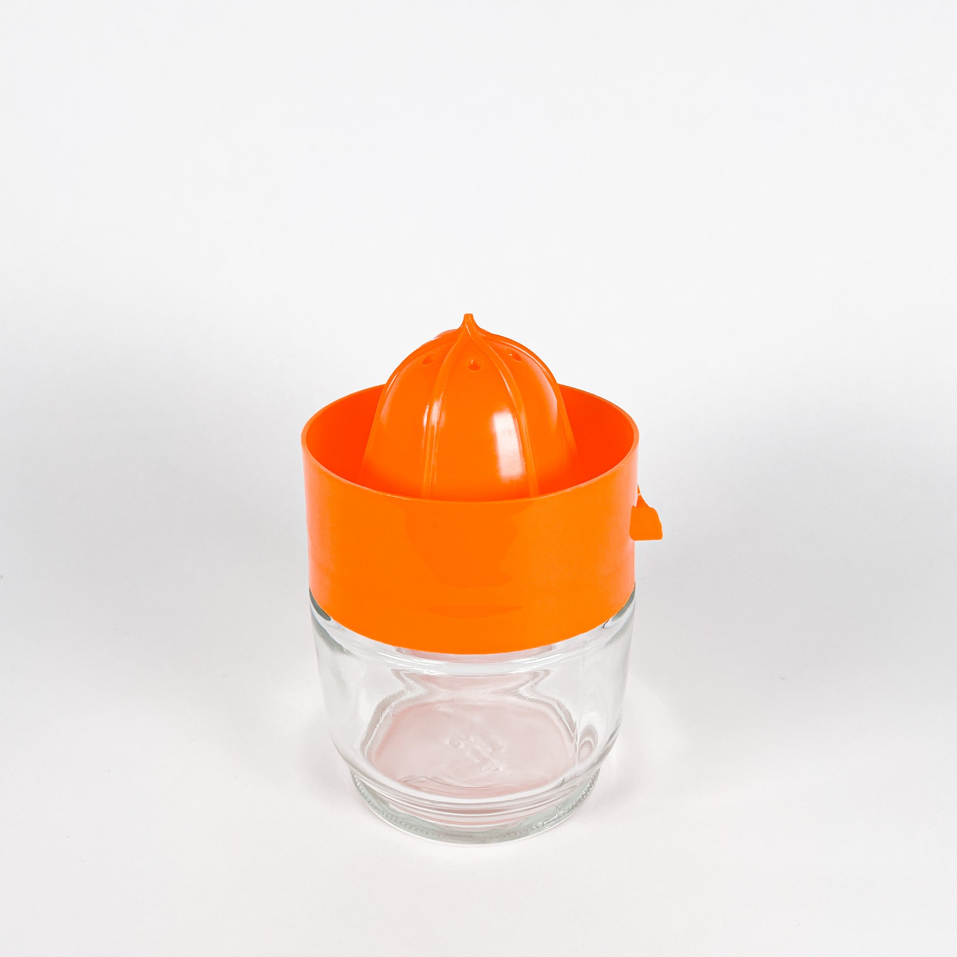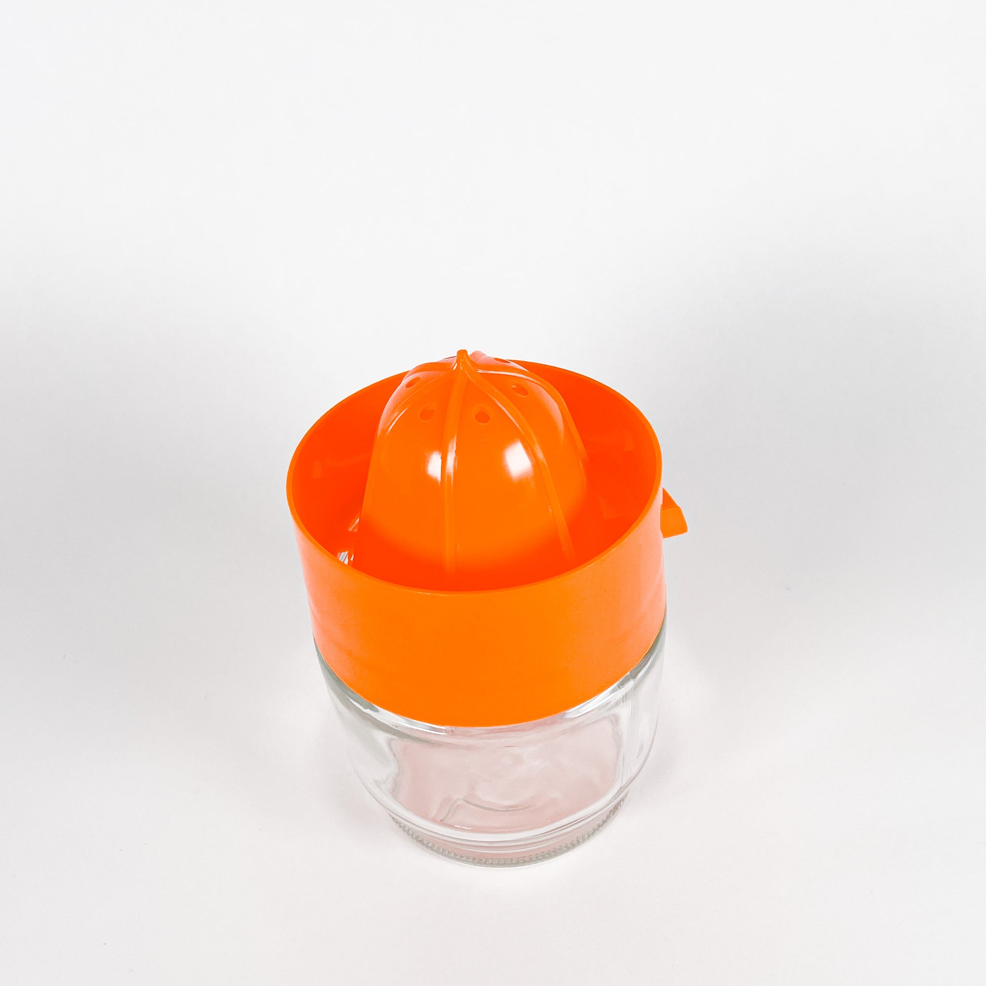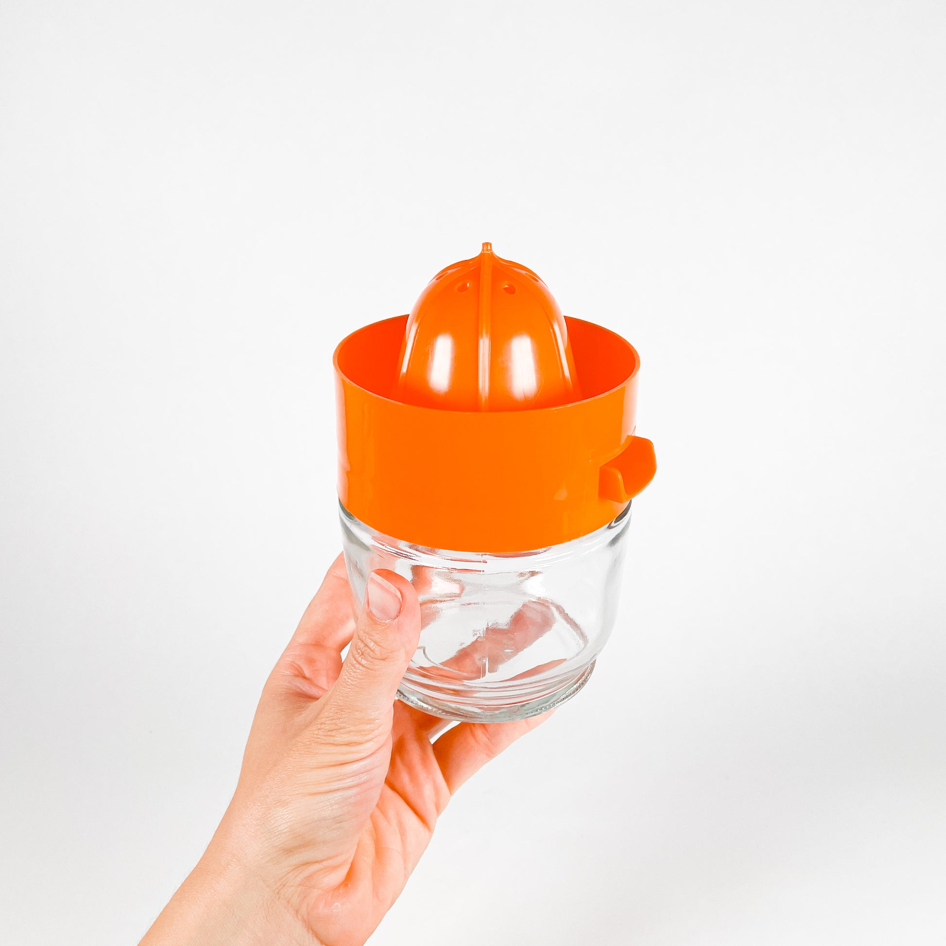Orange glass and plastic juicer, made in the USA by Gemco.