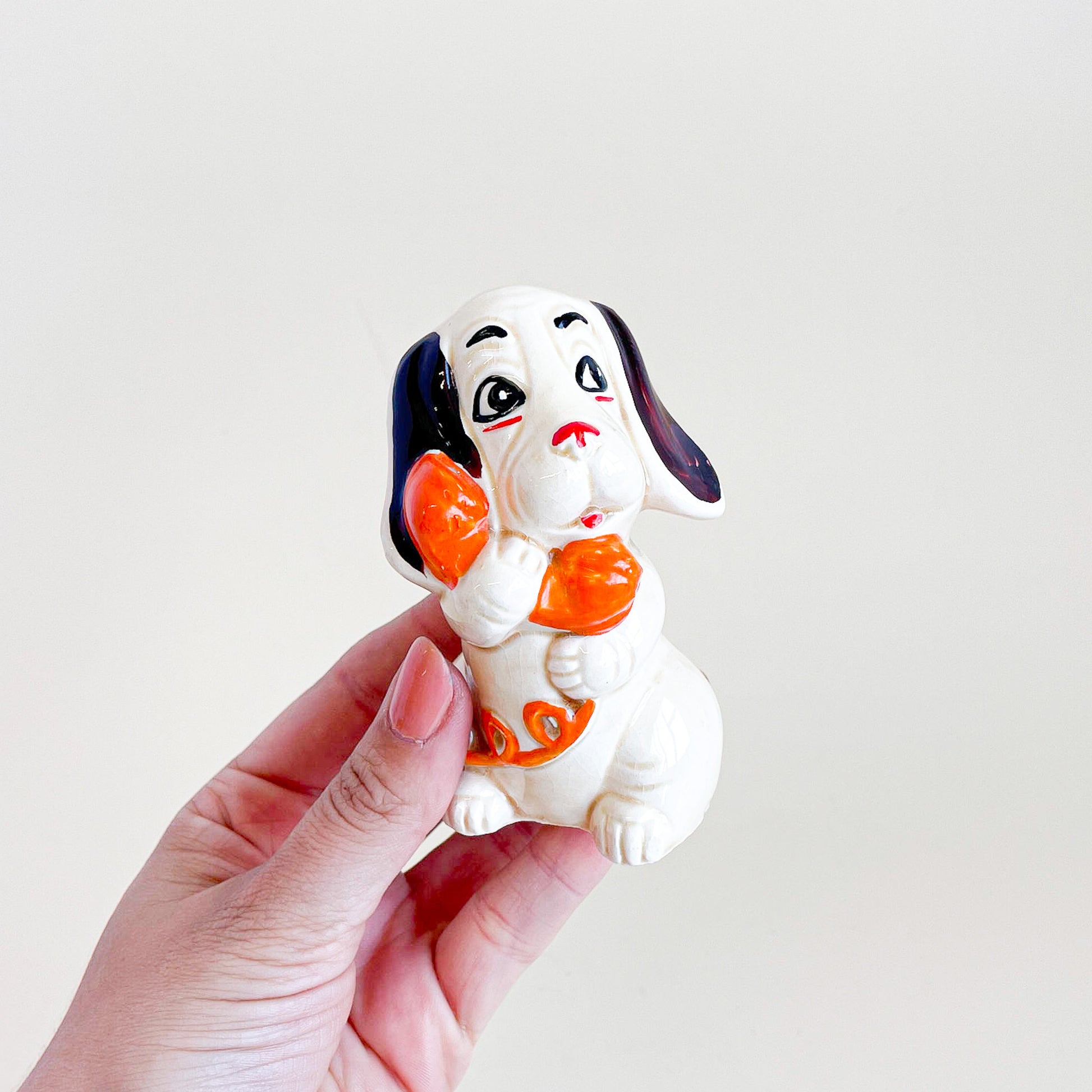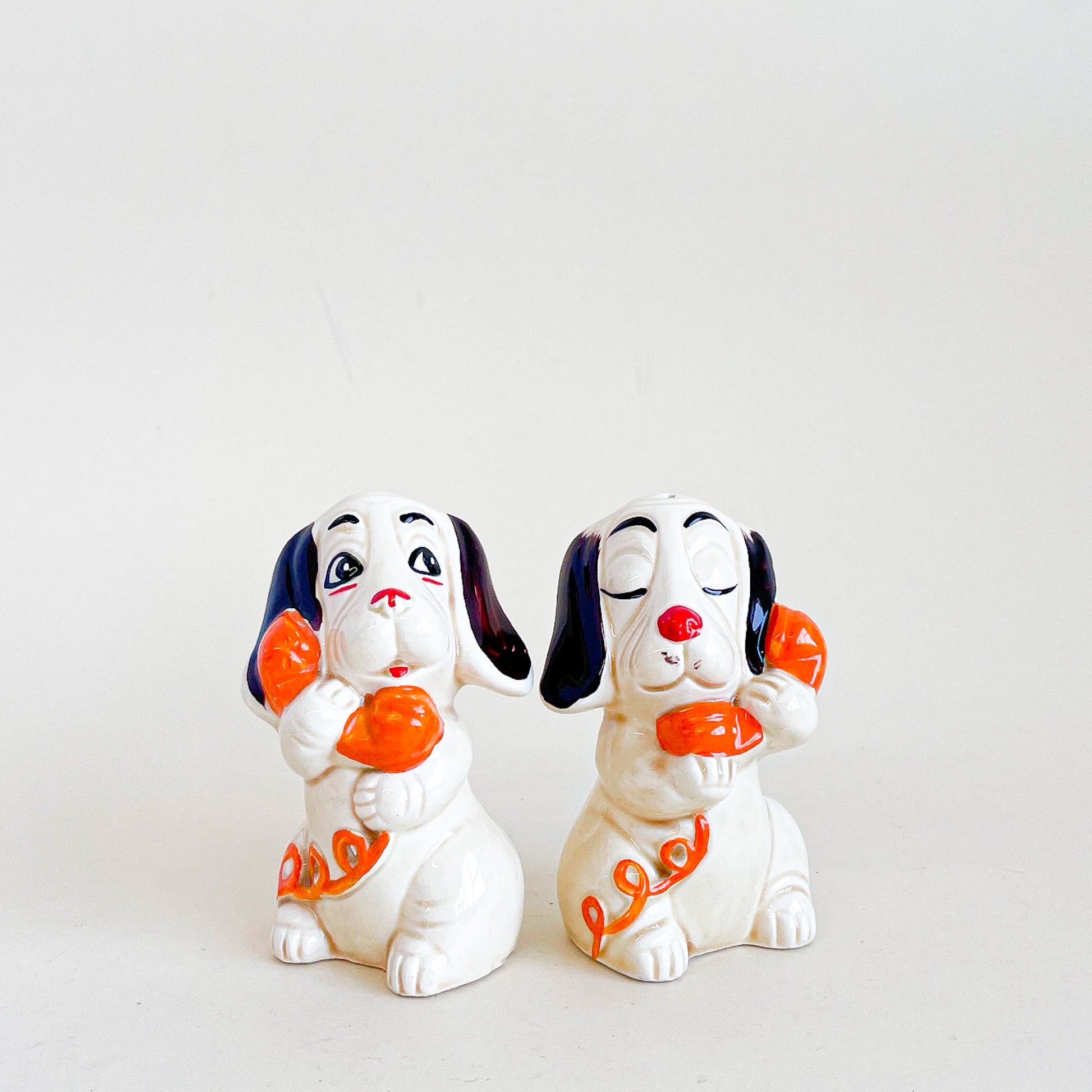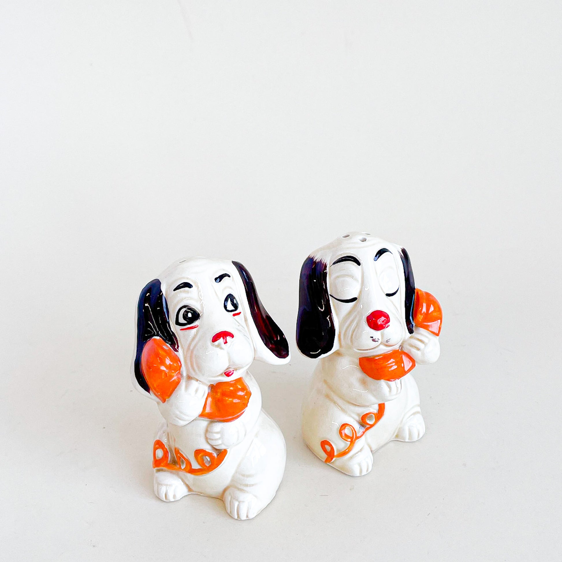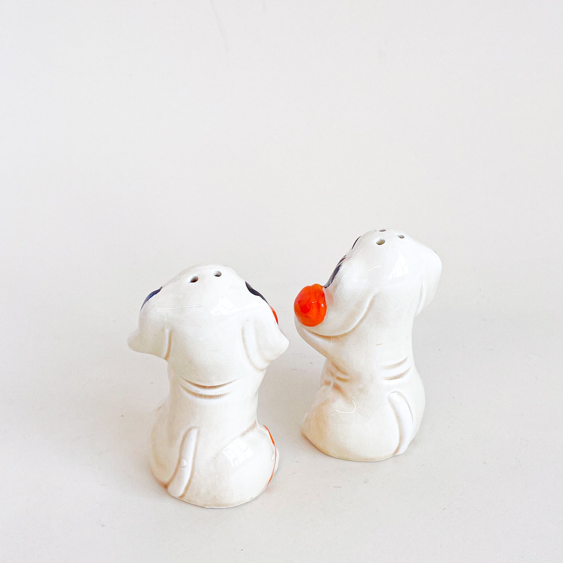 Ceramic salt and pepper set in the shape of dogs talking on the phone. Made in Japan.