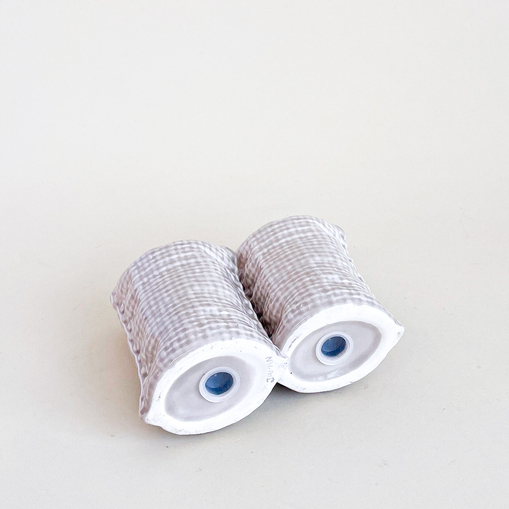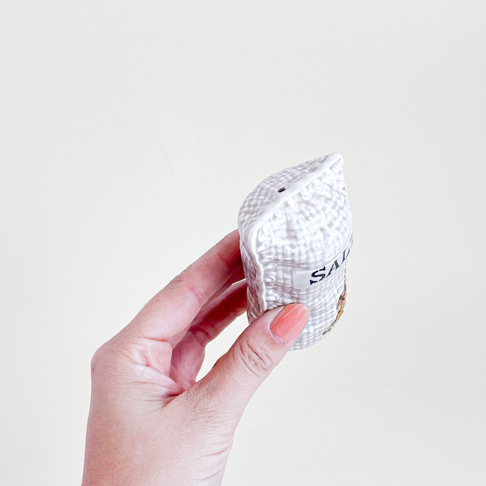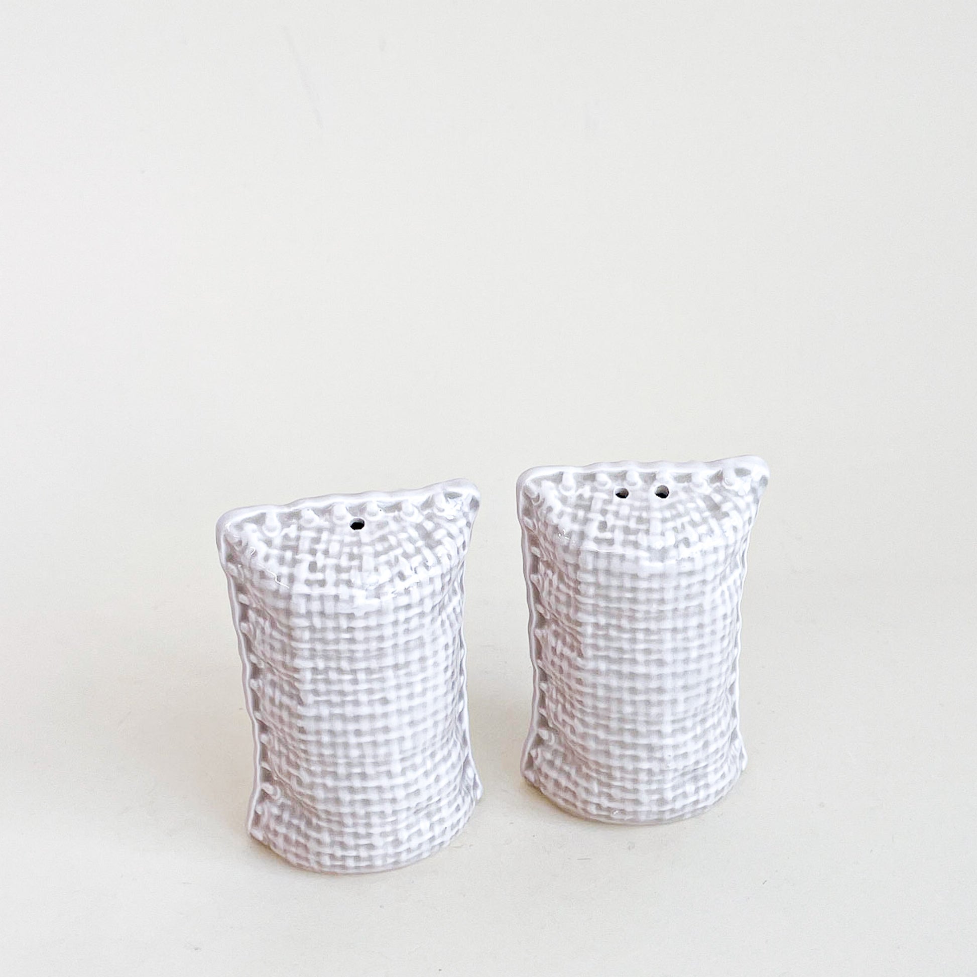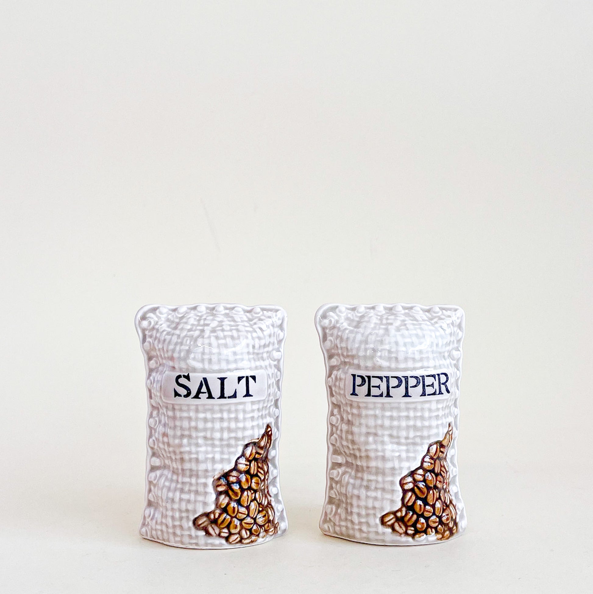 Ceramic salt and pepper shaker in the shape of coffee bean bags.