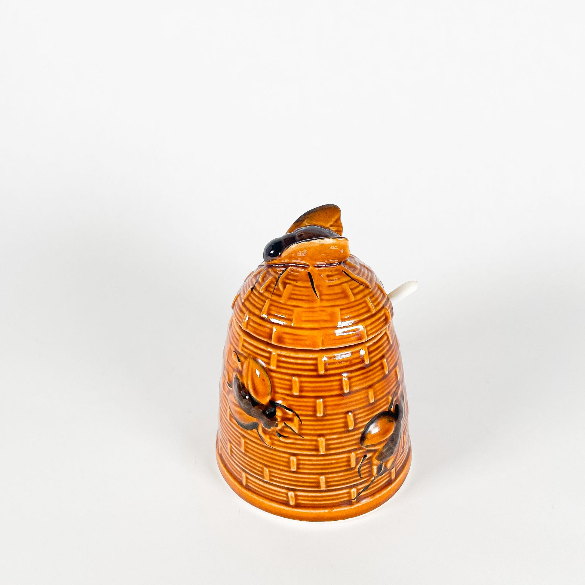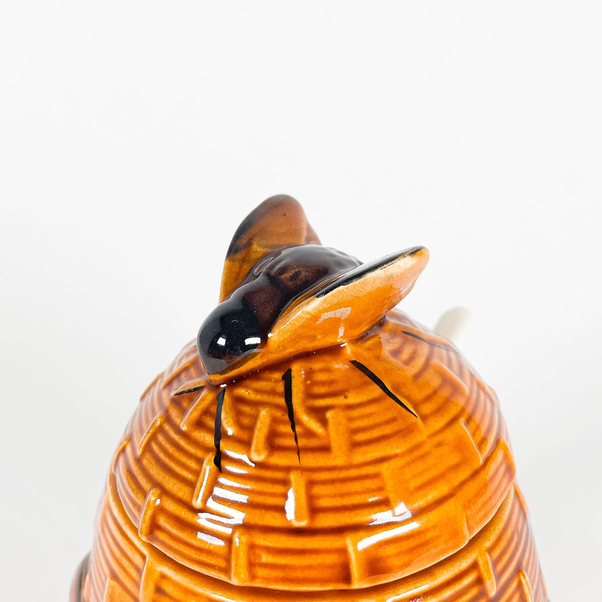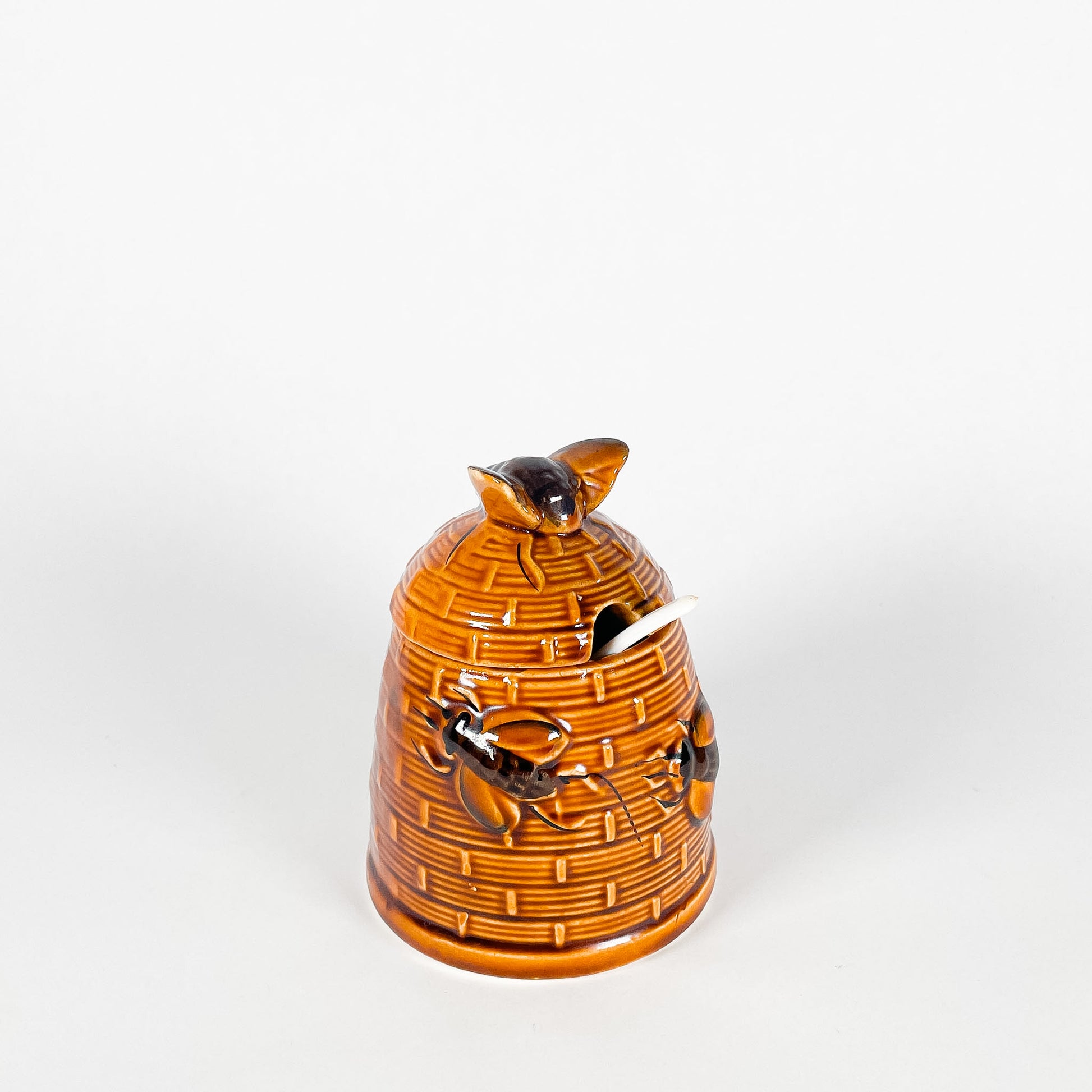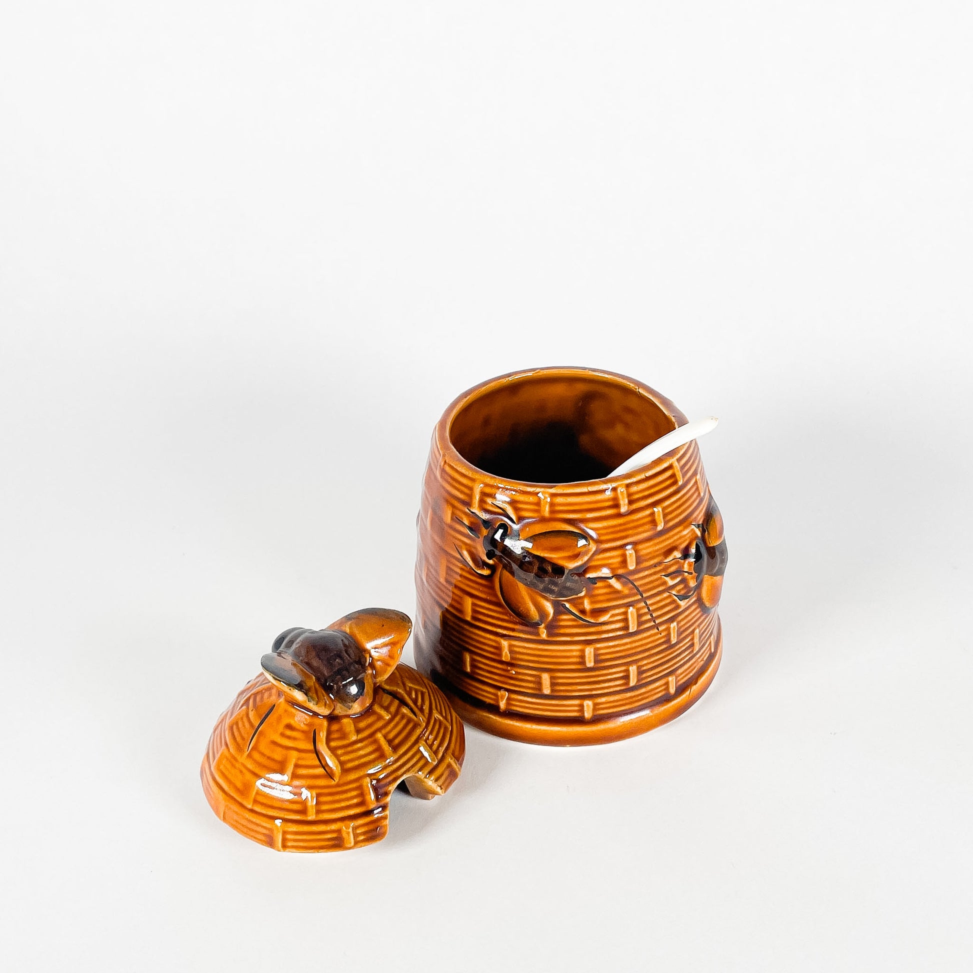 Ceramic sugar bowl in the shape of a beehive with a small bee on the lid and a small spoon.