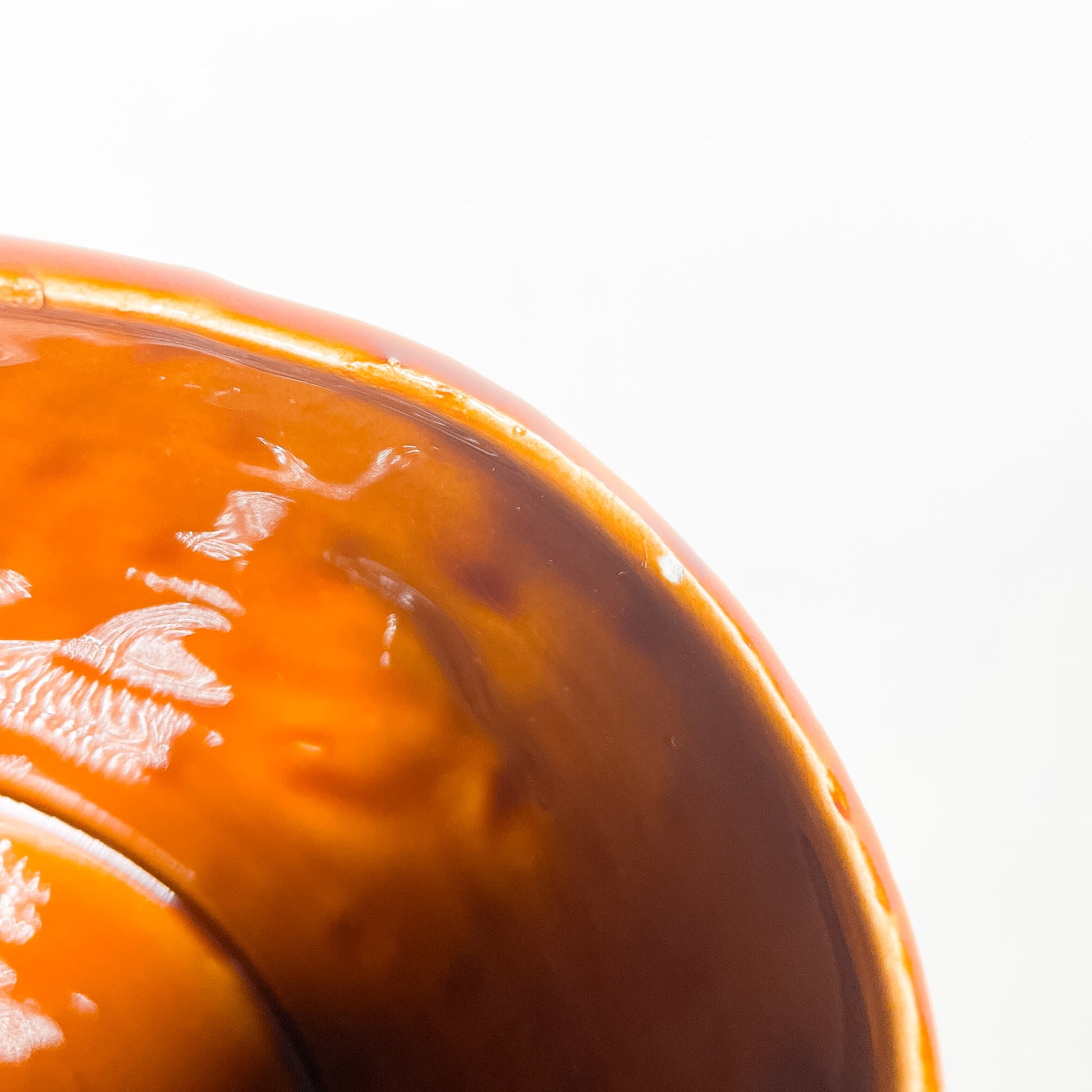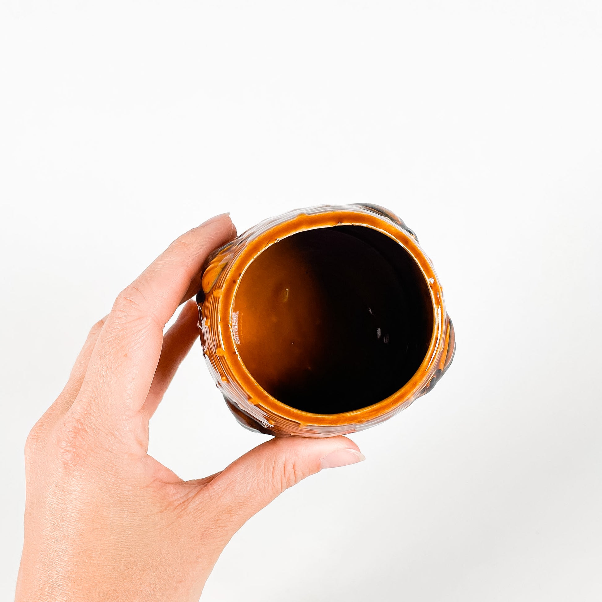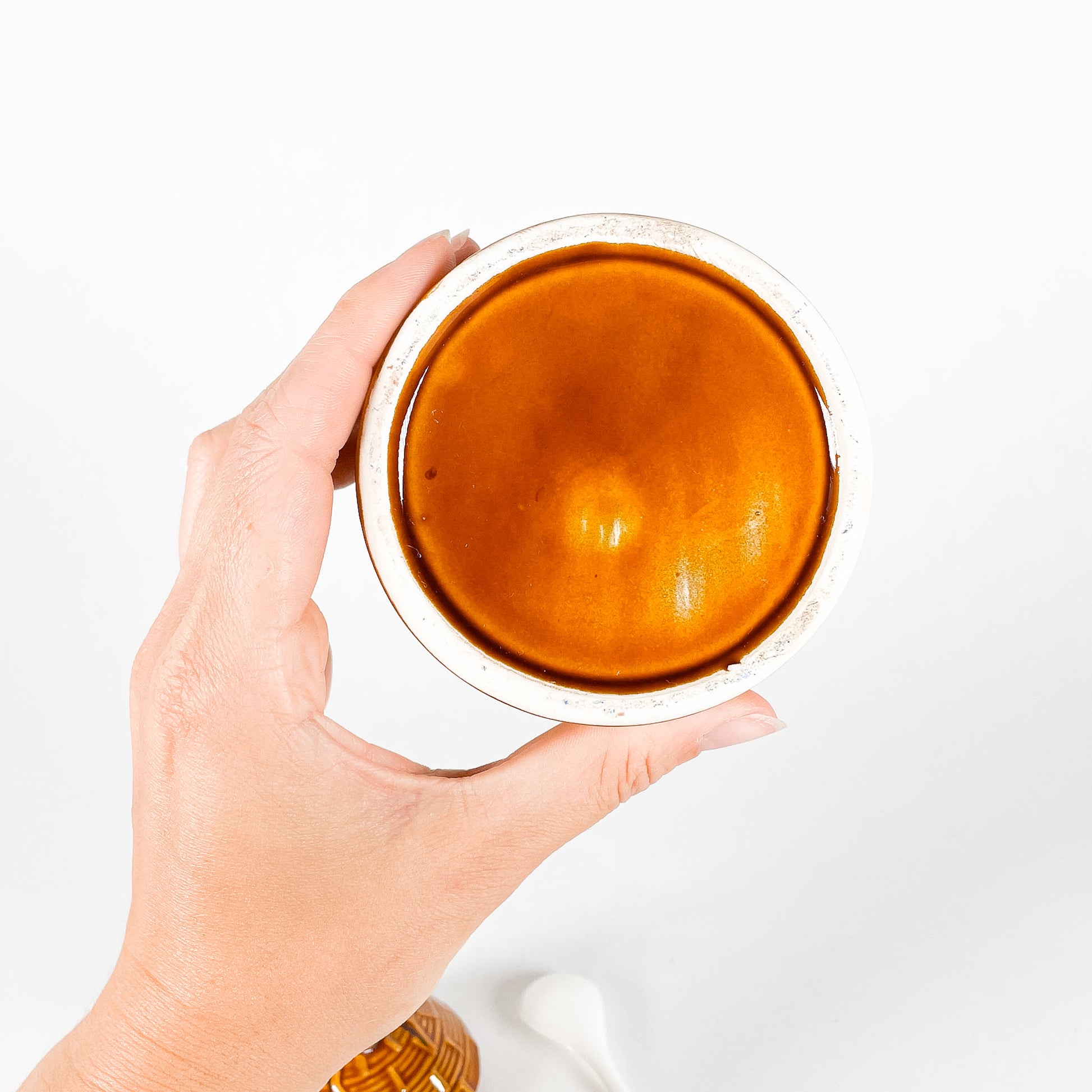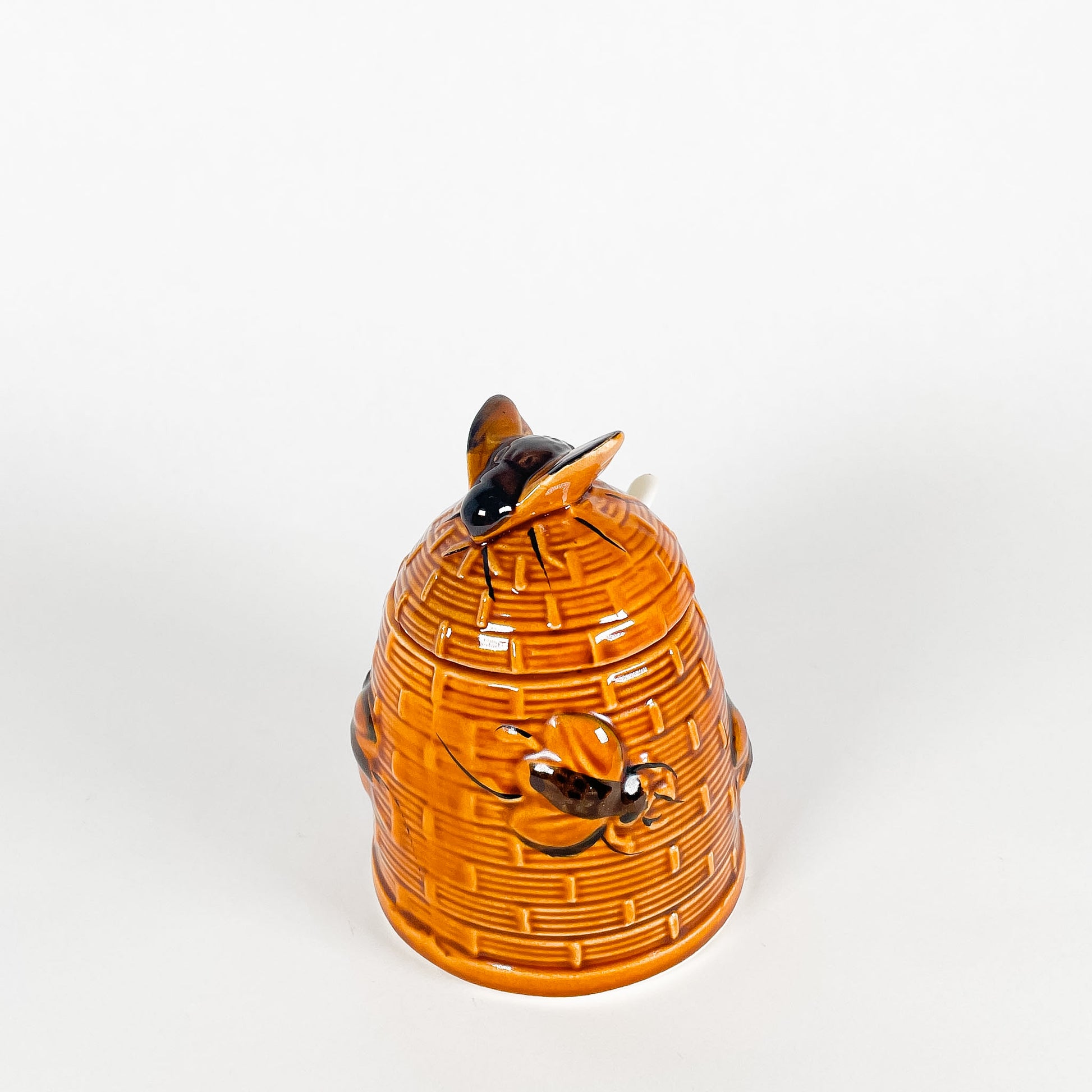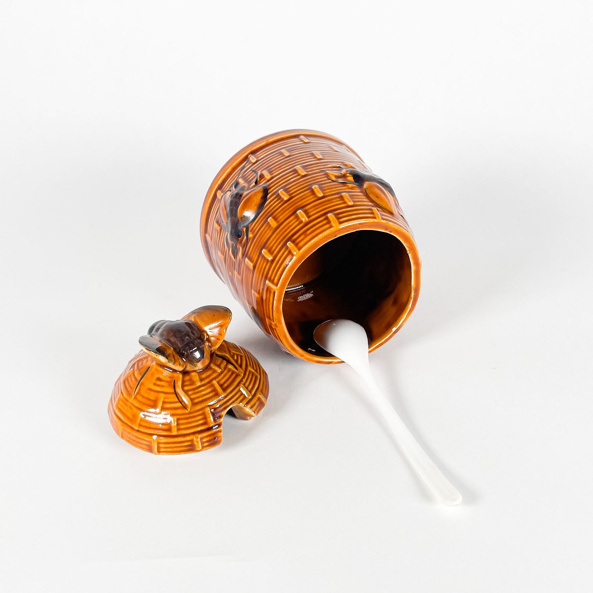 Ceramic sugar bowl in the shape of a beehive with a small bee on the lid and a small spoon.