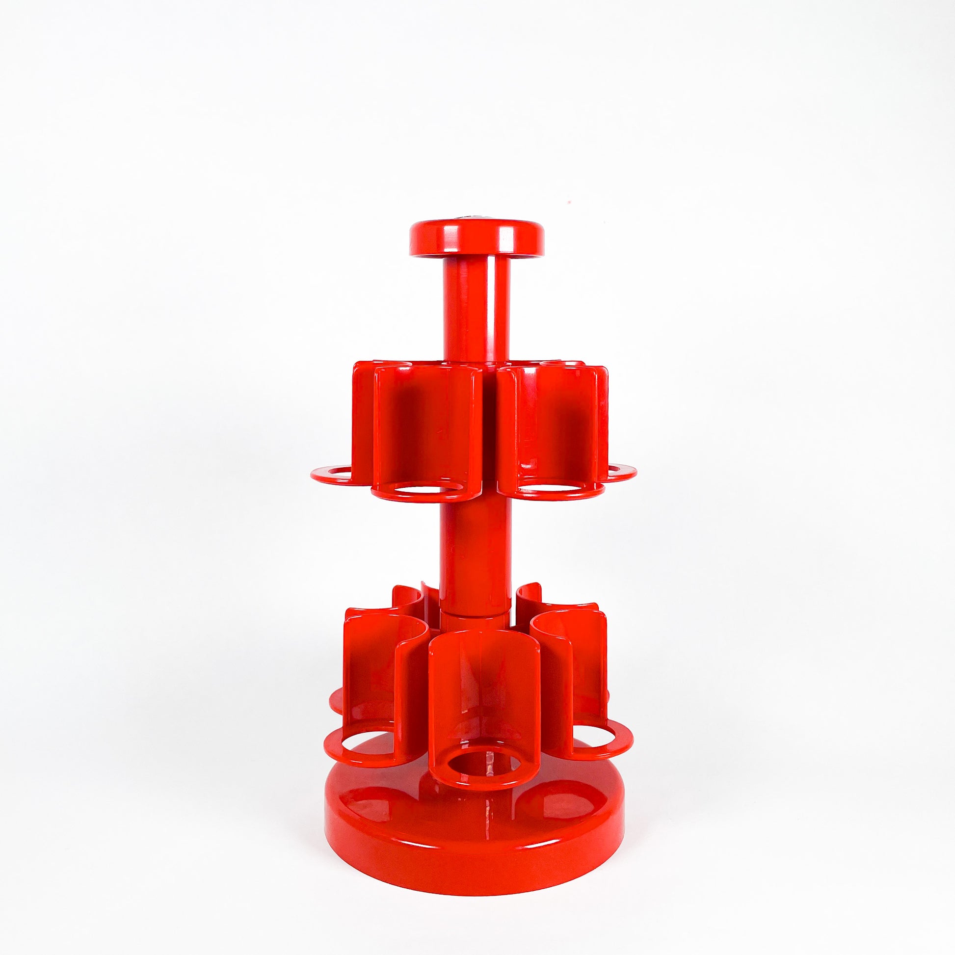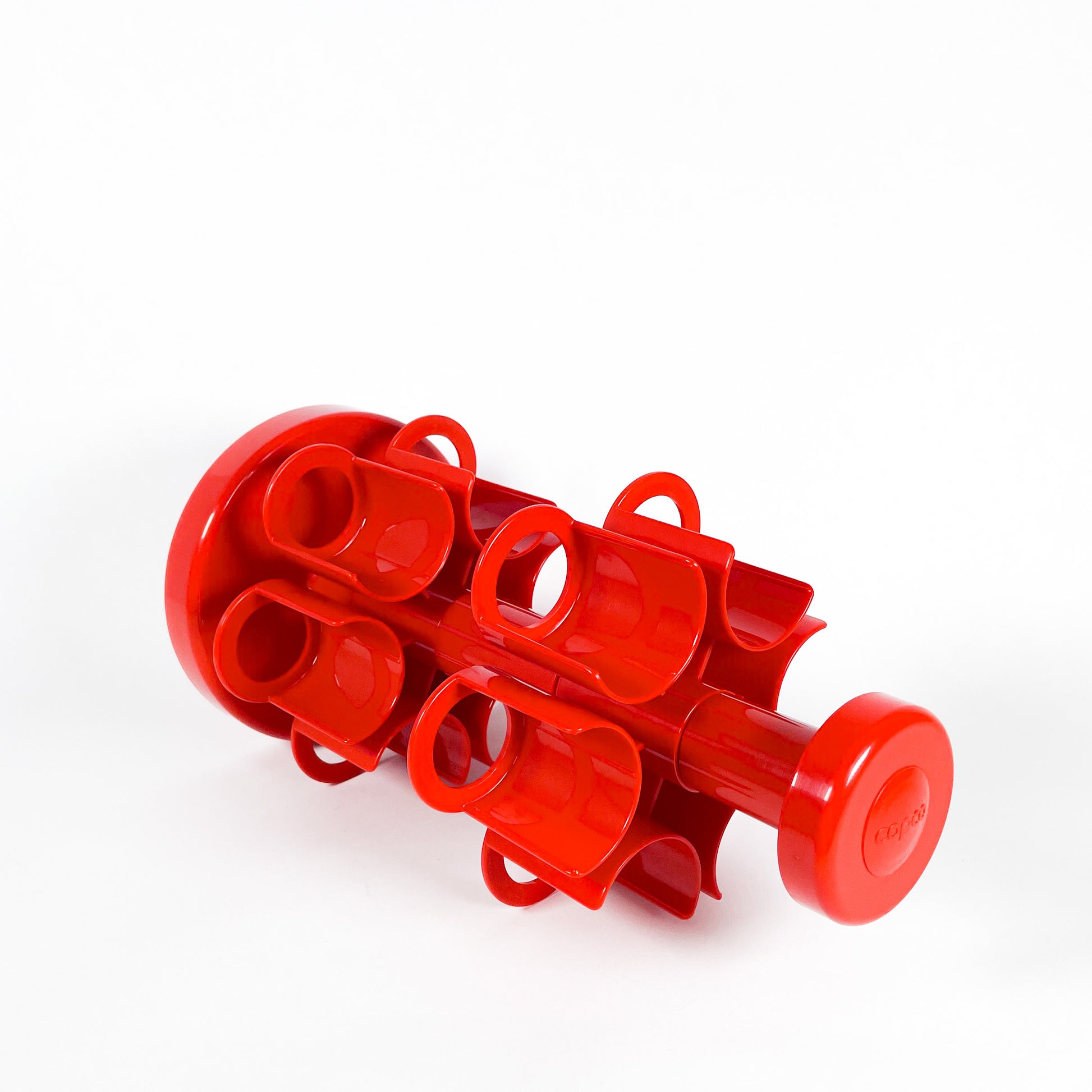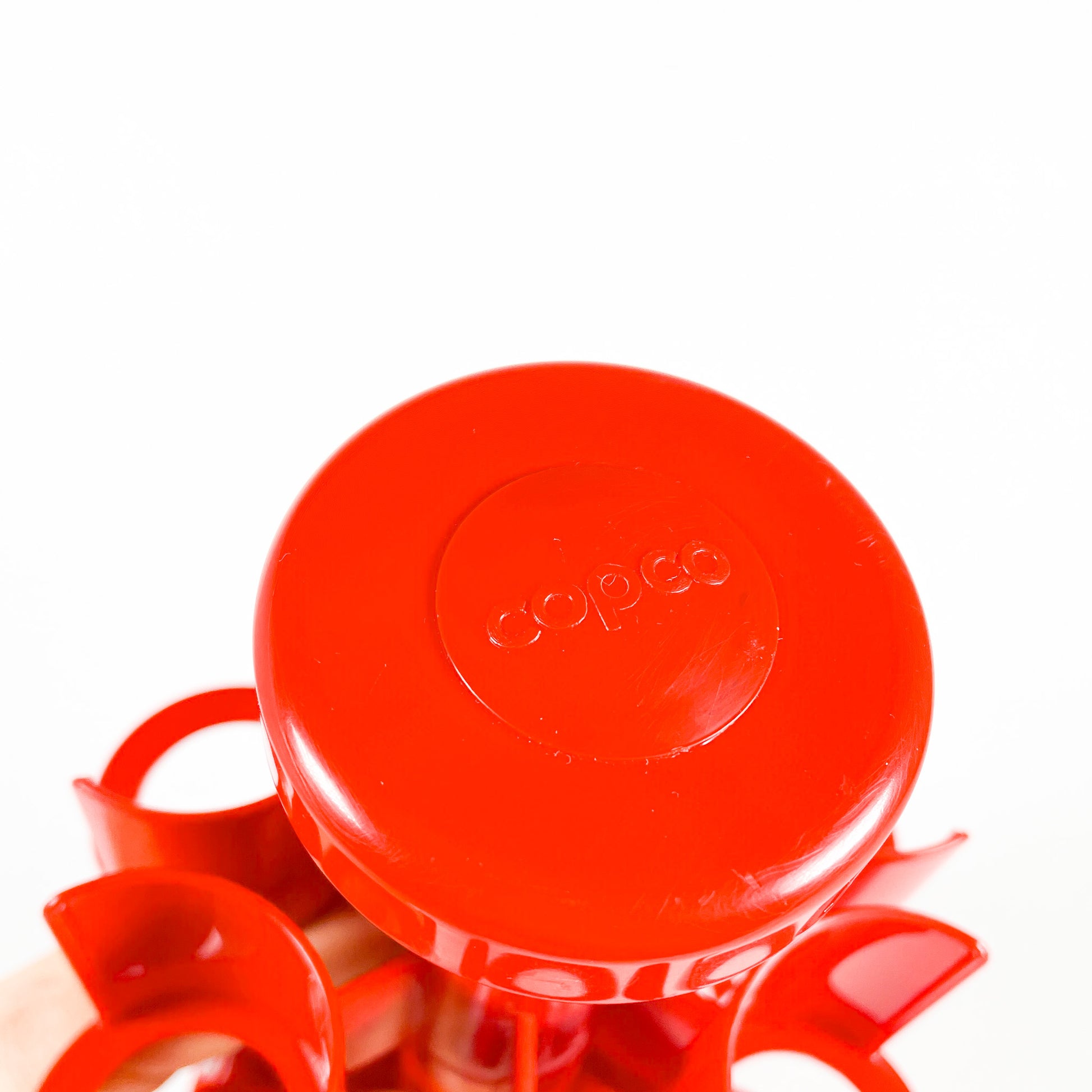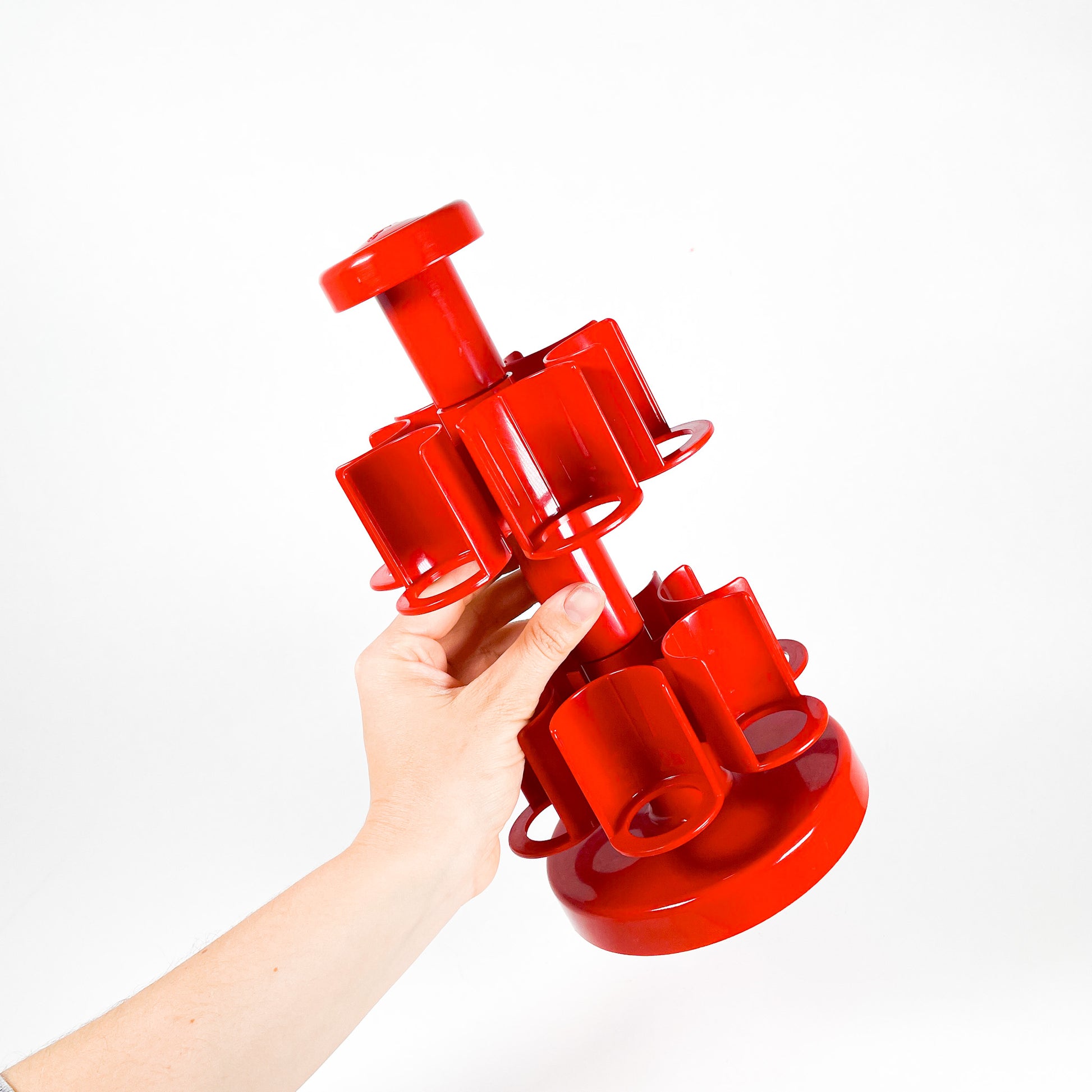 Swivel spice rack in red plastic, made in Hong Kong by Copco. There is space for 12 pots with a diameter of approximately 1.5 inches.
