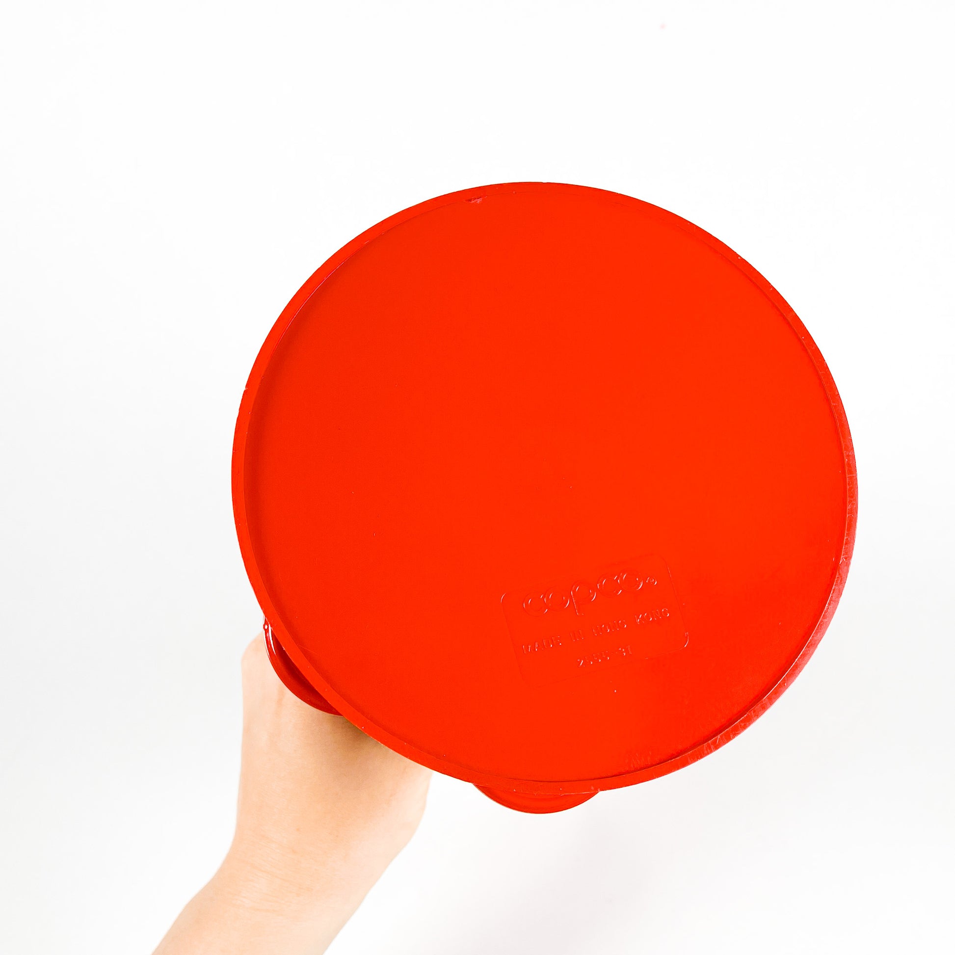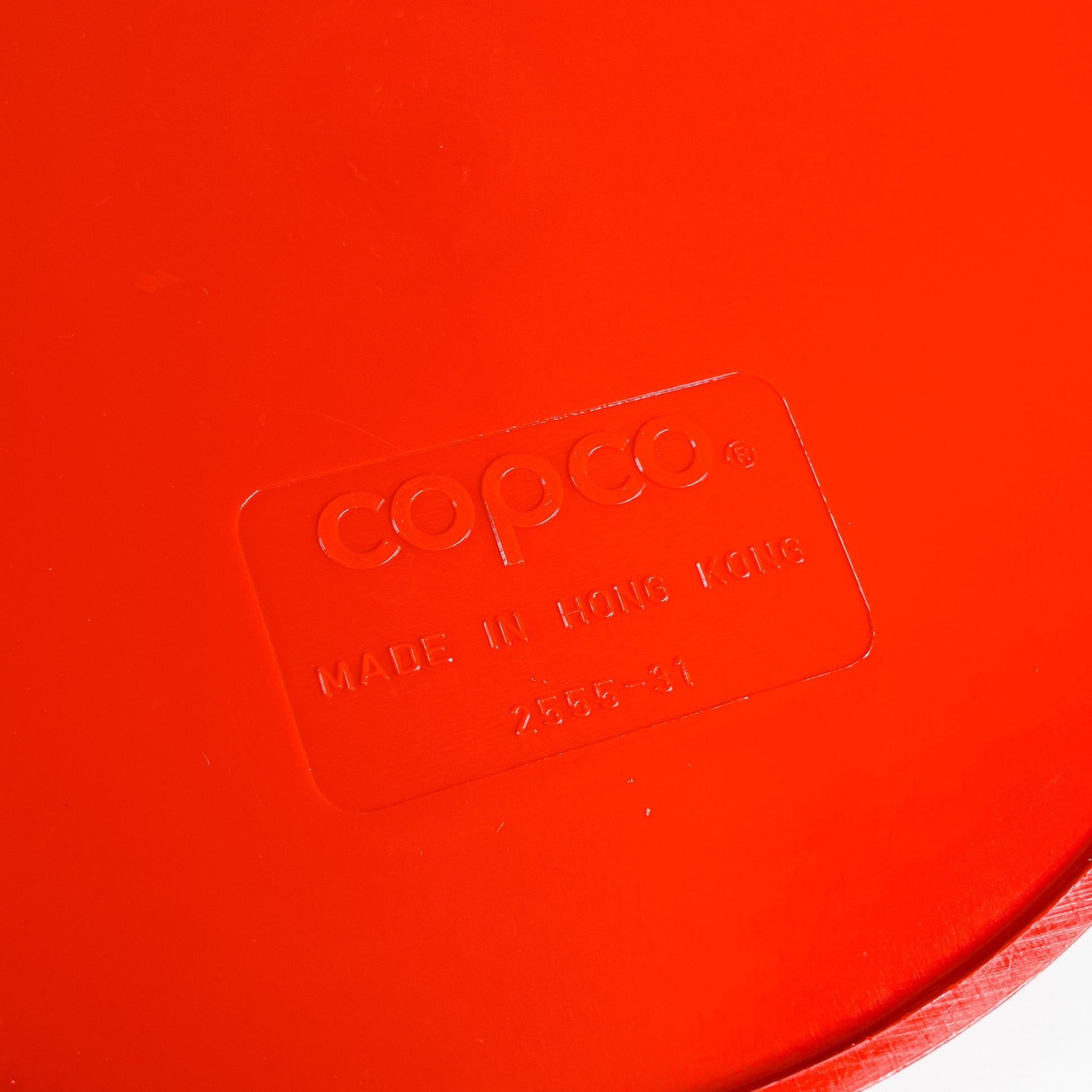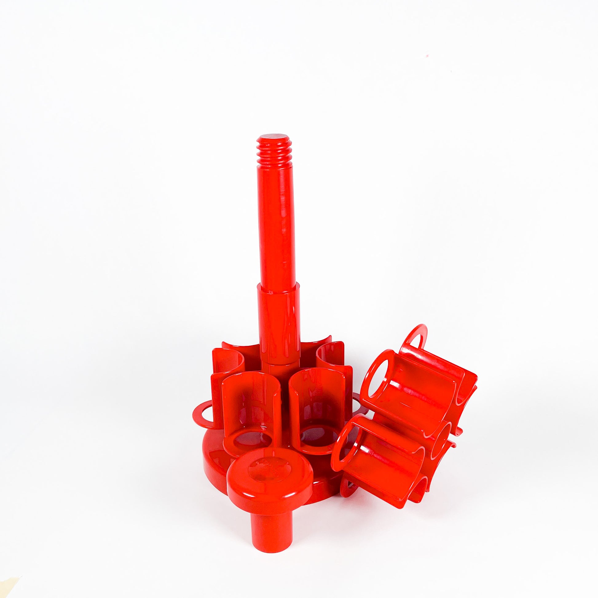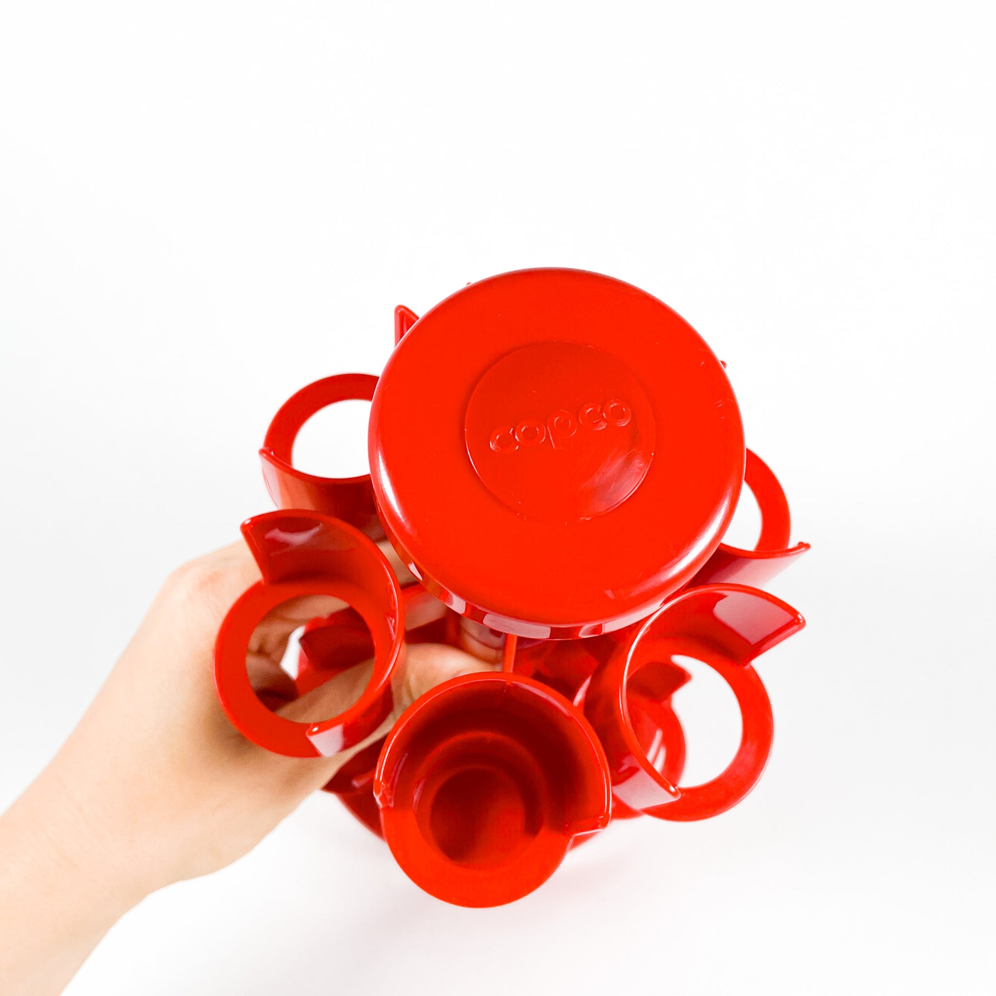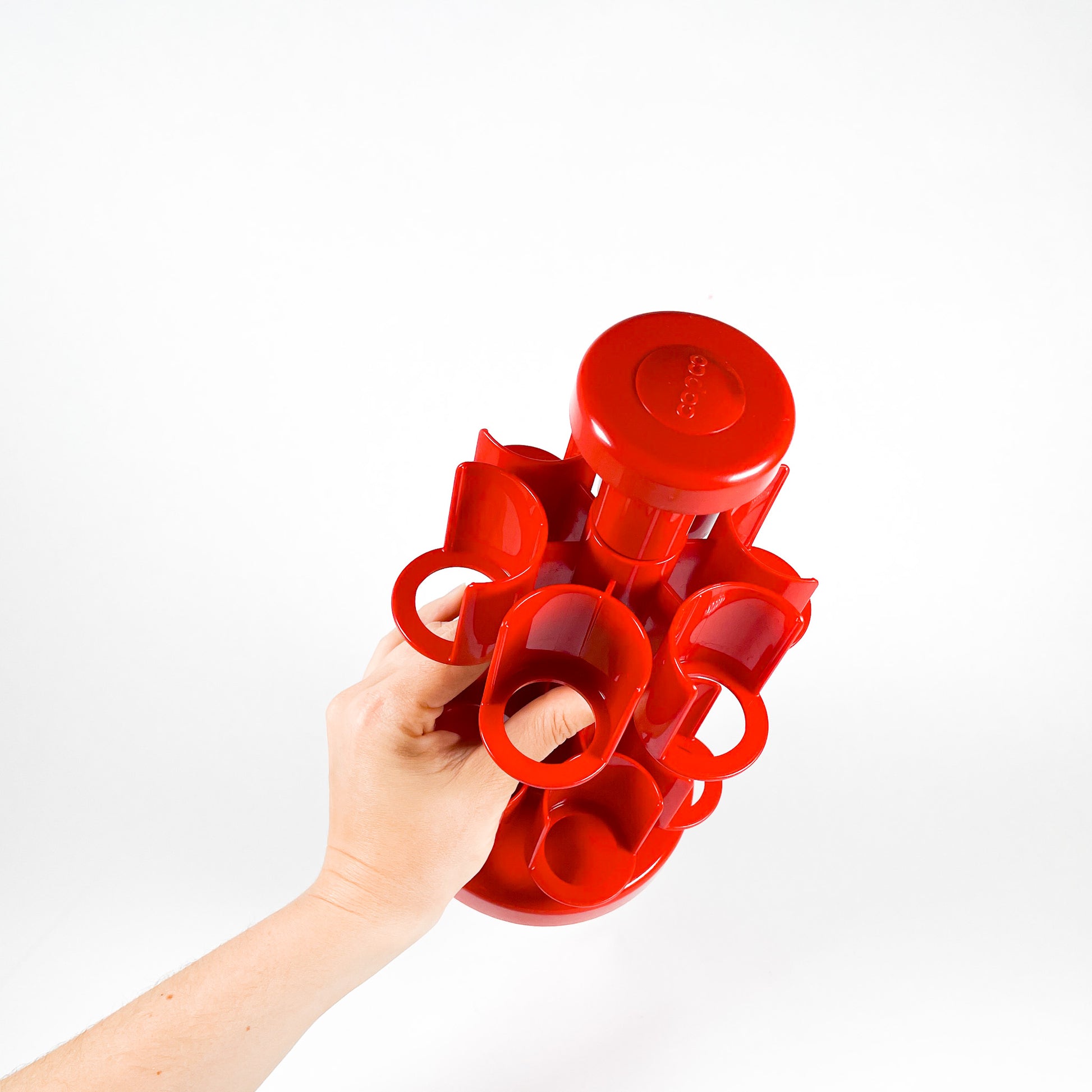 Swivel spice rack in red plastic, made in Hong Kong by Copco. There is space for 12 pots with a diameter of approximately 1.5 inches.