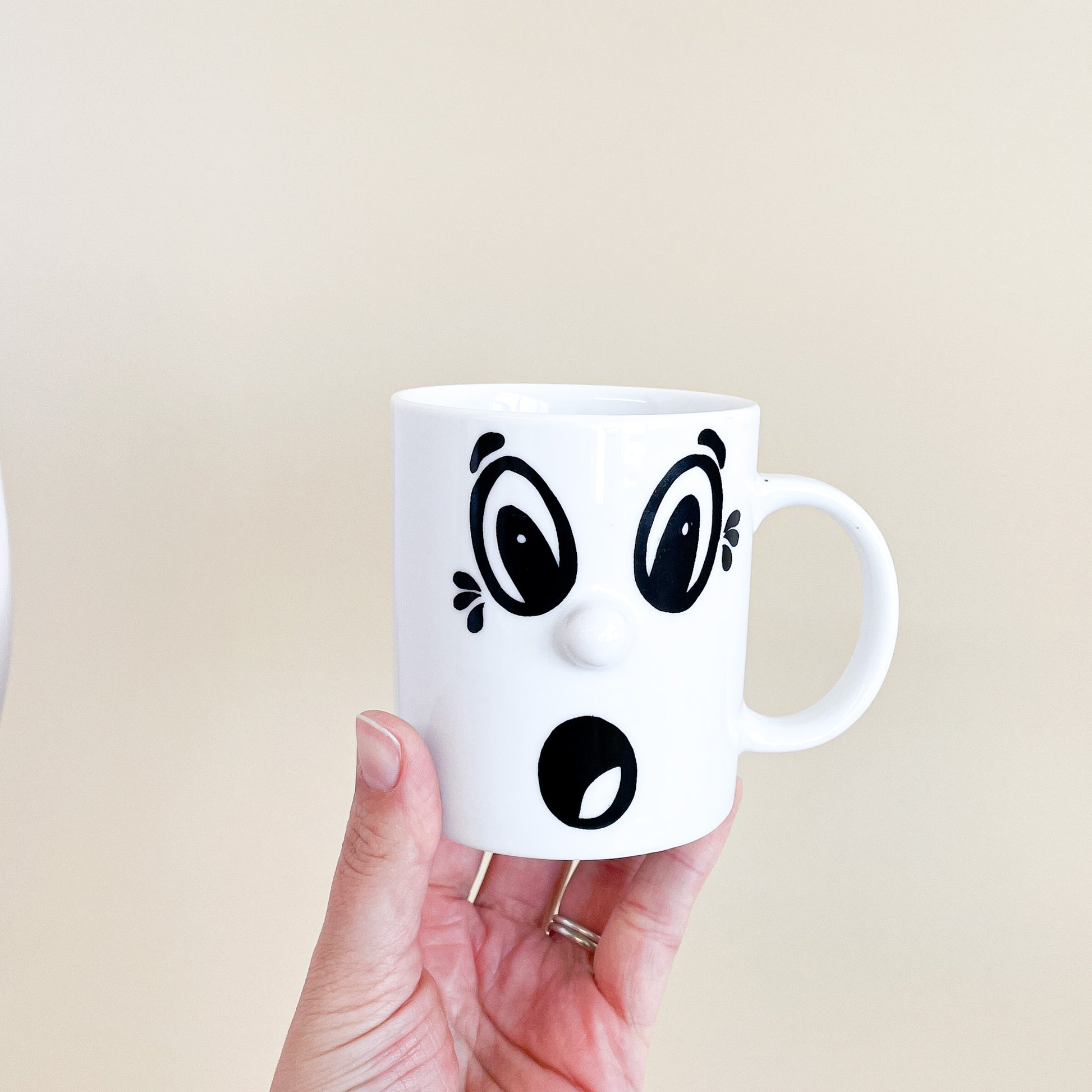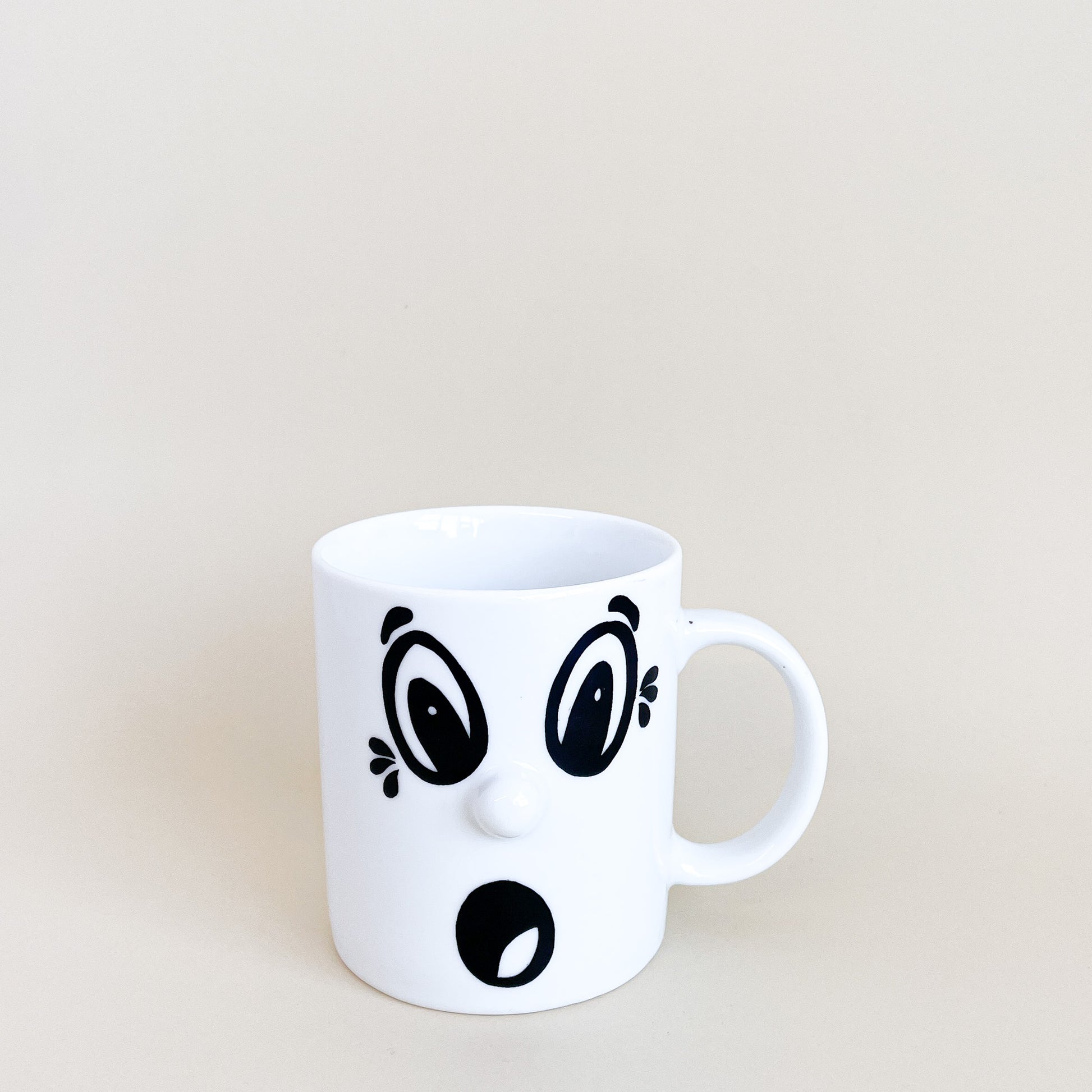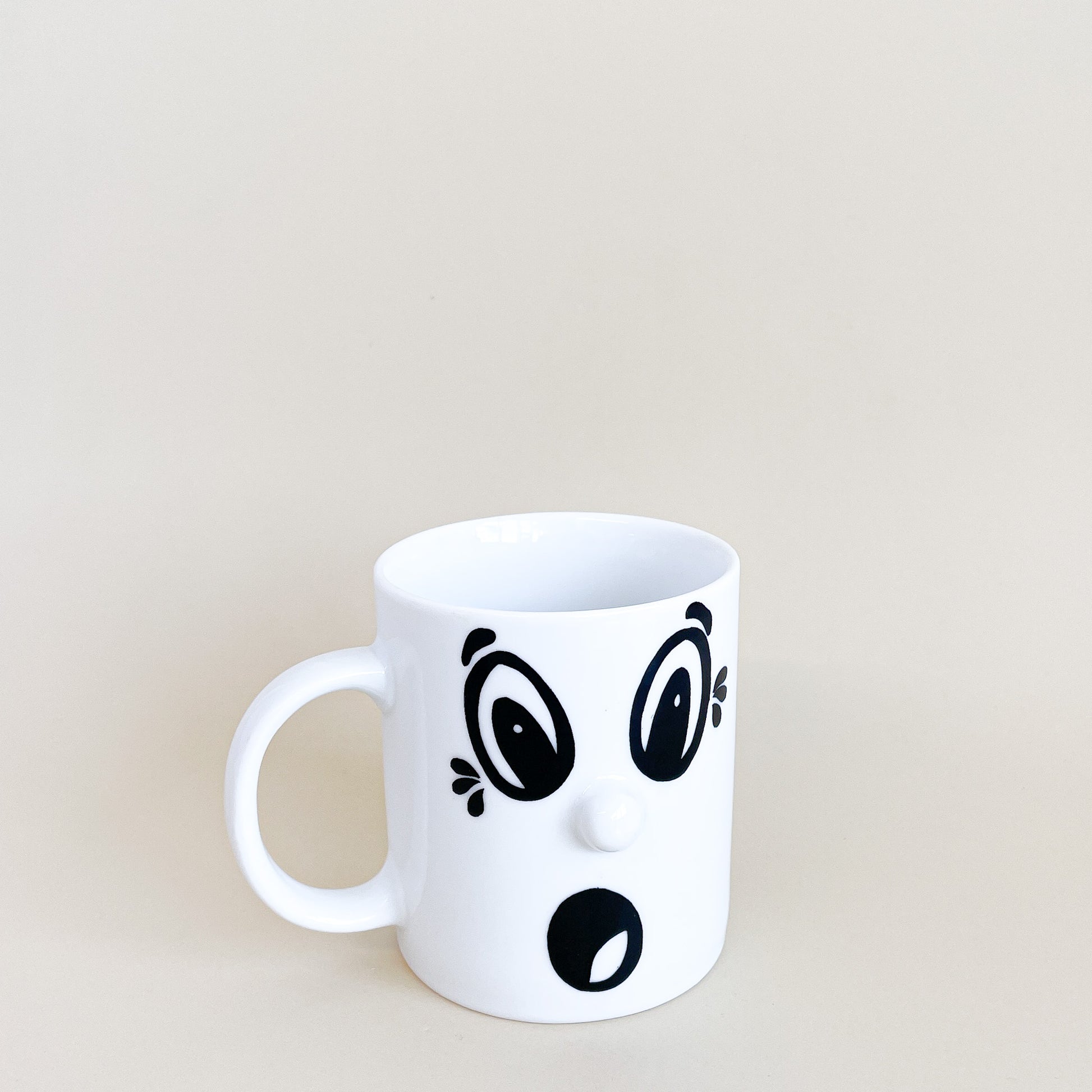 White ceramic mug with a surprised face.