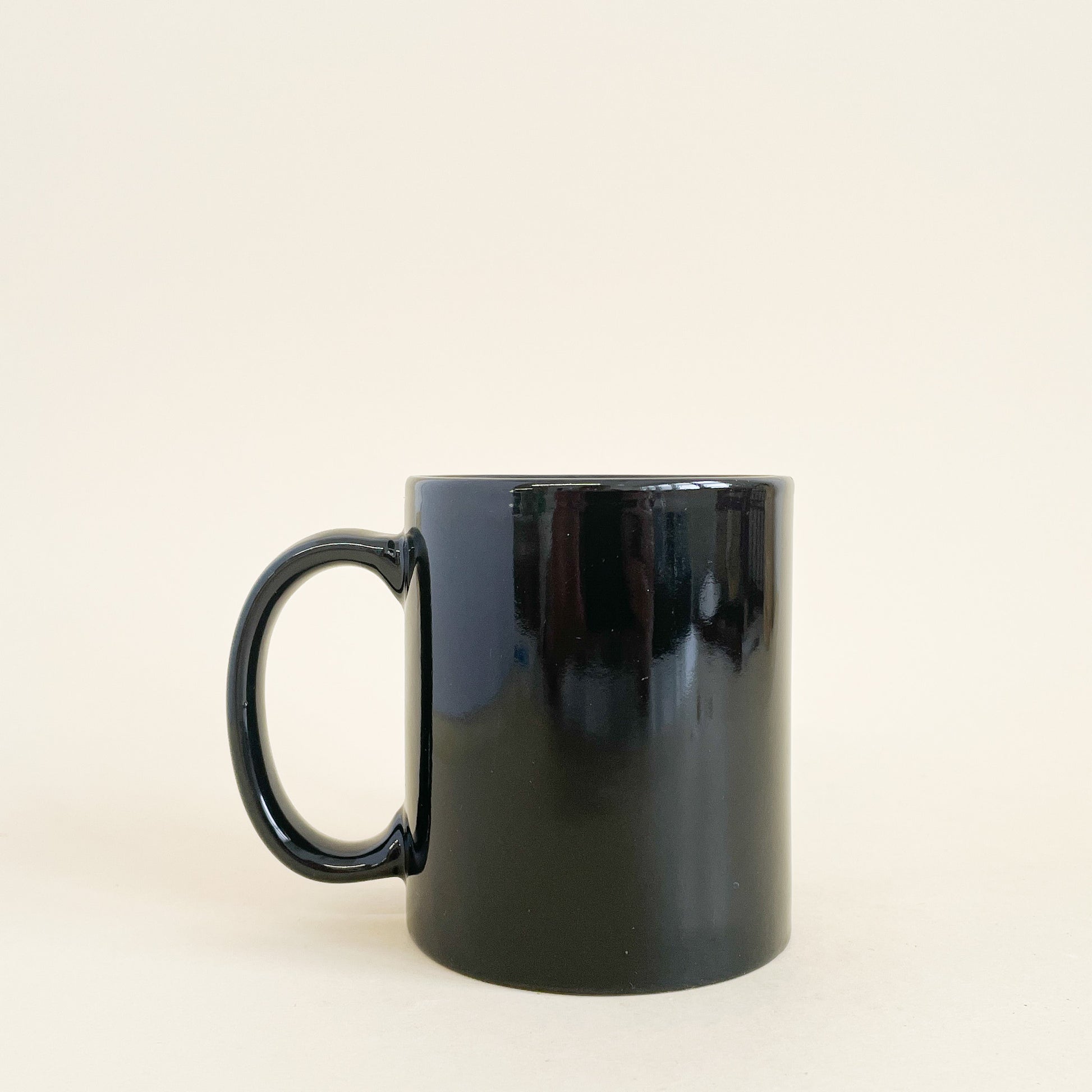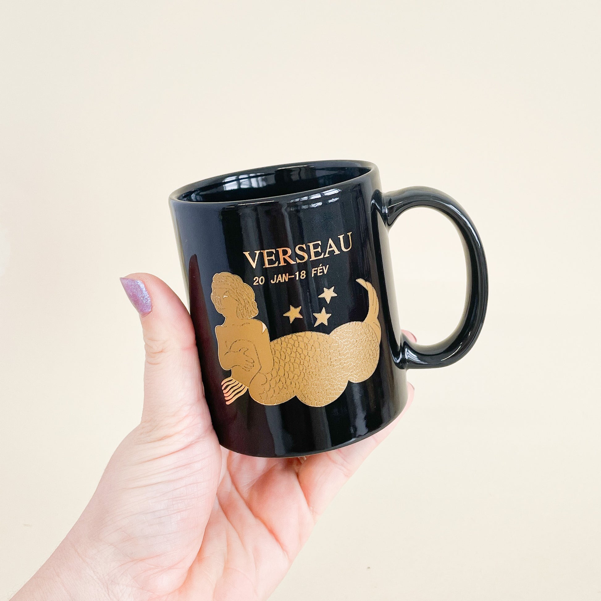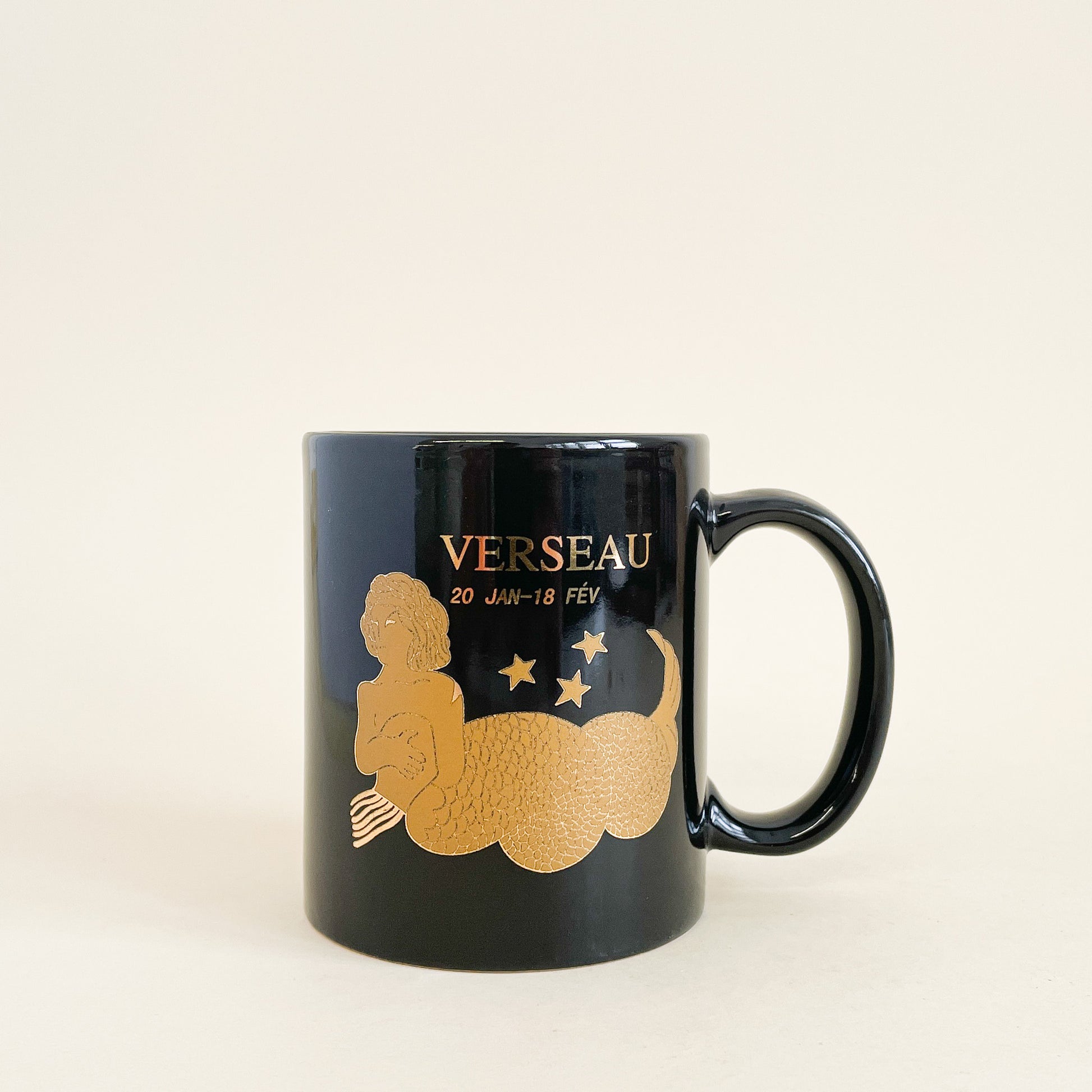 Black ceramic mug with golden Aquarius print.