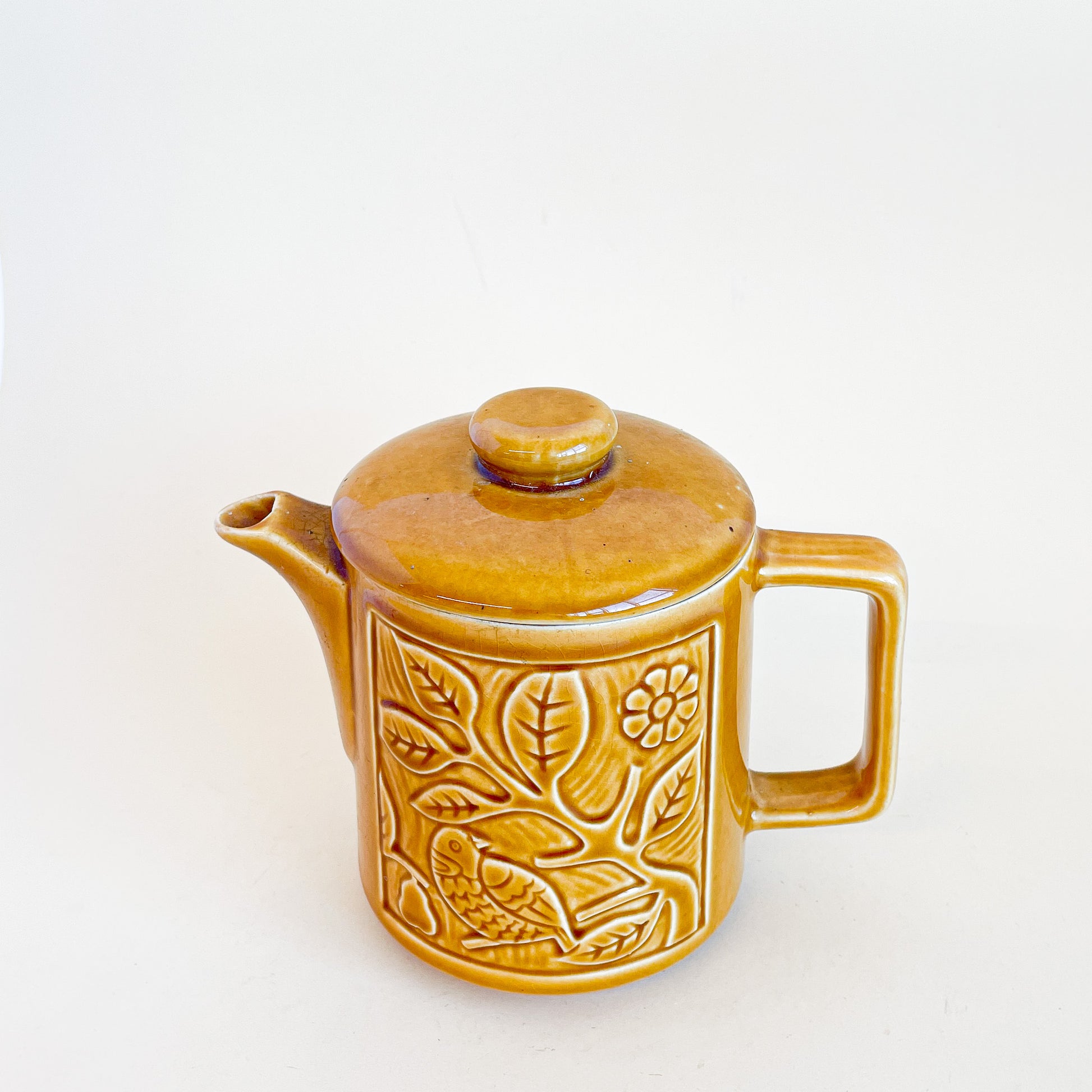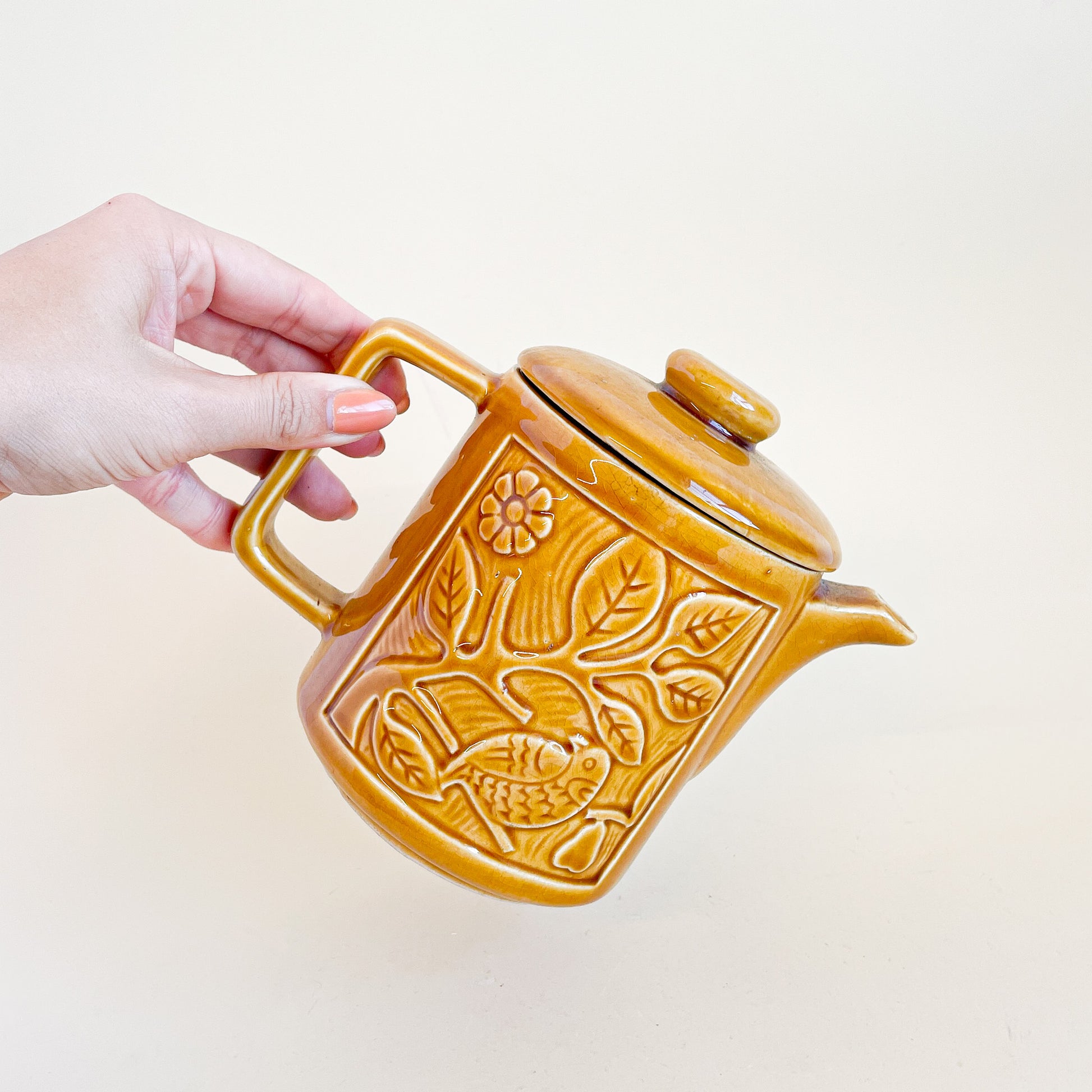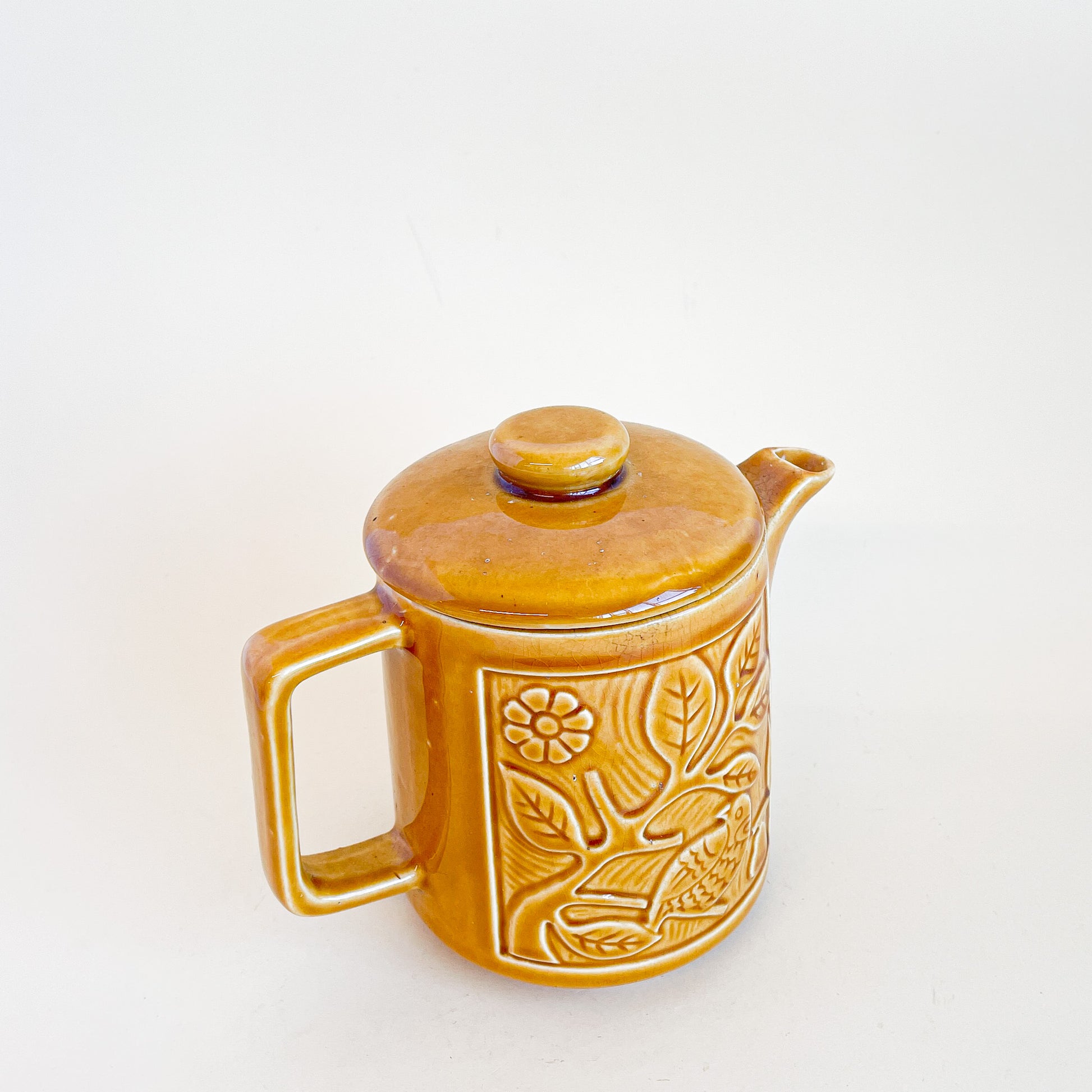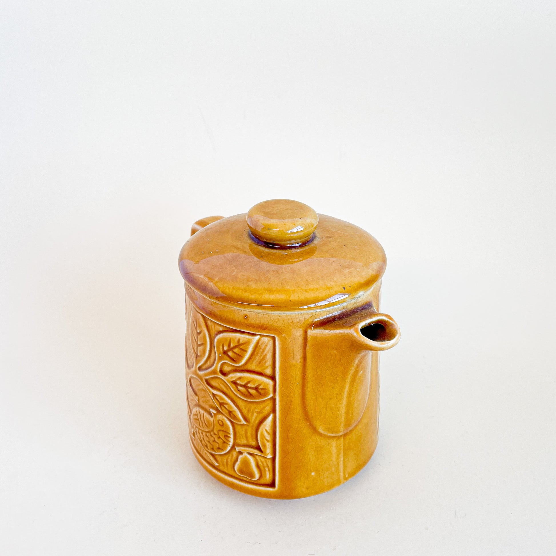 Pretty caramel ceramic teapot with textured bird design. Made in Japan.