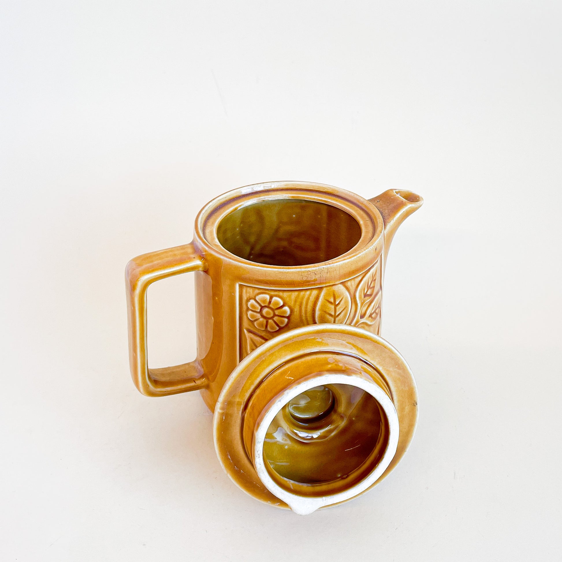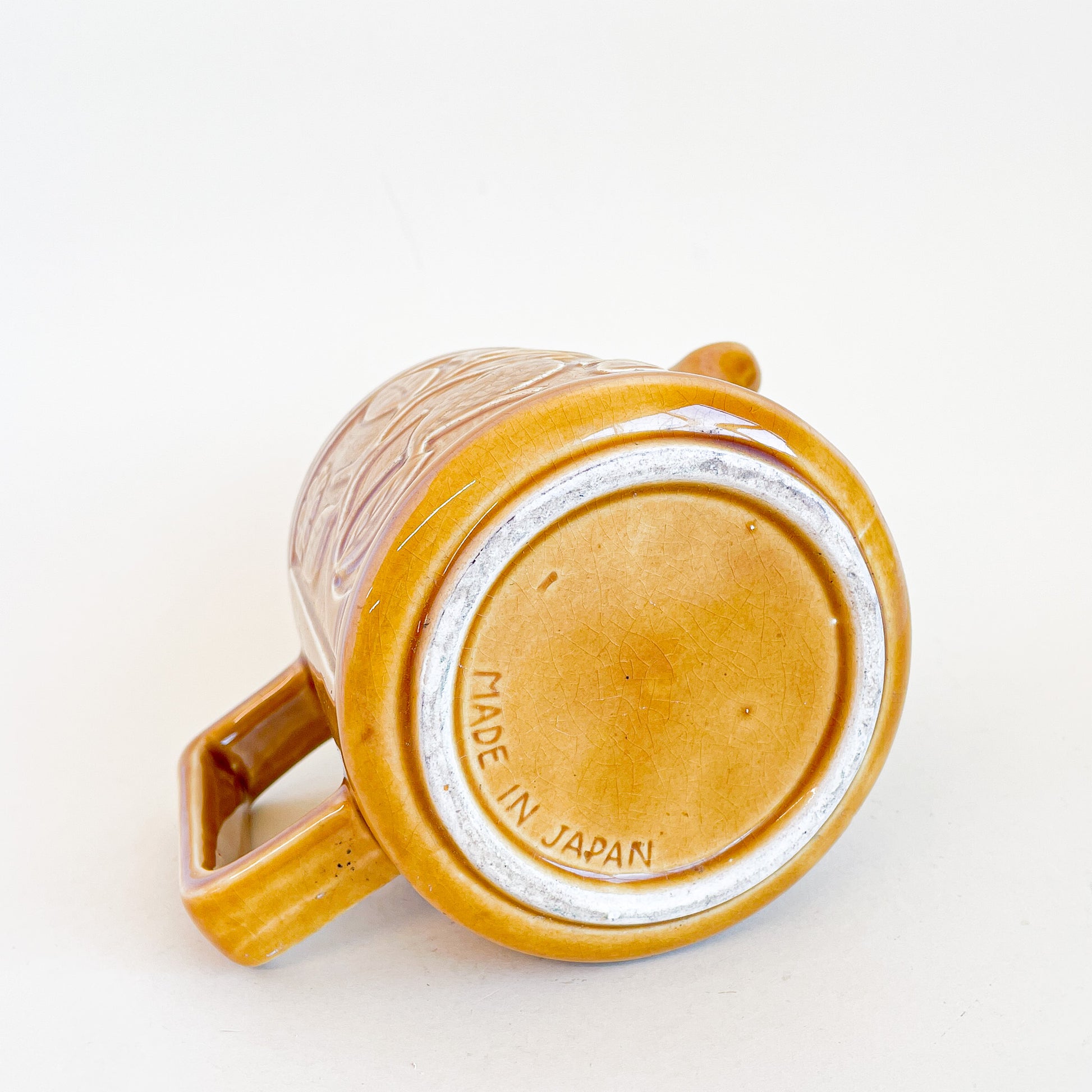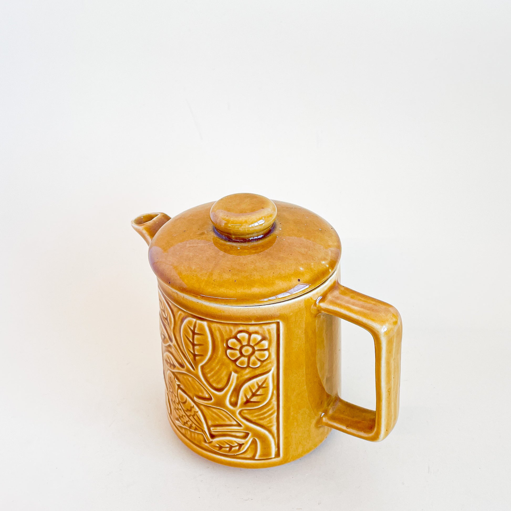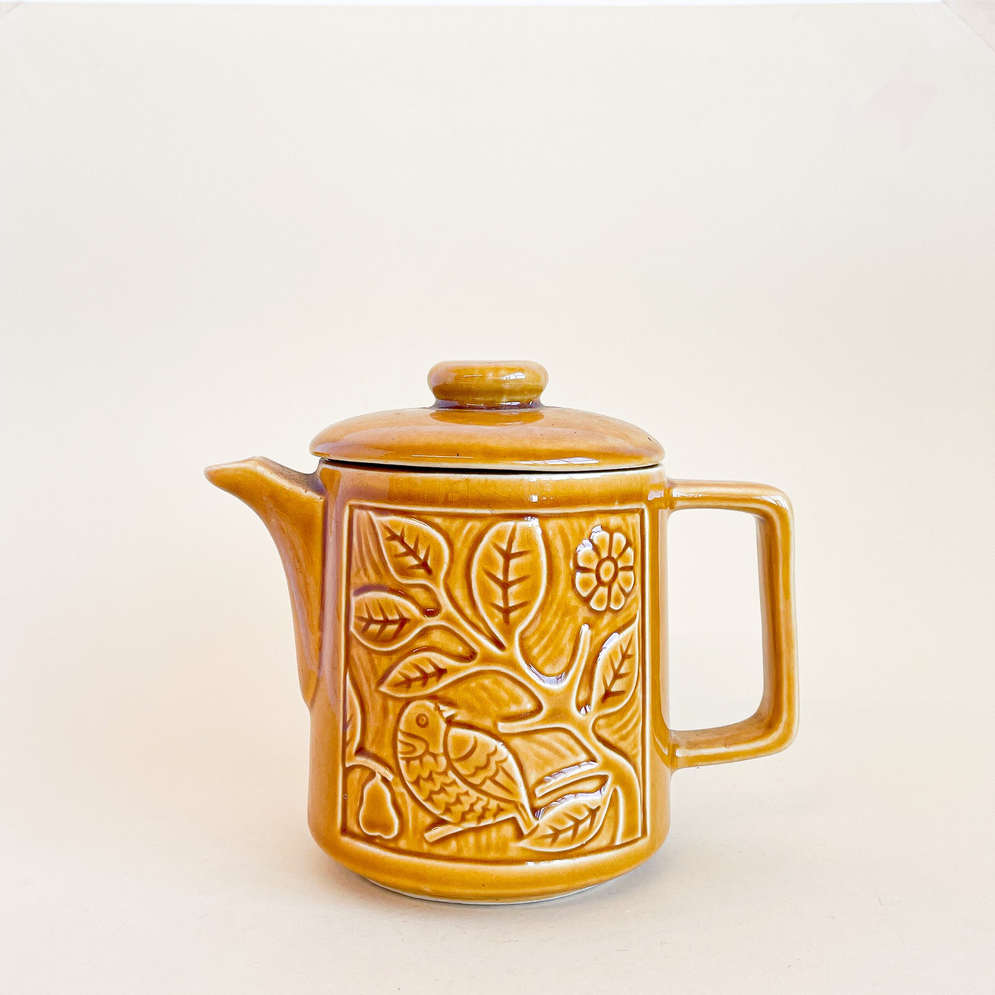 Pretty caramel ceramic teapot with textured bird design. Made in Japan.