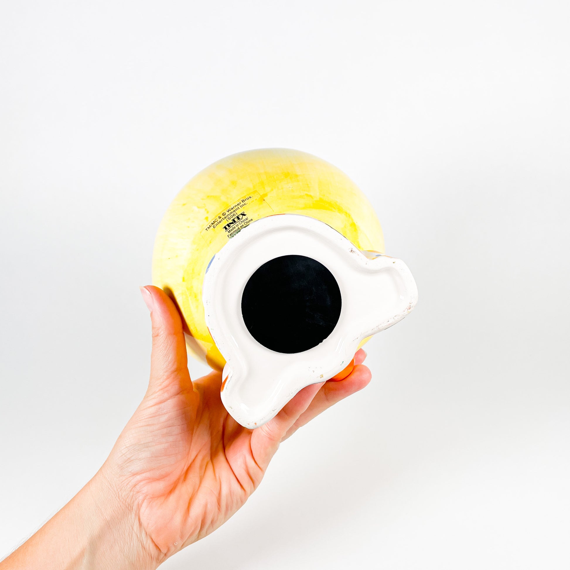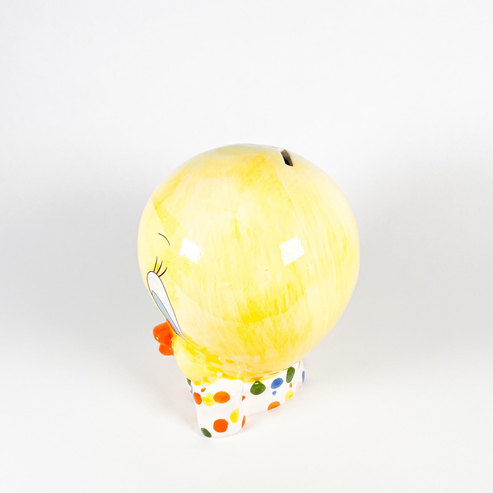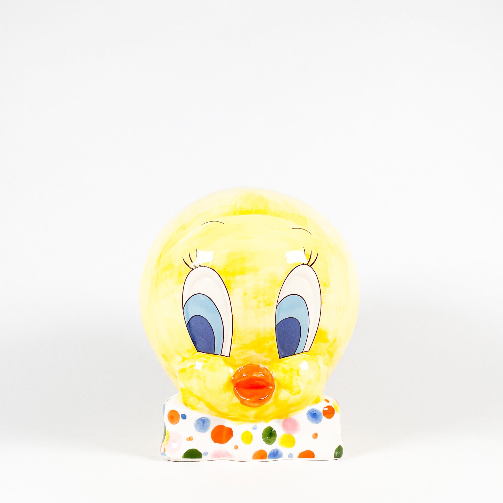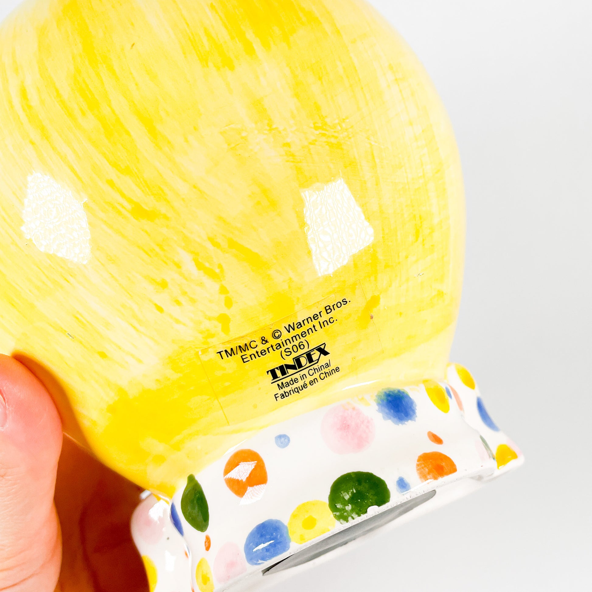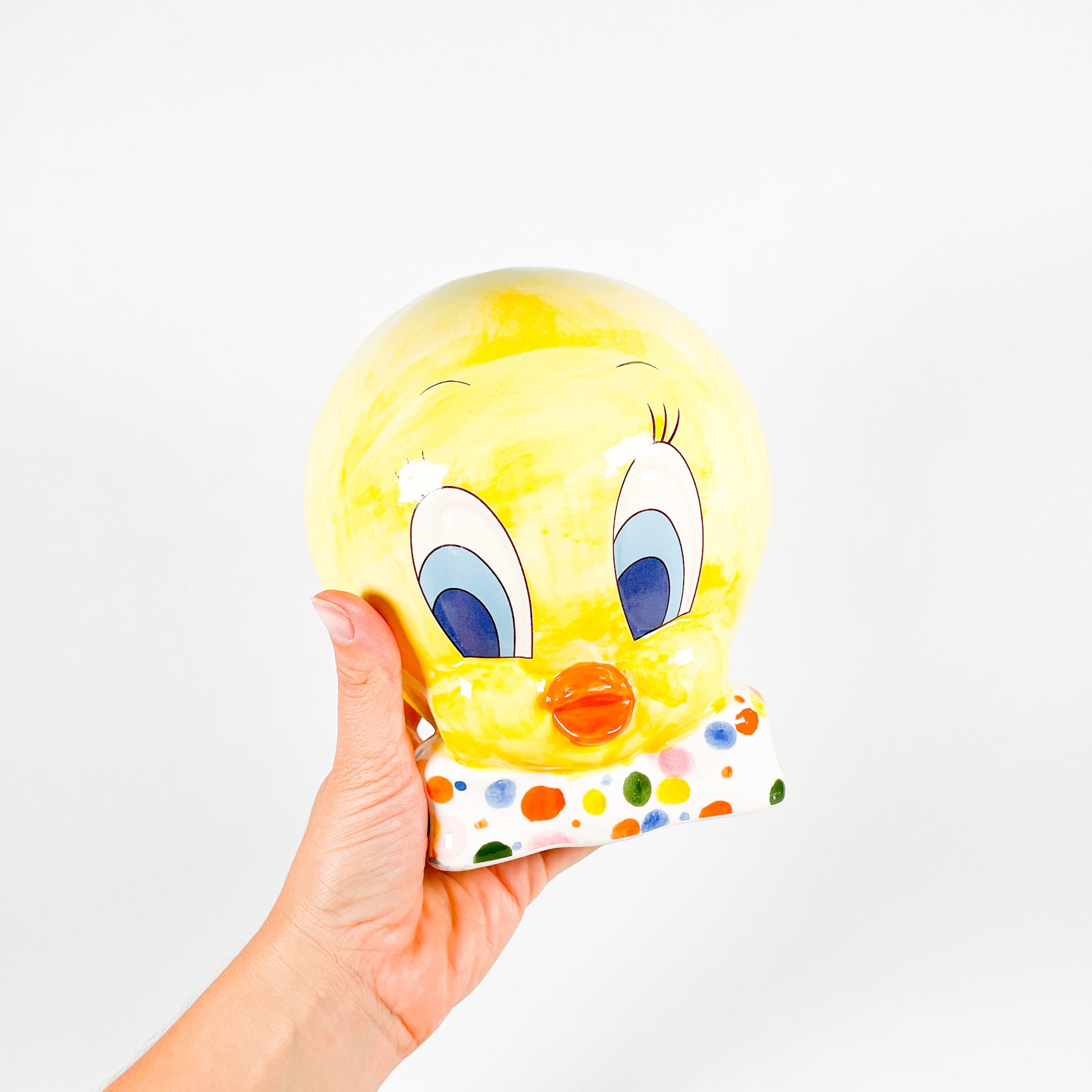 Large yellow ceramic piggy bank in the shape of Tweety Bird.
