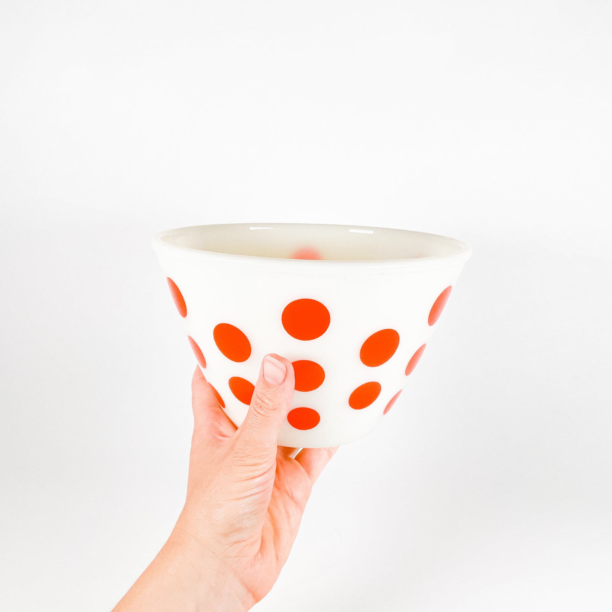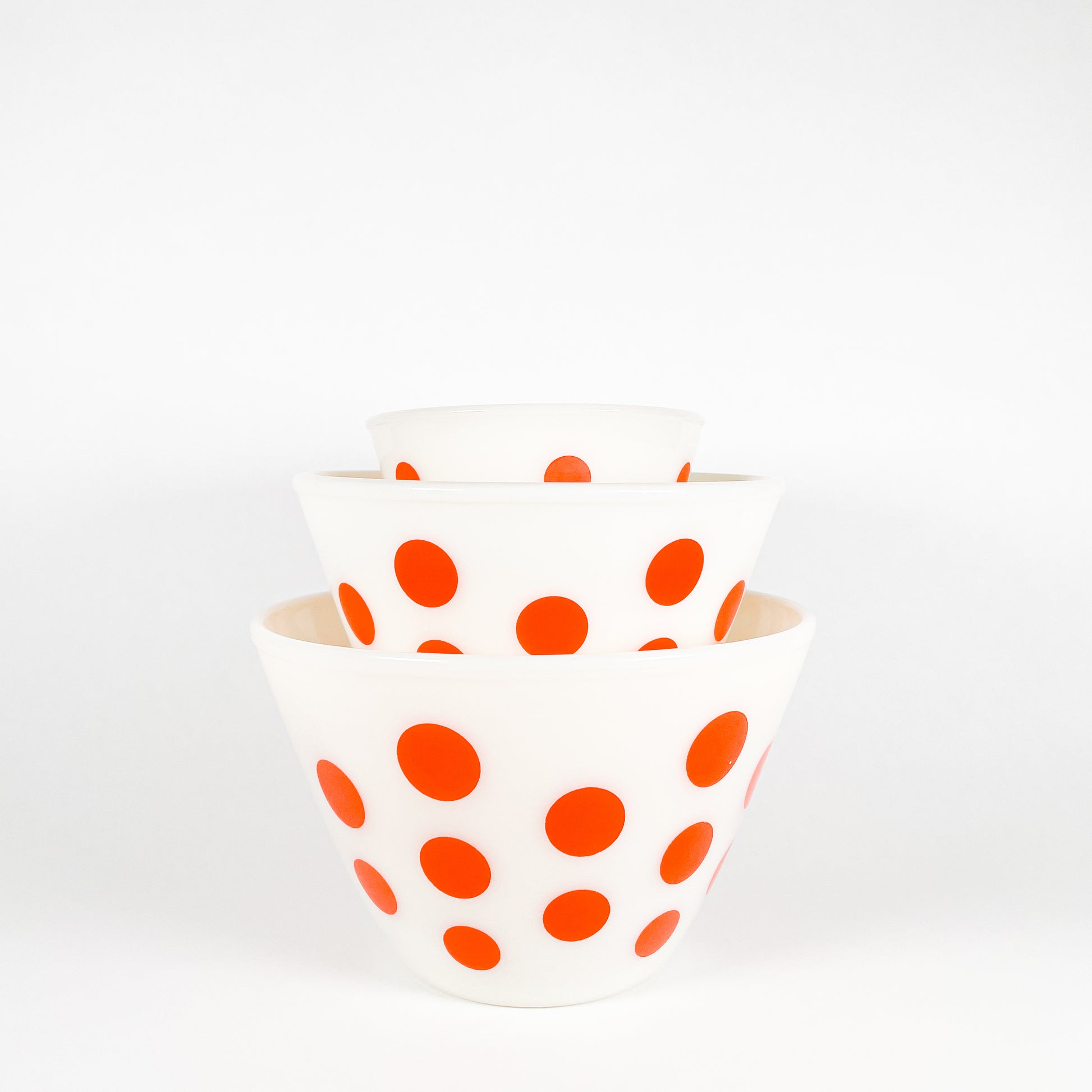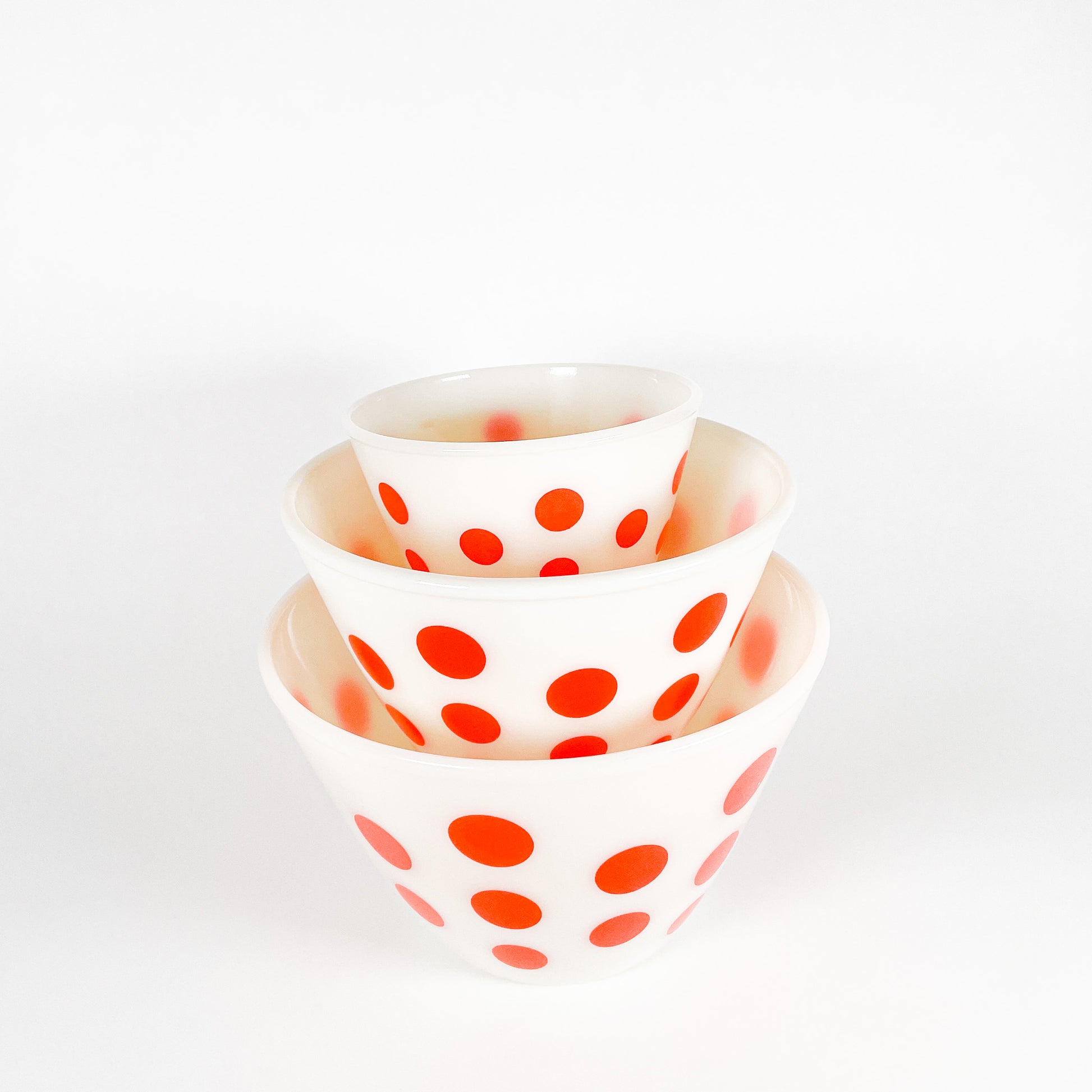 Another favorite for this set of 3 Fire King milkglass mixing bowls with red polka dots.