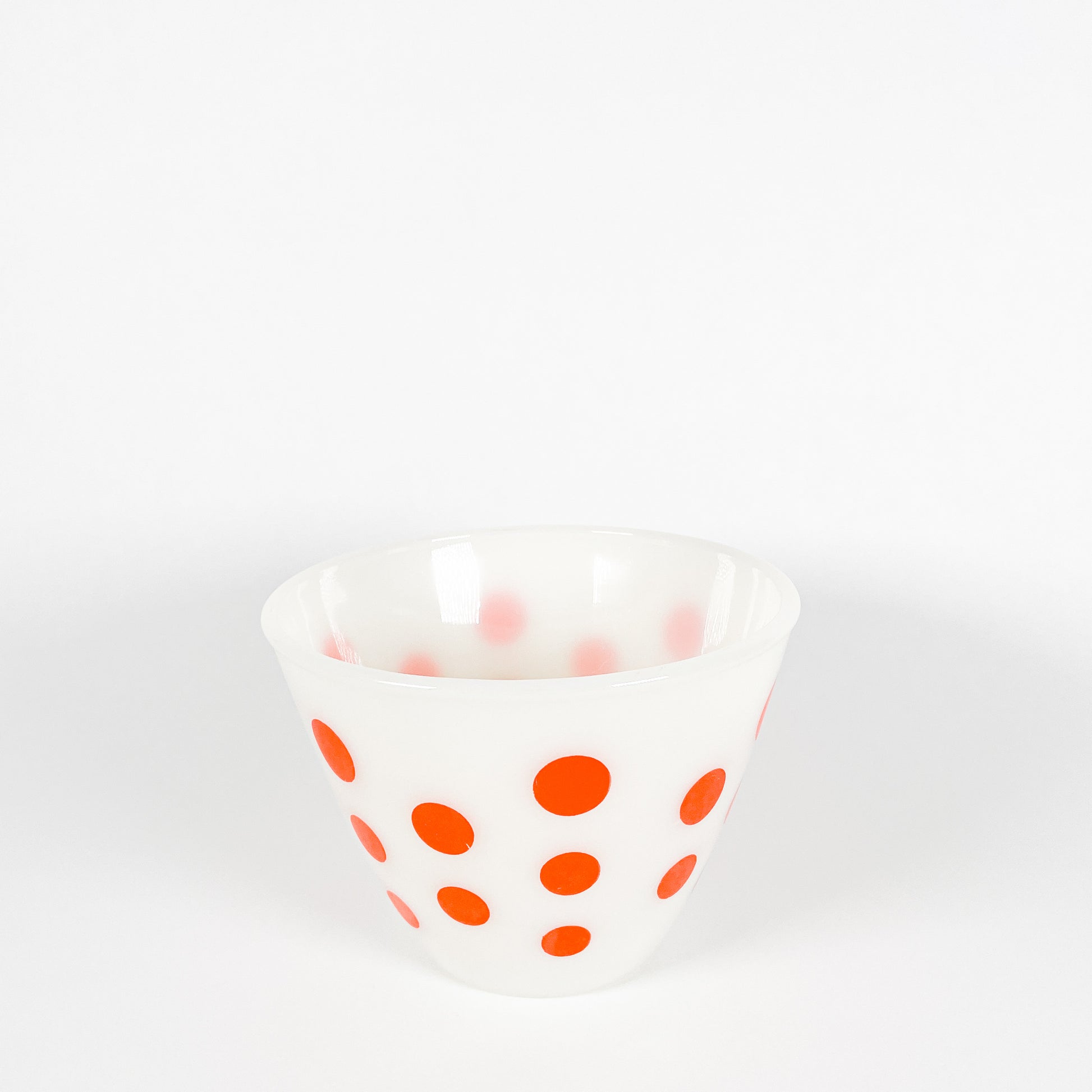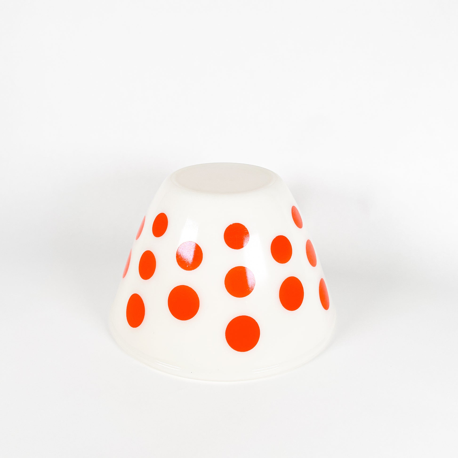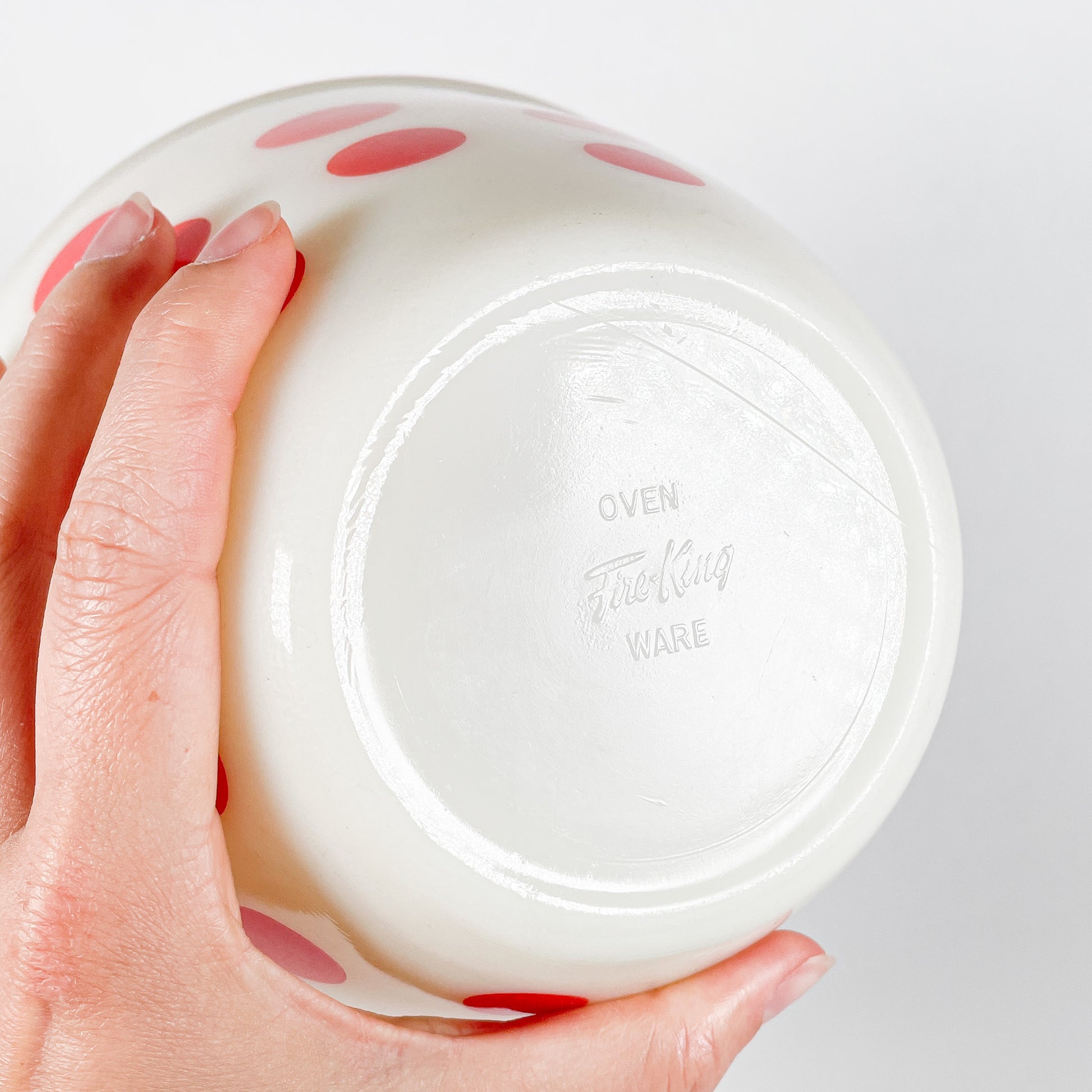 Another favorite for this set of 3 Fire King milkglass mixing bowls with red polka dots.
