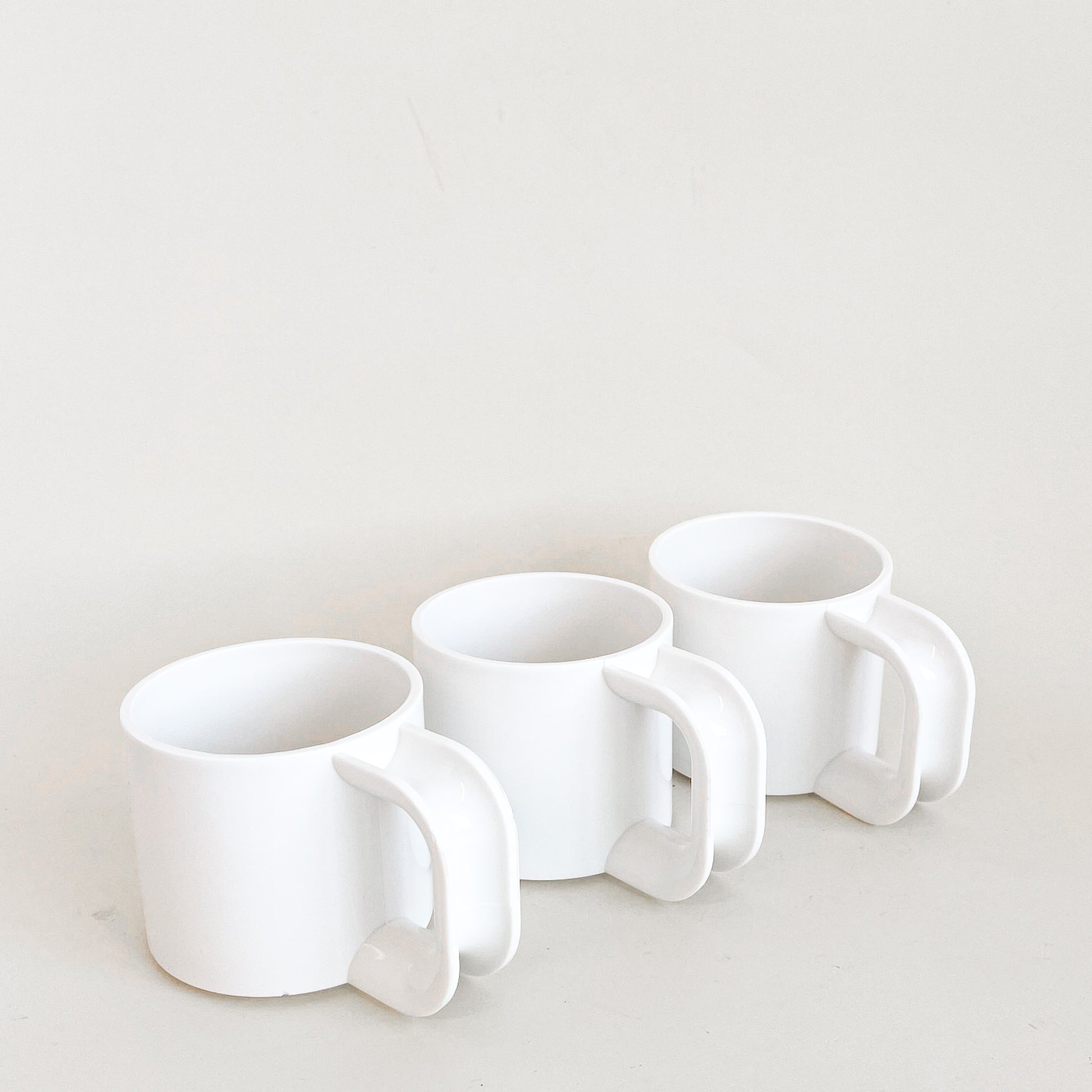 White plastic mugs trio