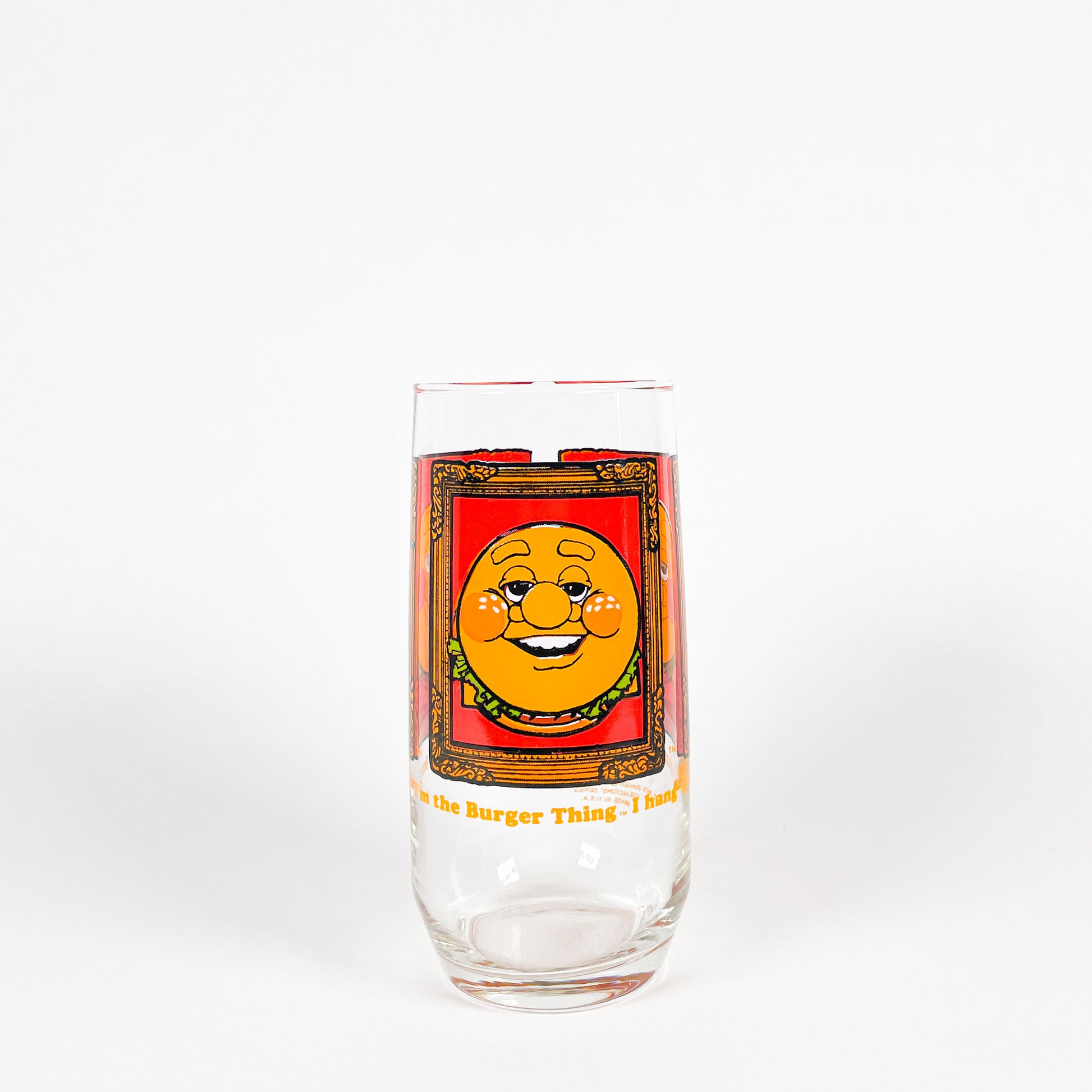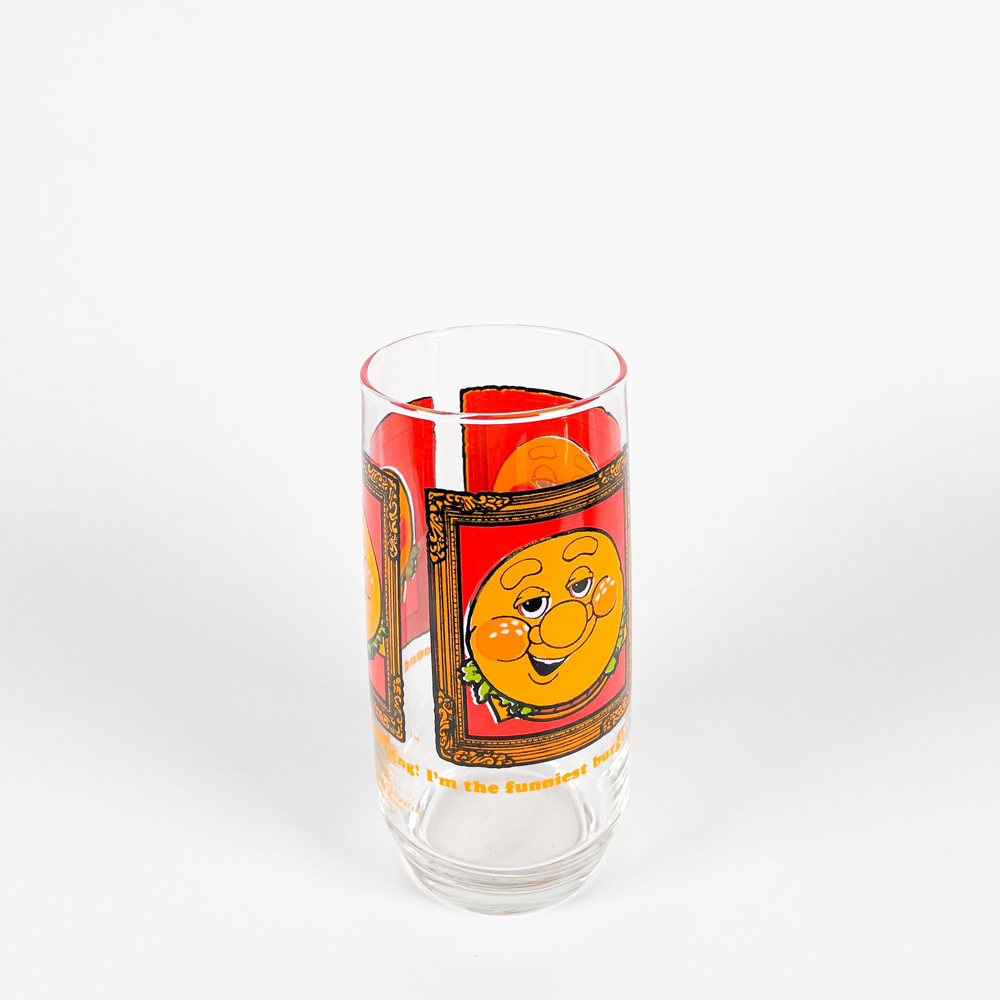 1979 Burger King "Funny Burger" collectible glass, made in the USA. It reads the following text: "I hang around and joke and sing! I'm the funniest burger. I'm the Burger Thing."