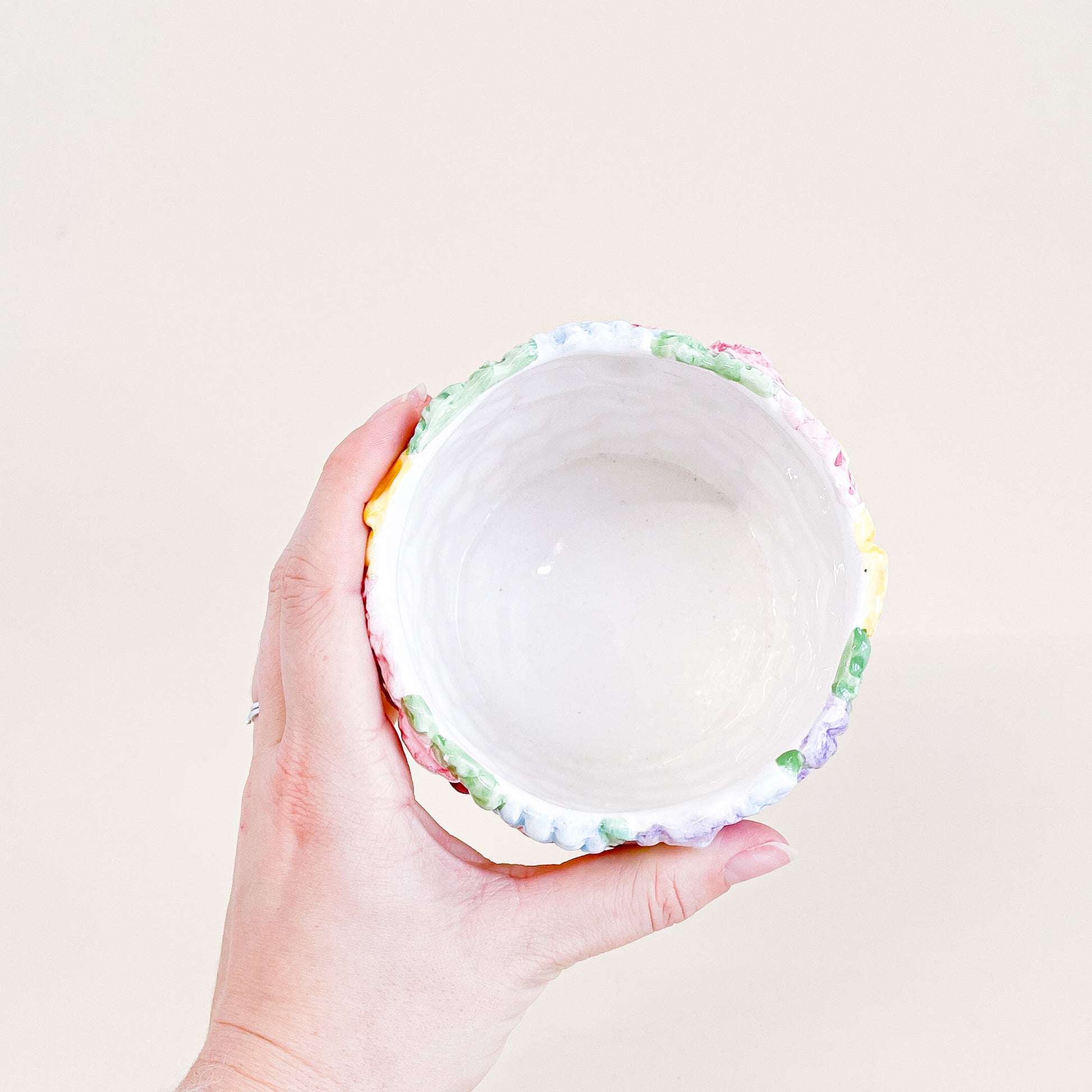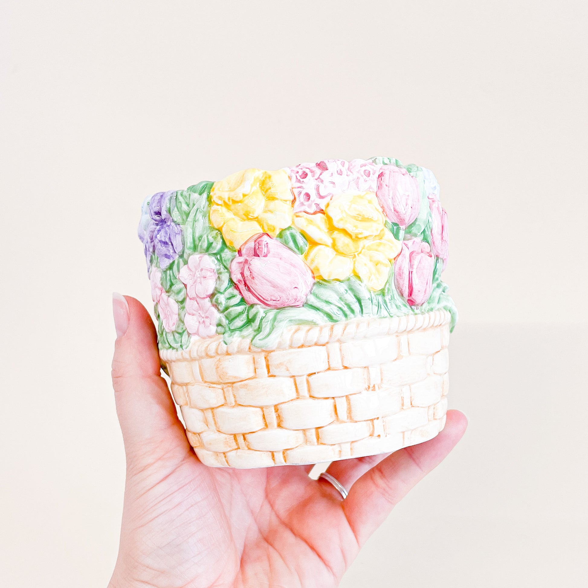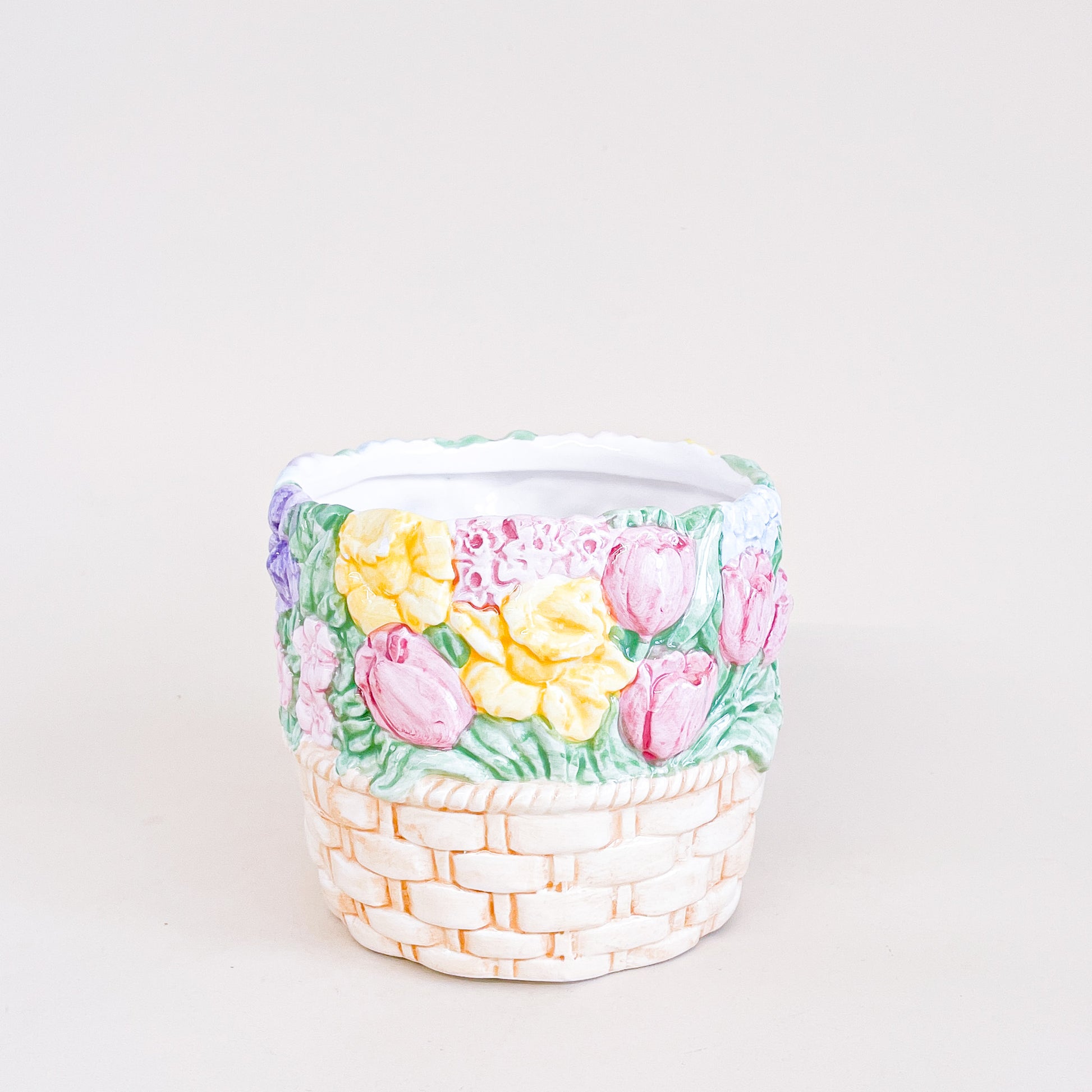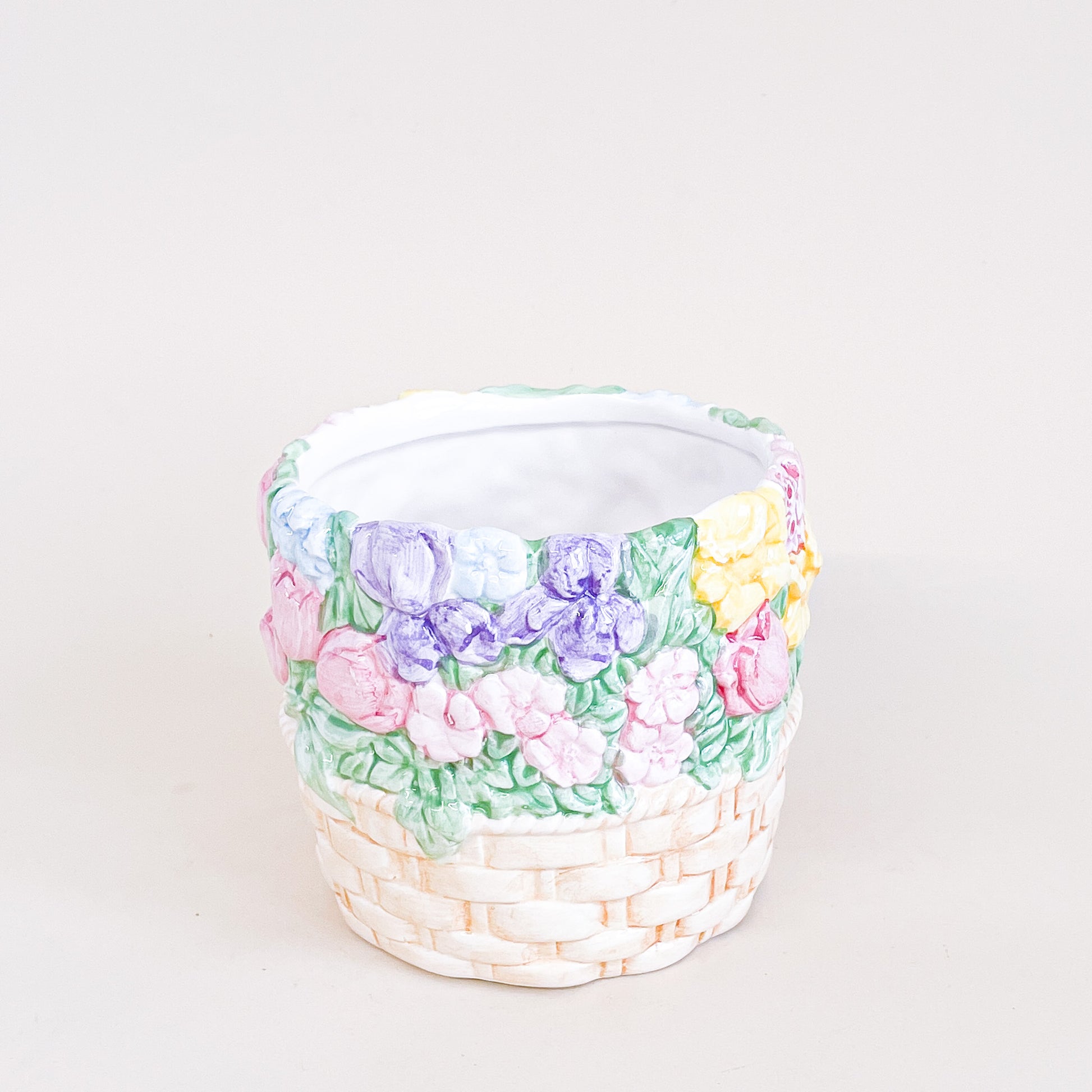 Cache-pot en céramique en forme de panier rempli de fleurs. Fabriqué à Taïwan.