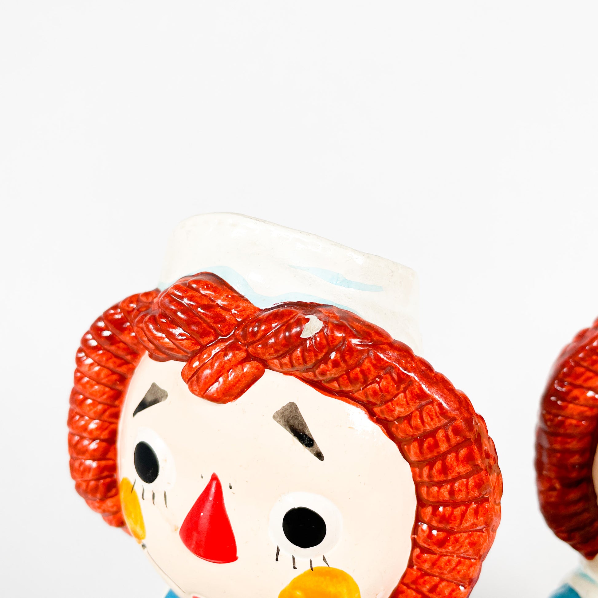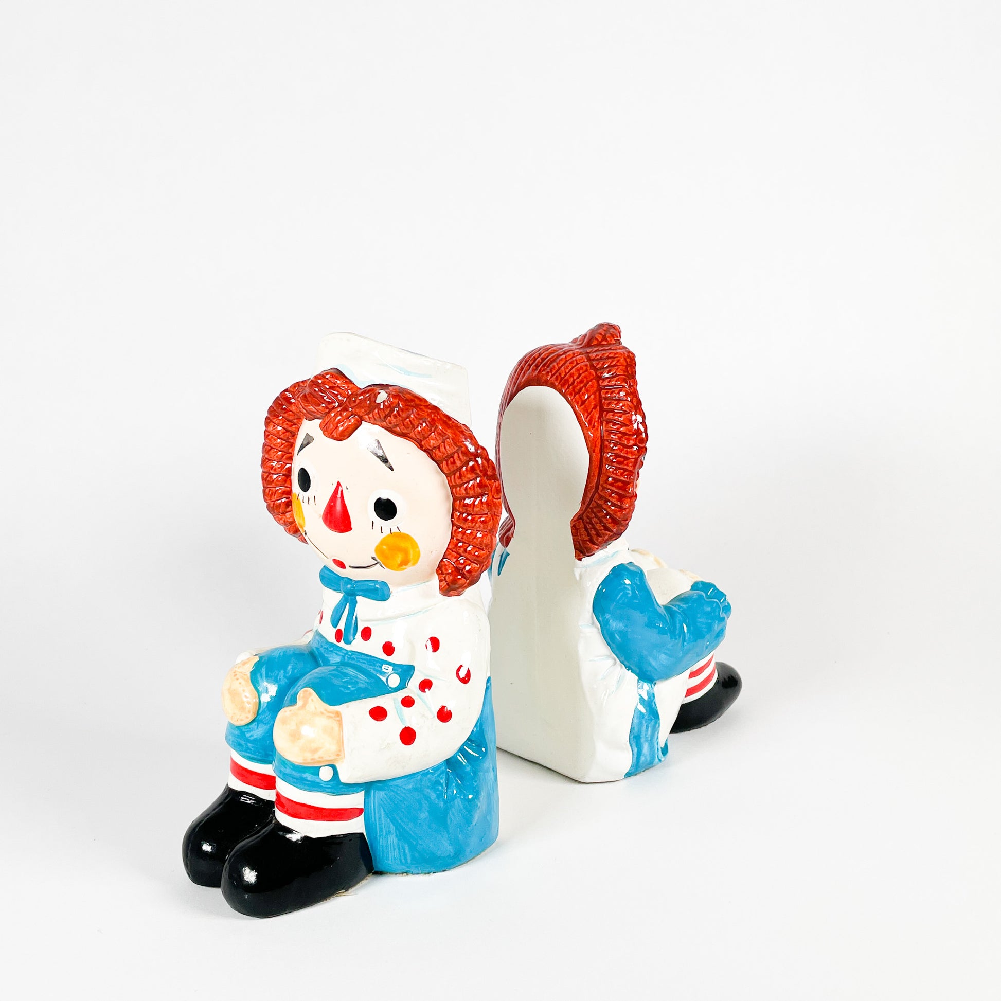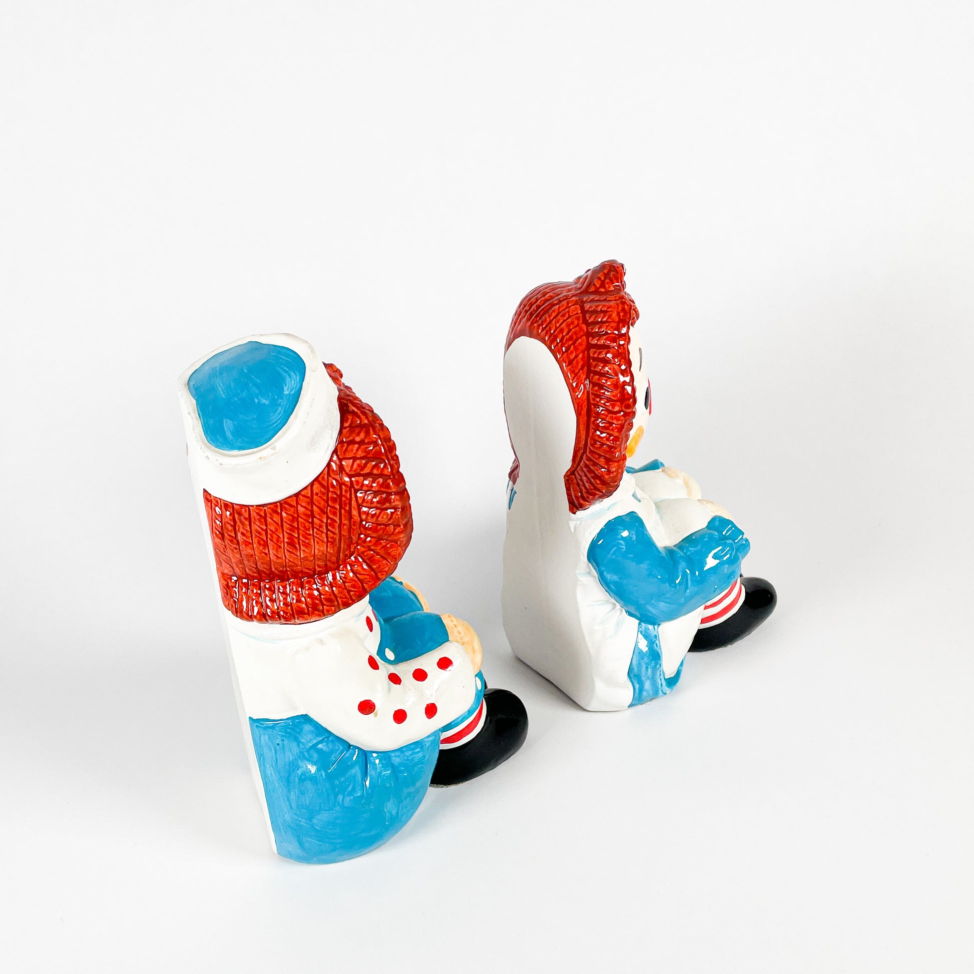 Duo d'appui-livres en plâtre à l'effigie des personnages poupées de chiffon Raggedy Ann et Andy. Fabriqués en 1970 au Japon par The Bobbs Merrill Company.