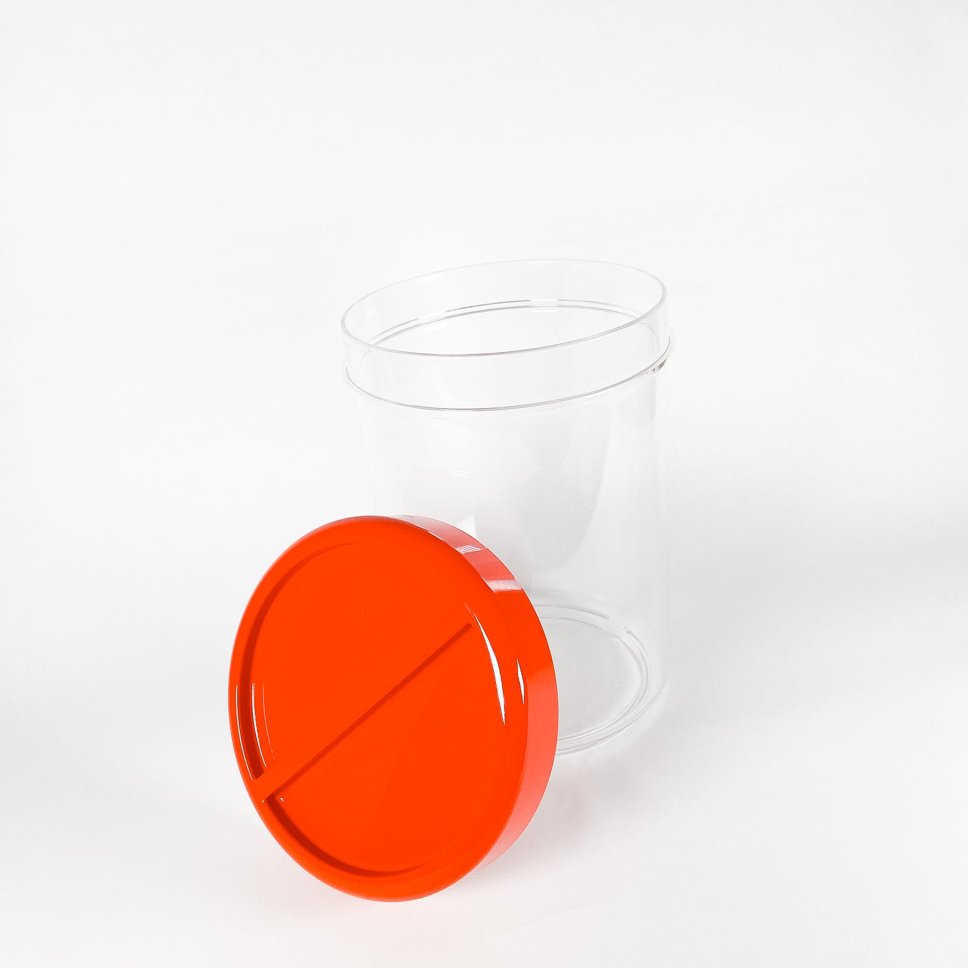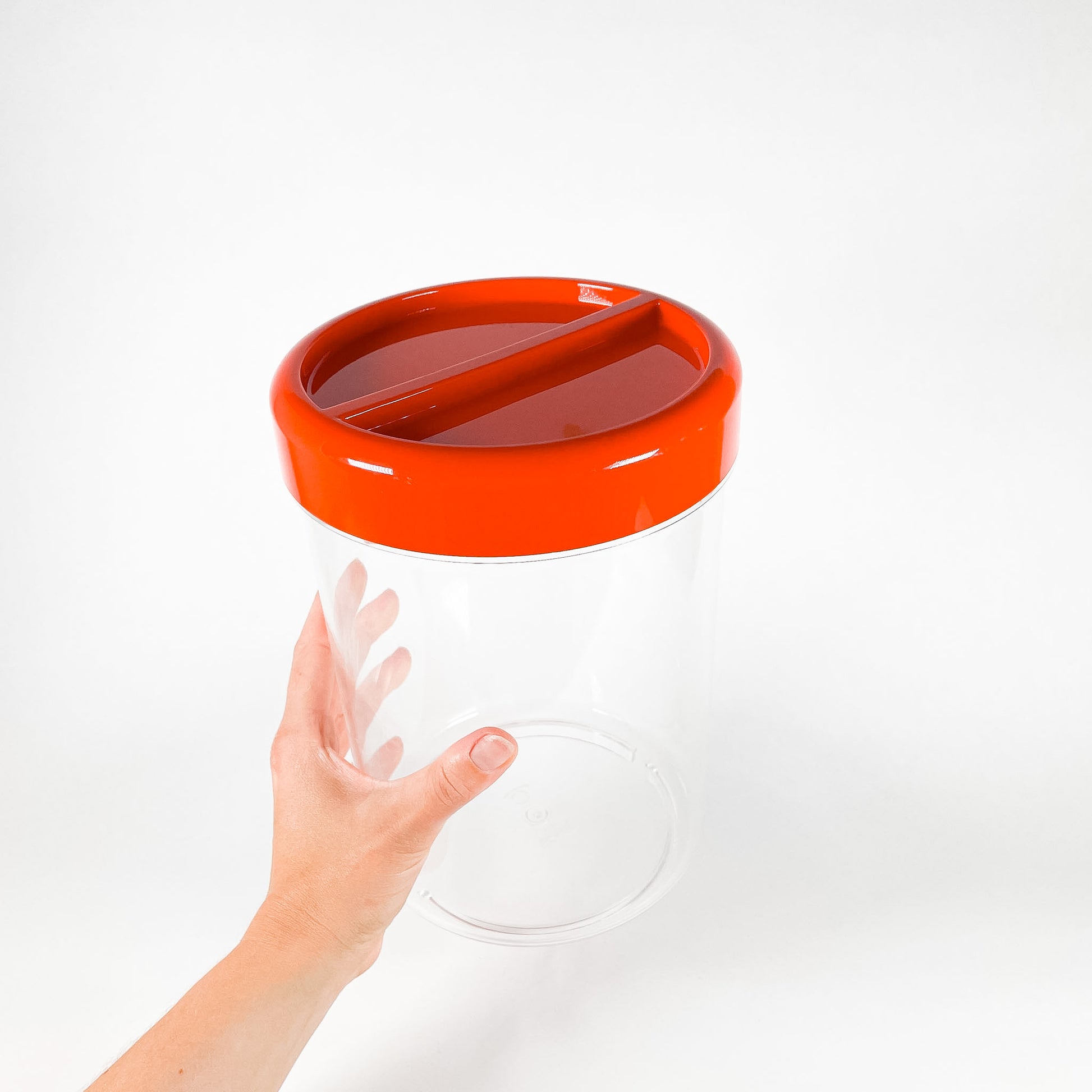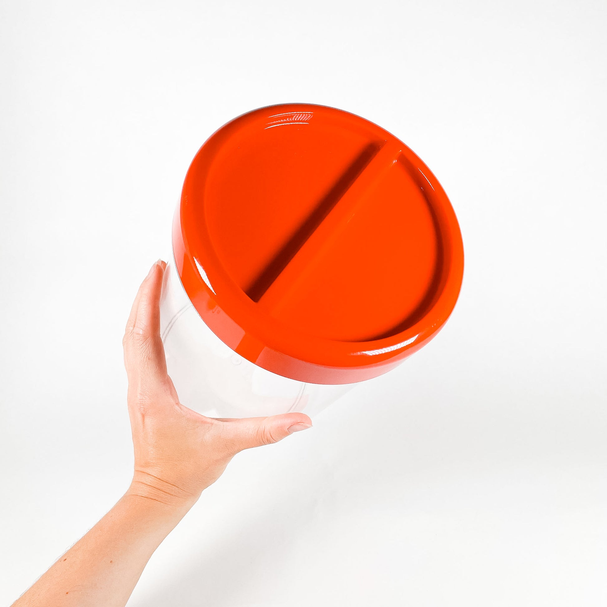 Grand contenant en acrylique et mélamine rouge, fabriqué au Québec par IPL, design par André Morin.
