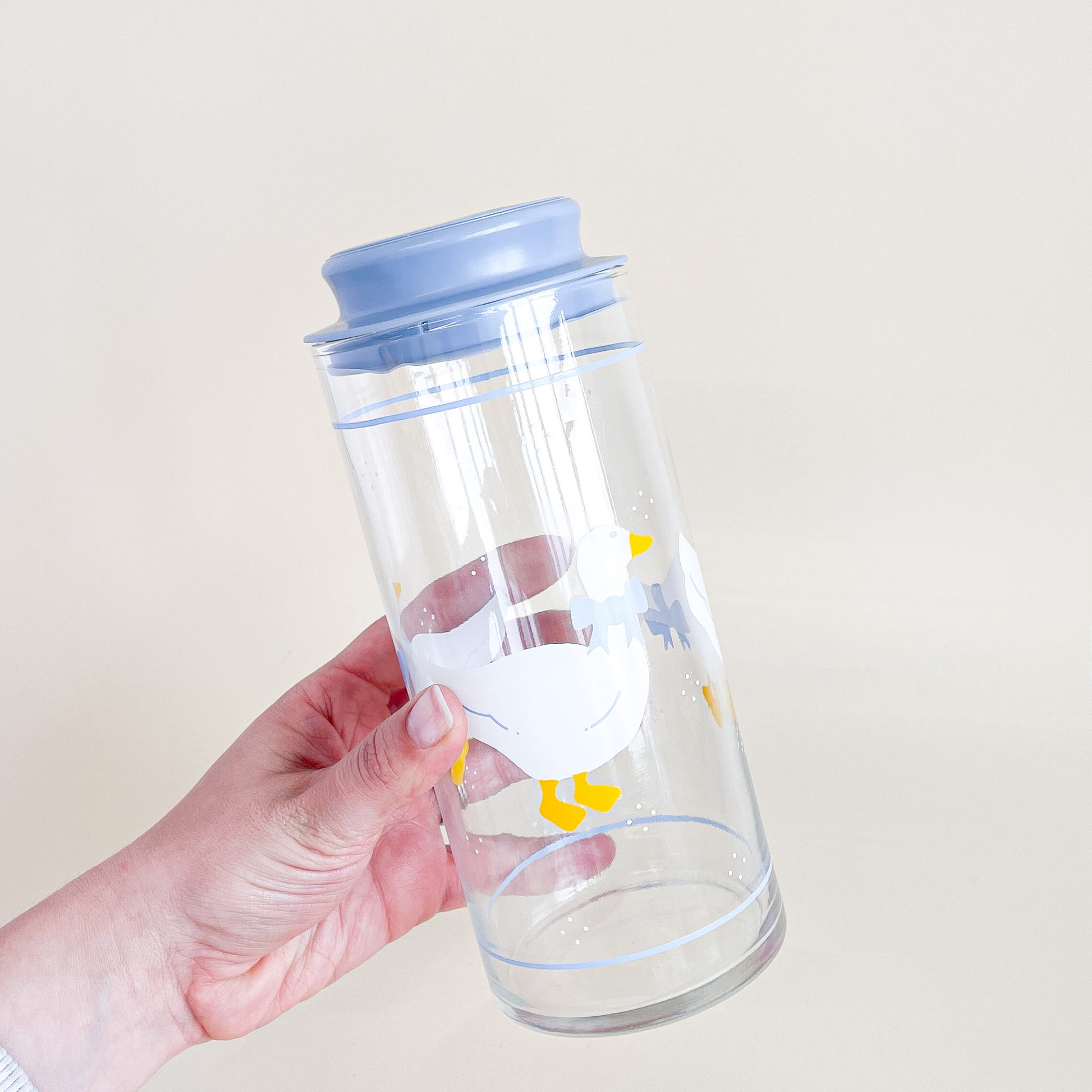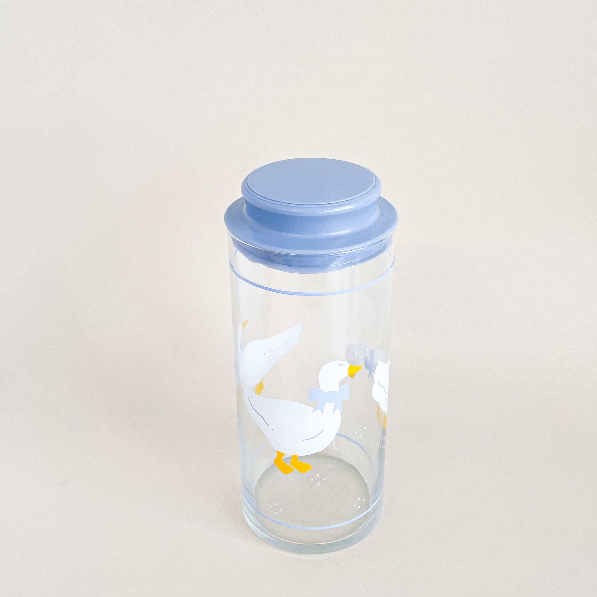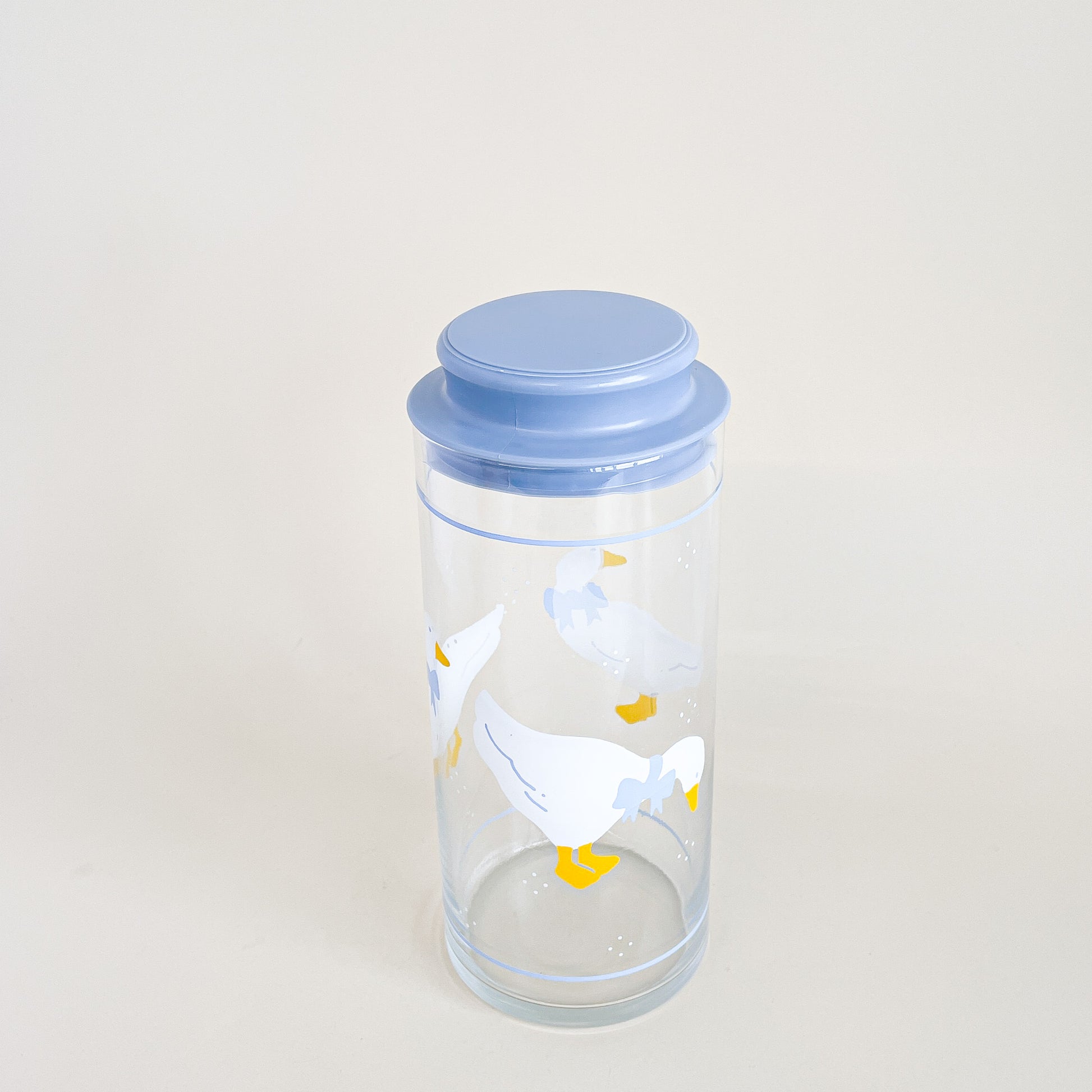 Jarre cylindrique en verre et couvercle hermétique en plastique. Super pratique pour y mettre des pâtes ou tout autre aliment en vrac !